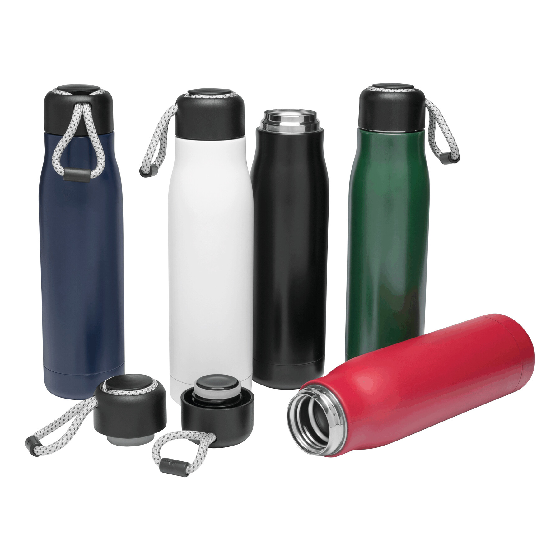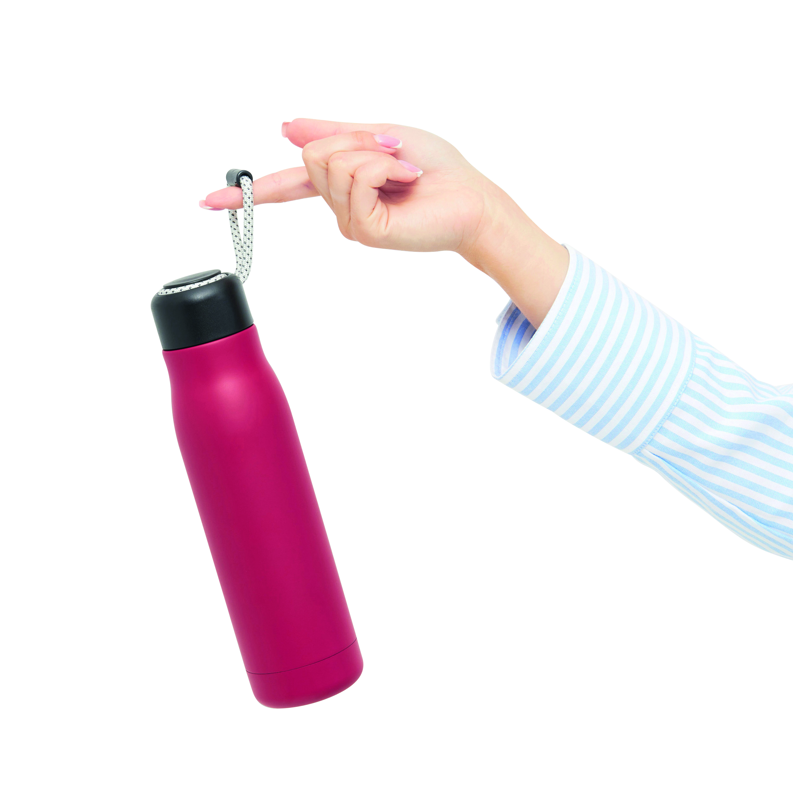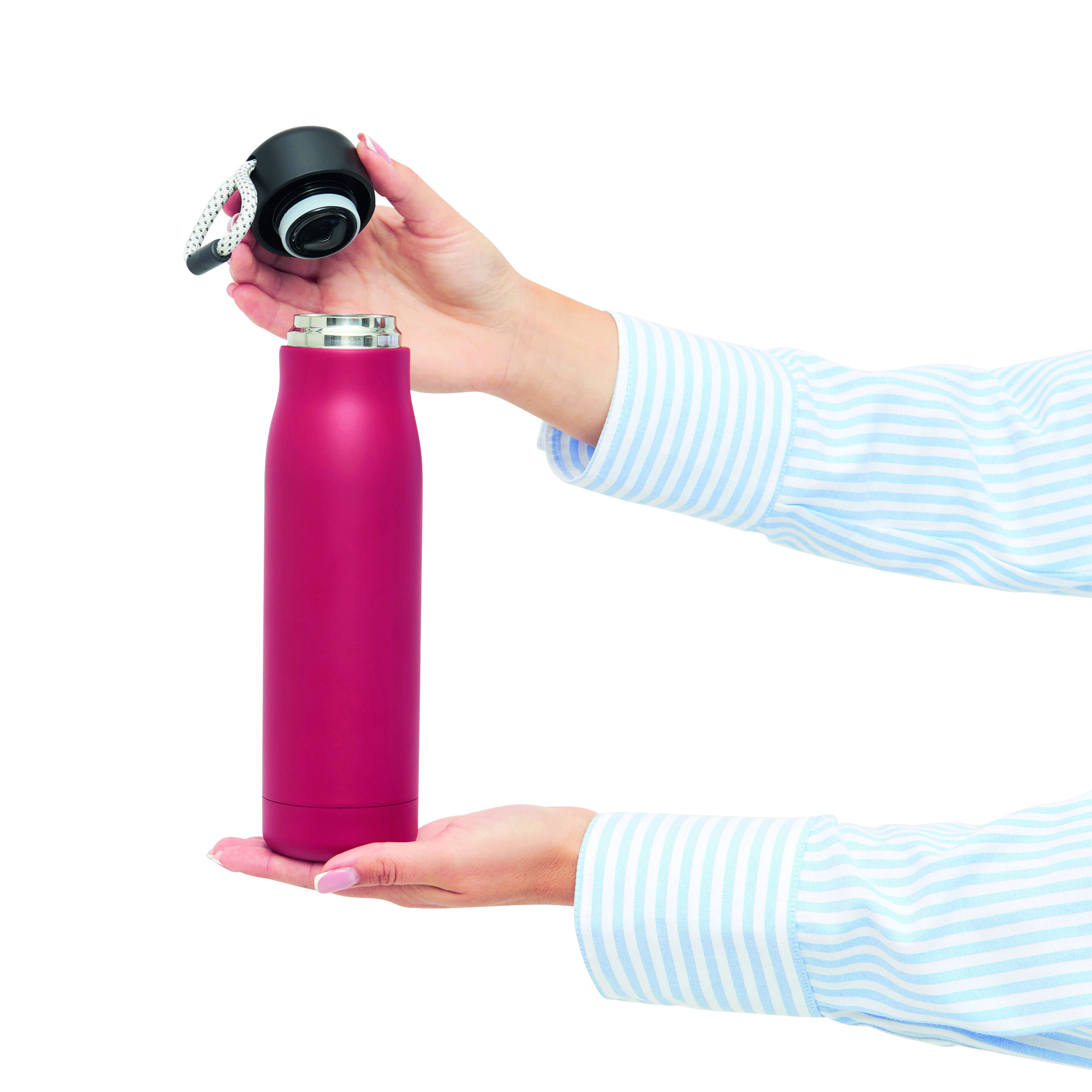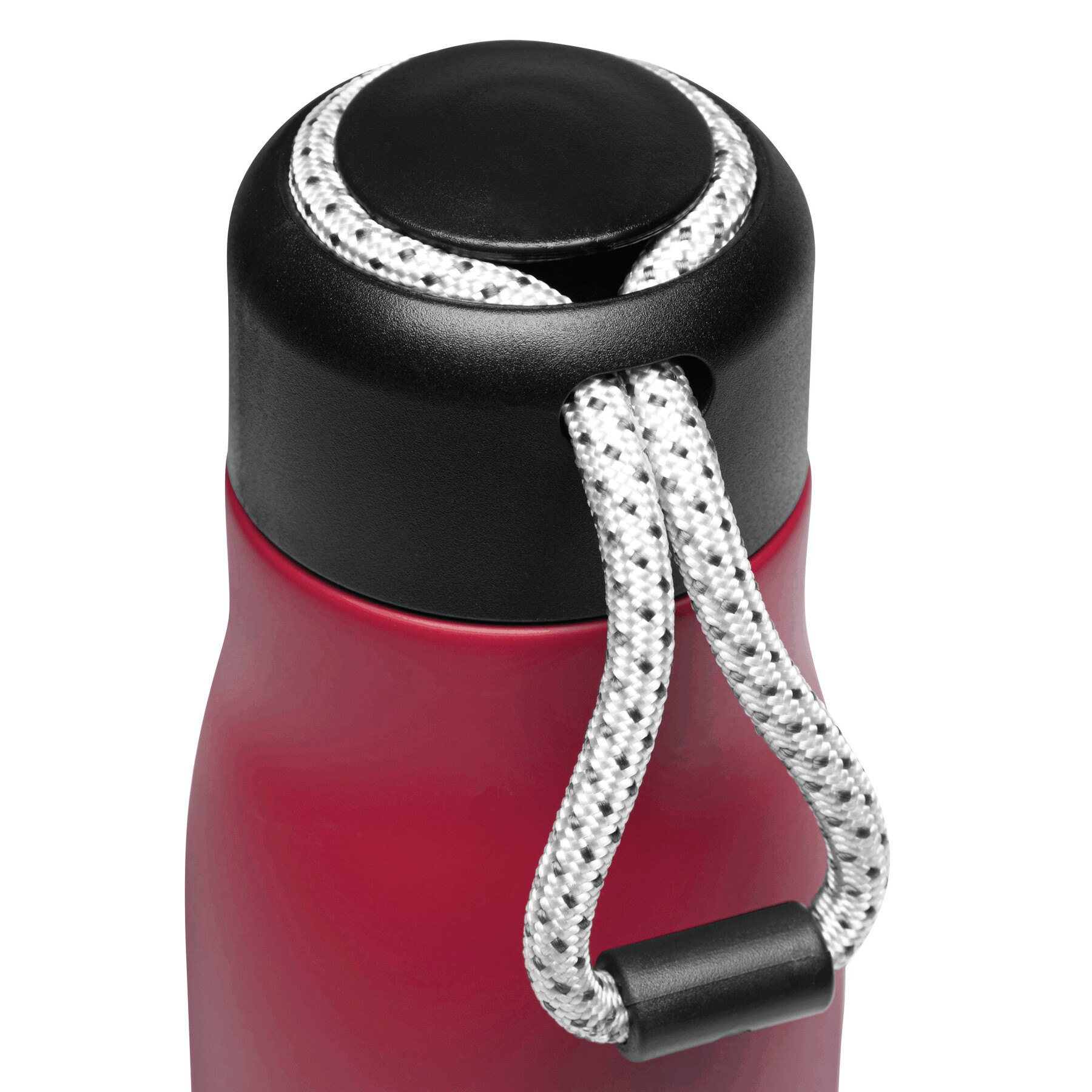 Próżniowa butelka do picia ROBUSTA, dwuścienna: wewnątrz i na zewnątrz wykonana ze stali nierdzewnej, szczelna czarna zakrętka z pętelką do przenoszenia, pojemność: ok. 500 ml, utrzymuje ciepło napoju przez ok. 8 godzin i zimno do 12 godzin.