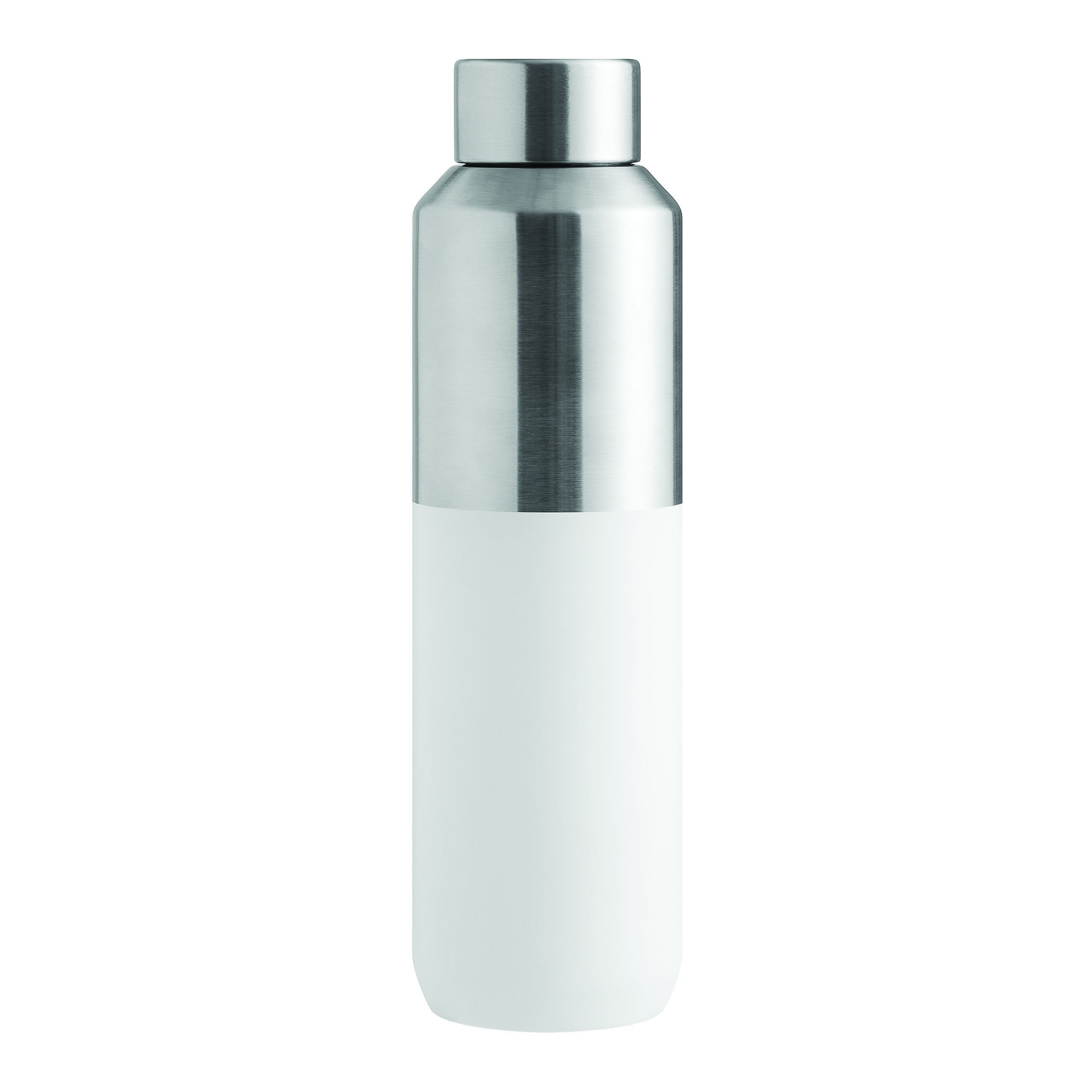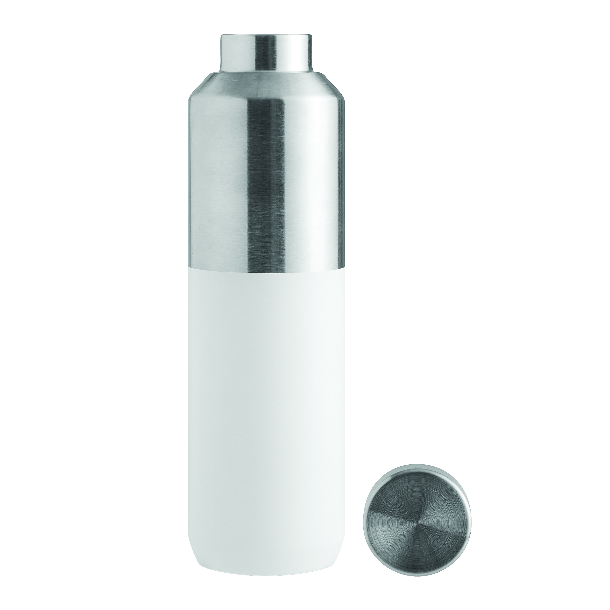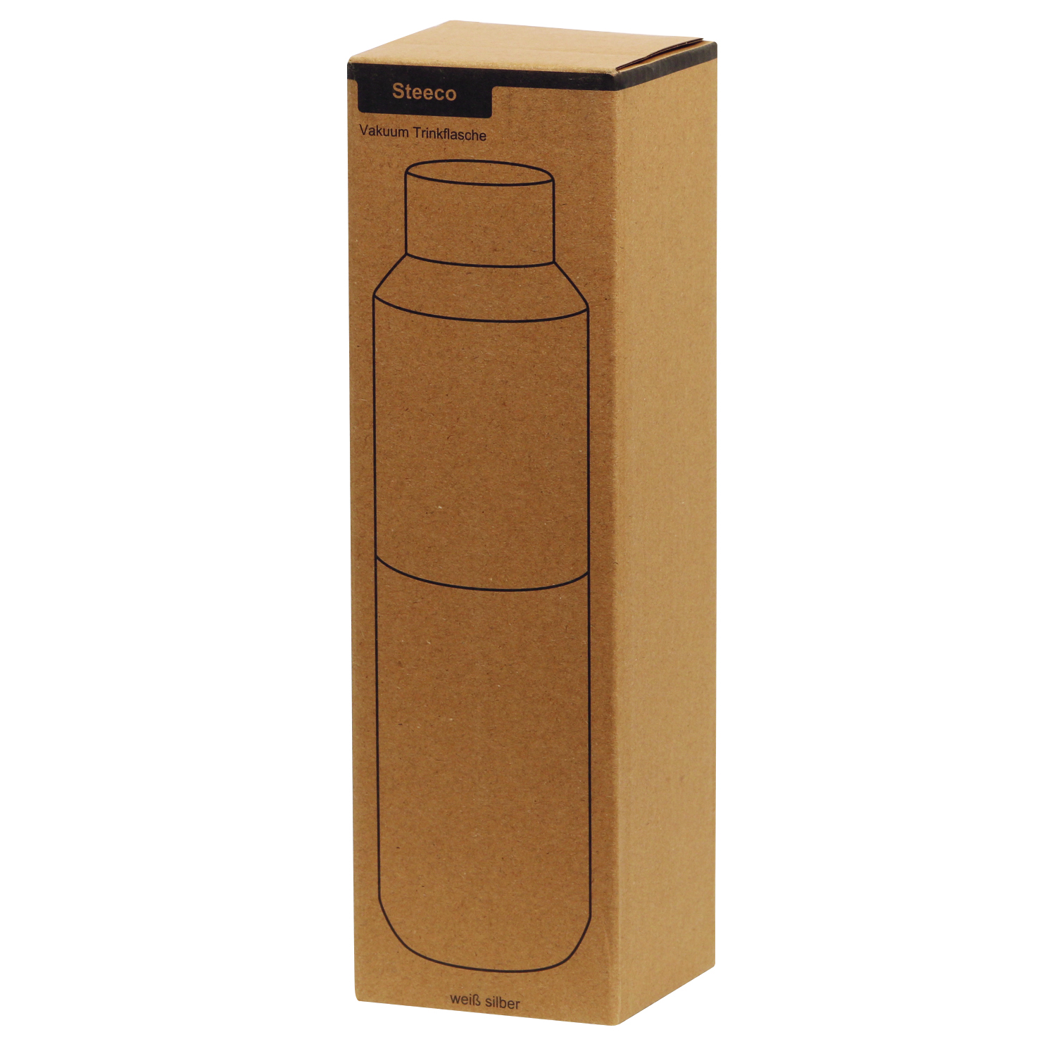 Próżniowa butelka STEECO z podwójną izolacją. Wewnątrz wykonana ze stali nierdzewnej z recyklingu, na zewnątrz ze stali nierdzewnej. Posiada pokrywkę z bezpieczną zakrętką i silikonowym pierścieniem uszczelniającym. O pojemności ok. 600 ml. Utrzymuje ciepło przez ok. 8 godzin i zimno nawet do 12. Zapakowana jest w pudełko.