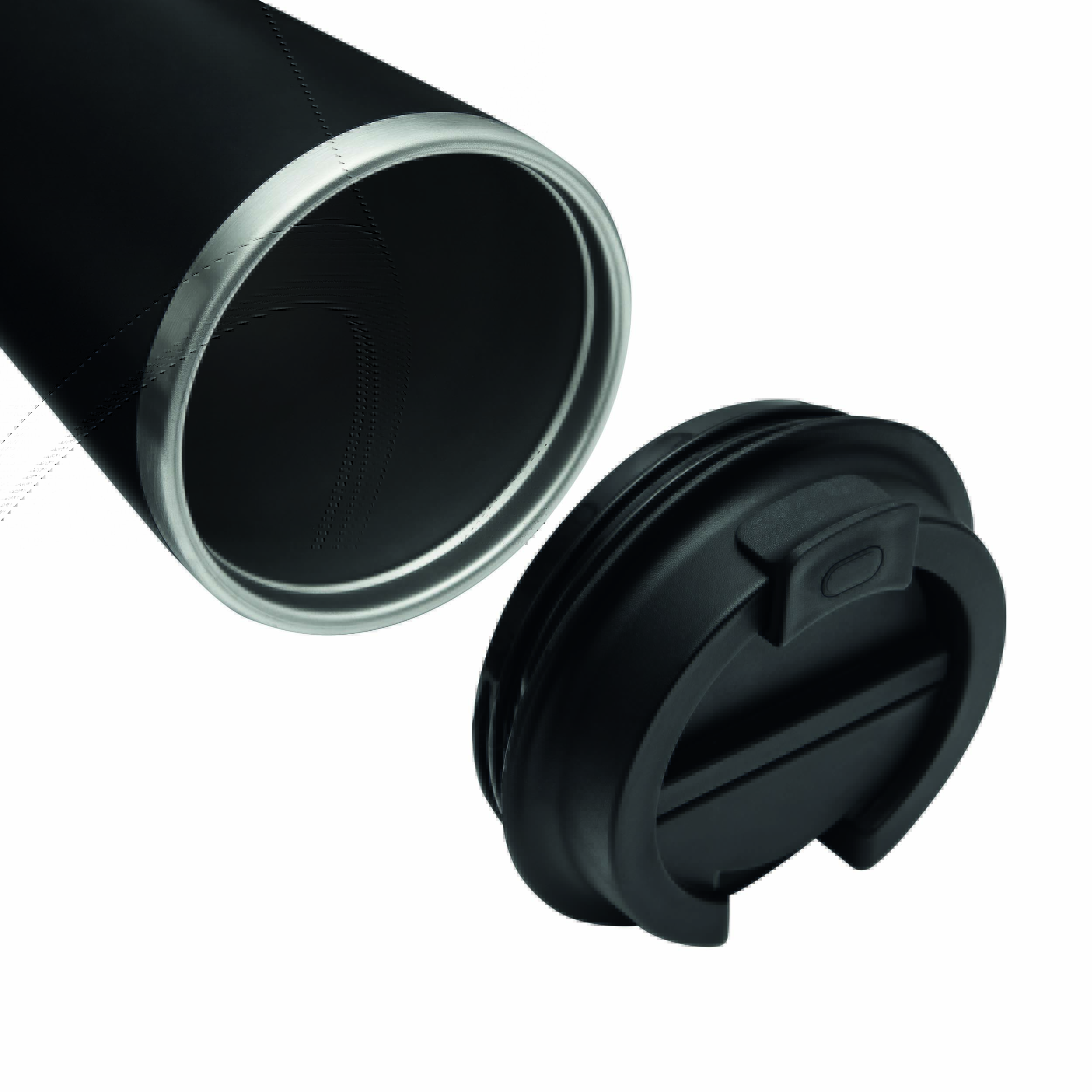Kubek podróżny TAKE & GO dwuścienny: wykonany ze stali nierdzewnej wewnątrz i tworzywa sztucznego na zewnątrz, bezpiecznie zakręcana plastikowa pokrywka ze zintegrowanym otworem do picia i silikonową uszczelką, pojemność ok. 350 ml, utrzymuje ciepło napojów przez ok. 2 godziny i zimne do 4 godzin.