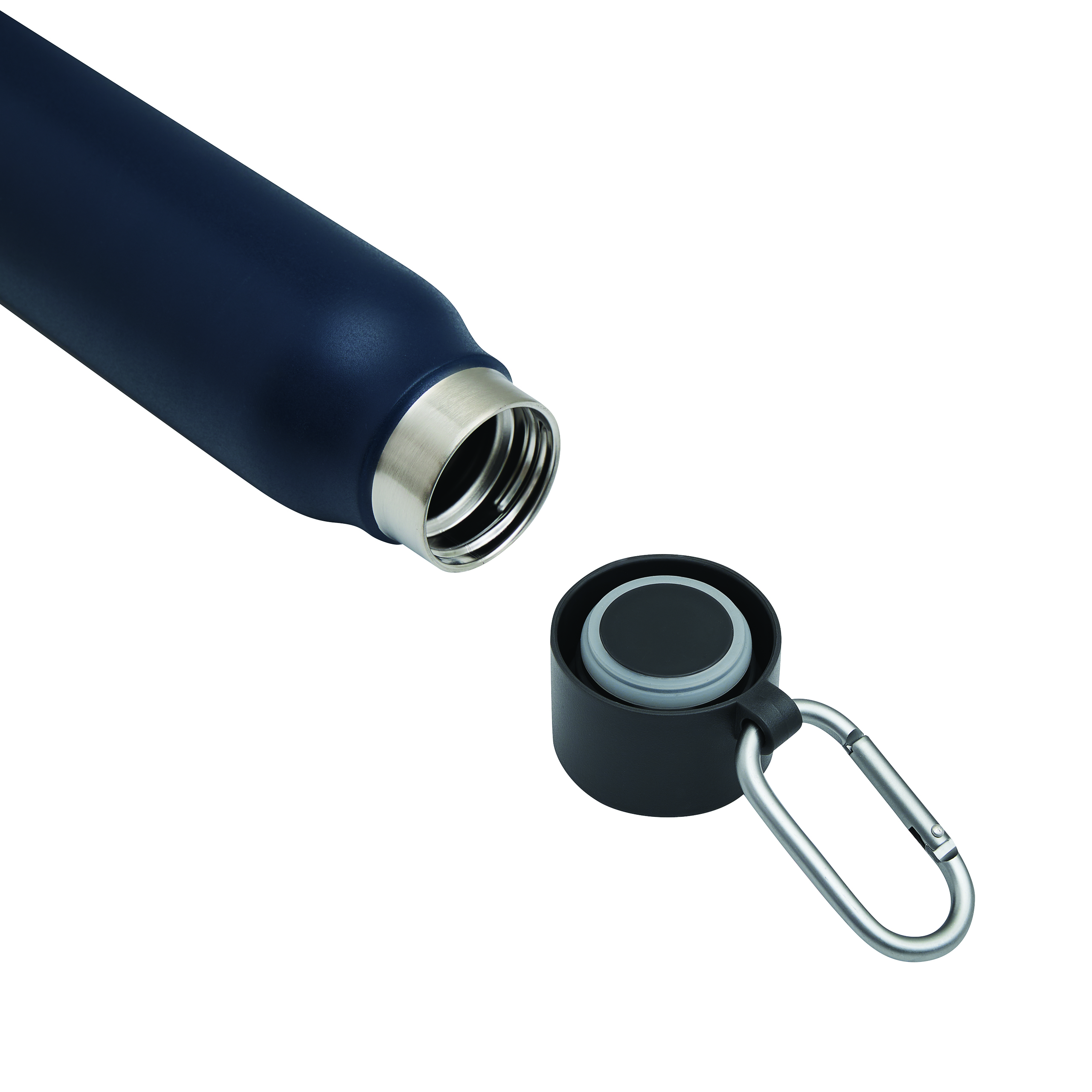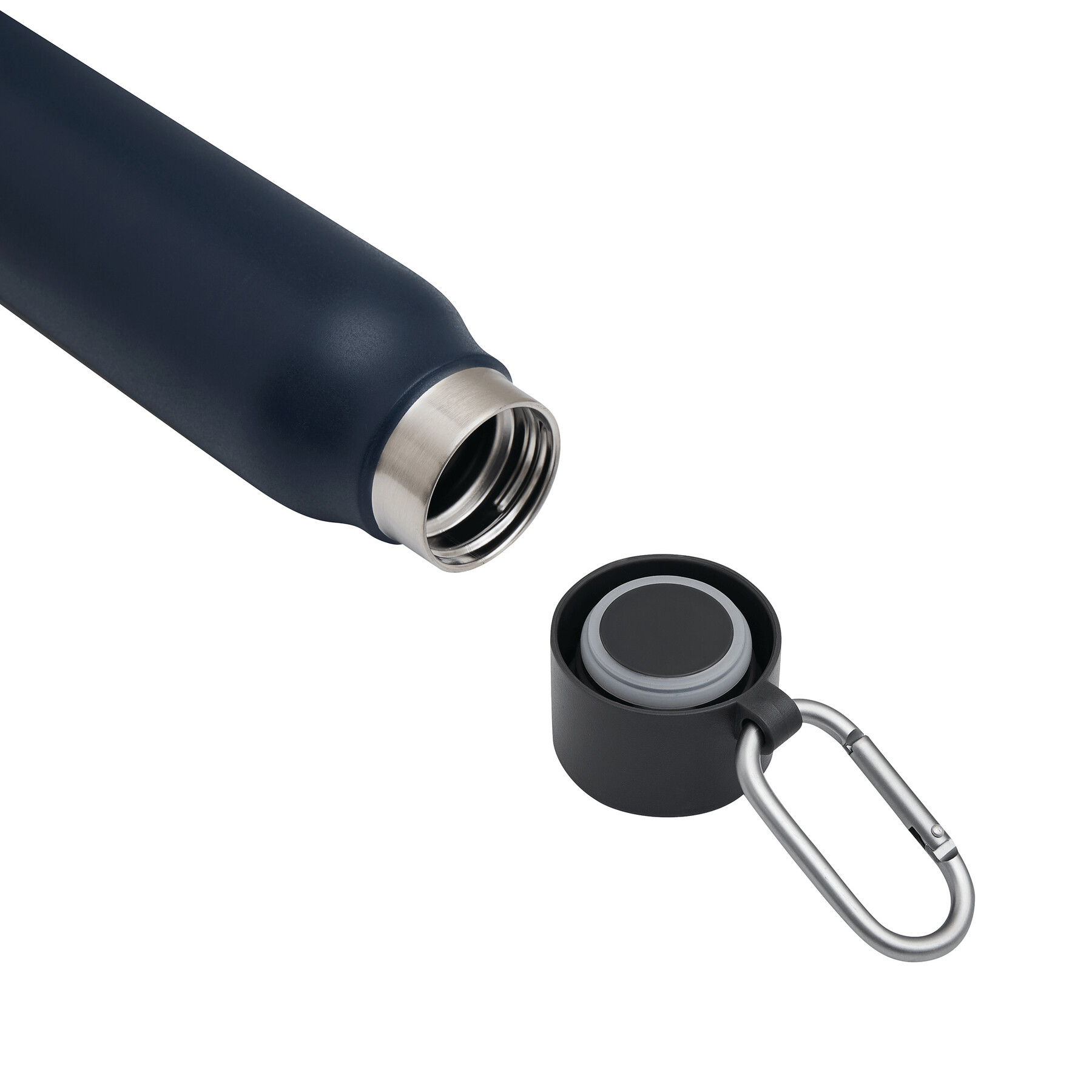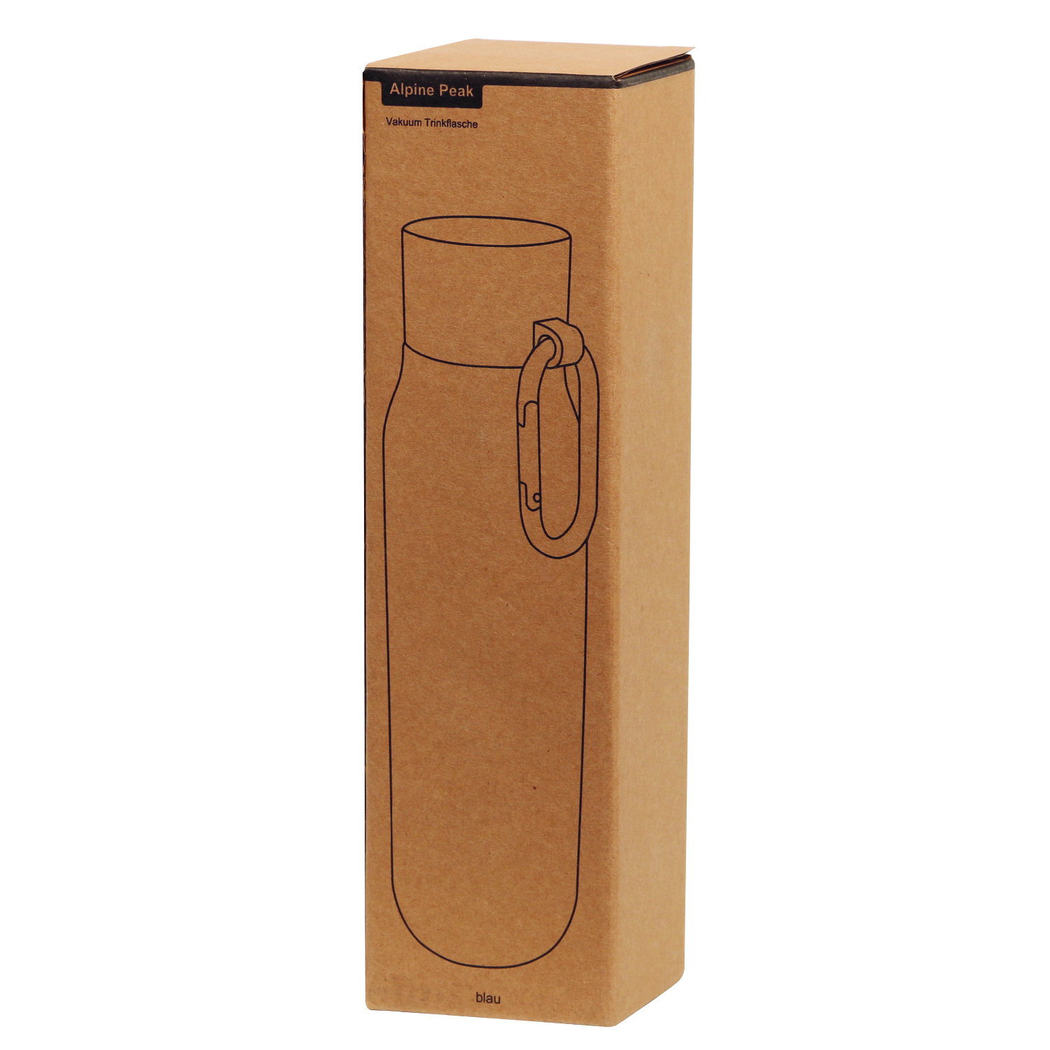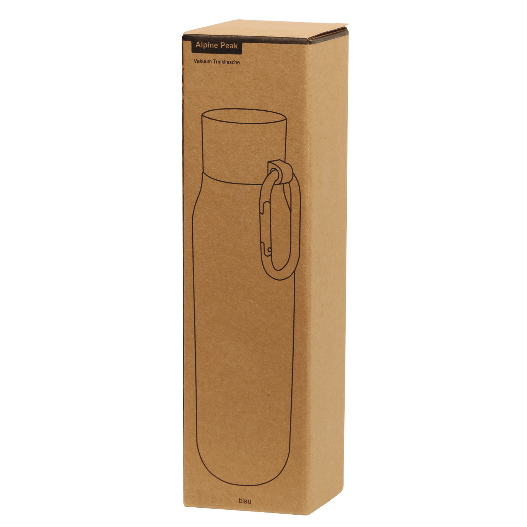 Próżniowa butelka ALPINE PEAK z podwójną izolacją. Wewnątrz wykonana ze stali nierdzewnej z recyklingu, na zewnątrz ze stali nierdzewnej. Posiada plastikową pokrywkę z bezpieczną zakrętką, silikonowy pierścień uszczelniający i karabińczyk (karabińczyk NIE nadaje się do wspinaczki). O pojemności ok. 550 ml. Utrzymuje ciepło przez ok. 8 godzin i zimno nawet do 12. Zapakowana jest w pudełko.