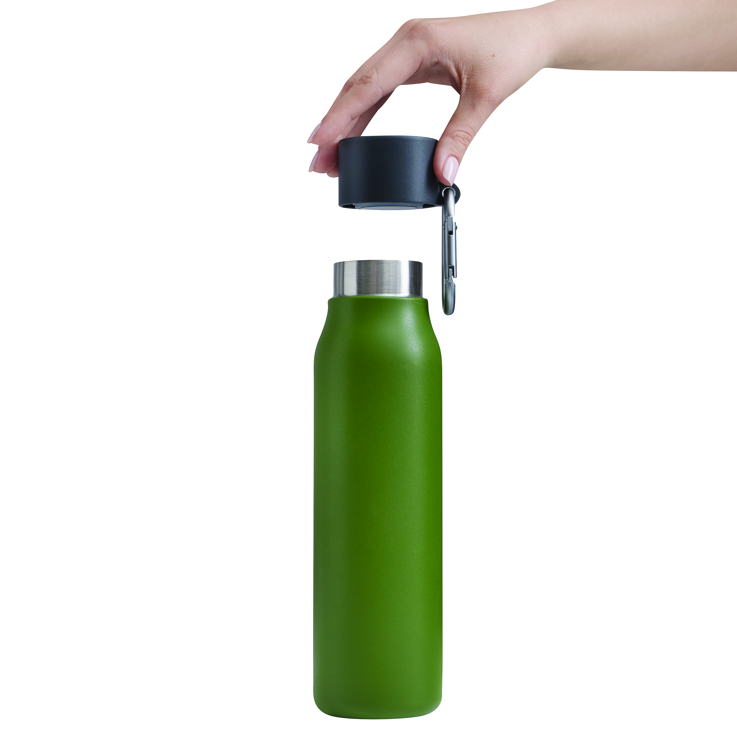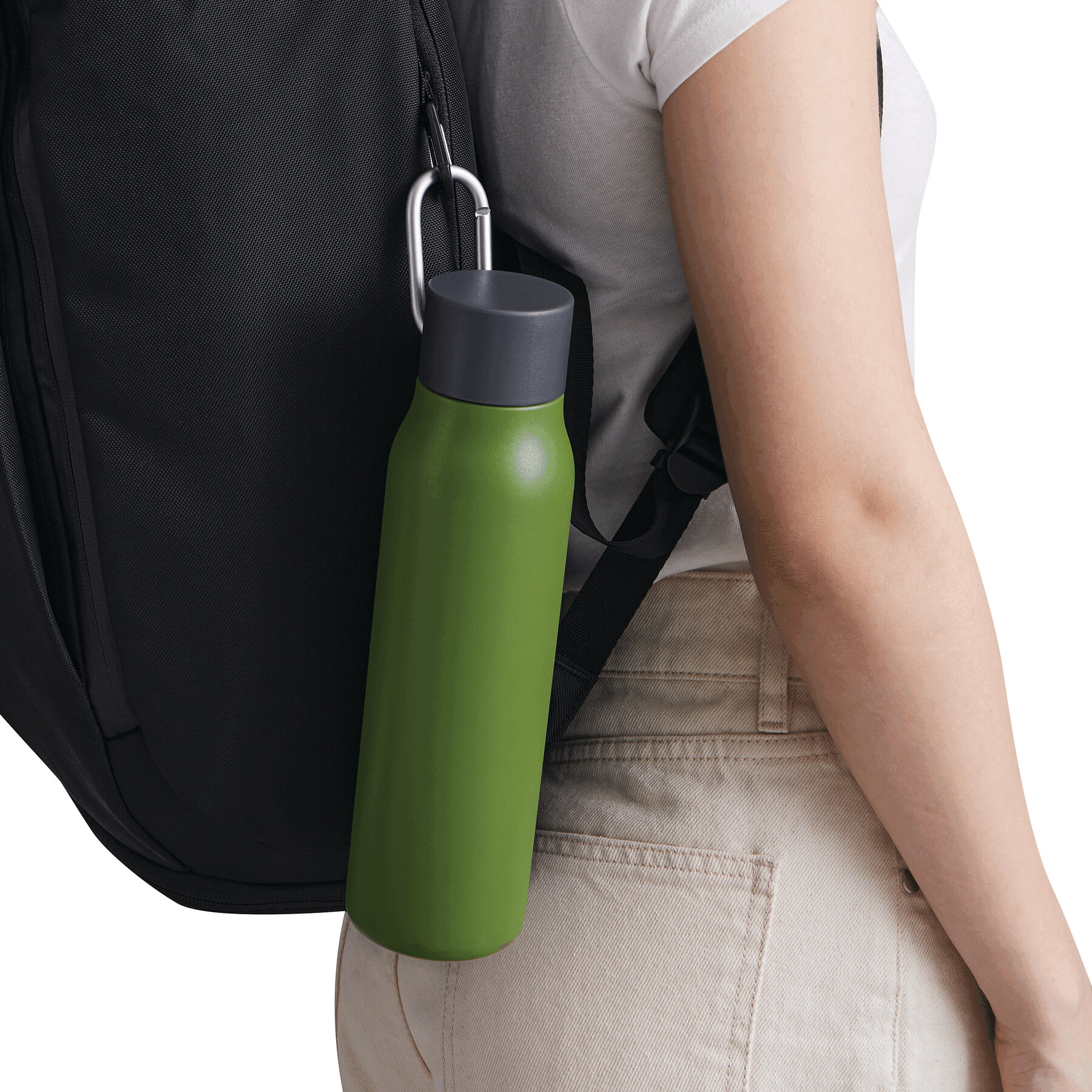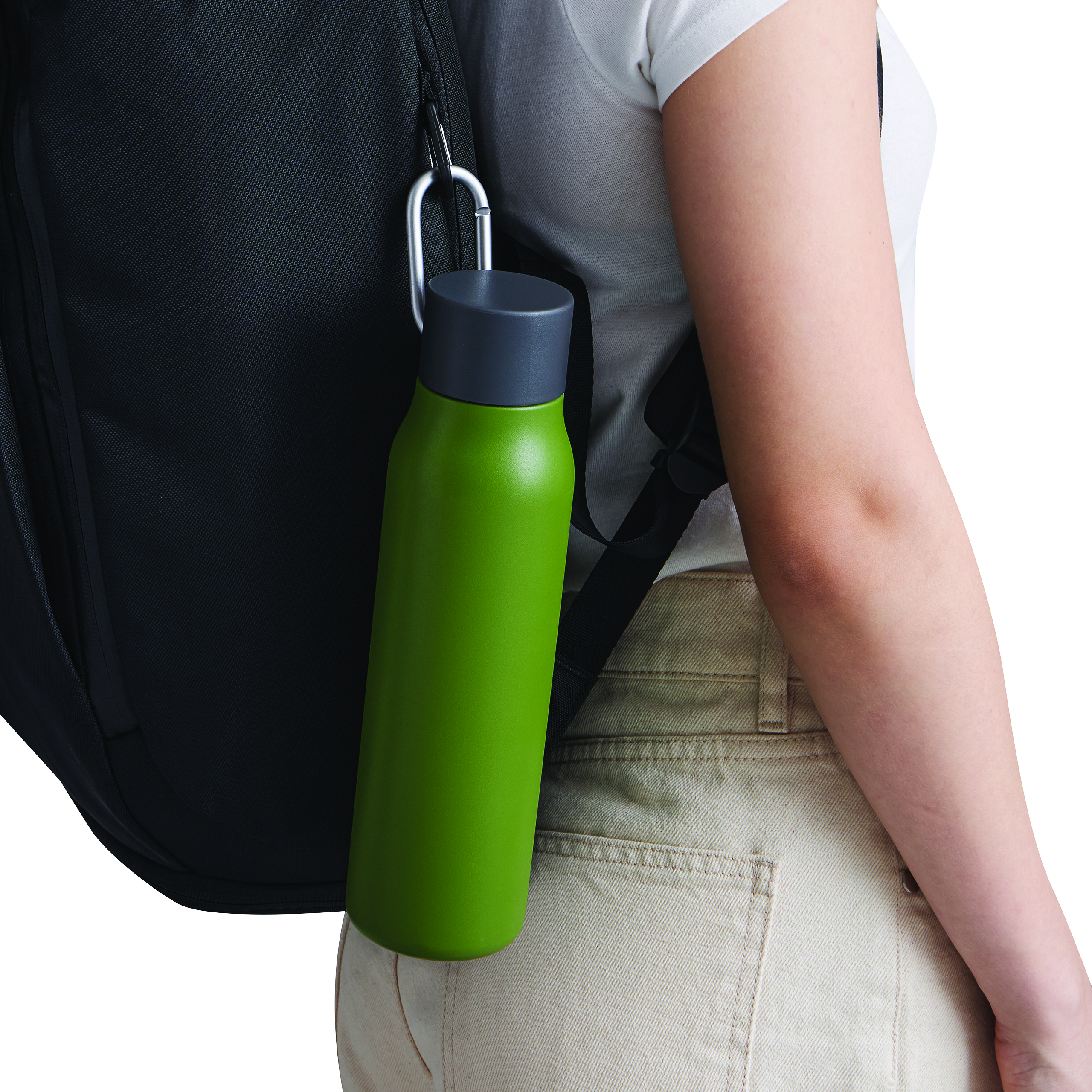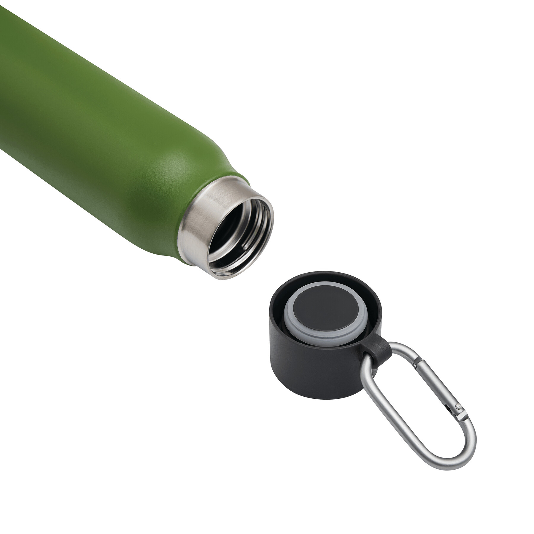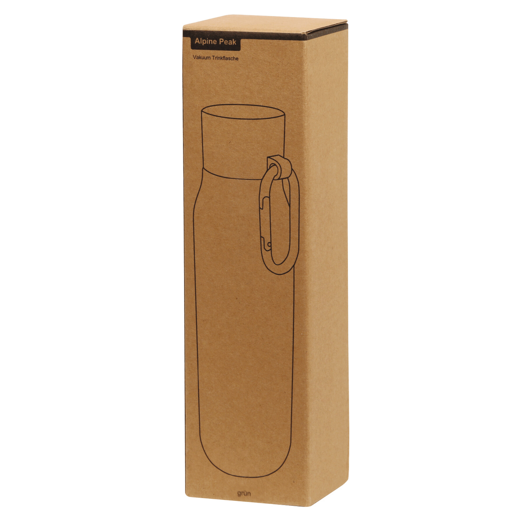 Próżniowa butelka ALPINE PEAK z podwójną izolacją. Wewnątrz wykonana ze stali nierdzewnej z recyklingu, na zewnątrz ze stali nierdzewnej. Posiada plastikową pokrywkę z bezpieczną zakrętką, silikonowy pierścień uszczelniający i karabińczyk (karabińczyk NIE nadaje się do wspinaczki). O pojemności ok. 550 ml. Utrzymuje ciepło przez ok. 8 godzin i zimno nawet do 12. Zapakowana jest w pudełko.