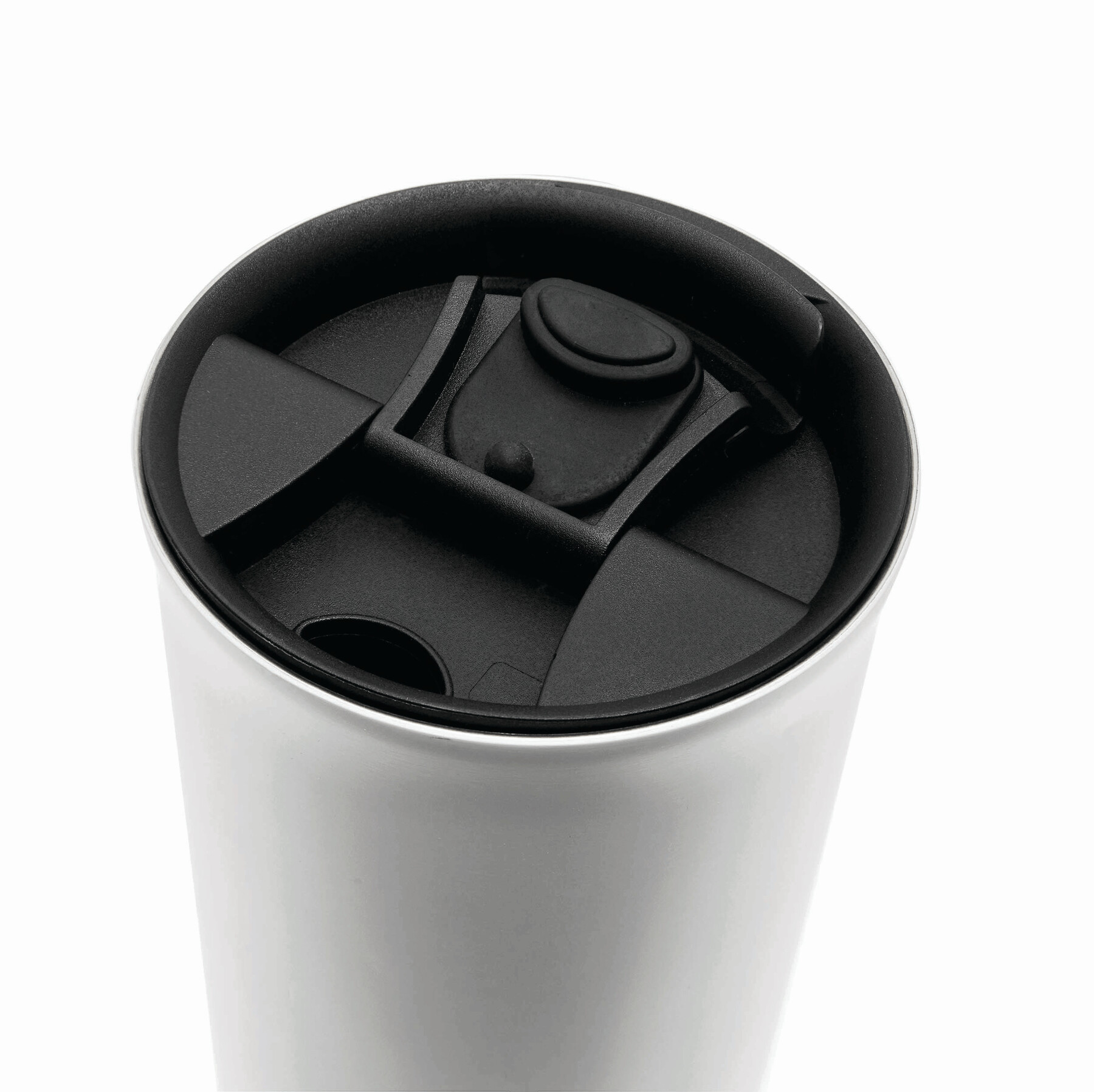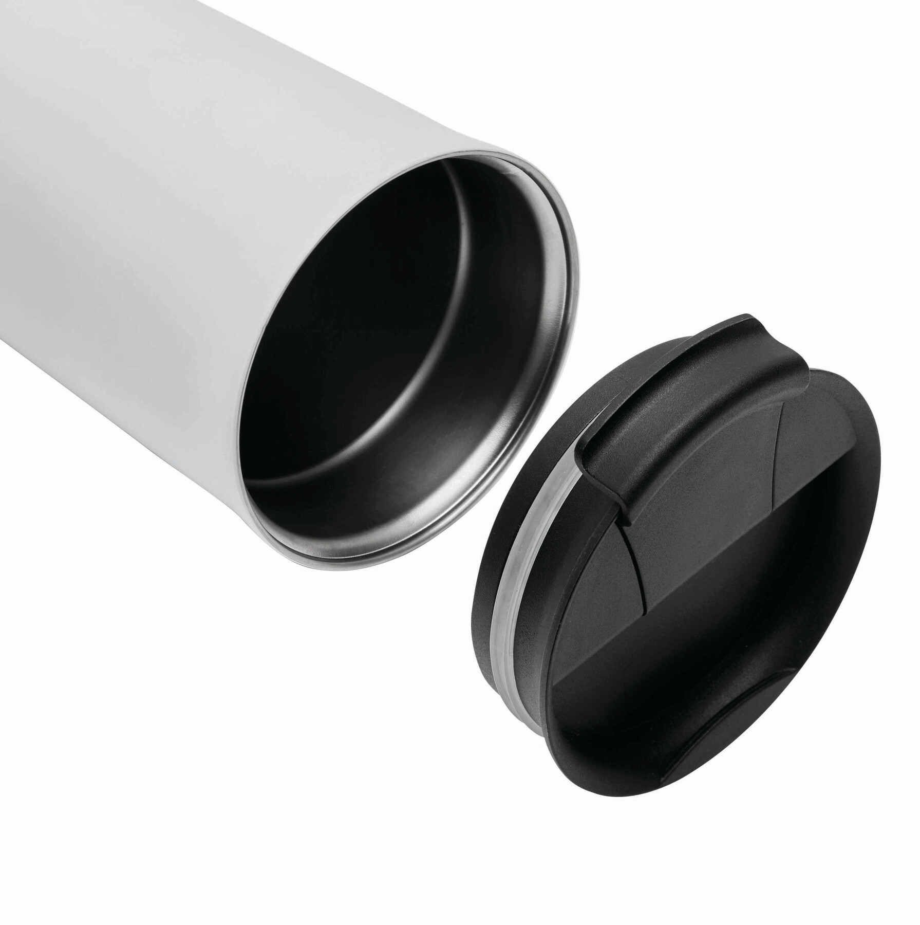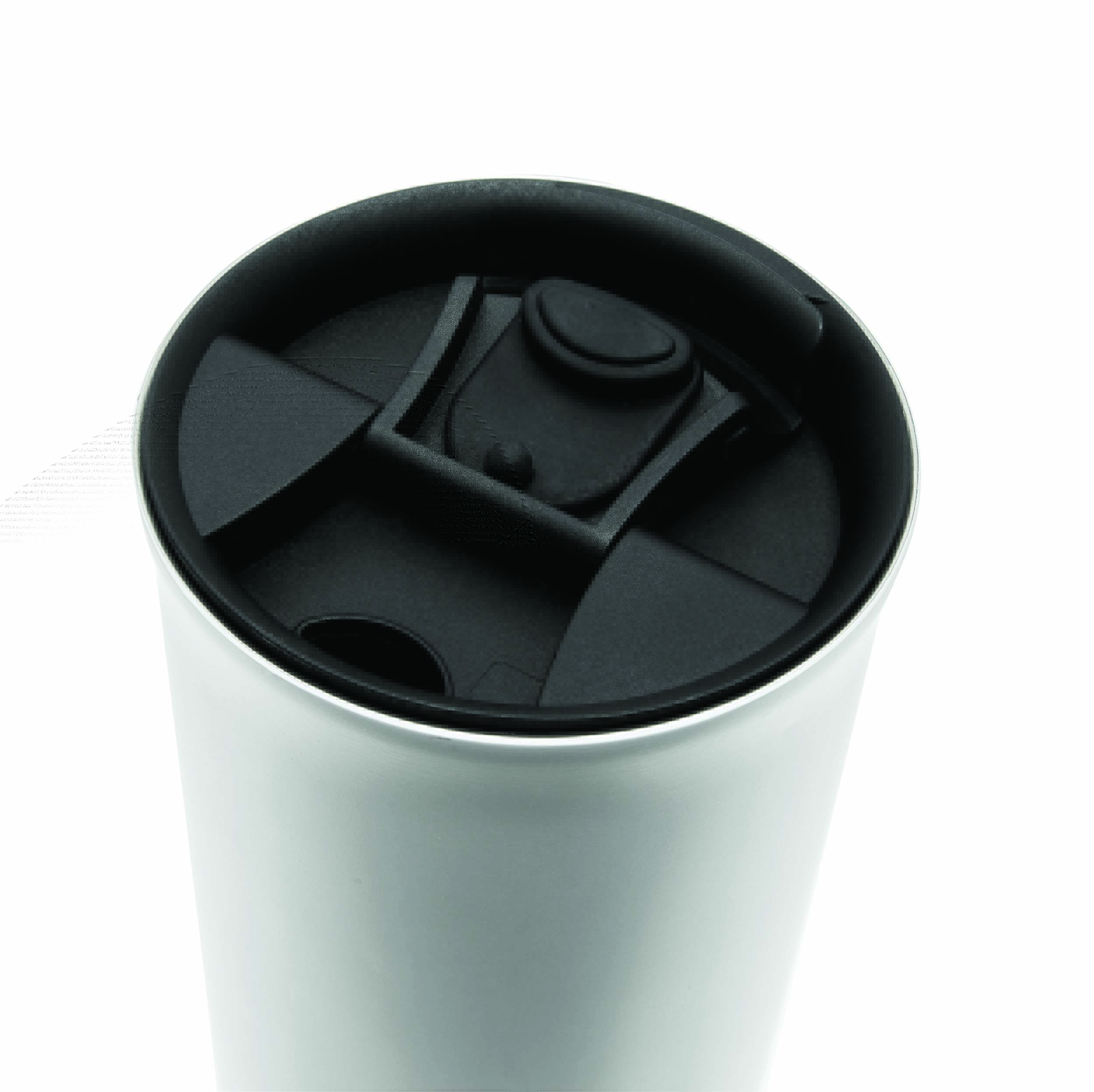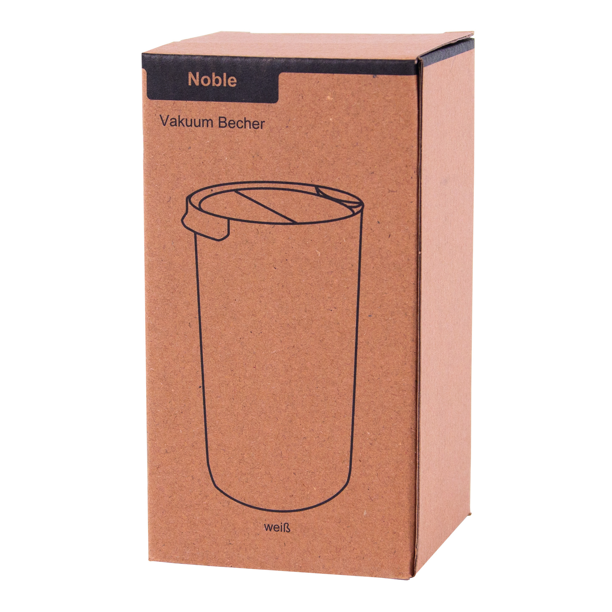 Próżniowy kubek do picia NOBLE, dwuścienny: wewnątrz i na zewnątrz ze stali nierdzewnej, pokrywka z tworzywa sztucznego z silikonową uszczelką i zintegrowanym otworem do picia na zatrzask, pojemność ok. 450 ml, utrzymuje ciepło do 8 godzin i zimno do 12 godzin.