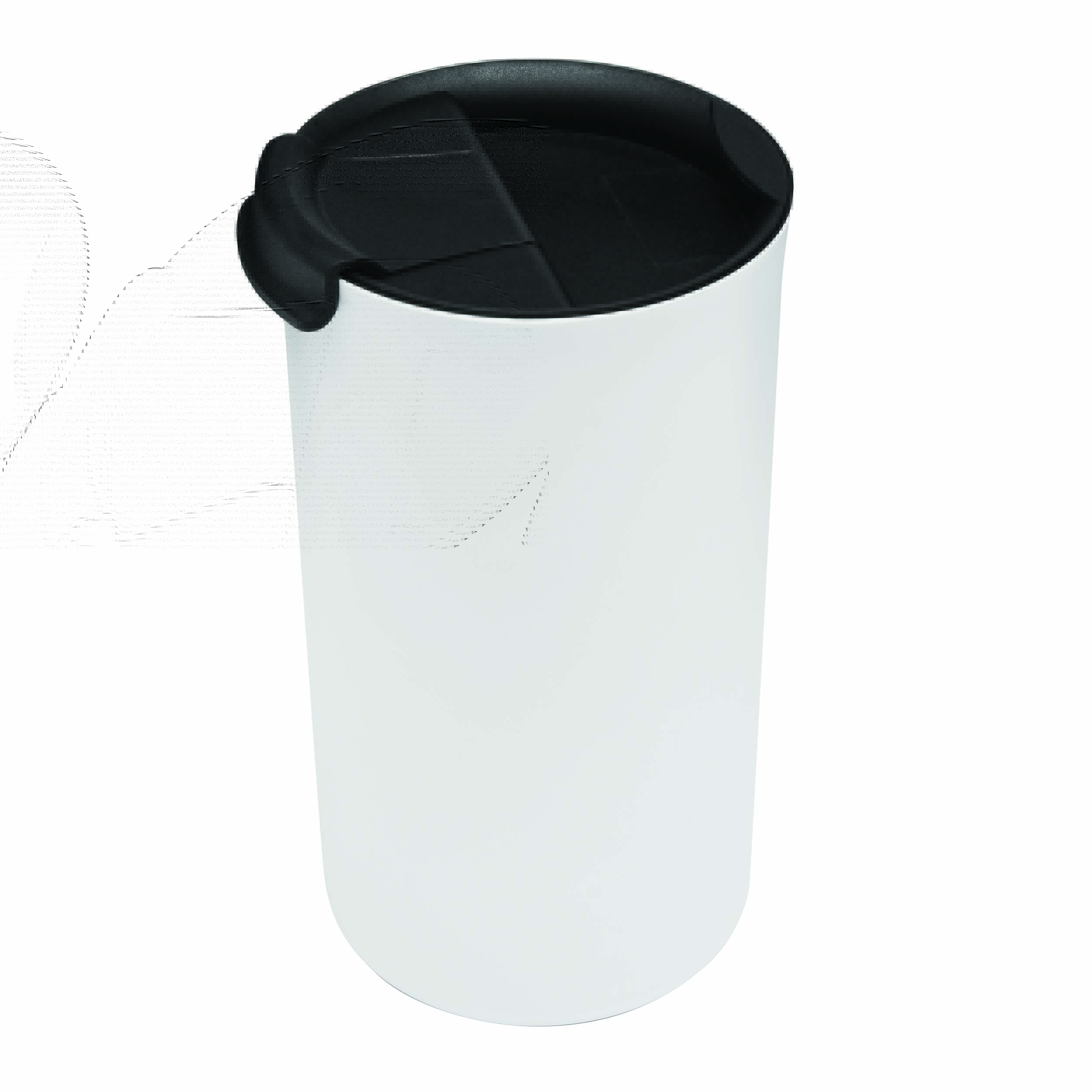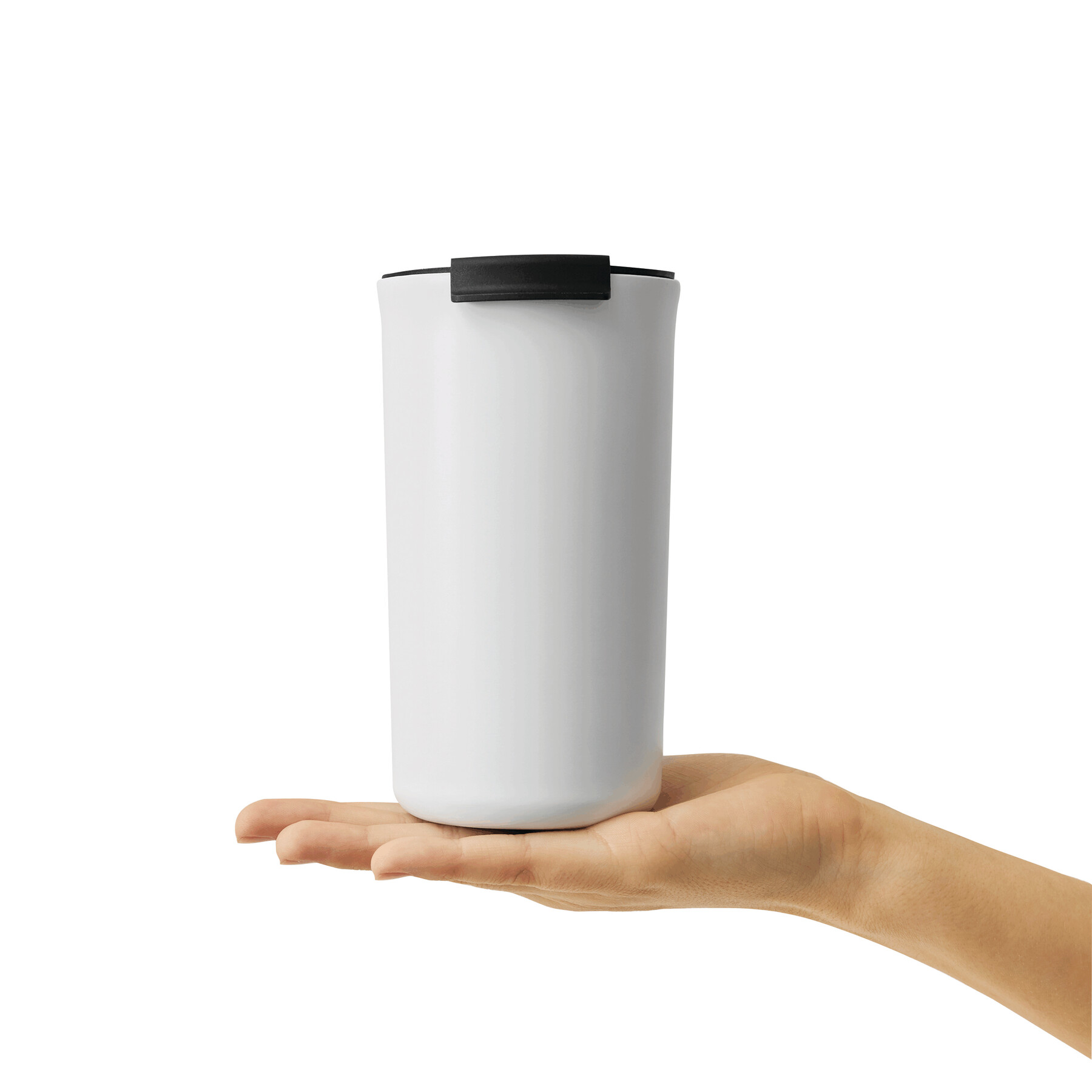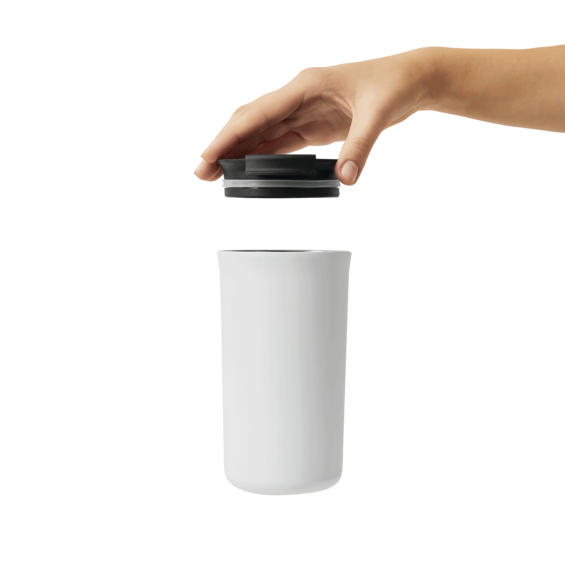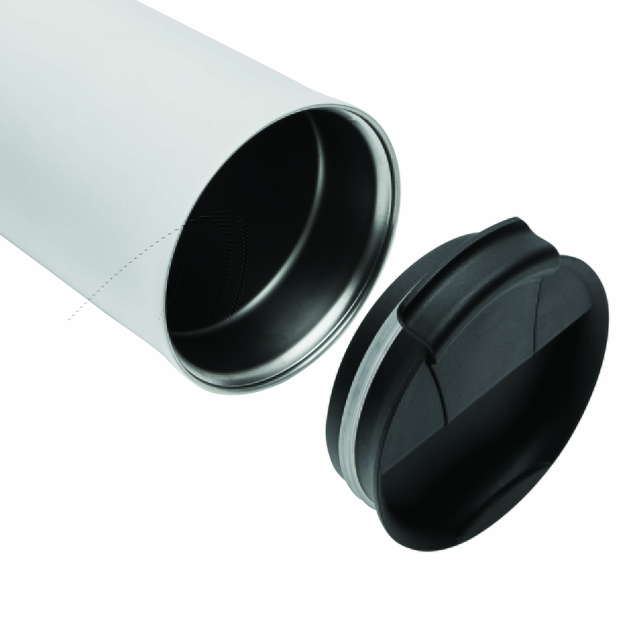 Próżniowy kubek do picia NOBLE, dwuścienny: wewnątrz i na zewnątrz ze stali nierdzewnej, pokrywka z tworzywa sztucznego z silikonową uszczelką i zintegrowanym otworem do picia na zatrzask, pojemność ok. 450 ml, utrzymuje ciepło do 8 godzin i zimno do 12 godzin.