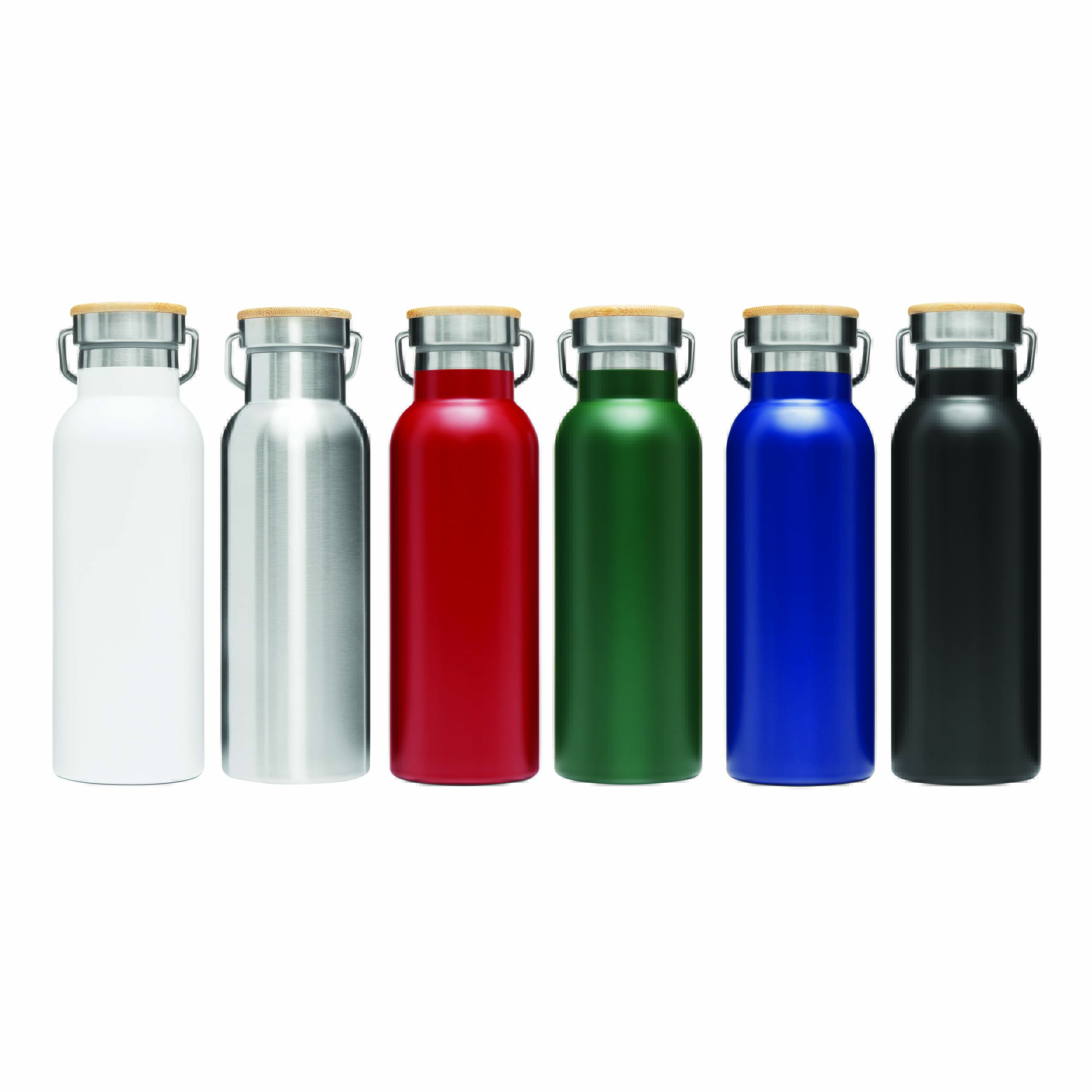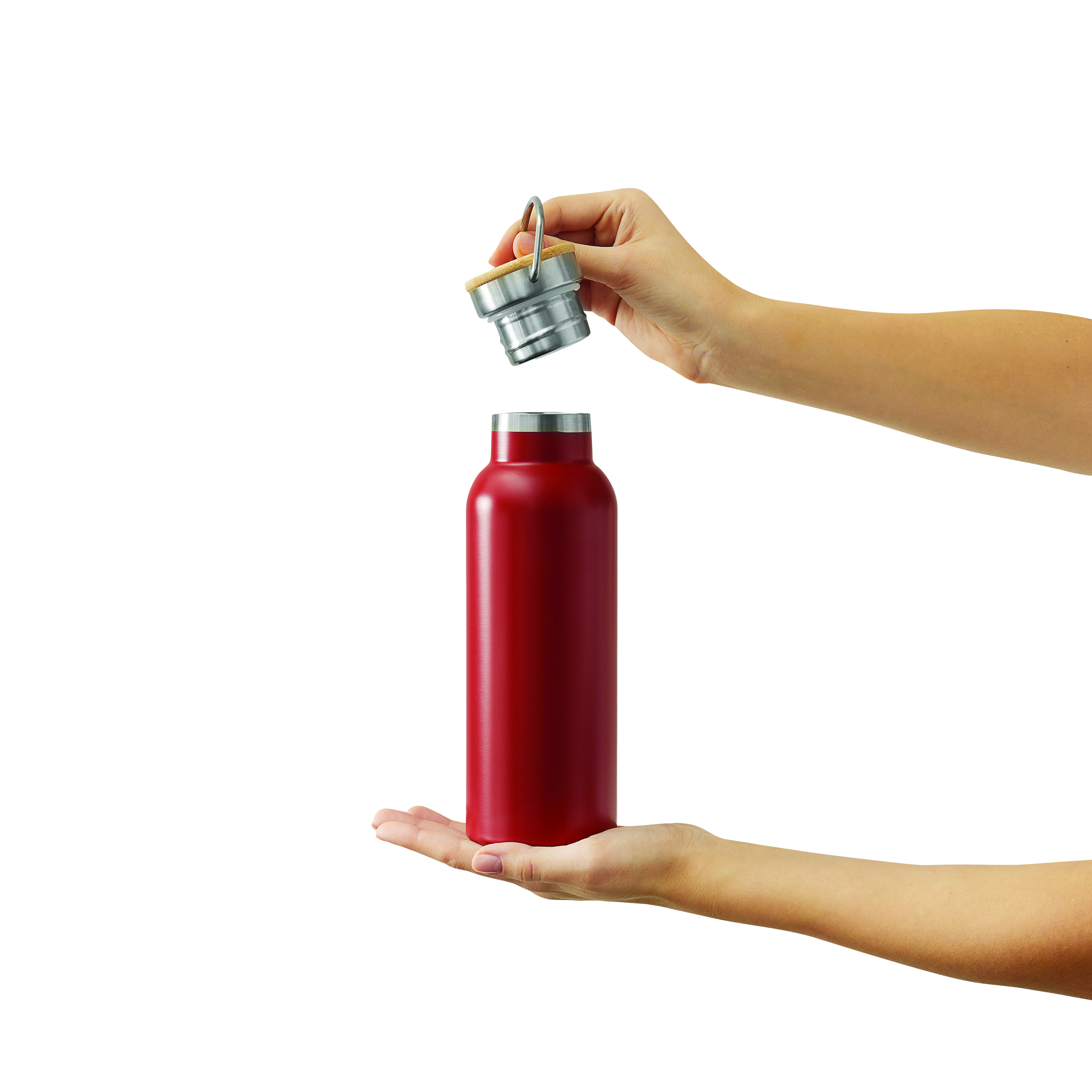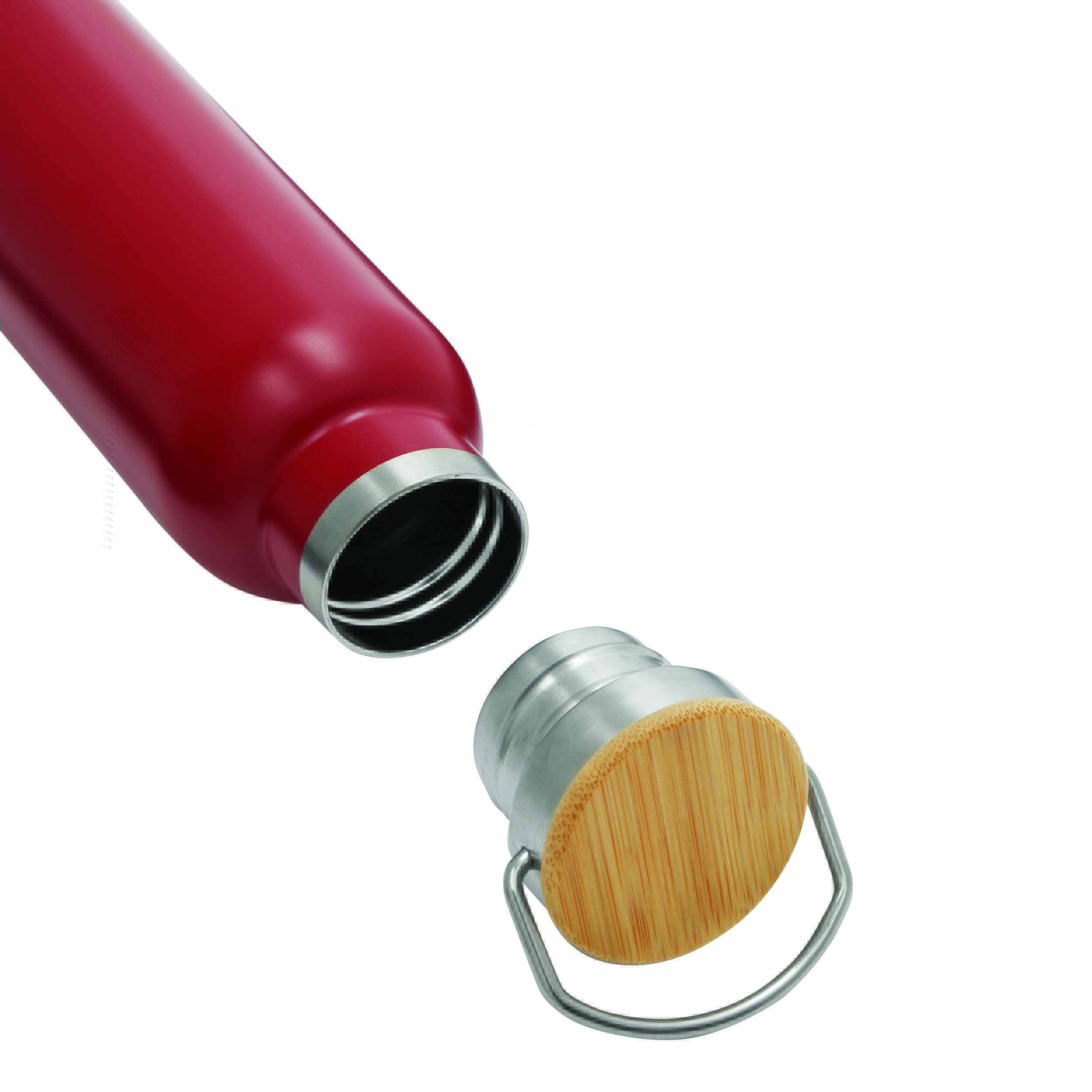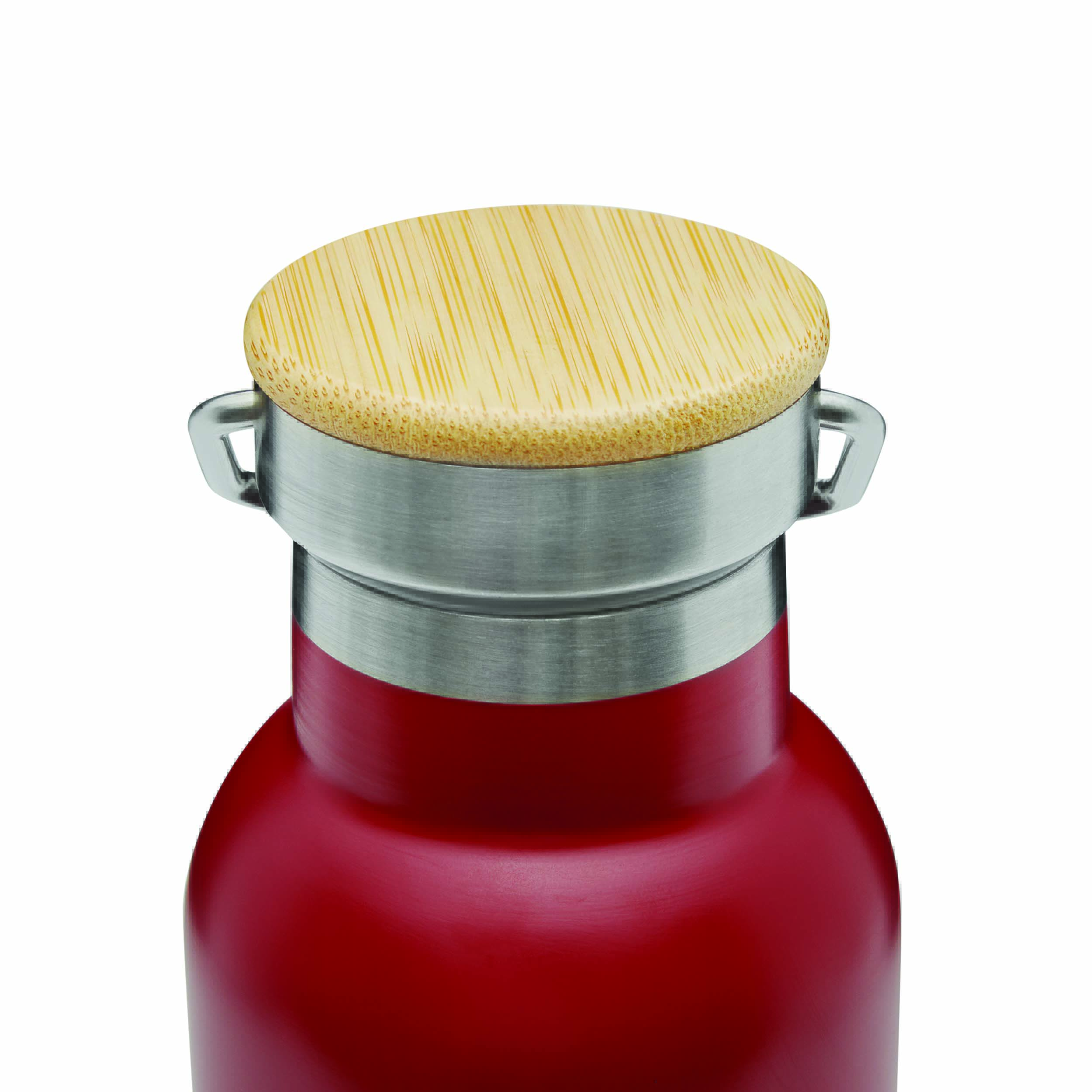 Butelka próżniowa do picia ECO FLAVOUR, dwuścienna: wewnątrz i na zewnątrz ze stali nierdzewnej, bezpieczna zakrętka z bambusa z silikonową uszczelką i pętlą do noszenia, pojemność ok. 500 ml, utrzymuje ciepło do 8 godzin i zimno do 12 godzin.