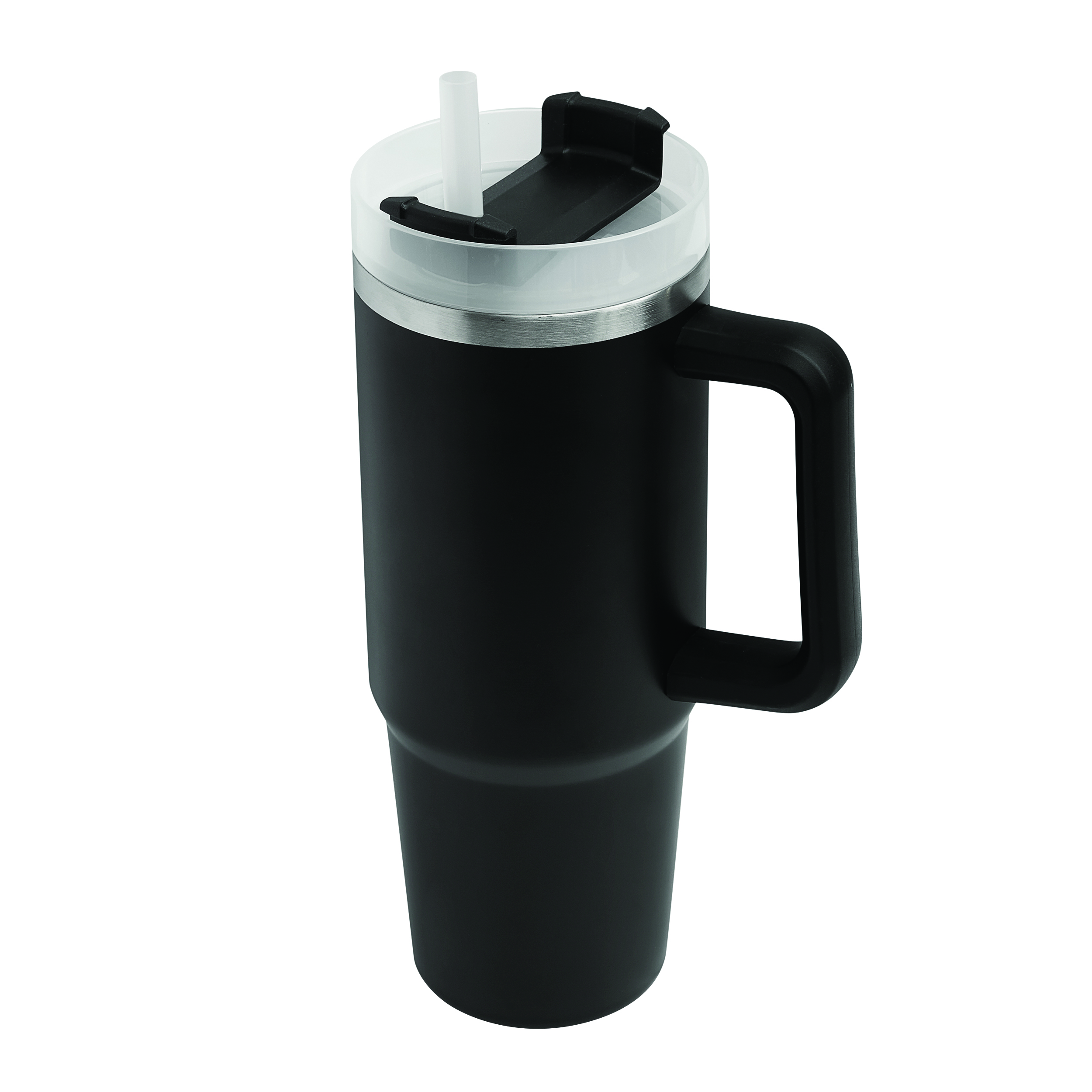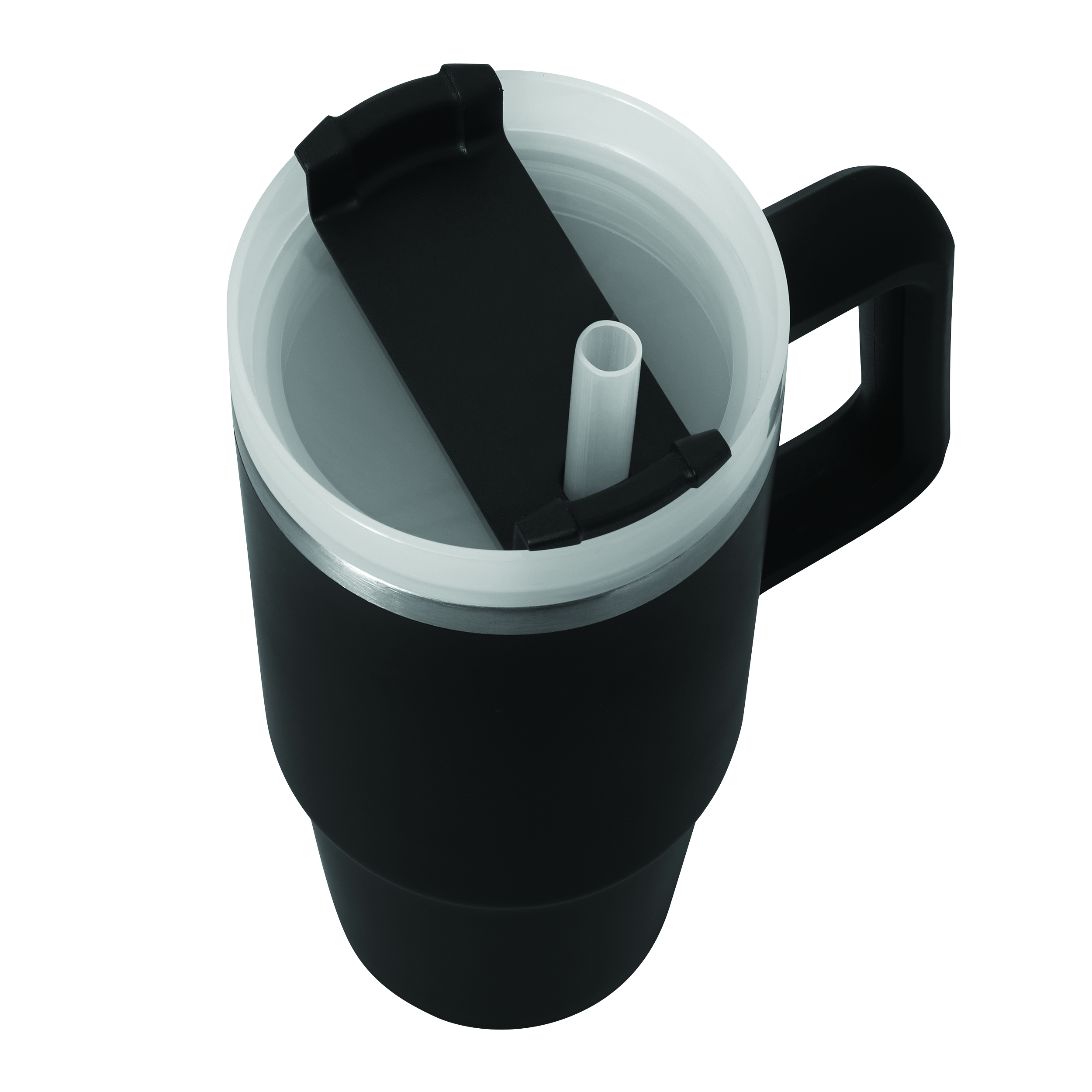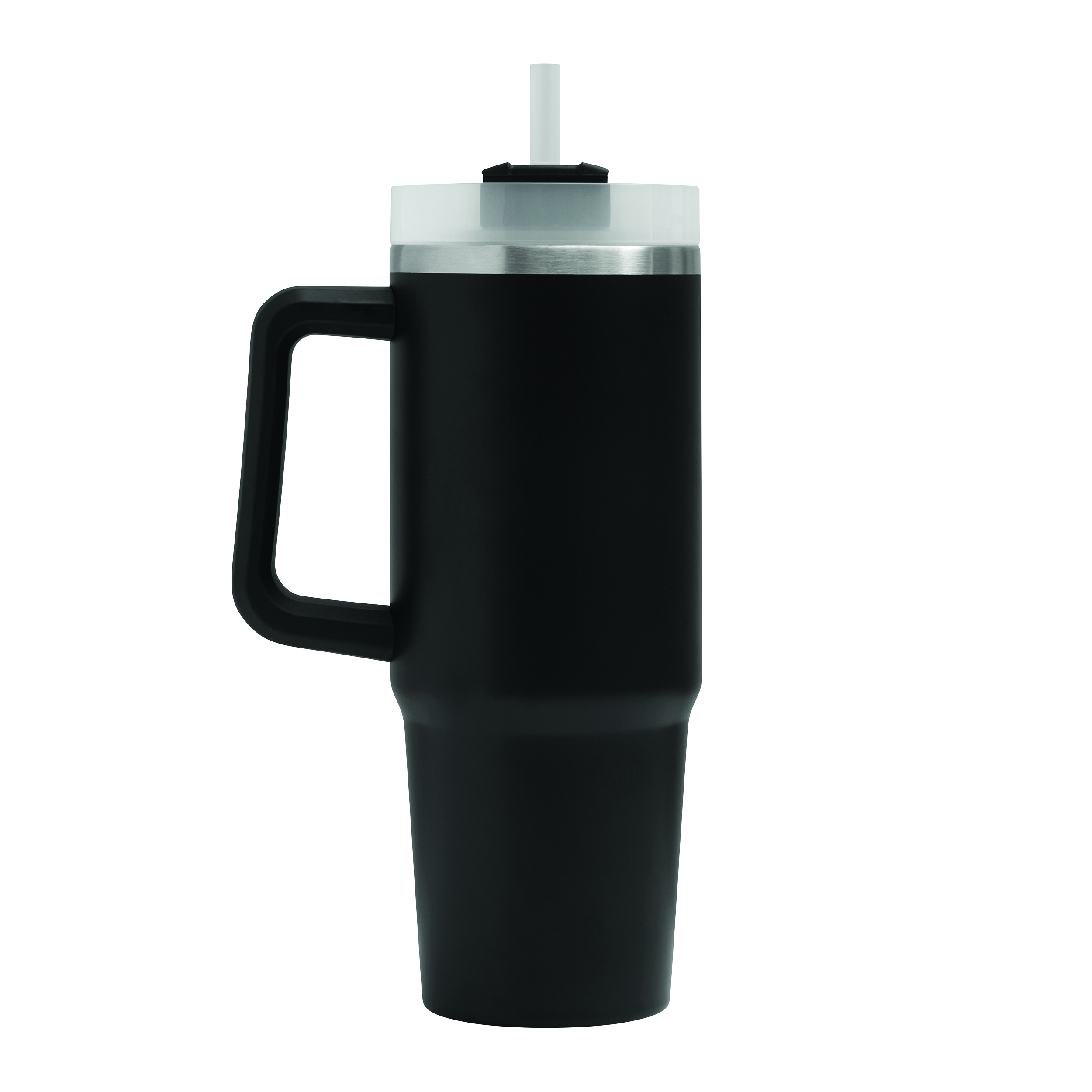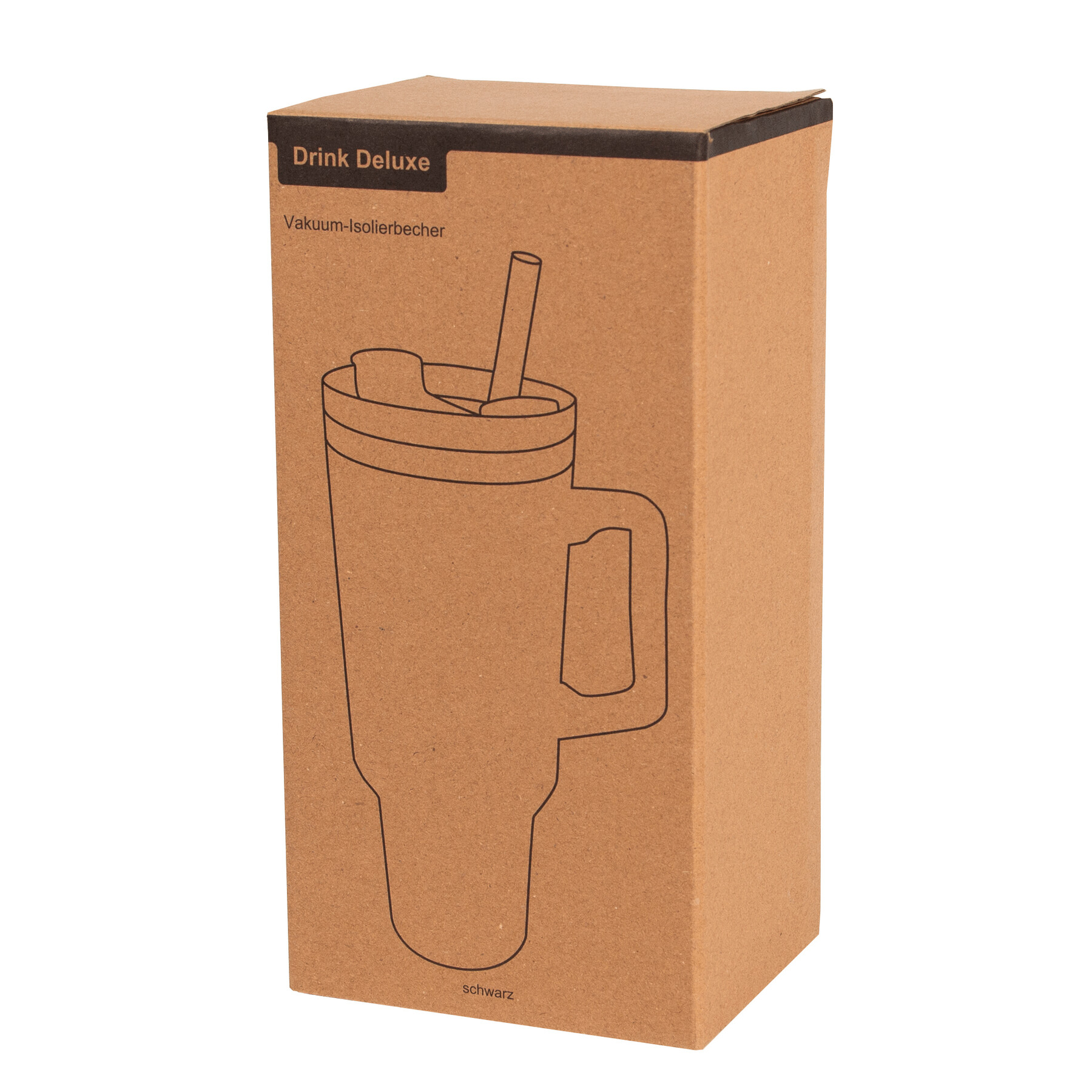 Próżniowy kubek do picia DRINK DELUXE. Z podwójną izolacją – na zewnątrz i wewnątrz wykonany jest ze stali nierdzewnej. Posiada praktyczny uchwyt i szczelną, przezroczystą, plastikową pokrywkę z silikonową uszczelką. Ma zarówno wbudowany otwór do picia, jak i słomkę. Pojemność butelki to ok. 900 ml.