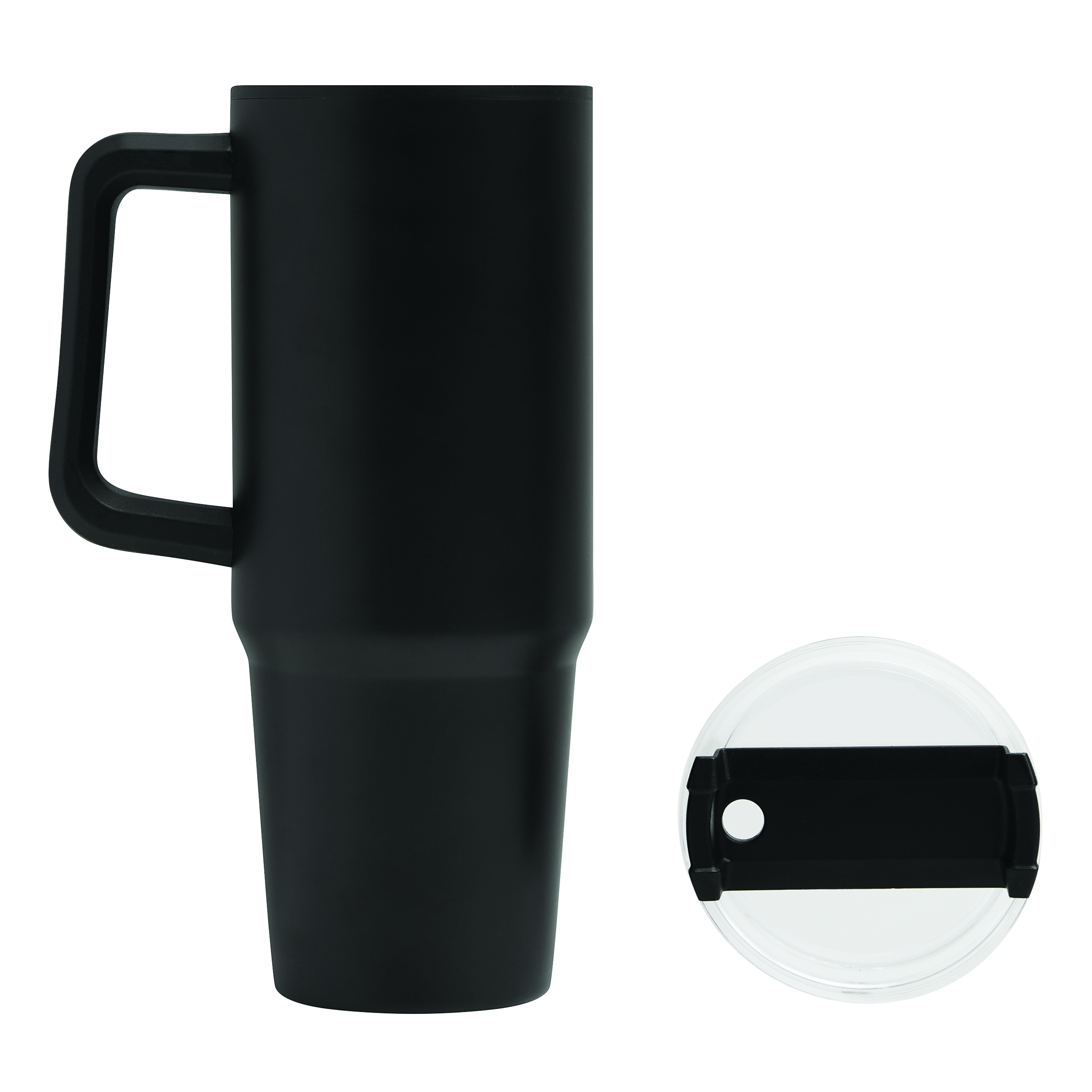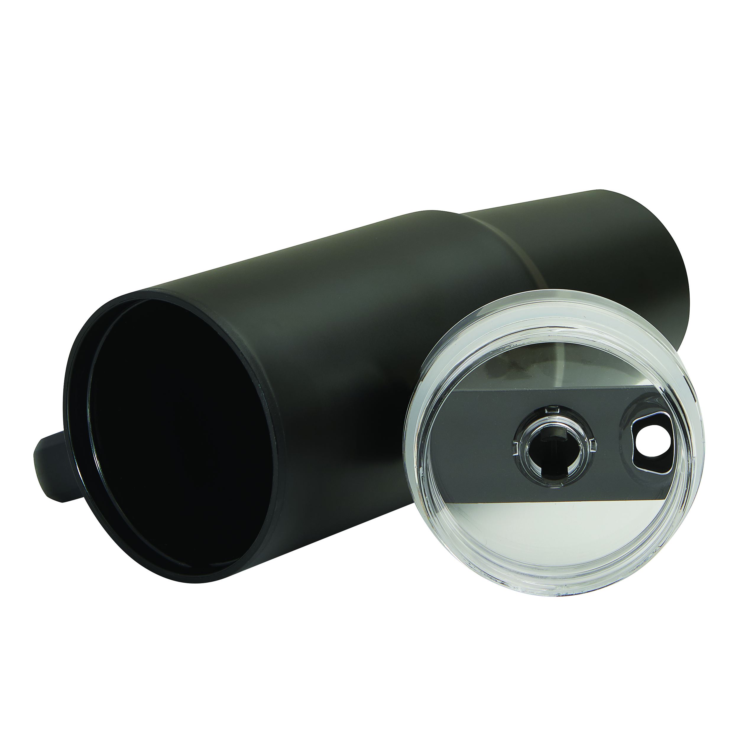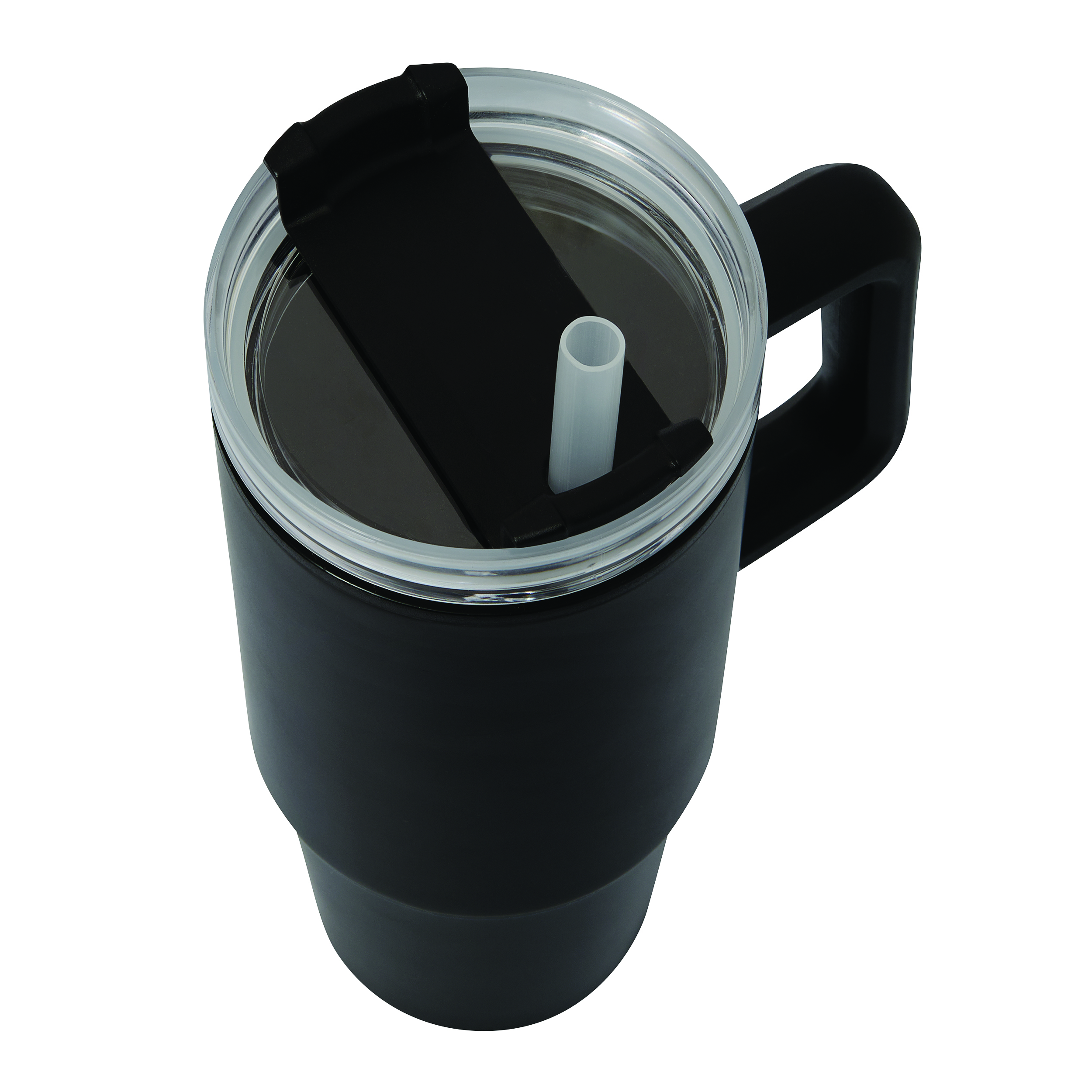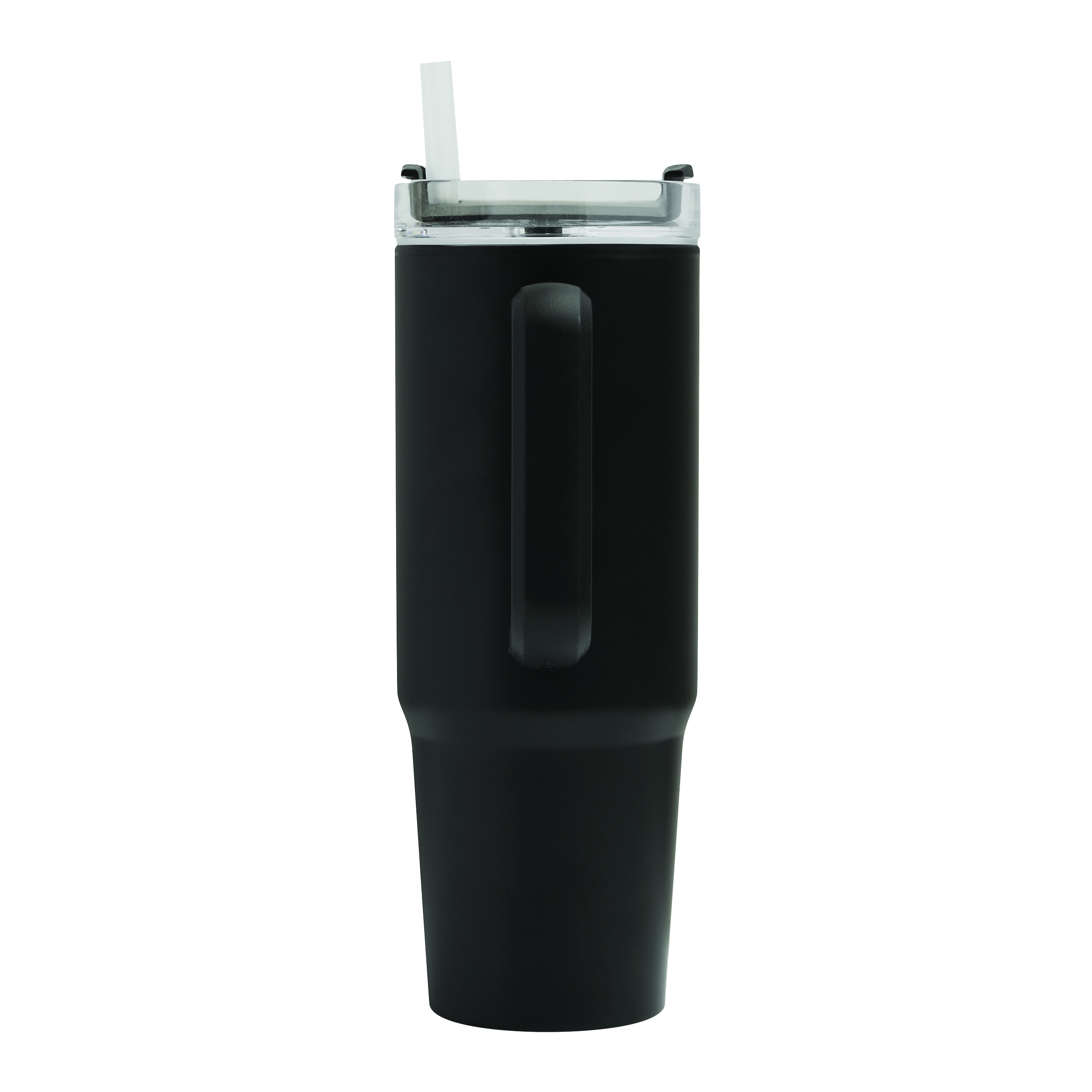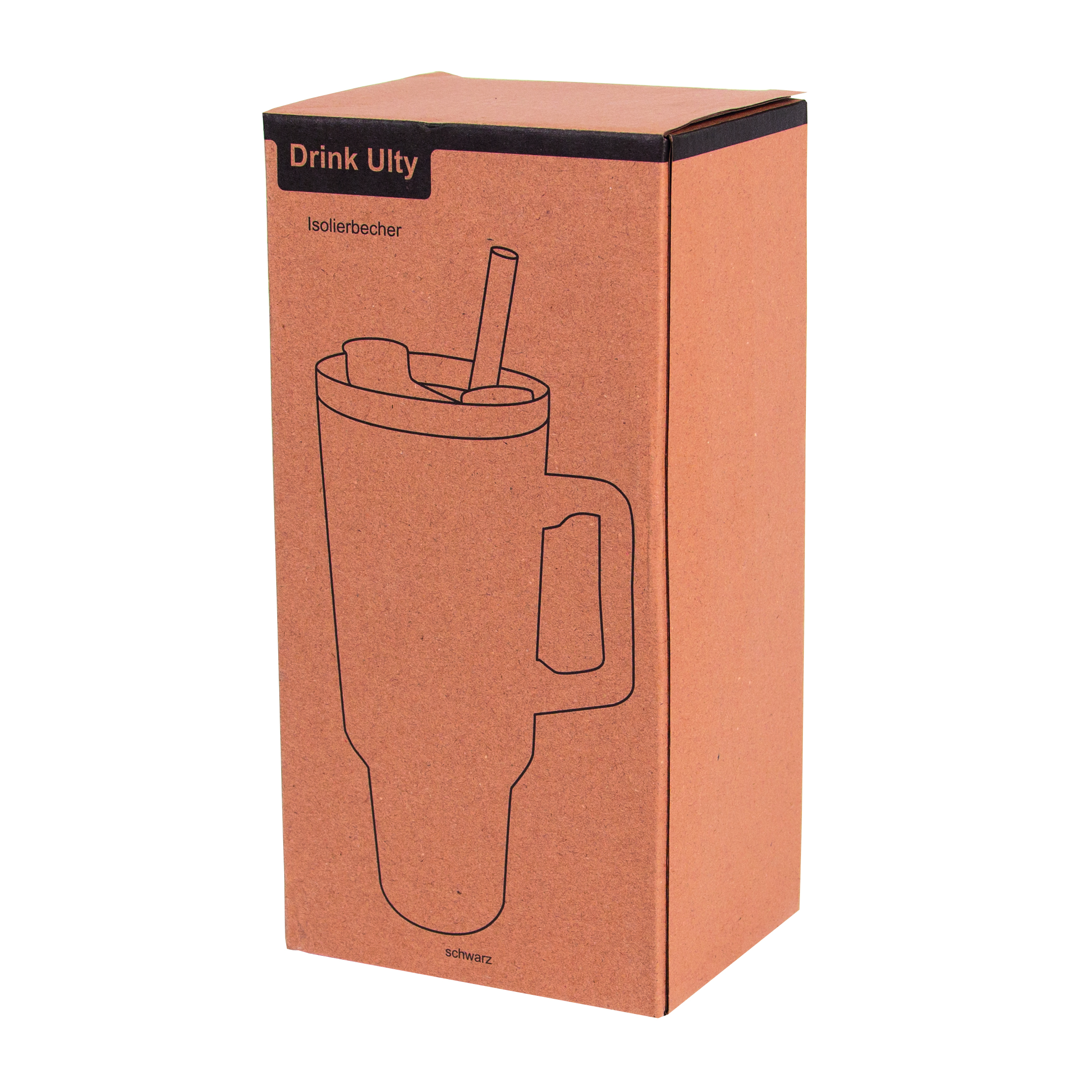 Kubek do picia DRINK ULTY. Z podwójną izolacją – na zewnątrz wykonany jest ze stali nierdzewnej, a wewnątrz z tworzywa sztucznego. Posiada praktyczny uchwyt i szczelną, przezroczystą, plastikową pokrywkę z silikonową uszczelką. Ma zarówno wbudowany otwór do picia, jak i słomkę. Pojemność butelki to ok. 900 ml.