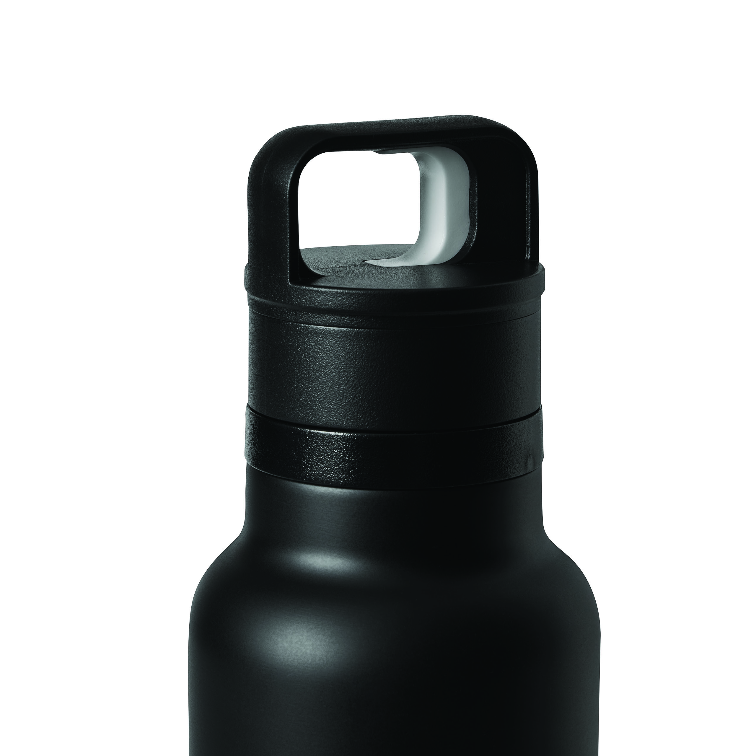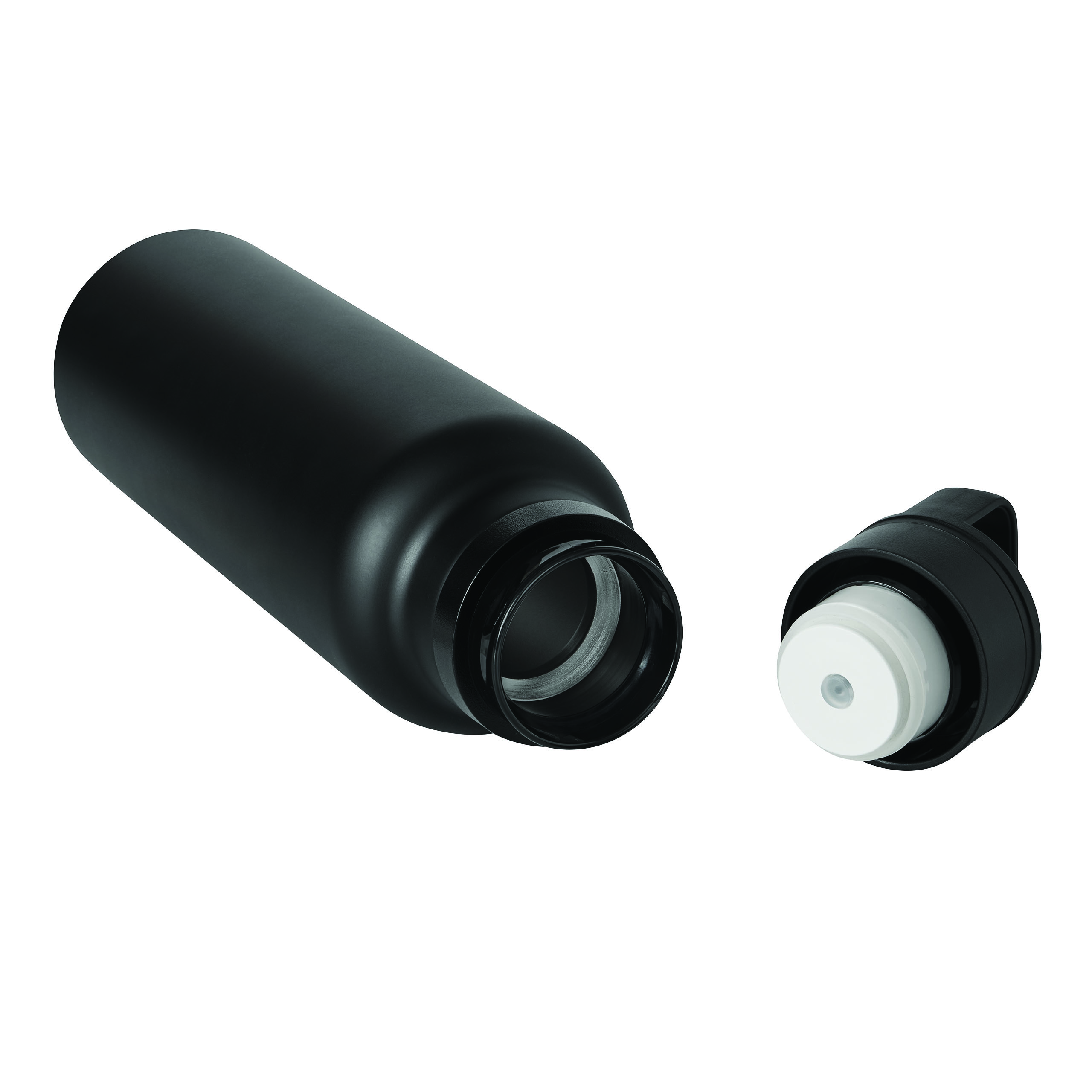 Butelka termiczna TRAVELCLICK z podwójną izolacją. Wewnątrz i na zewnątrz wykonana jest ze stali nierdzewnej. Ma czarną plastikową nakrętkę z zamknięciem zatrzaskowym umożliwiającym obsługę jedną ręką, silikonowy pierścień uszczelniający i uchwyt do przenoszenia. Ma pojemność ok. 750 ml i utrzymuje ciepło przez ok. 8 godzin, a zimno do 12. Zapakowana jest w pudełko.
