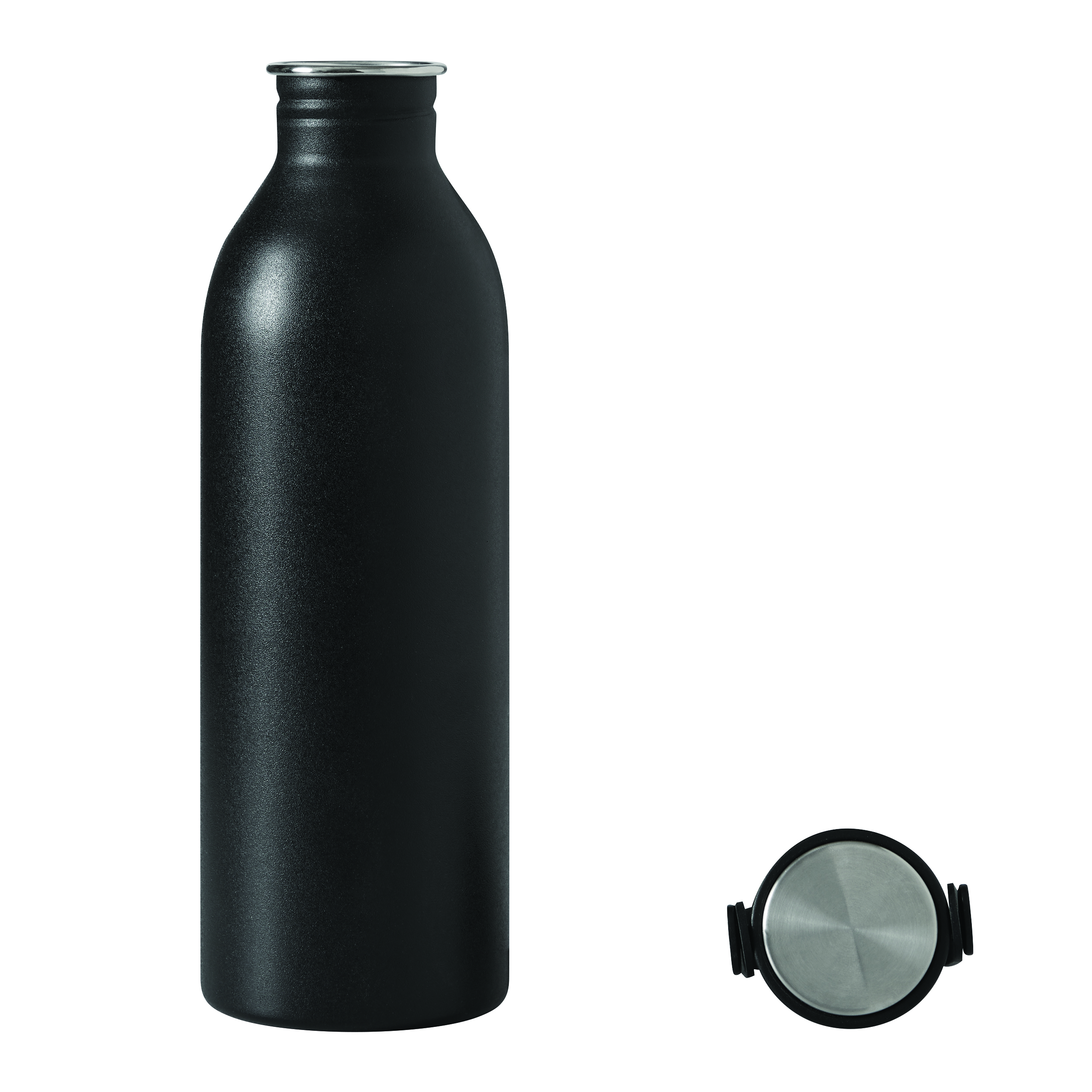 Butelka GET REFRESH, z matową powłoką proszkową. Ma plastikową pokrywę z bezpieczną zakrętką, której górna powierzchnia wykonana jest ze stali nierdzewnej. Posiada silikonowy pasek do przenoszenia. Pojemność butelki to ok. 550 ml.