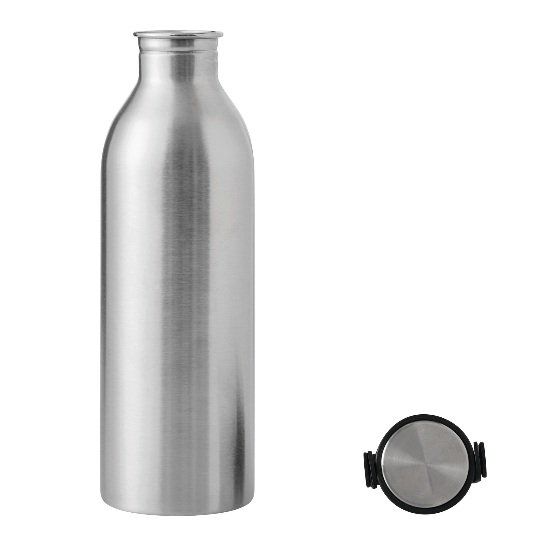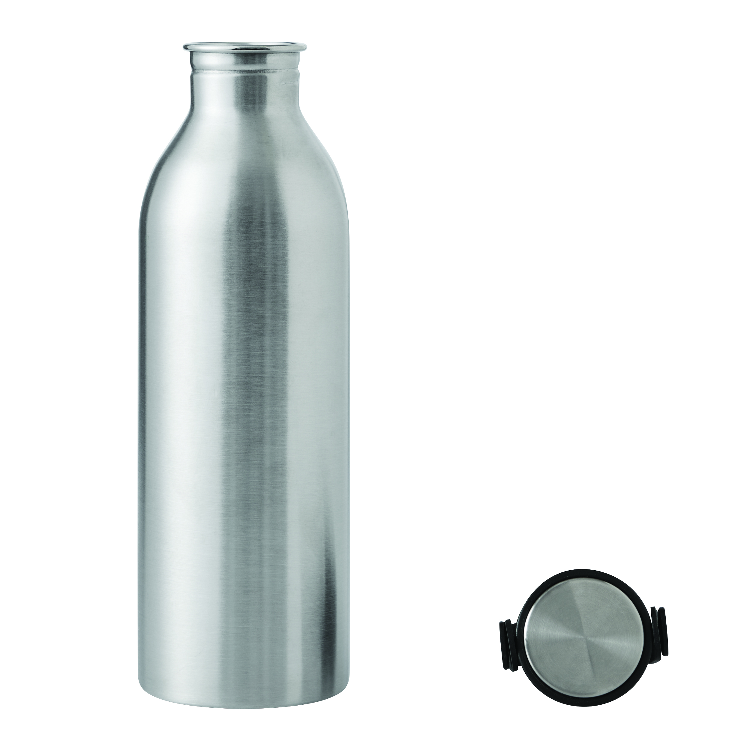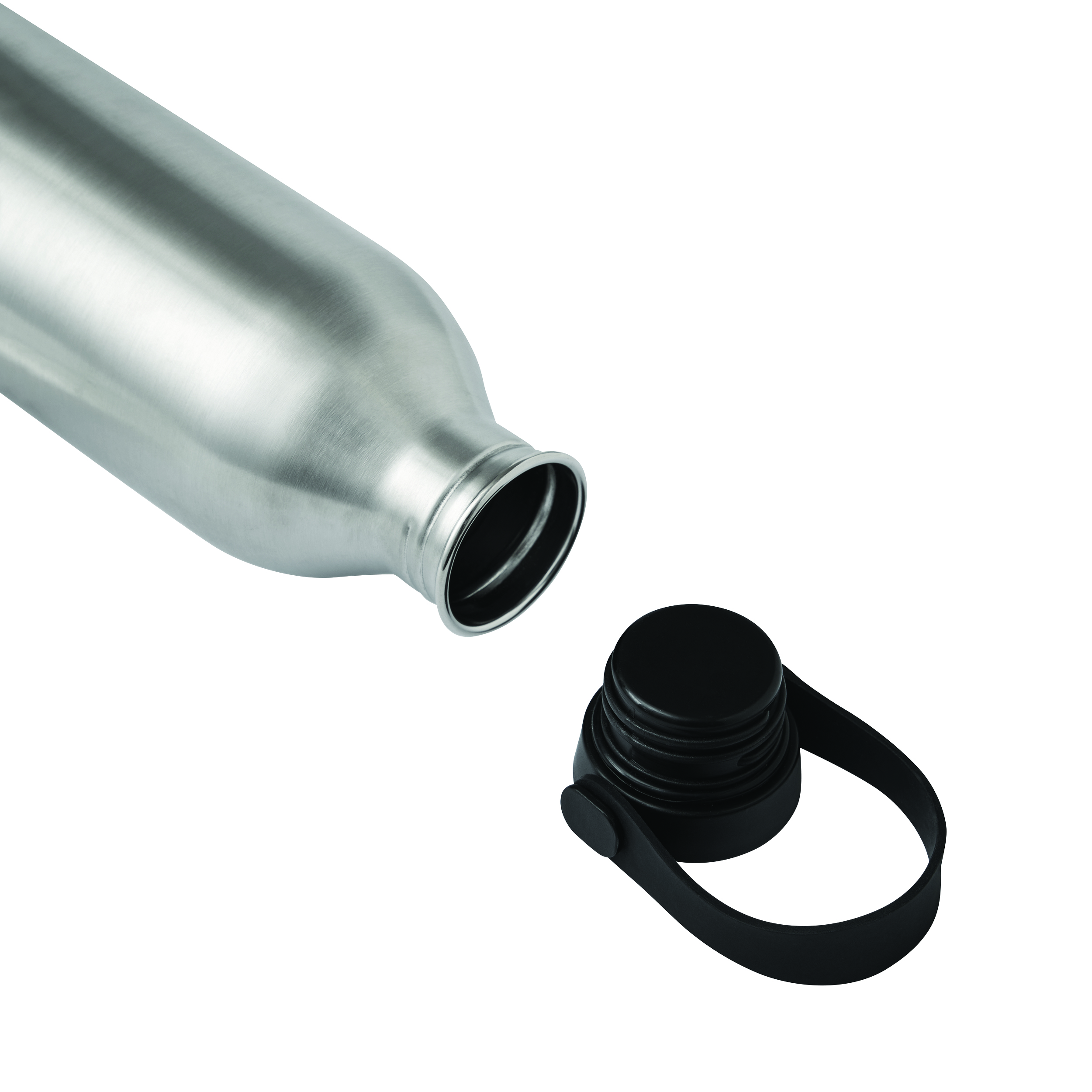 Butelka GET REFRESH, z matową powłoką proszkową. Ma plastikową pokrywę z bezpieczną zakrętką, której górna powierzchnia wykonana jest ze stali nierdzewnej. Posiada silikonowy pasek do przenoszenia. Pojemność butelki to ok. 550 ml.