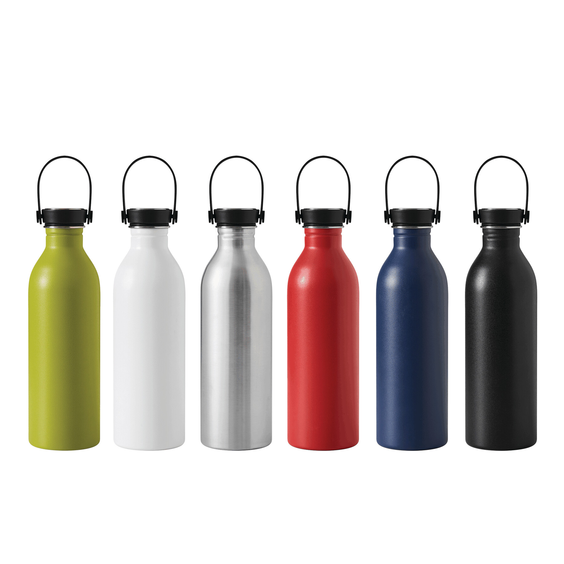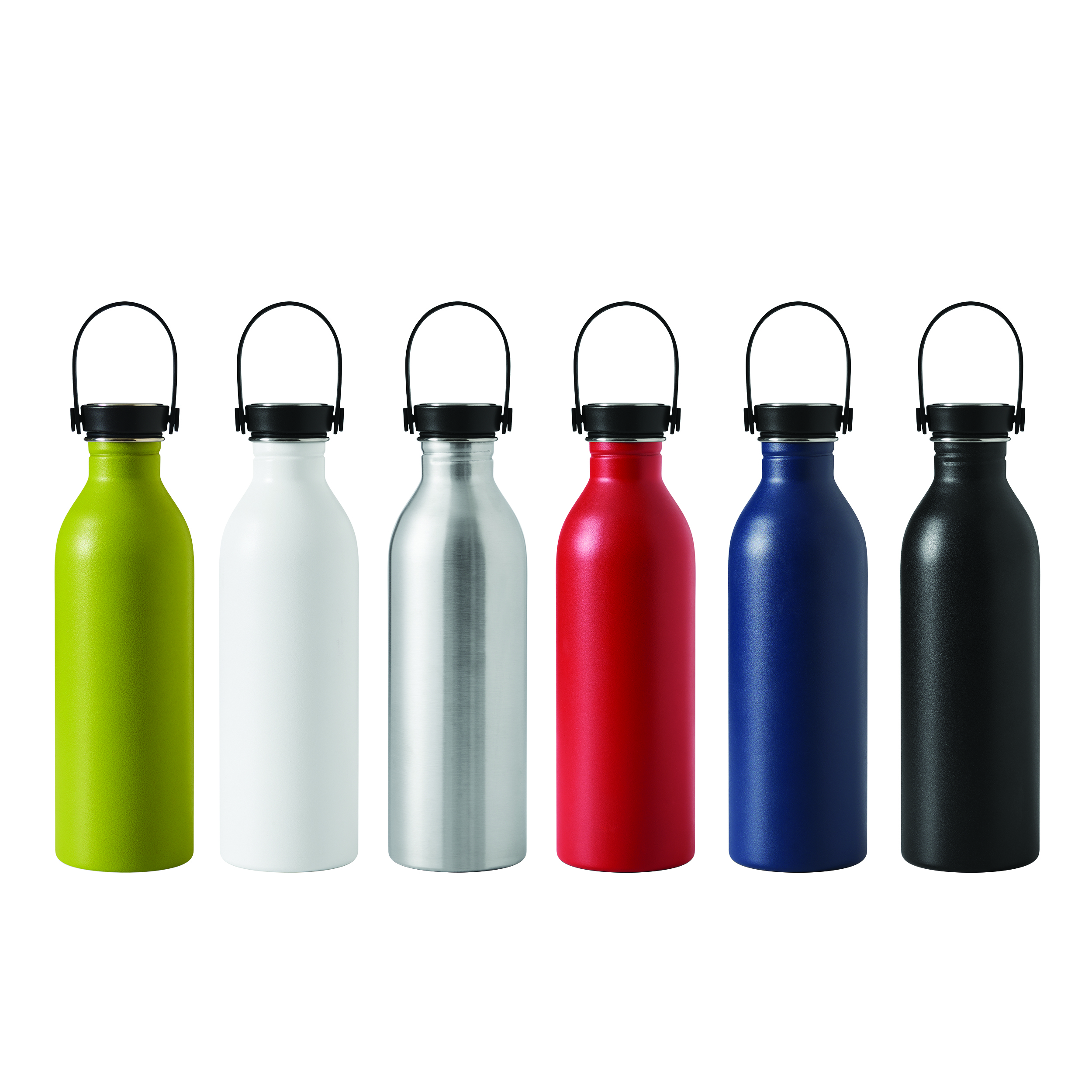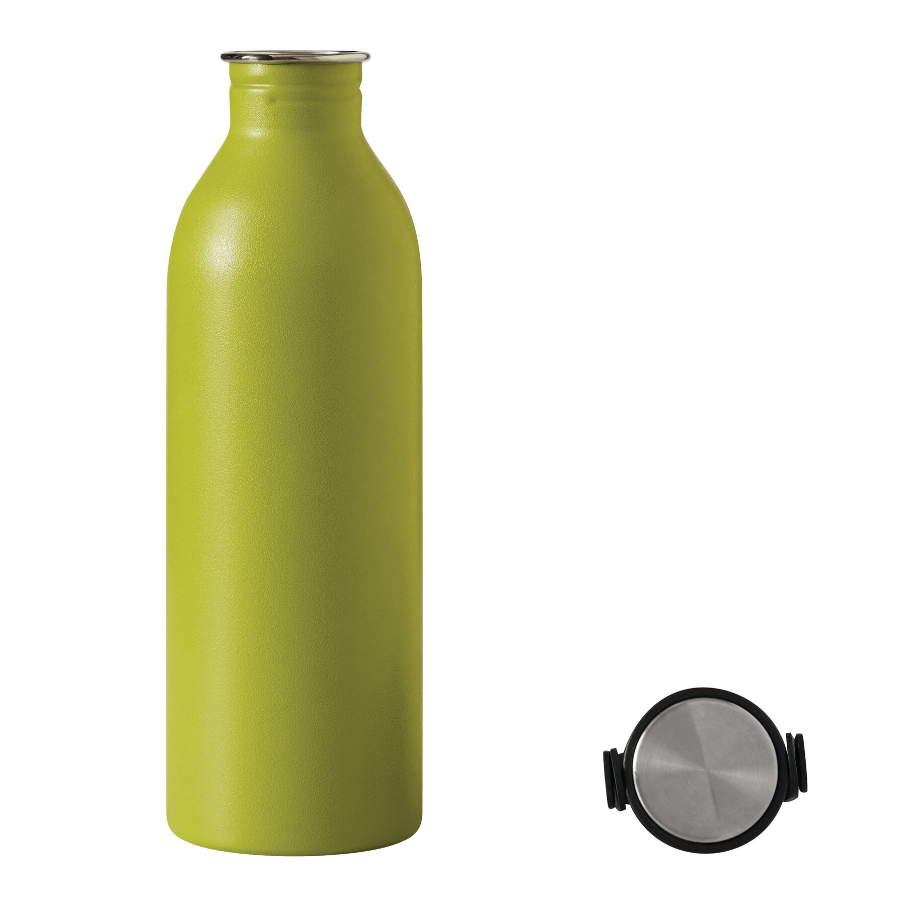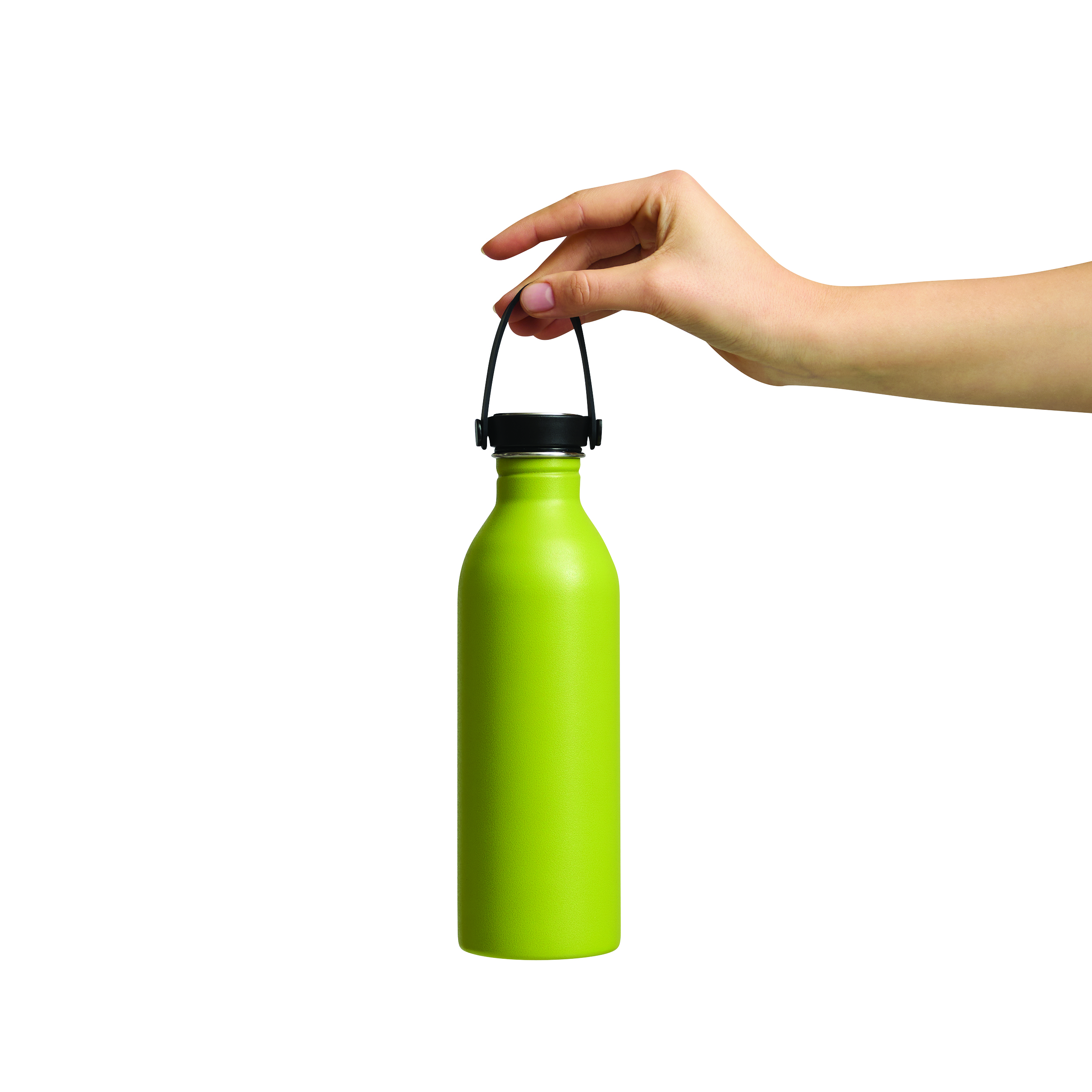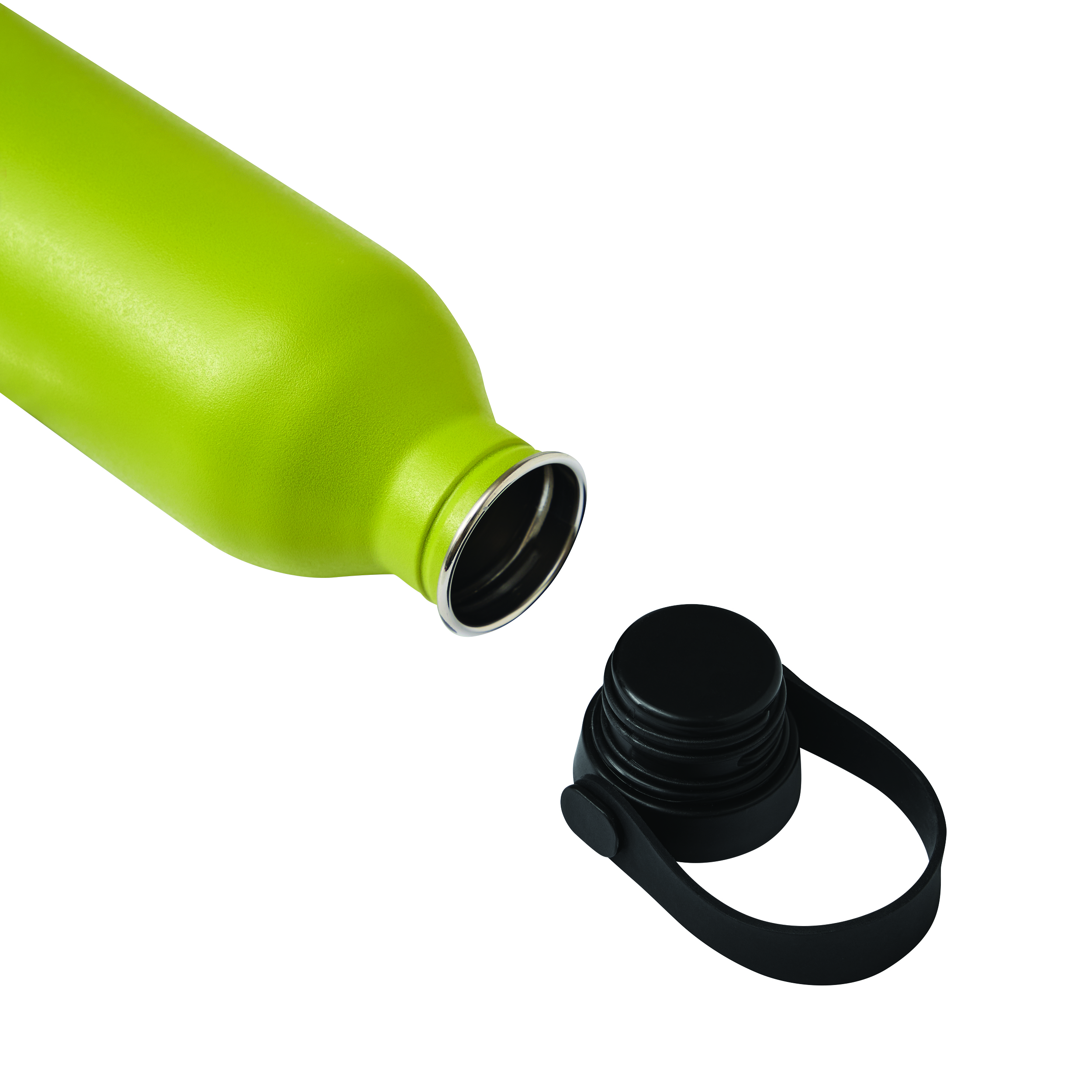 Butelka GET REFRESH, z matową powłoką proszkową. Ma plastikową pokrywę z bezpieczną zakrętką, której górna powierzchnia wykonana jest ze stali nierdzewnej. Posiada silikonowy pasek do przenoszenia. Pojemność butelki to ok. 550 ml.