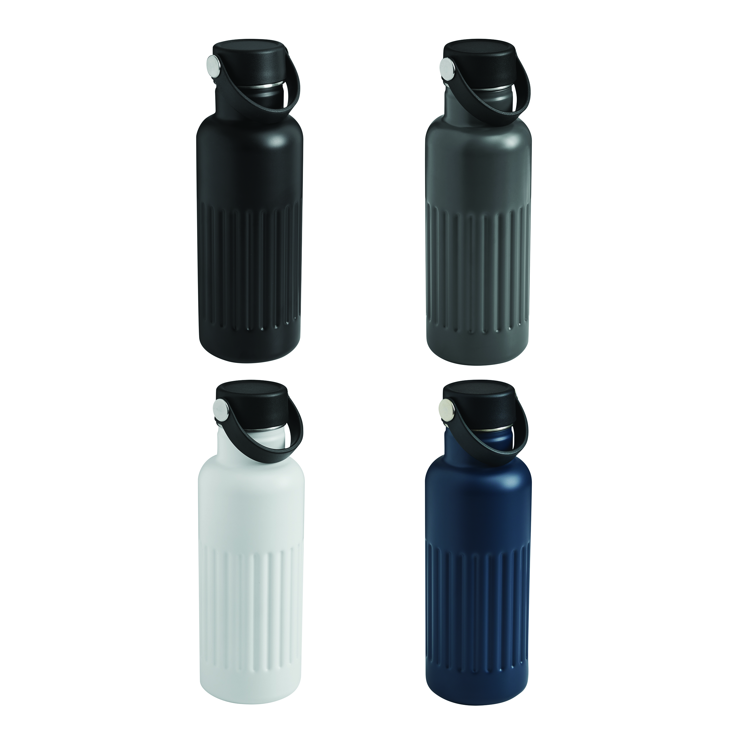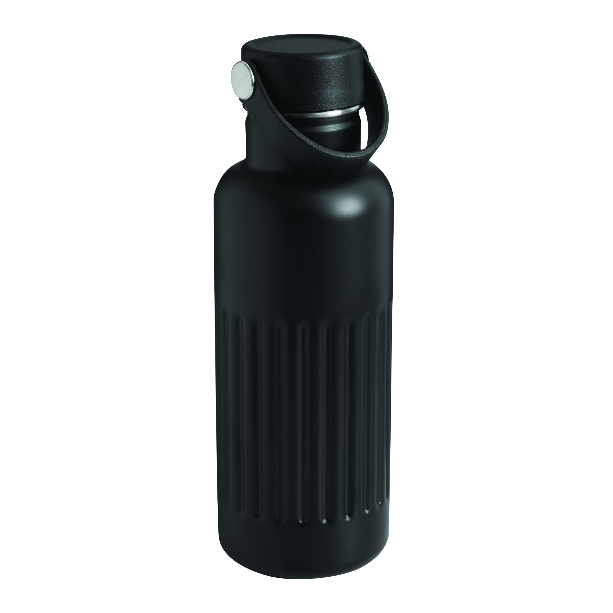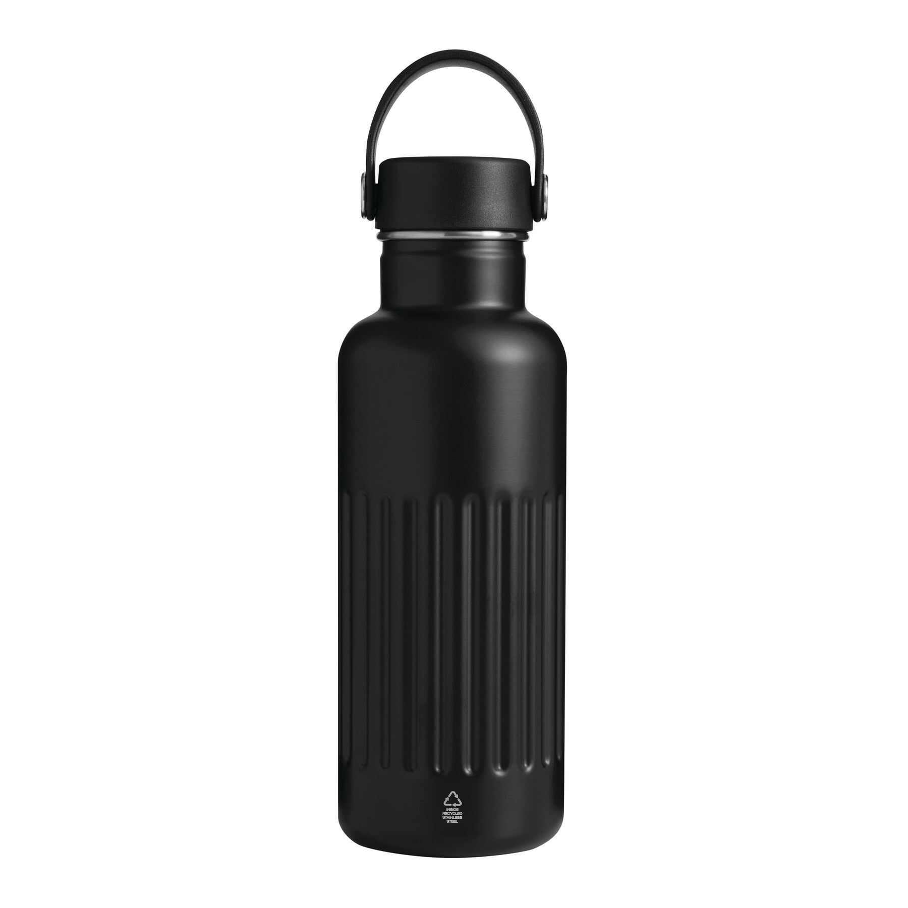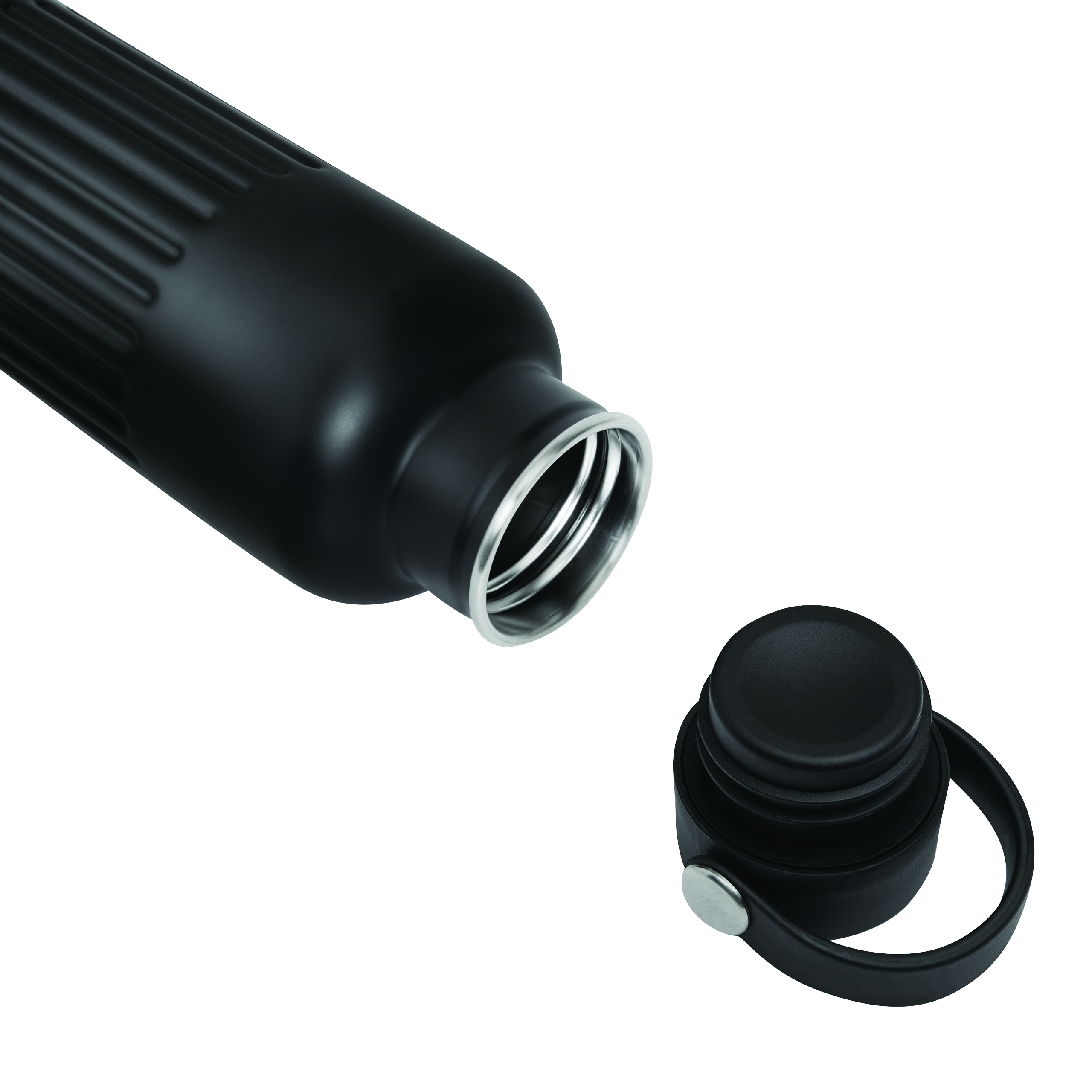 Próżniowa butelka WAVE TRAIL z podwójną izolacją. Wewnątrz wykonana ze stali nierdzewnej z recyklingu, na zewnątrz ze stali nierdzewnej. Posiada pokrywkę z bezpieczną zakrętką, silikonowym pierścieniem uszczelniającym i plastikowym paskiem do przenoszenia. O pojemności ok. 500 ml. Utrzymuje ciepło przez ok. 8 godzin i zimno nawet do 12. Zapakowana jest w pudełko.
