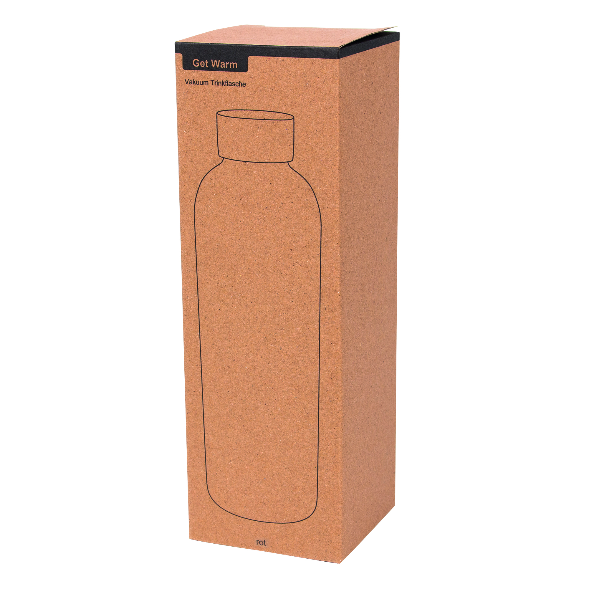 Próżniowa butelka termiczna GET WARM, z podwójną izolacją: wewnątrz i na zewnątrz wykonana jest ze stali nierdzewnej. Posiada dopasowaną kolorystycznie plastikową pokrywkę z bezpieczną zakrętką i silikonowym pierścieniem uszczelniającym. Pojemność butelki to ok. 500 ml. Utrzymuje ciepło przez ok. 8 godzin, a zimno nawet do 12.