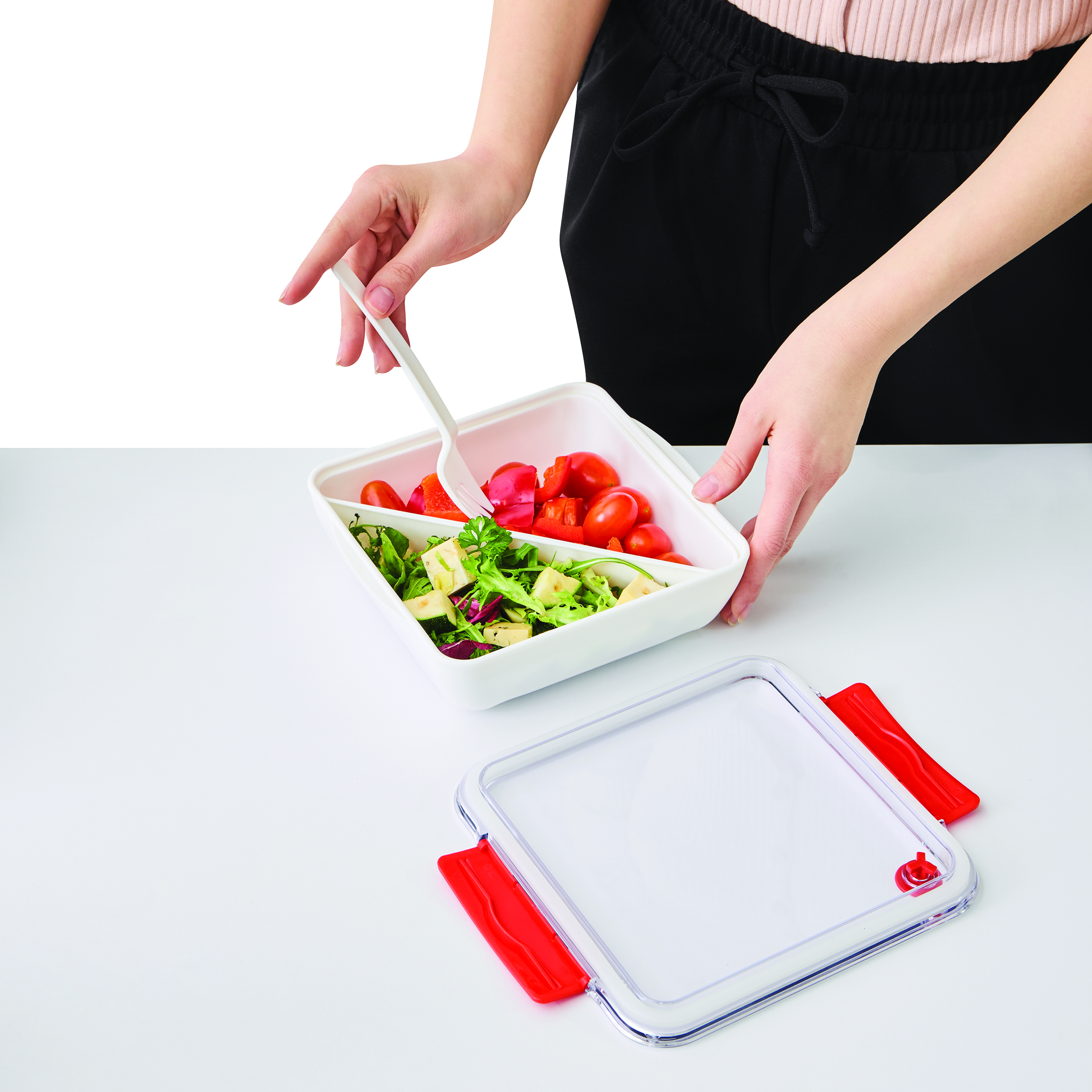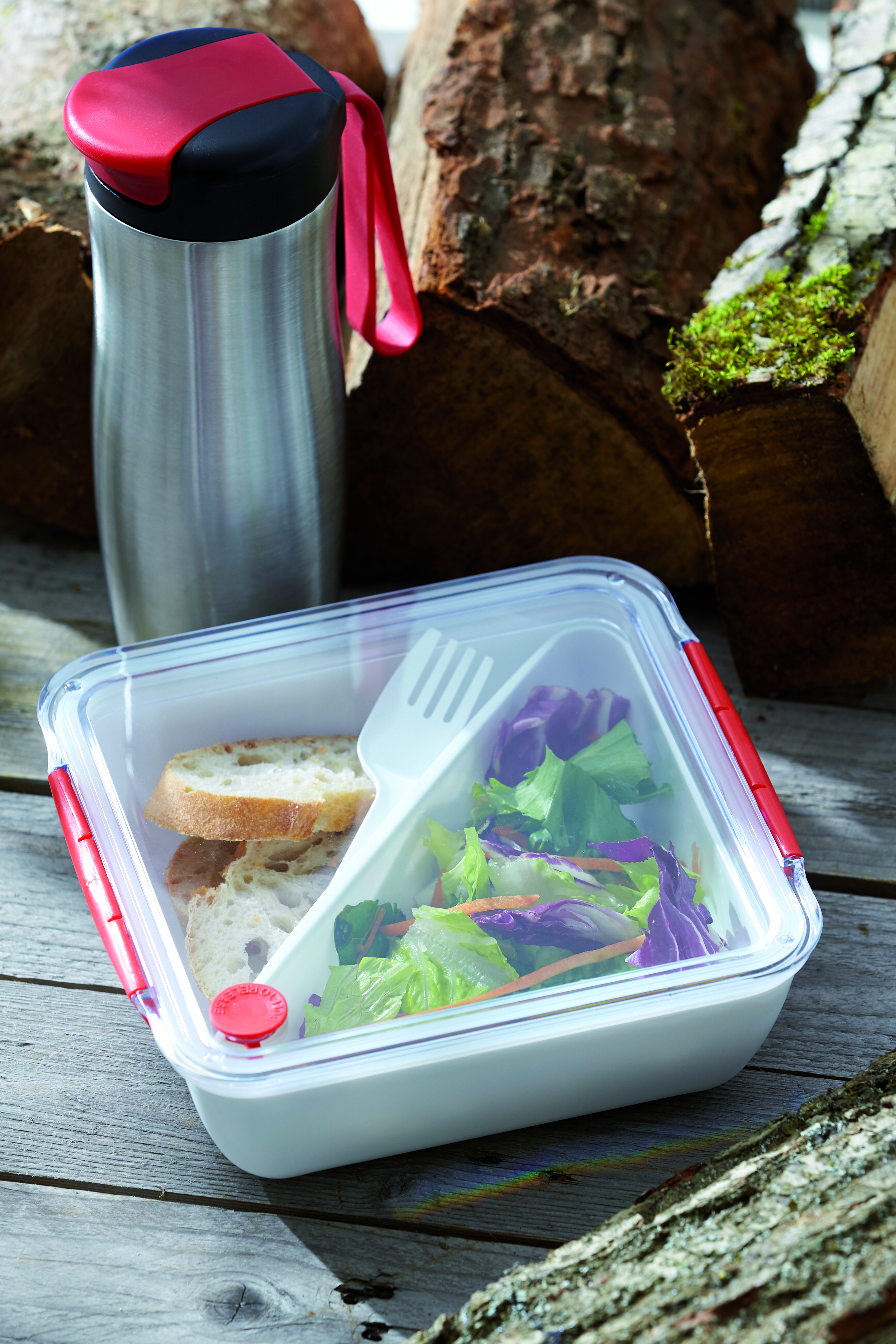 Pojemnik na lunch DELICIOUS z wydzieloną przegrodą (ok. 400 ml), plastikowym widelcem w zestawie. Całkowita pojemność ok. 1000 ml, posiada wywietrznik w pokrywie.