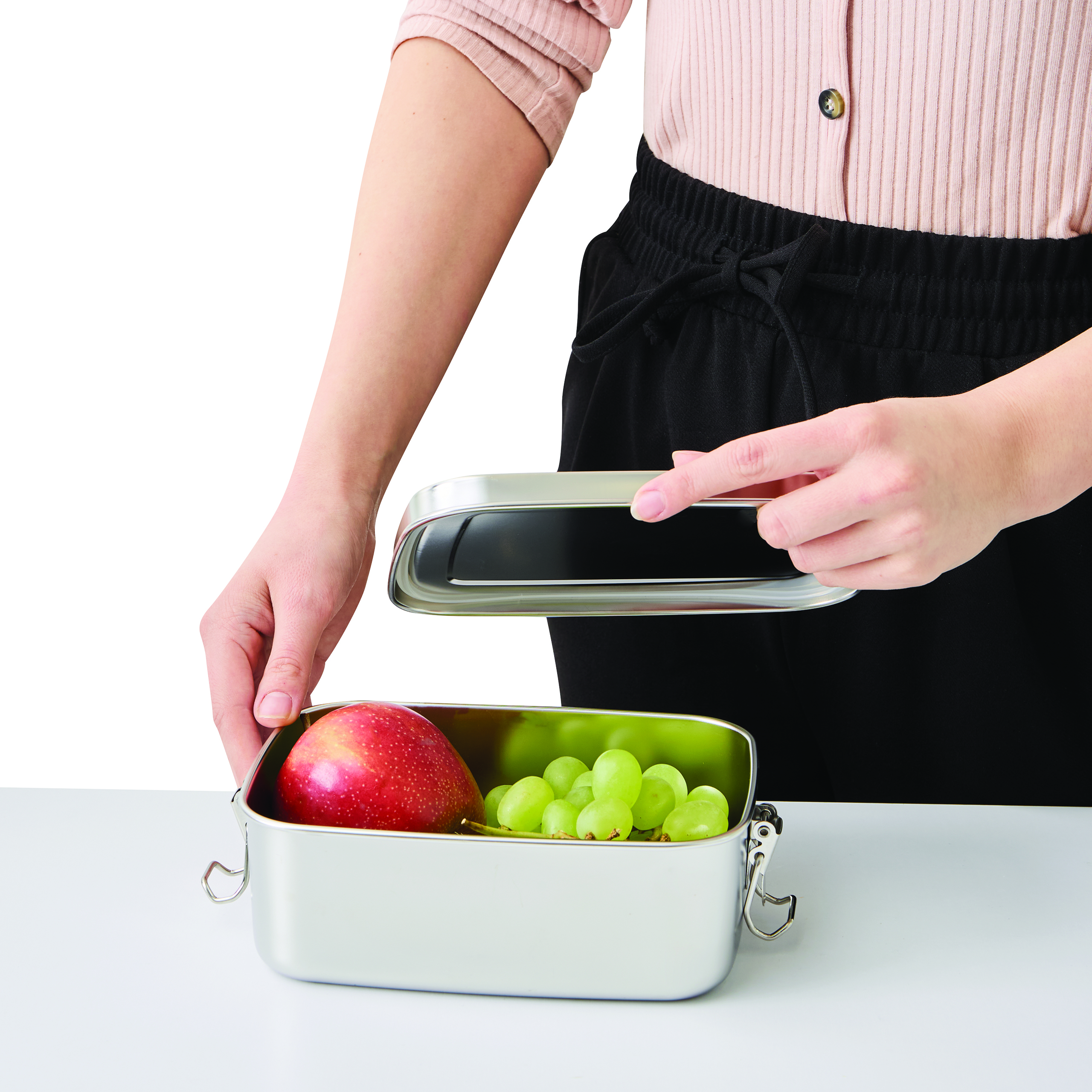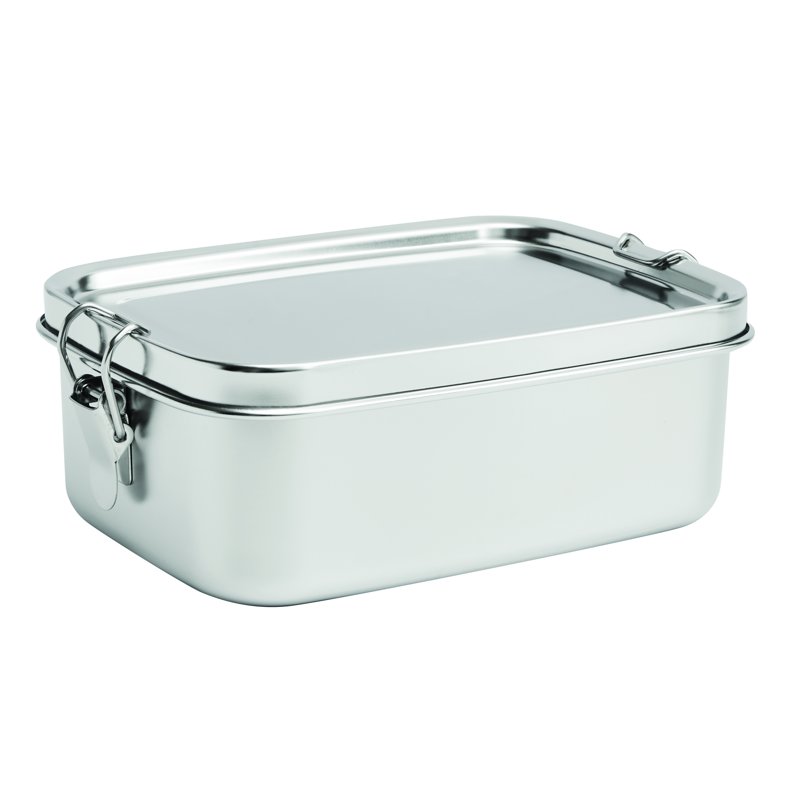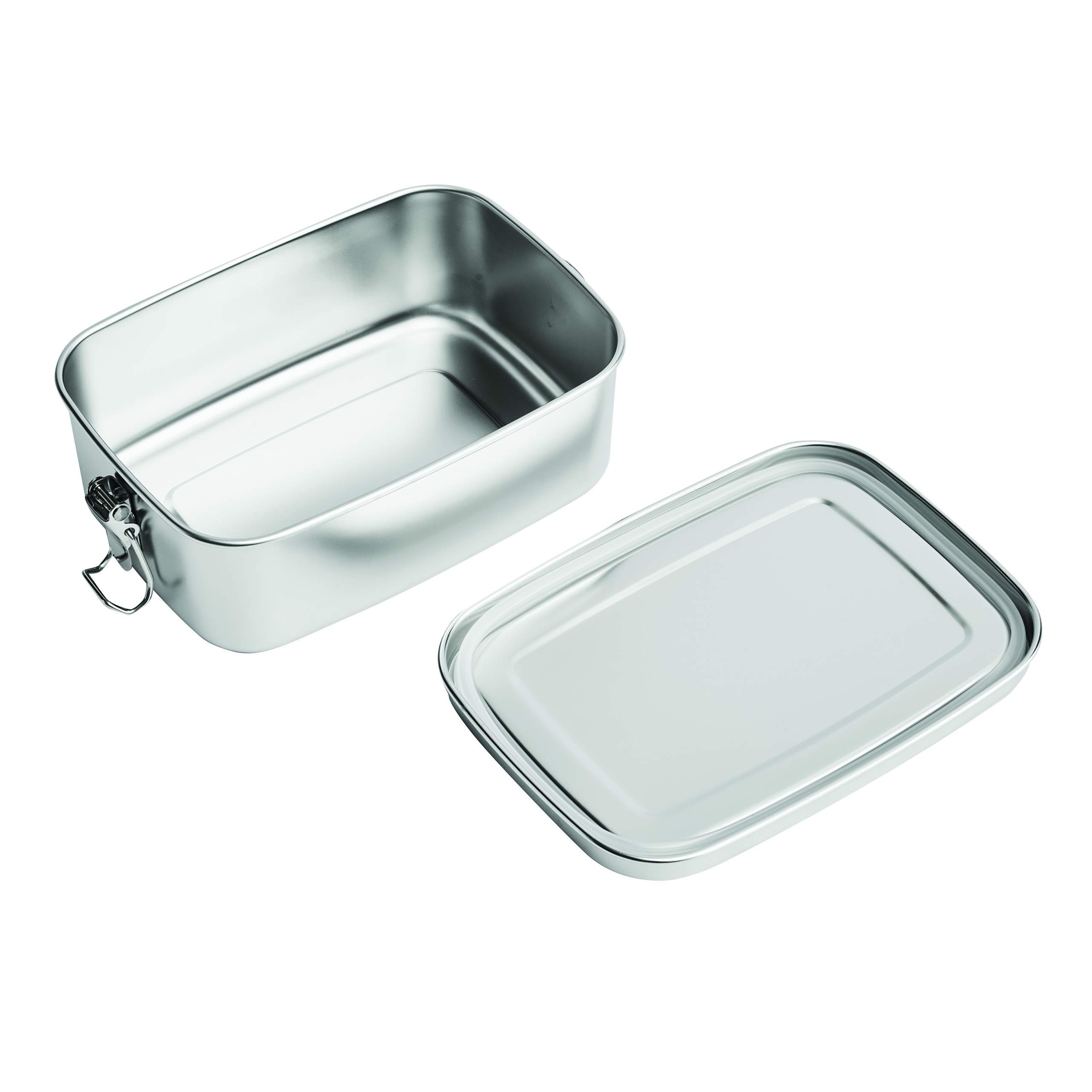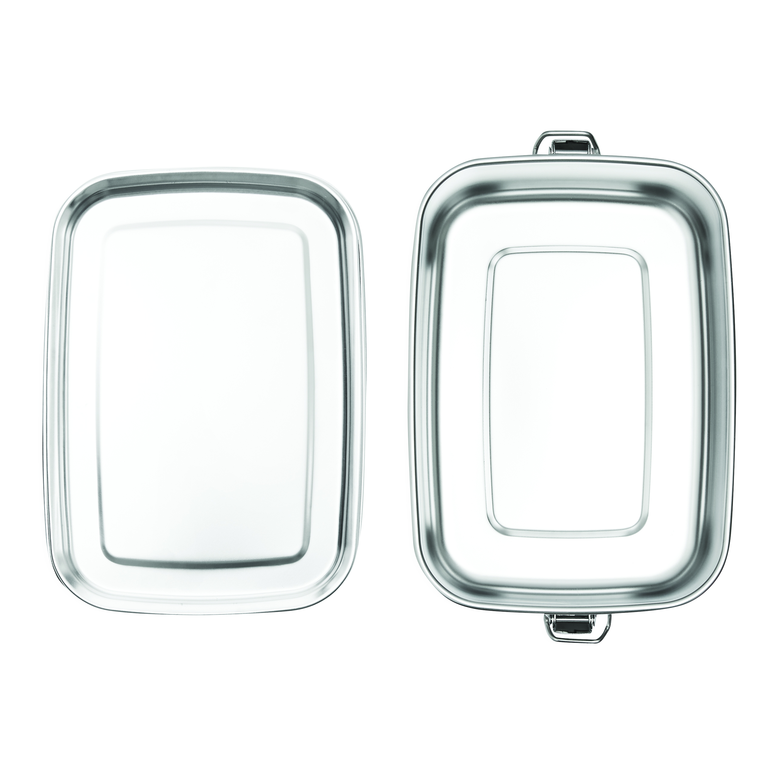 Lunch box STRONG BREAK ze stali nierdzewnej. Zamykany za pomocą dwóch klipsów, z bezpieczną uszczelką. Pojemność ok. 1100 ml.