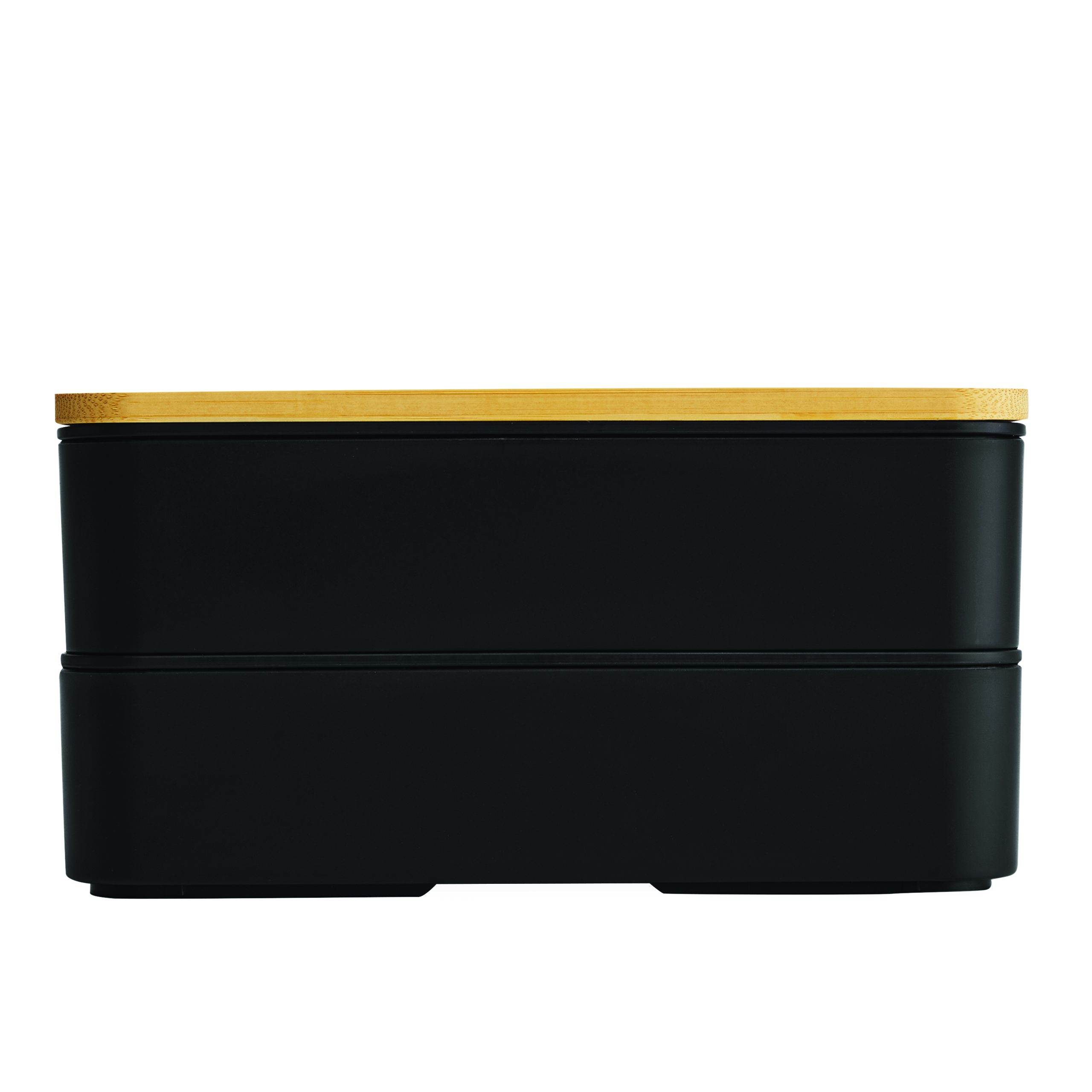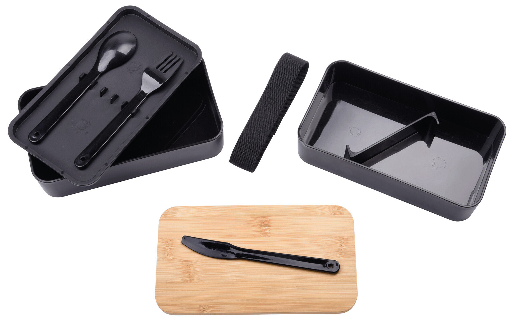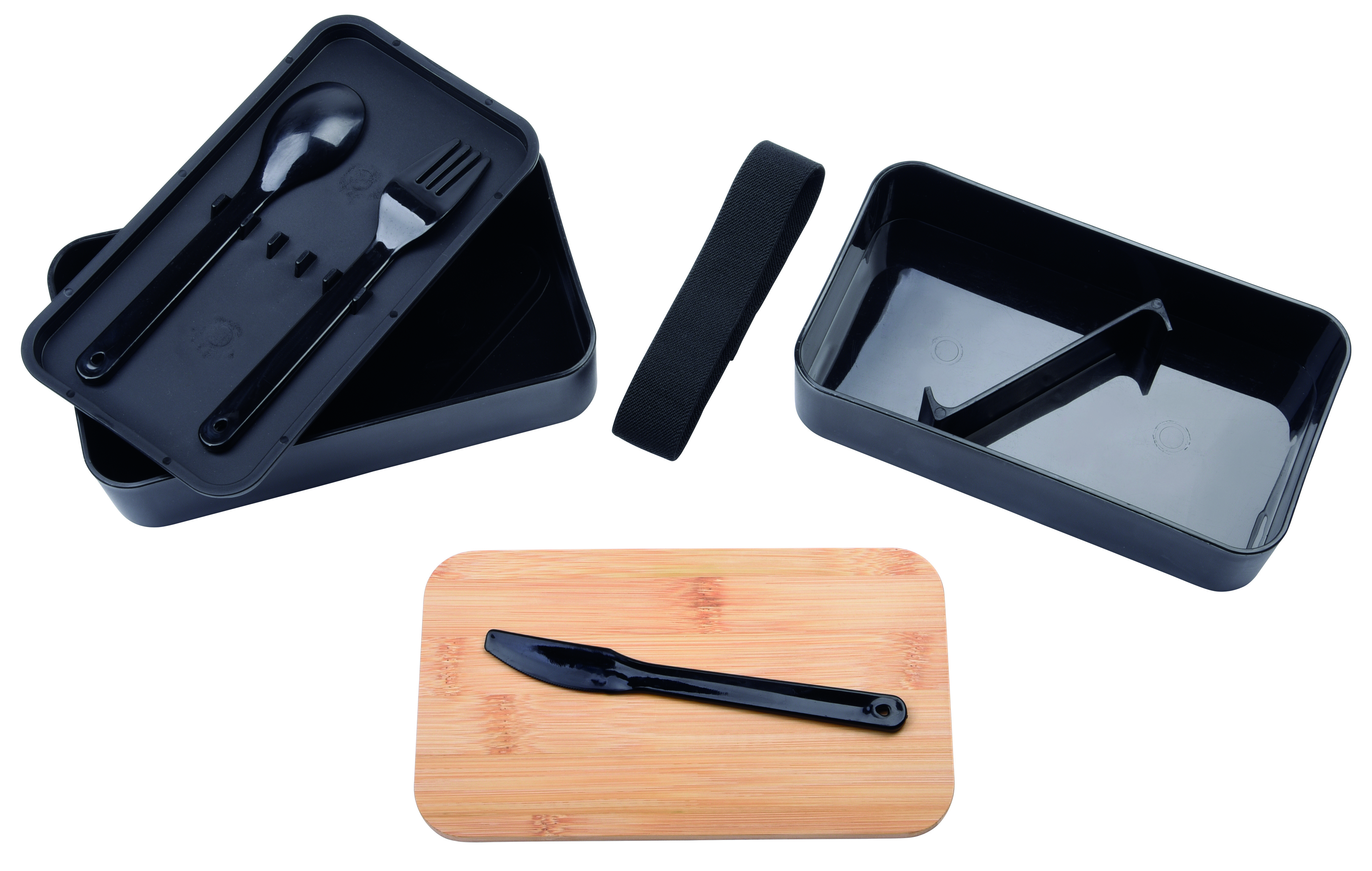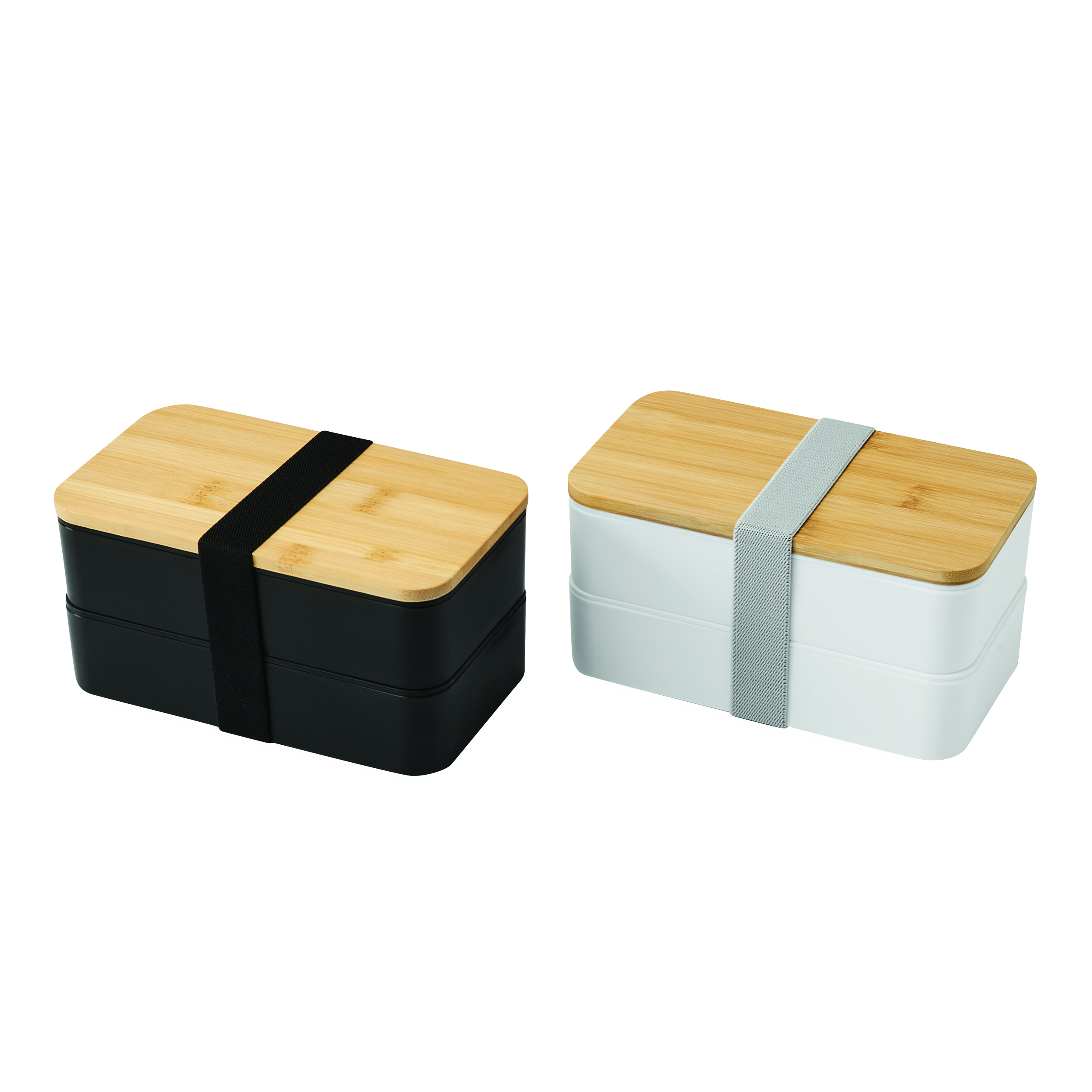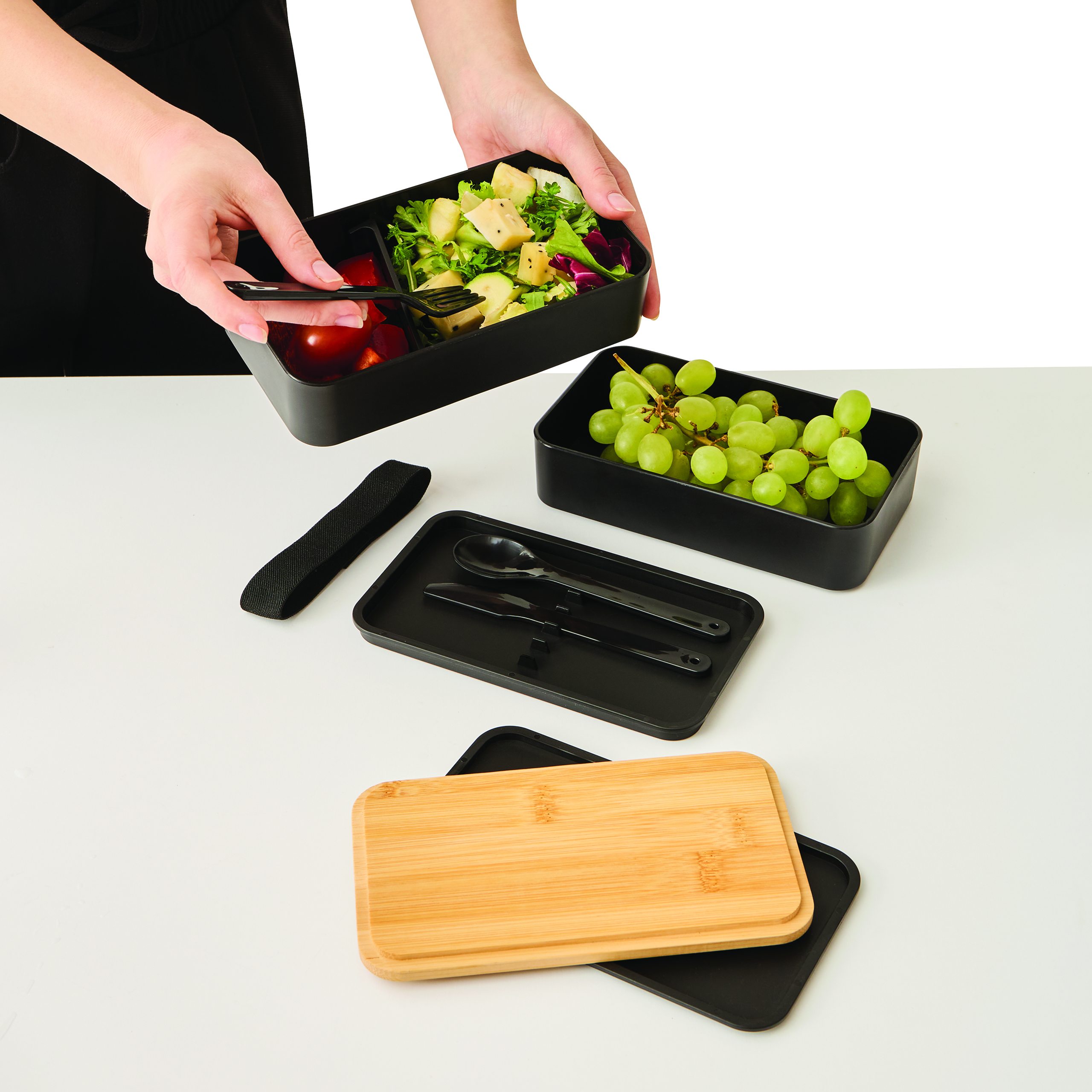 Lunch box DOUBLE LEVEL z 2 pojemnikami o pojemność ok. 400 ml każdy, z tacką ze sztućcami (nóż, widelec, łyżka) i ruchomą przegródką do oddzielania zawartości. Bambusowa pokrywka może służyć jako deska do krojenia. Gumowa taśma spinająca całość.