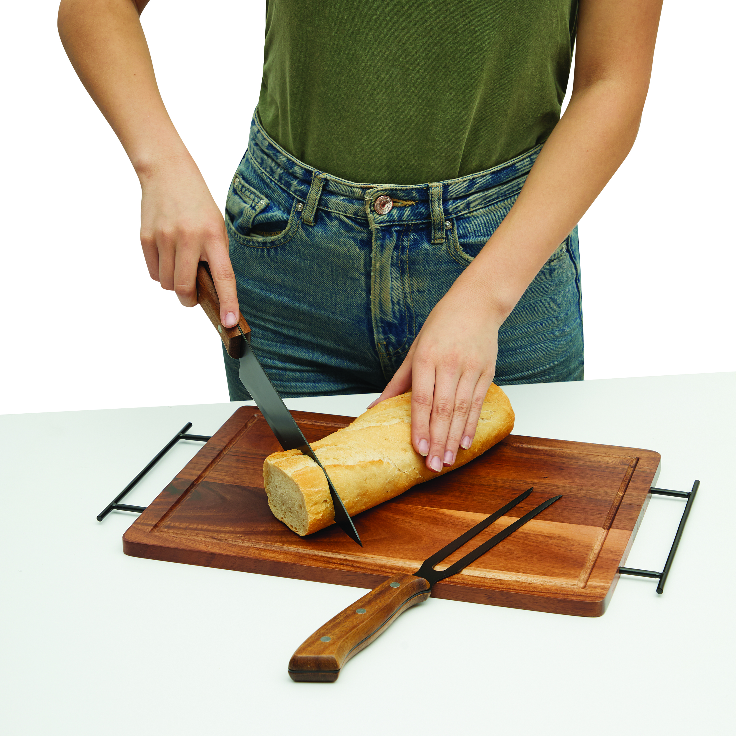 Deska do krojenia ACACIA CUT. Posiada praktyczne wyżłobienie wzdłuż krawędzi i metalowe uchwyty. Zawiera również nóż i widelec wykonane ze stali nierdzewnej z uchwytami z drewna akacjowego.