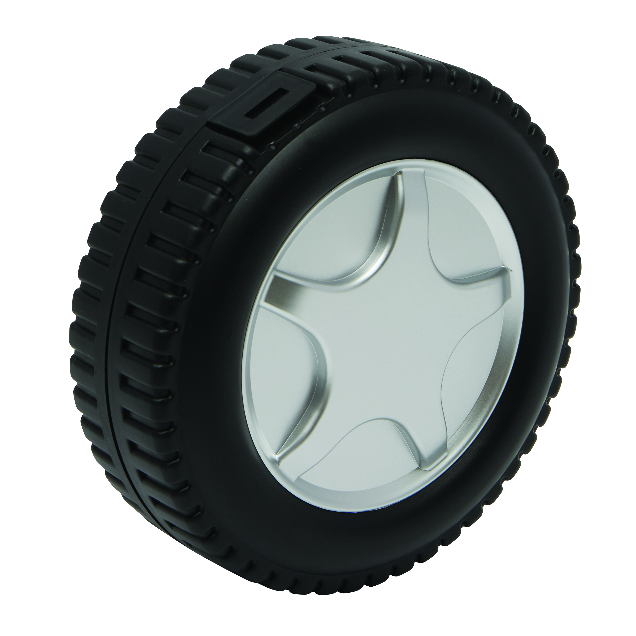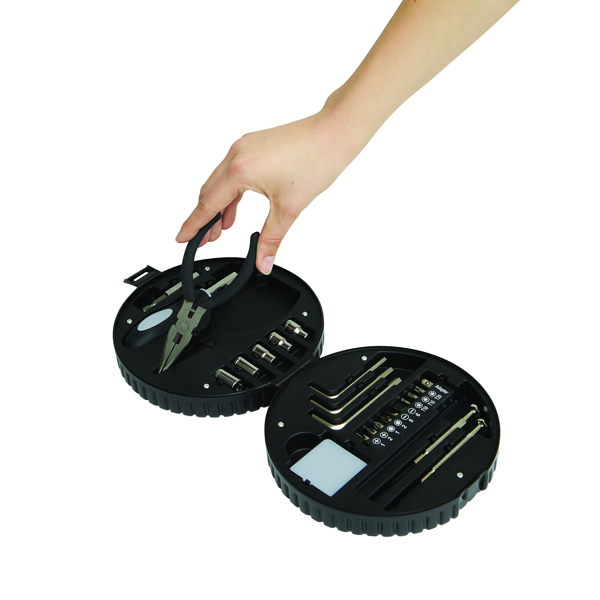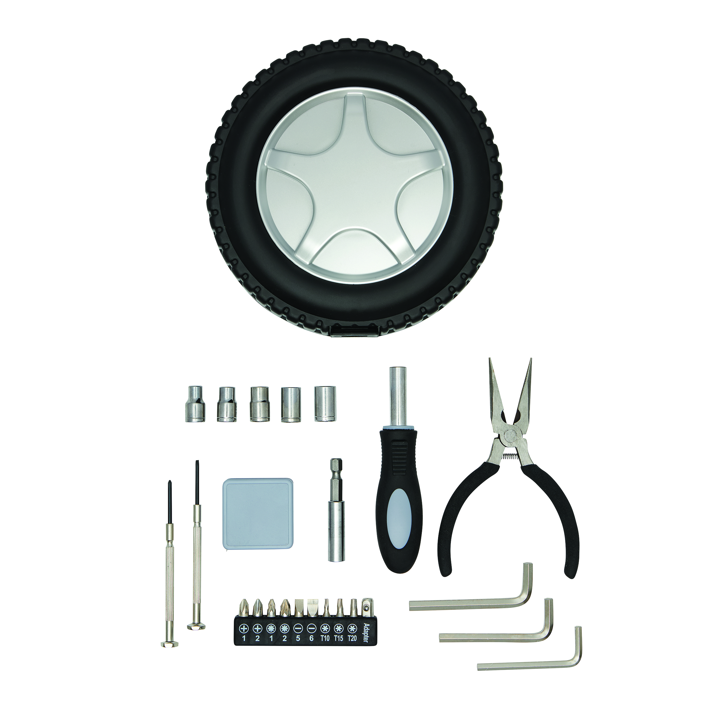 Zestaw narzędzi w kształcie opony samochodowej. Składa się z praktycznego pudełka zawierającego 24 różne elementy – śrubokręt, szczypce, 10-częściowy zestaw bitów, 5 nasadek, 3 klucze sześciokątne, 2 wkrętaki precyzyjne oraz taśmę mierniczą.