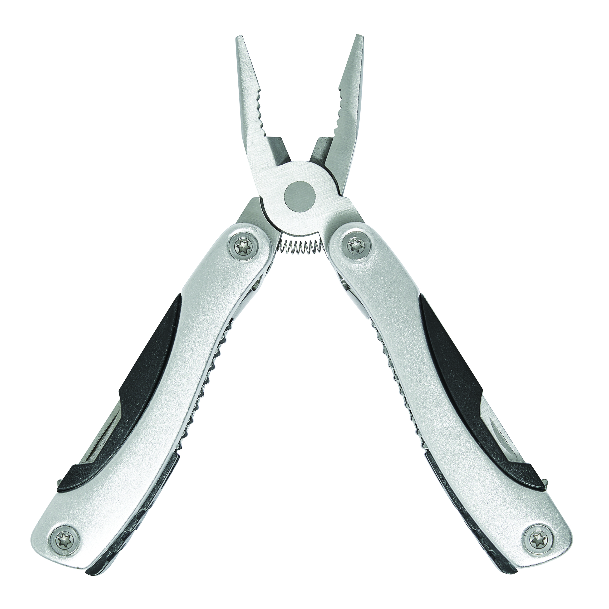 Narzędzie wielofunkcyjne BIG PLIERS. Składane kombinerki, uchwyty pokryte aluminium, narzędzia ze stali nierdzewnej, piła, pilnik, skrobak do ryb z miarką w calach, otwieracze do puszek i butelek, śrubokręt krzyżak i płaski w dwóch rozmiarach oraz ostrze noża, w nylonowym etui zamykanym na rzep, ze szlufką do zamocowania na pasku.