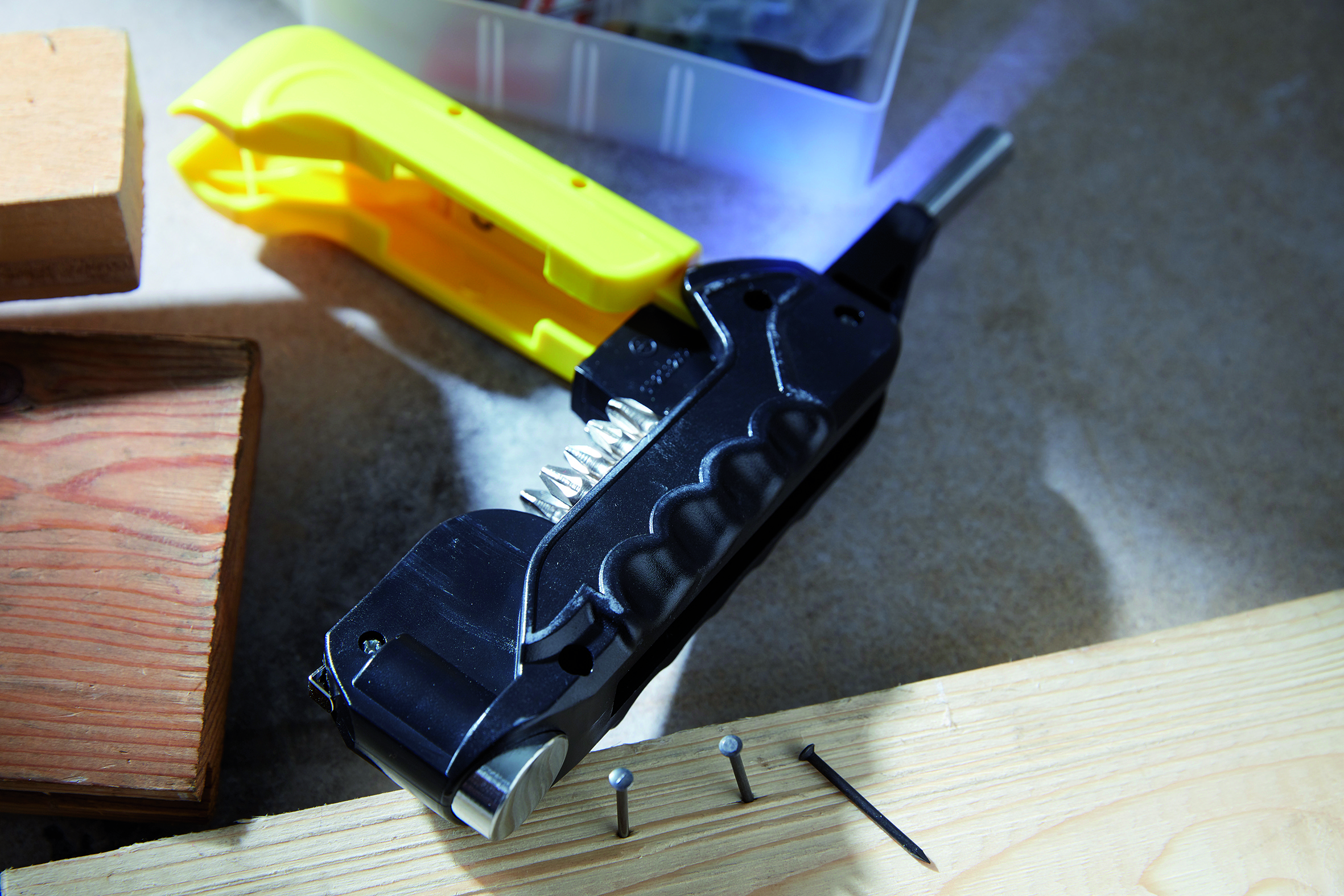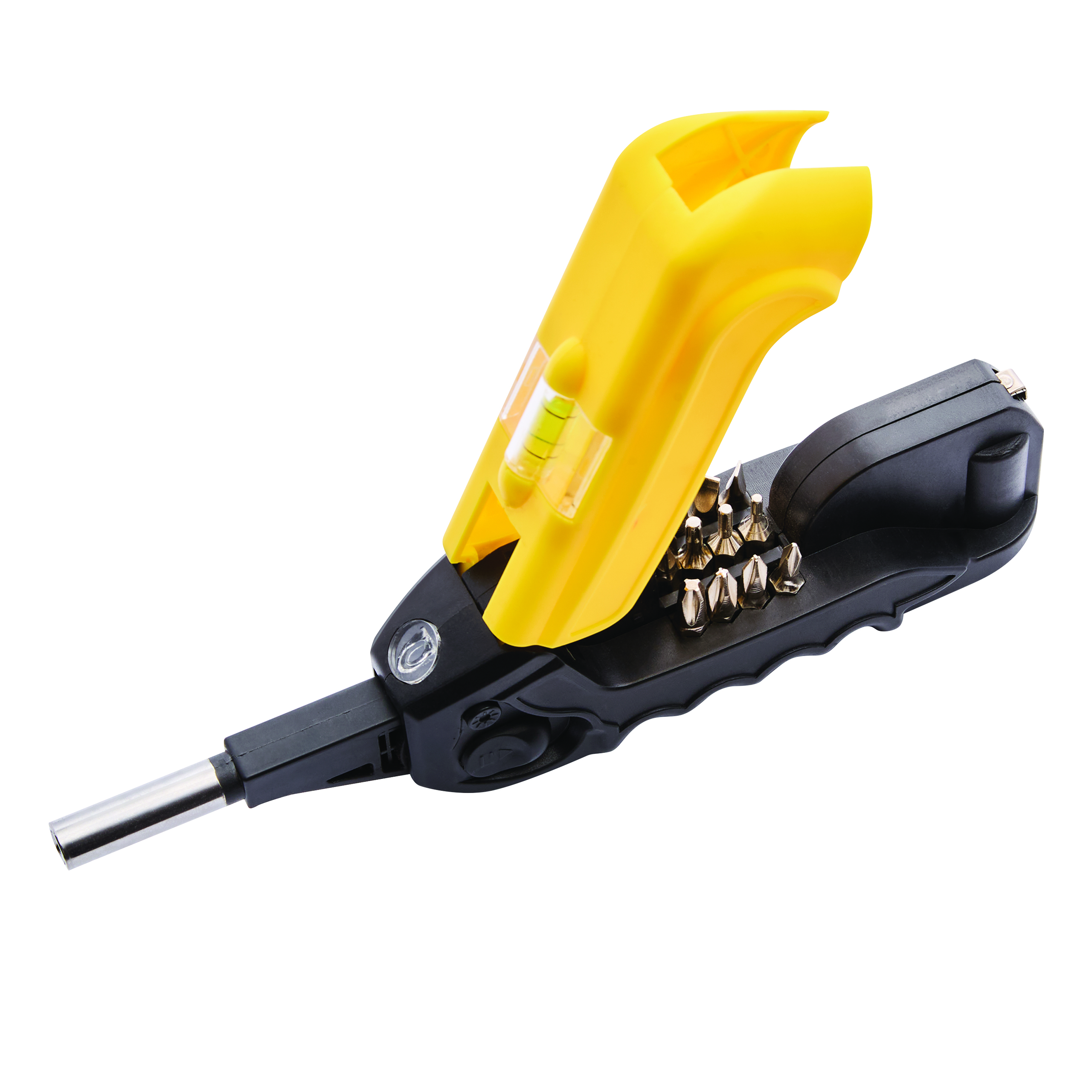 Narzędzie wielofunkcyjne HINGED. 17 możliwych zastosowań, wbudowana poziomica, rozkładany śrubokręt z 12 różnymi końcówkami, światło LED, taśma miernicza 1 m, młotek. W pudełku.