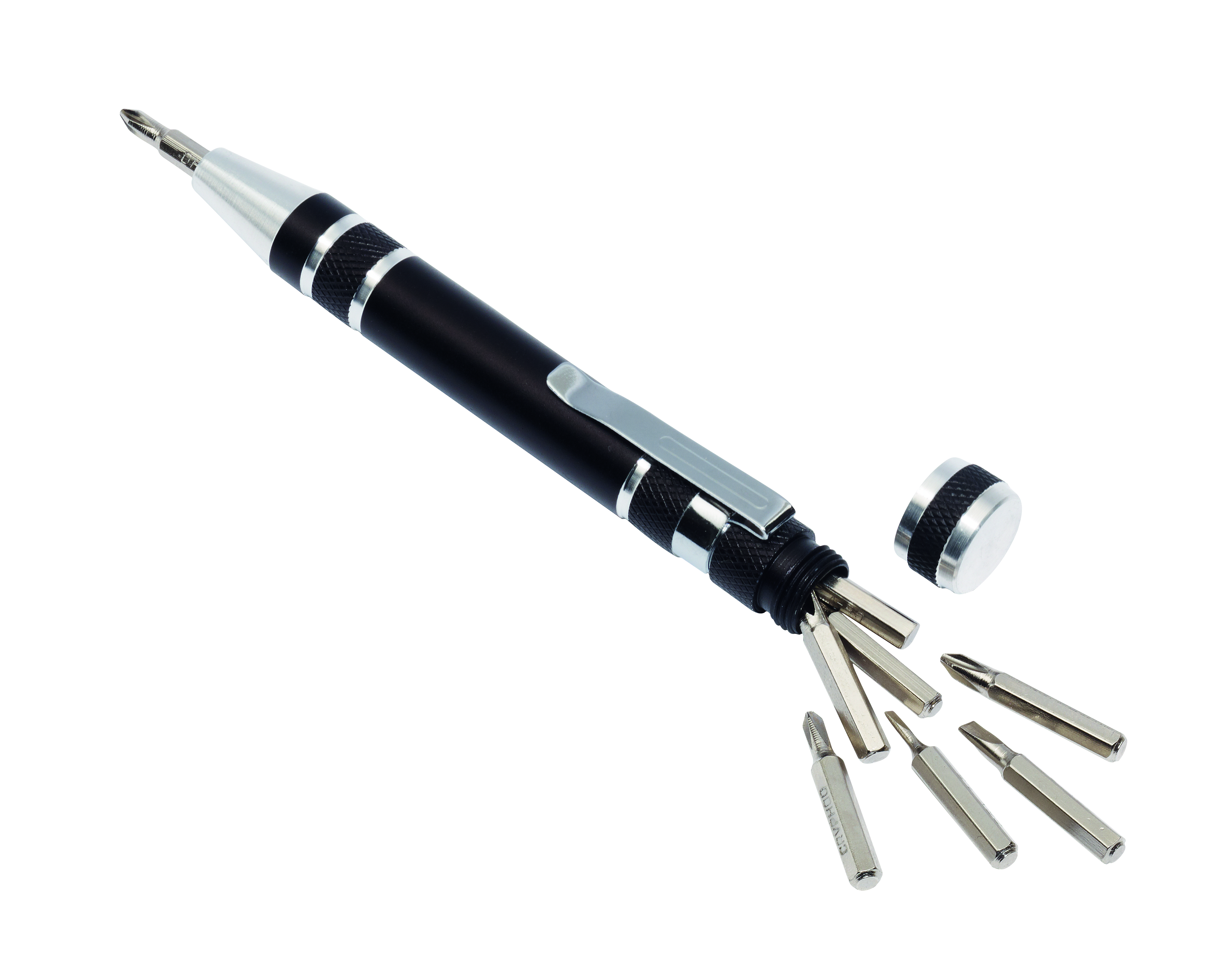 Uchwyt na bity MICRO z 8 różnymi rodzajami bitów. Bity umieszczone wewnątrz. Z odkręcanym wieczkiem, magnetyczną końcówką trzymającą bity, pakowane w pudełko.