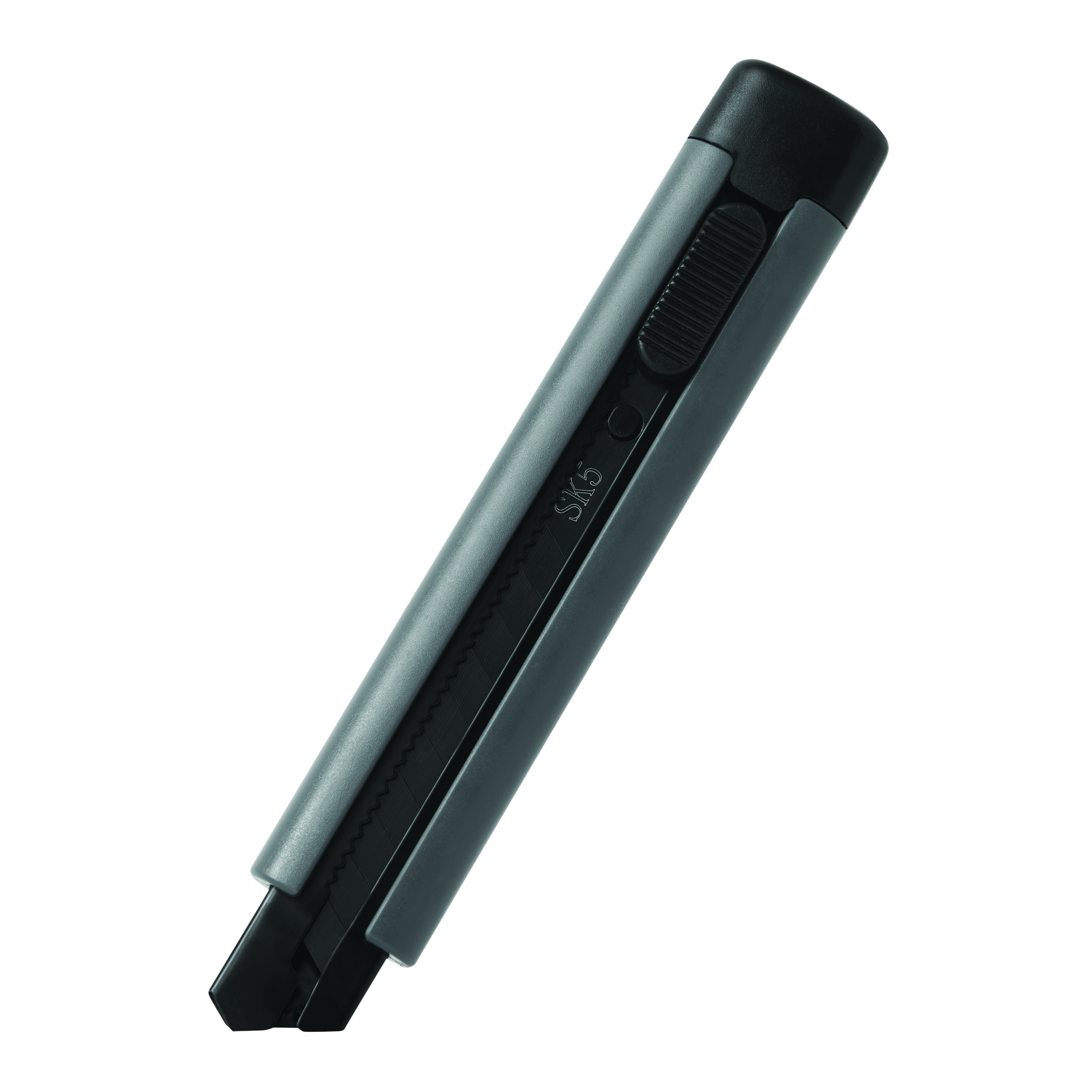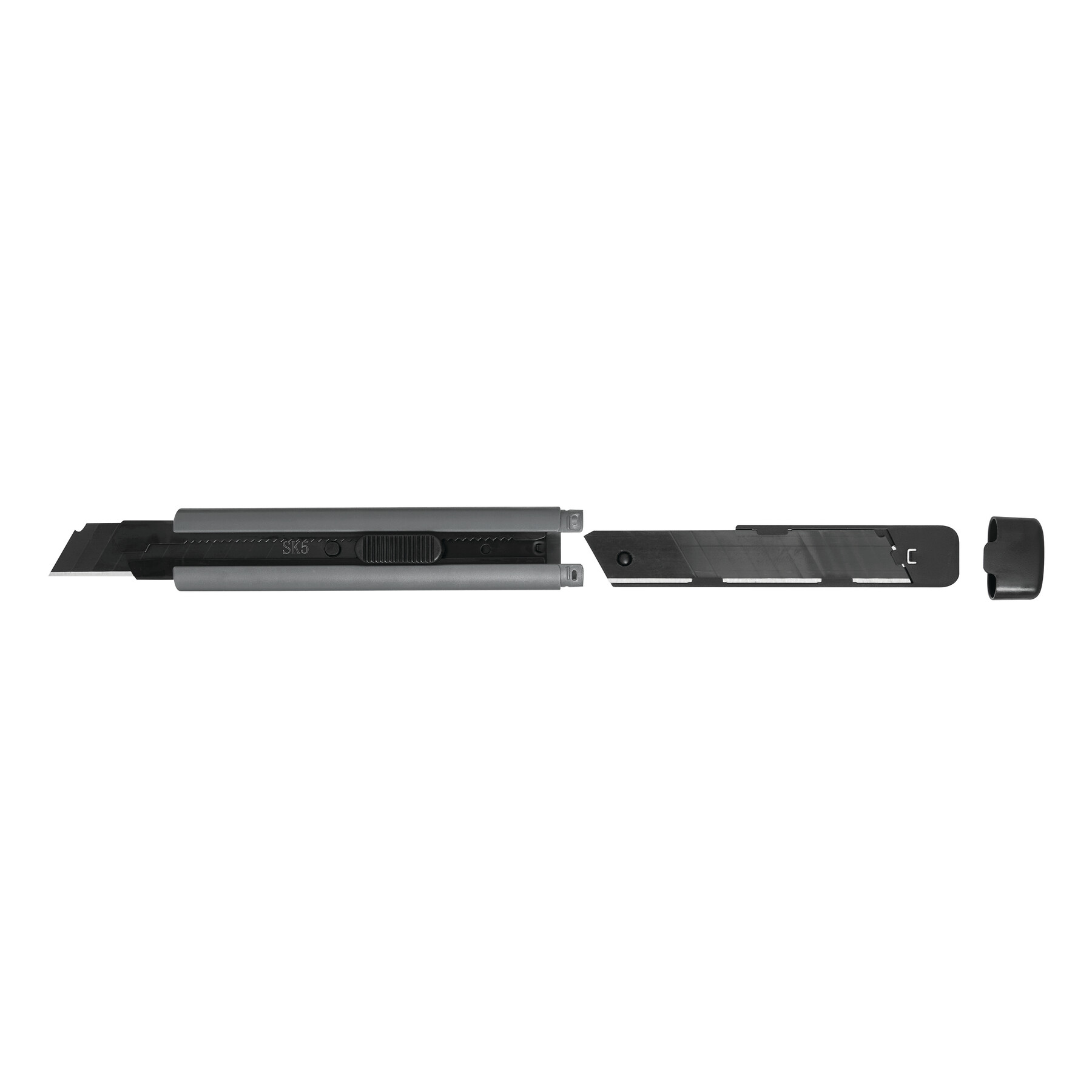 Nóż do cięcia RELIABLE. Posiada elastyczne, czarne, 18 mm odłamywane ostrze (10 segmentów ostrza i 2 ostrza zapasowe), automatyczny suwak, plastikową obudowę i stalową prowadnicę ostrza. Idealny do lżejszych i mocniejszych cięć. Zapakowany jest w pudełko.