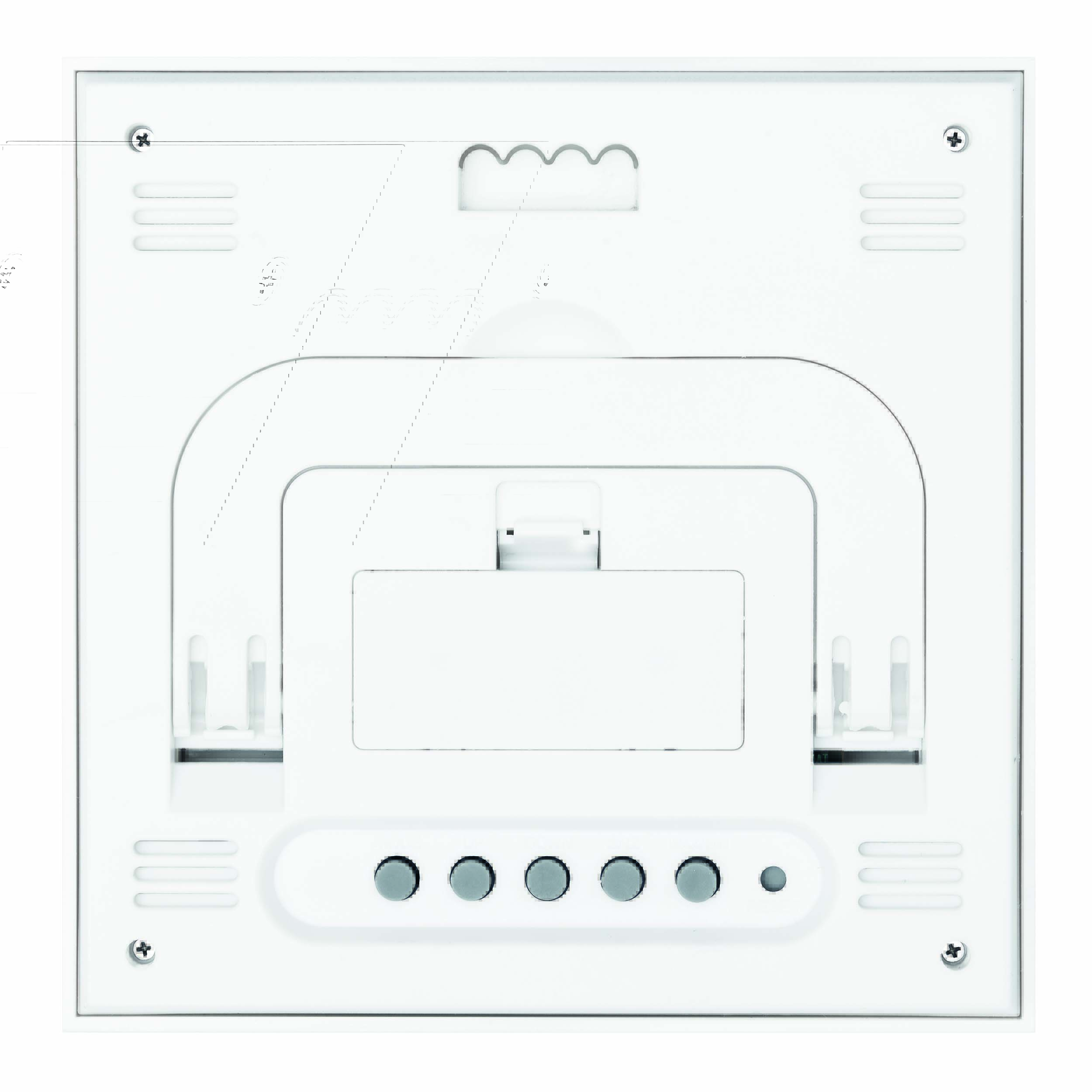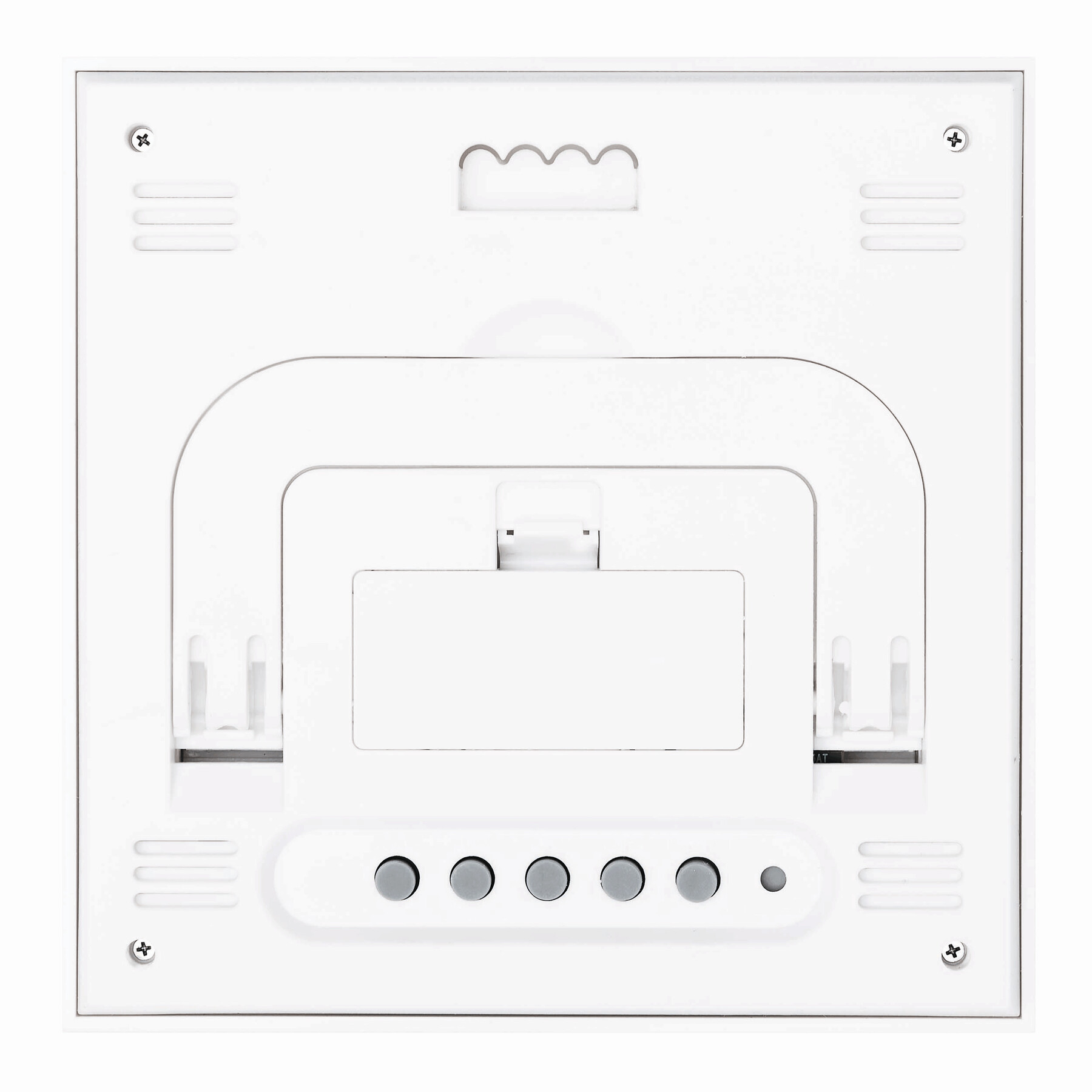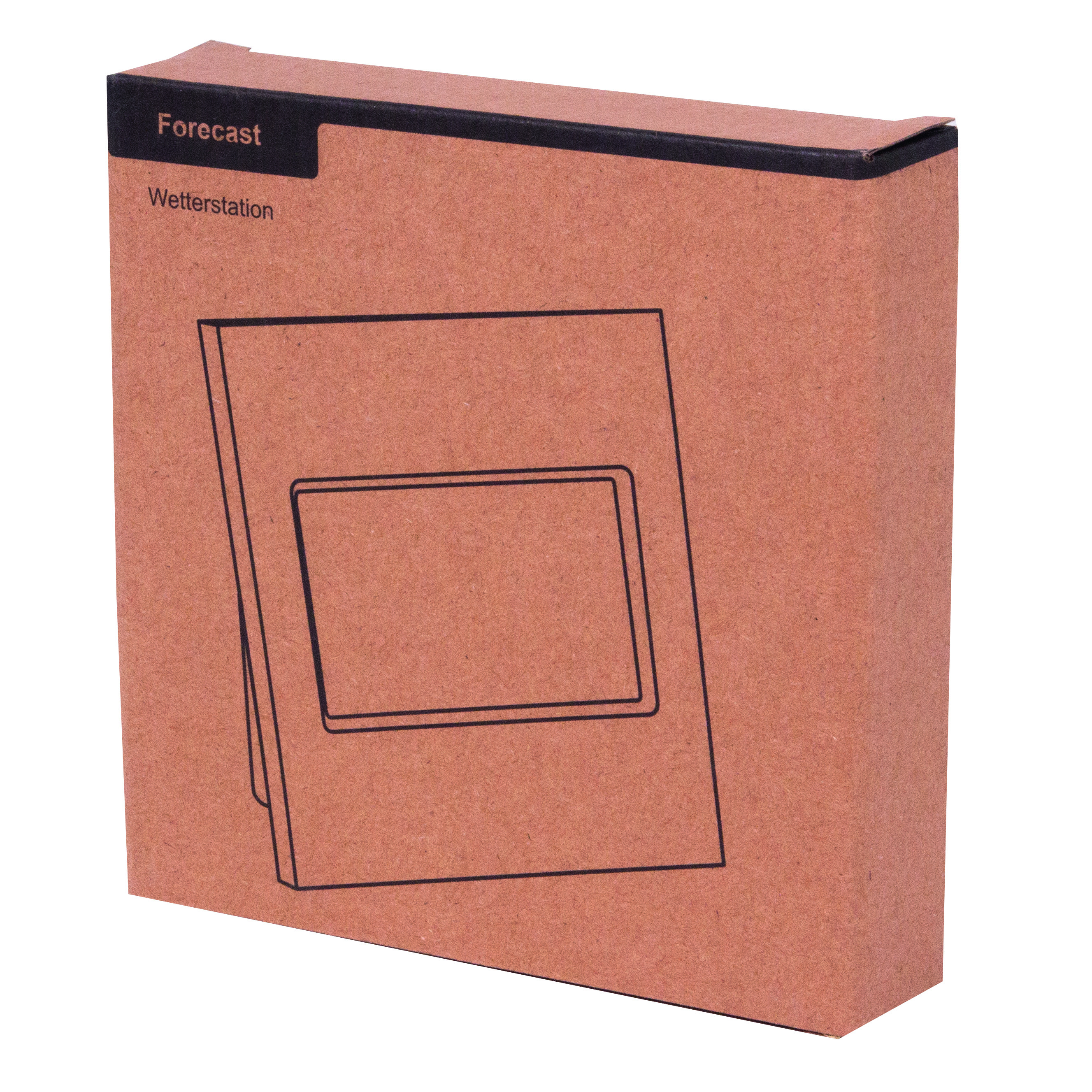 Stacja pogodowa FORECAST: z bambusowym frontem, funkcją alarmu, wyświetlaczem daty i godziny, higrometrem i termometrem (w °C i °F), rozkładaną podstawką i otworem do montażu na ścianie z tyłu.