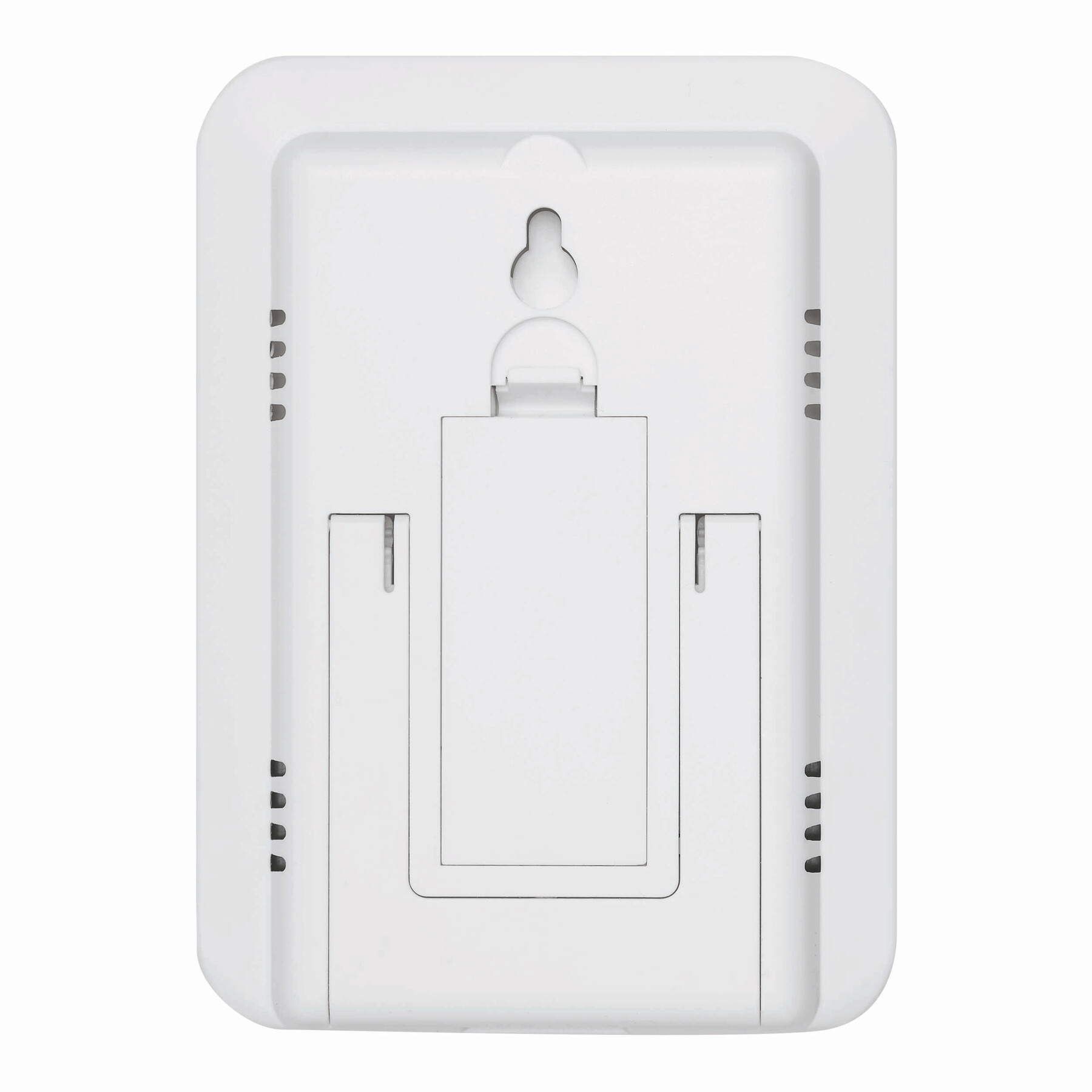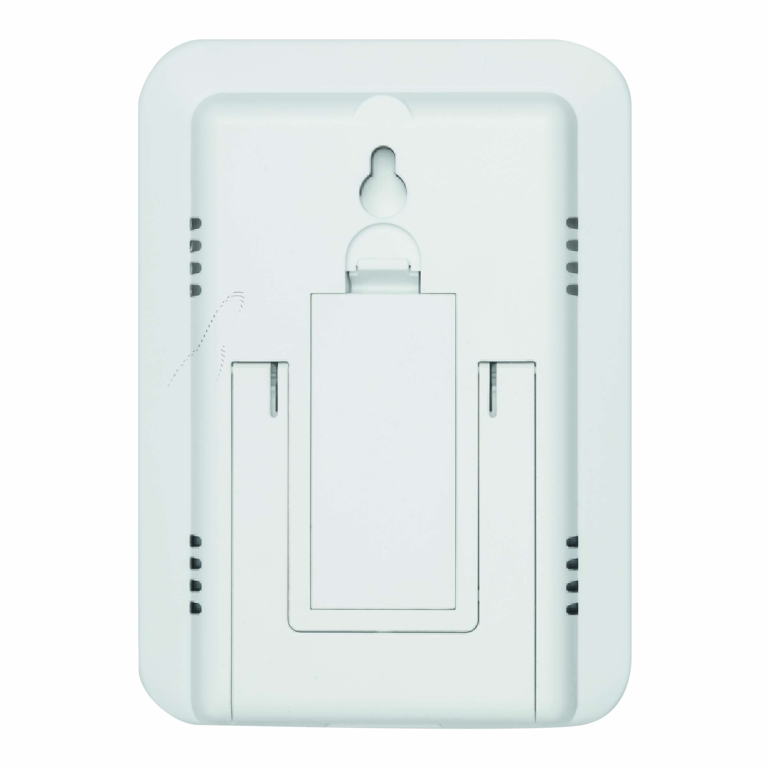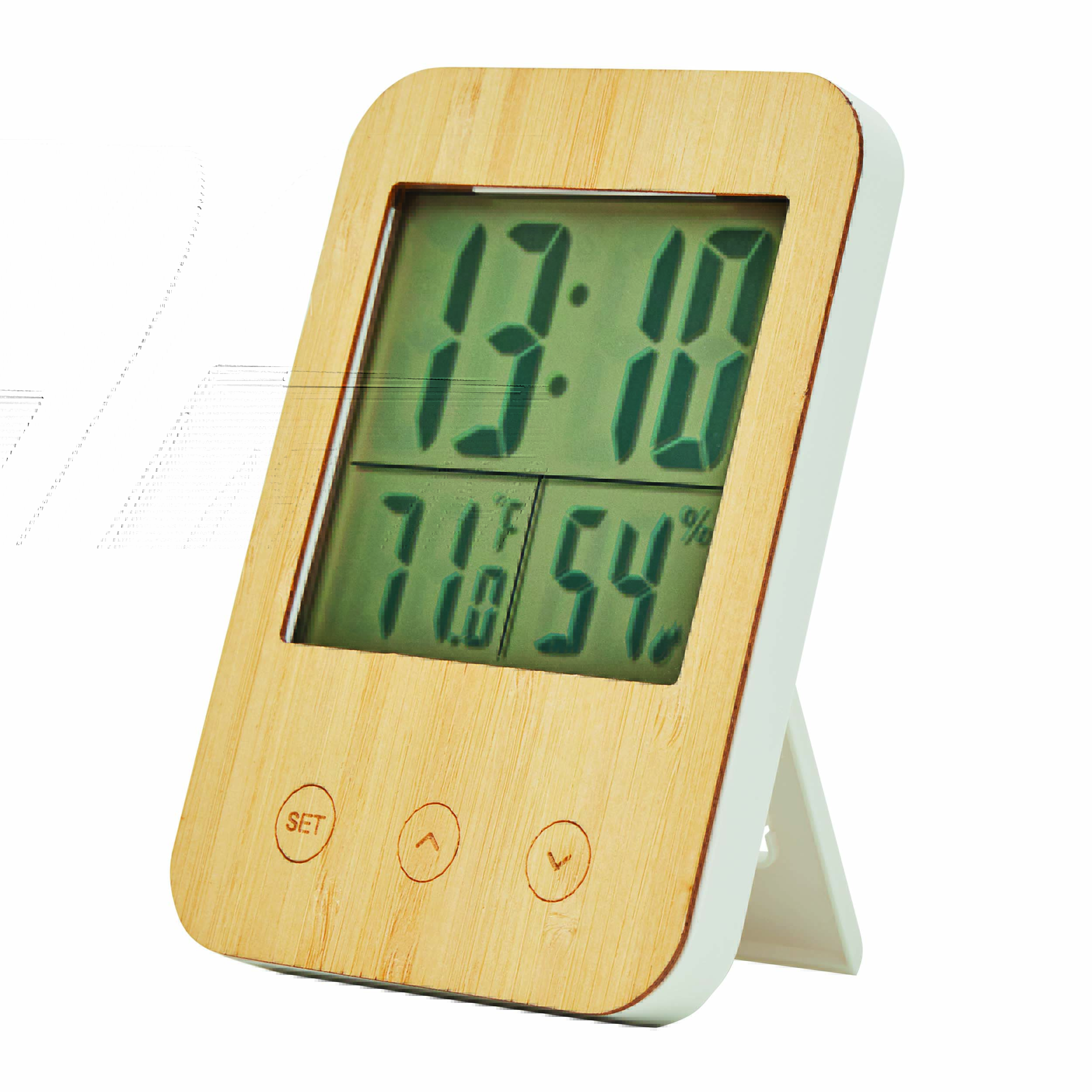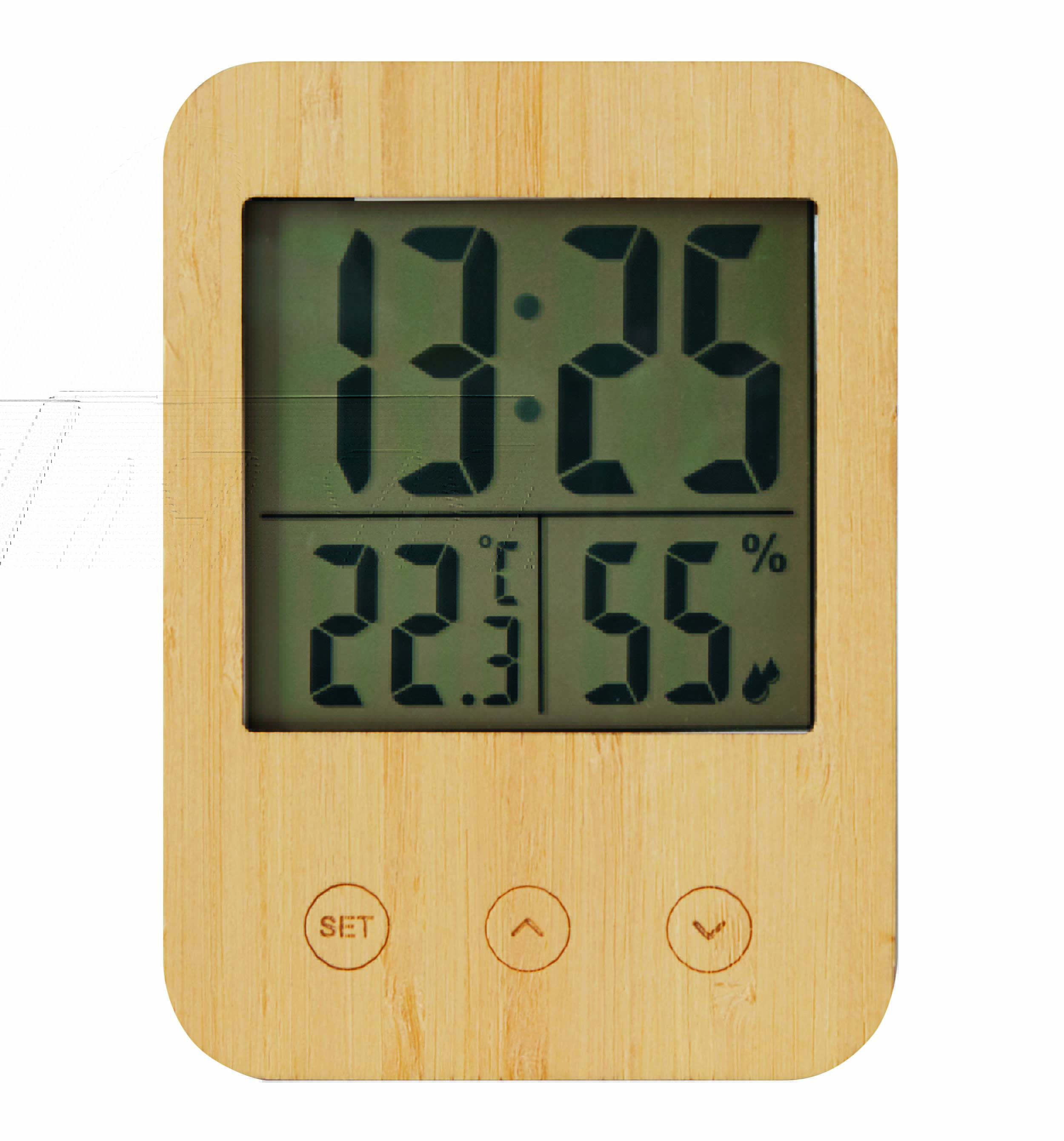 Stacja pogodowa MIX: z bambusowym frontem, funkcją alarmu, wyświetlaczem daty i godziny, higrometrem i termometrem (w °C i °F), rozkładaną podstawką i otworem do montażu na ścianie z tyłu.