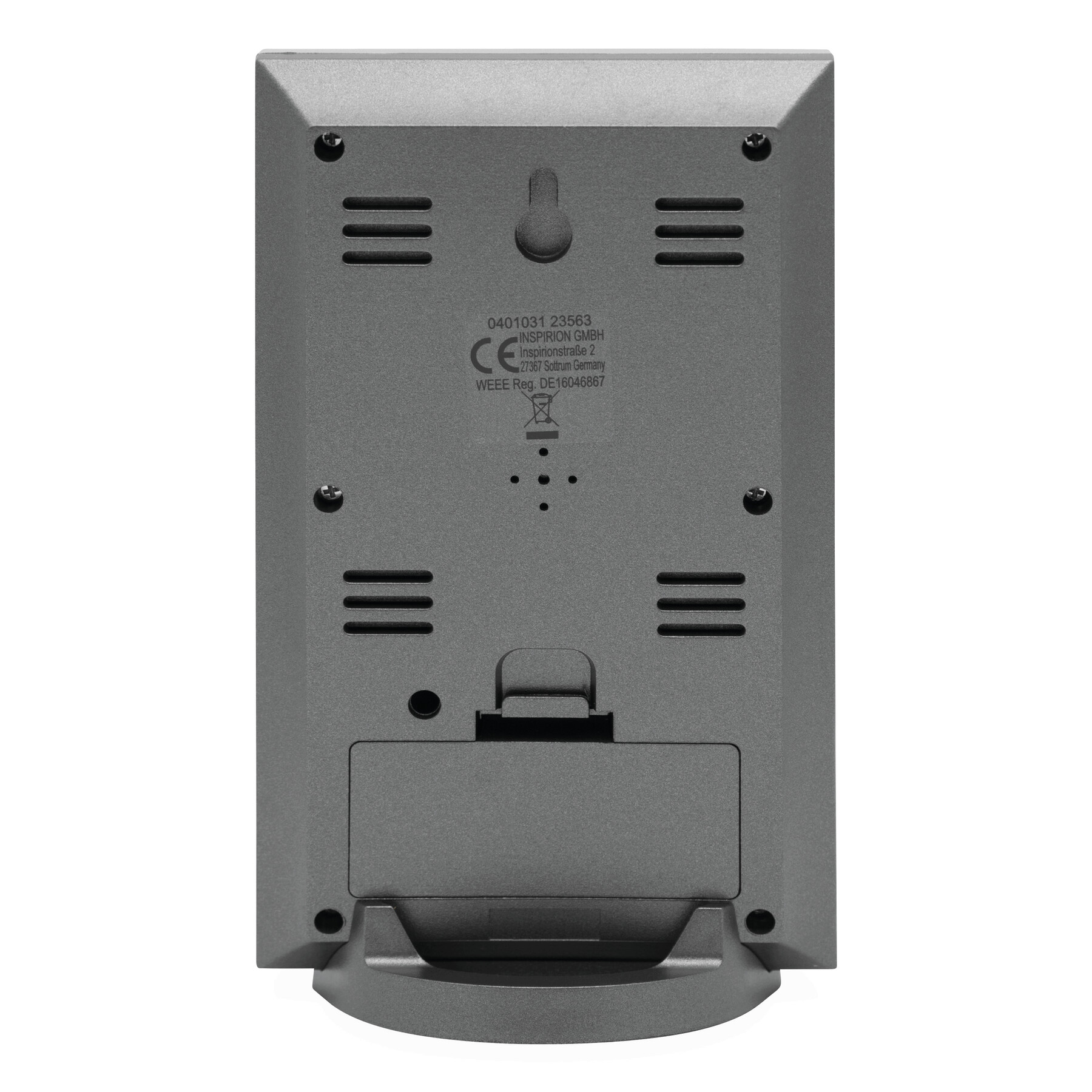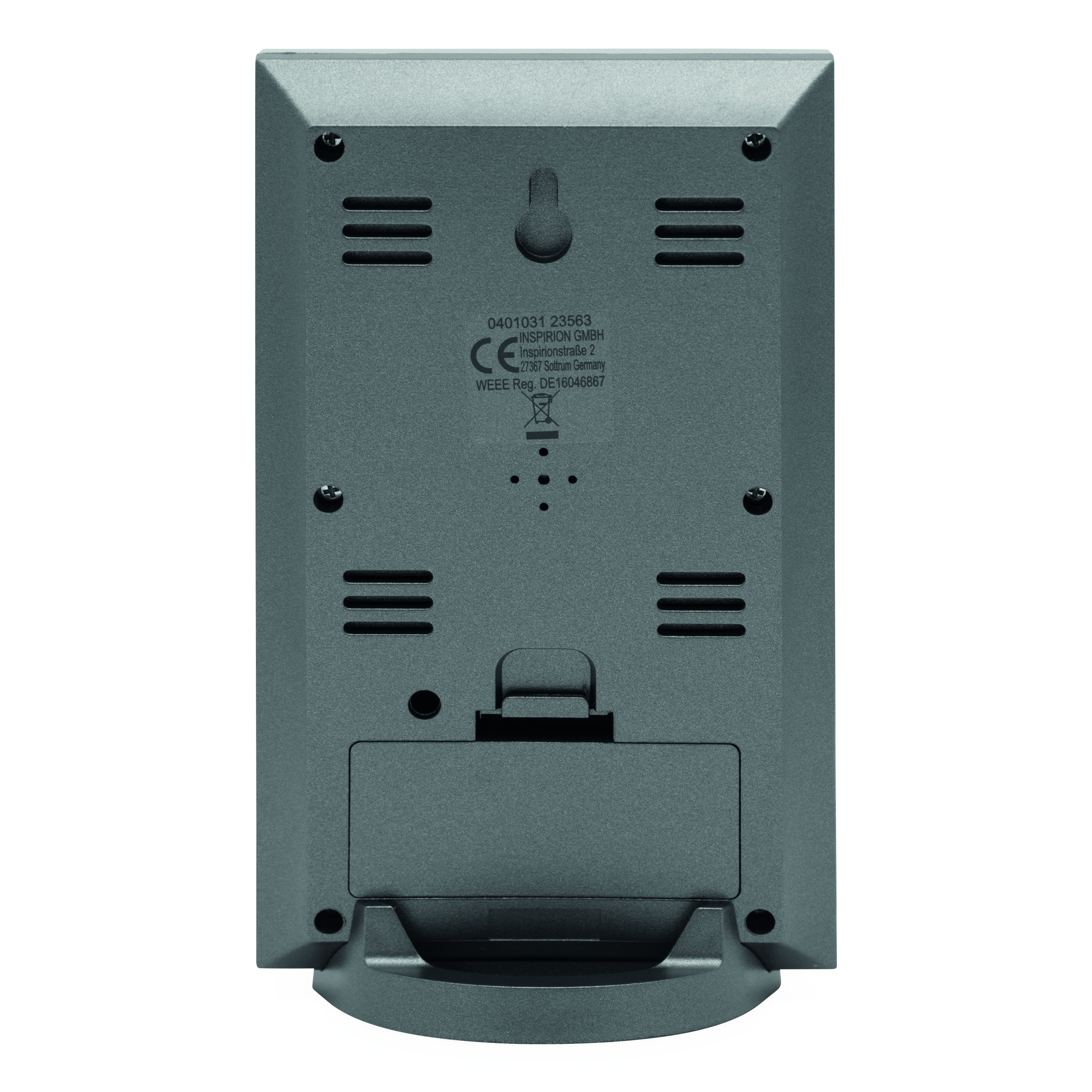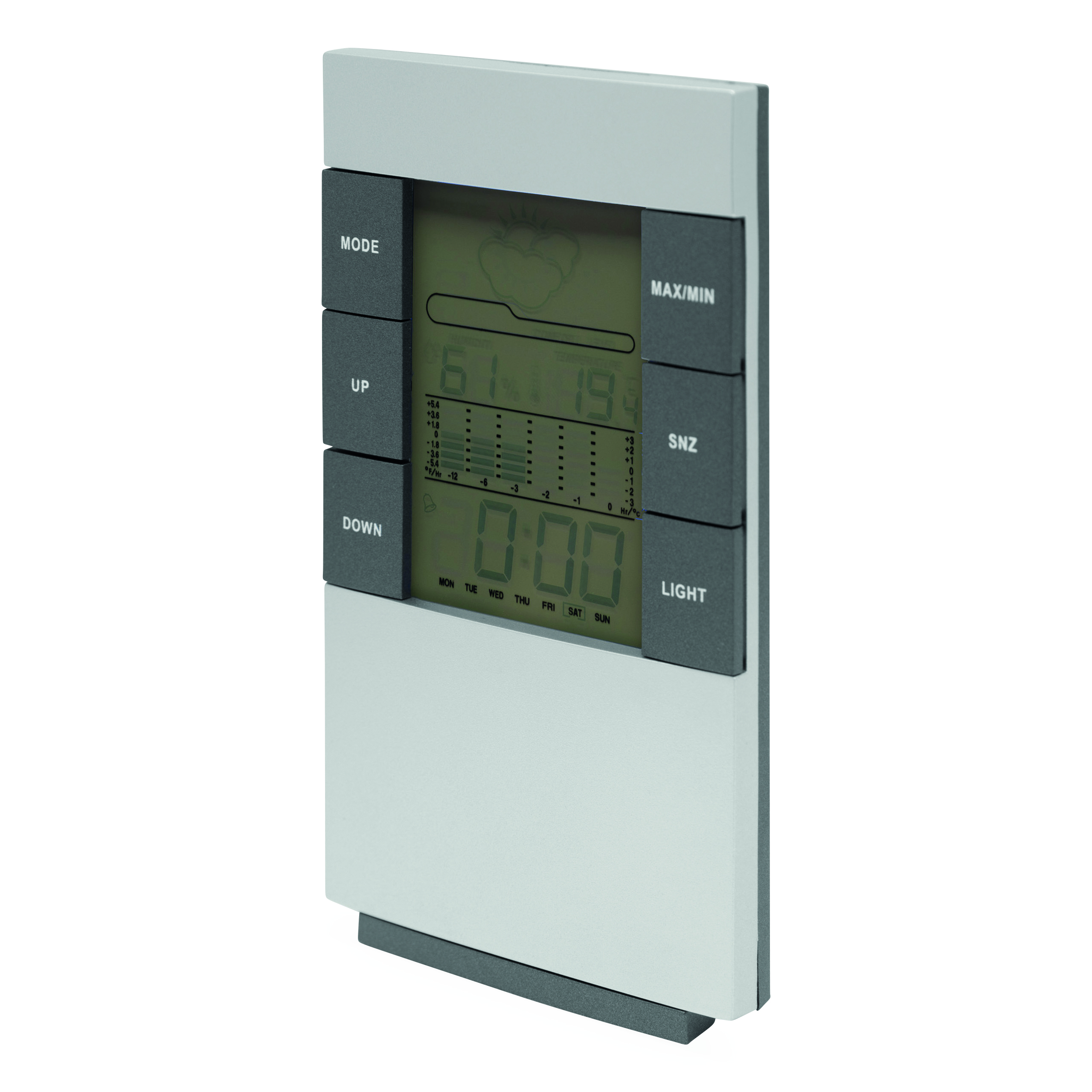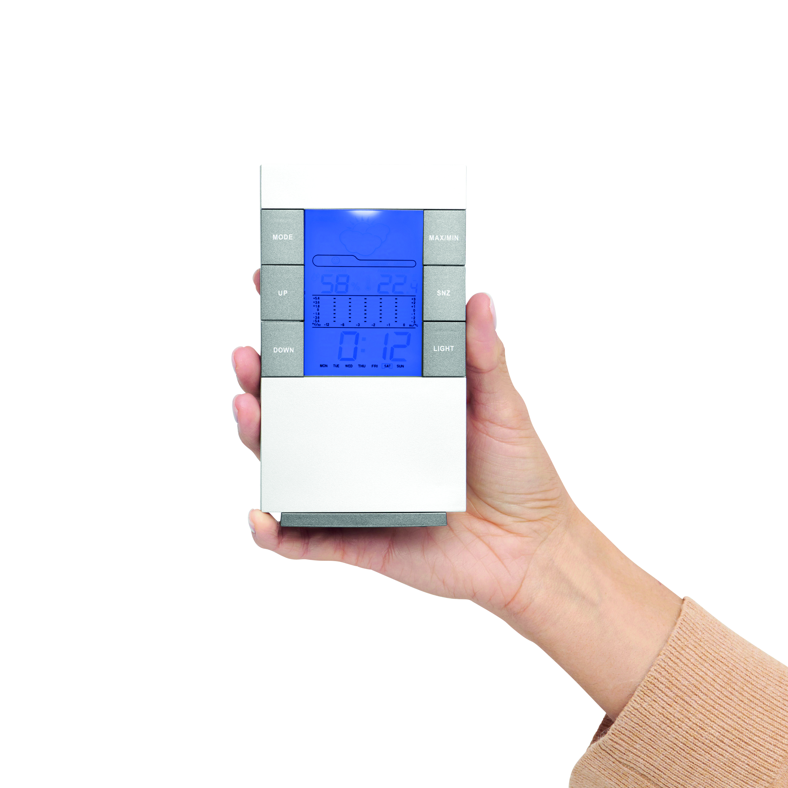 Stacja pogodowa SUNNY TIMES z ekranem LCD, budzikiem, datownikiem, termometrem i rozkładanym stojaczkiem.