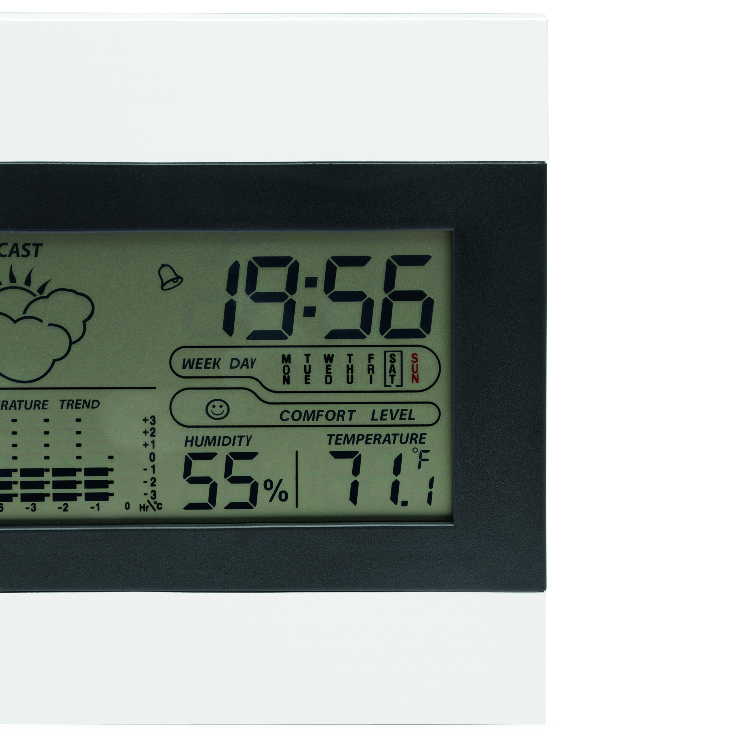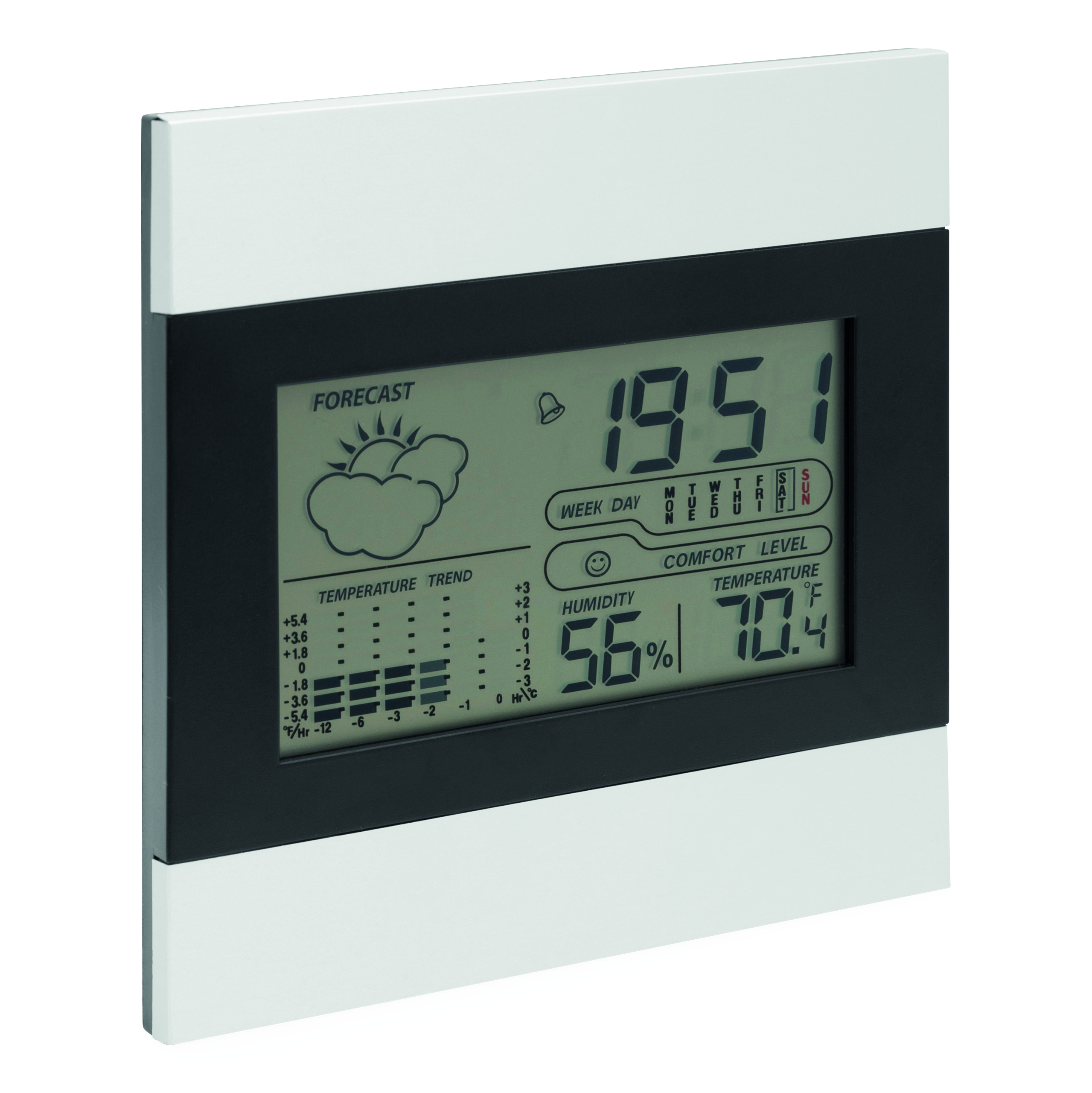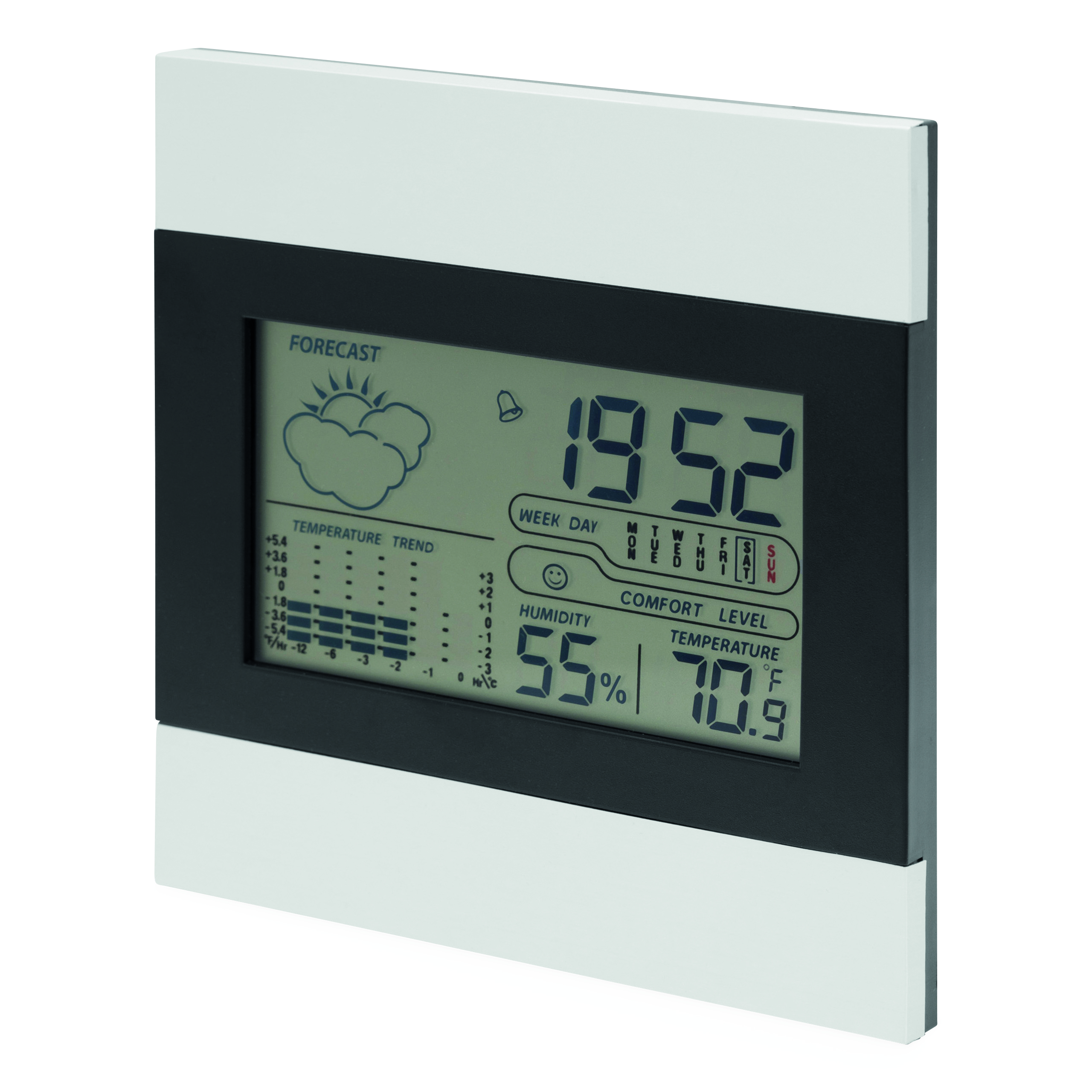 Stacja pogodowa SHINY DAY z ekranem LCD, aluminiową częścią przednią, budzikiem, datownikiem, termometrem i rozkładanym stojaczkiem.