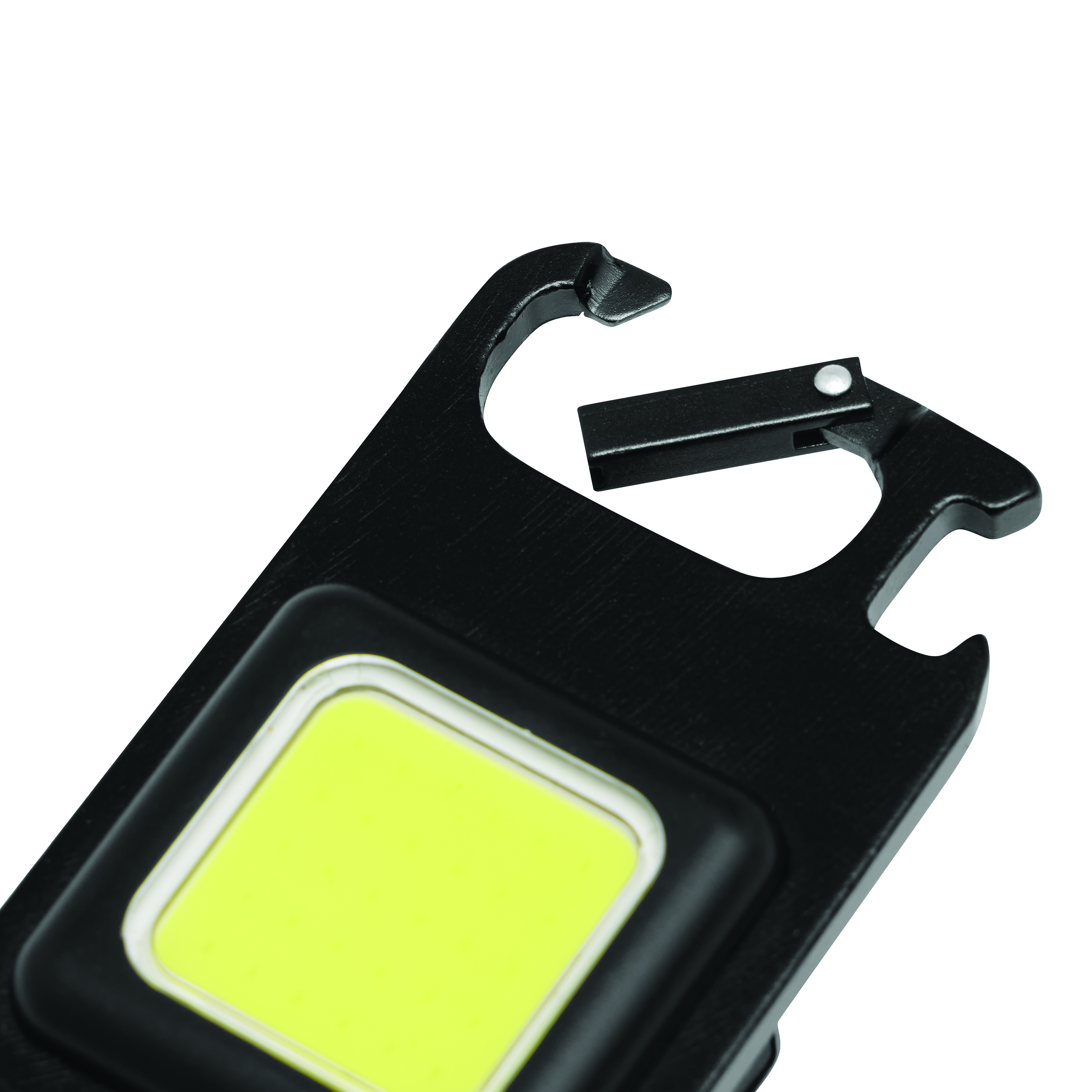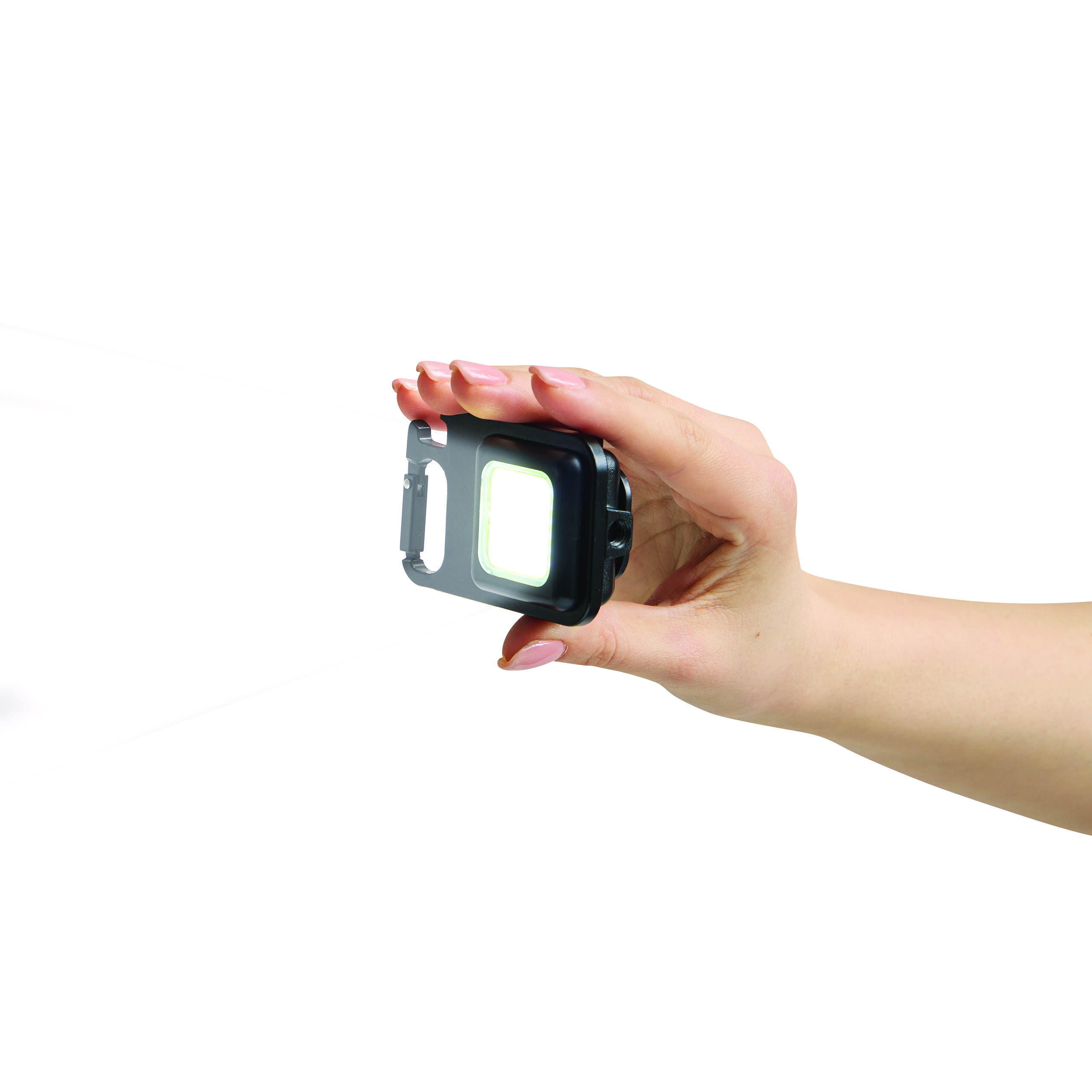 Lampa robocza LED - HELPER RECHARGE. Ma duże pole świetlne z 30 mocnymi diodami LED z 3 trybami świecenia (100%, 75% oraz miganie). Ma cztery możliwości montażu – rozkładany stojak, magnes, karabińczyk (NIE nadaje się on do wspinaczki), wewnętrzny gwint do montażu na statywach. Posiada też otwieracz do butelek, mocny akumulator litowy (300 mAh), włącznik/wyłącznik i kabel USB do ładowania ze złączem typu C (ok. 30 cm). Zapakowana jest w pudełko.
