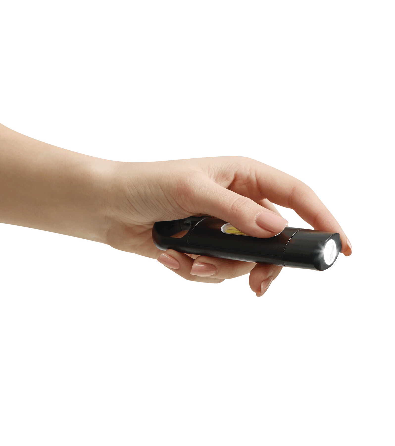 Akumulatorowa latarka BRIGHT LIGHT. Przednia dioda LED ma 3 tryby świecenia (100%, 75% oraz miganie). Latarka posiada pole świetlne z 10 mocnymi diodami LED na górnej powierzchni, mocną baterię litową (200 mAh) i wyłącznikiem/włącznikiem. W zestawie jest także kabel USB do ładowania ze złączem typu C (ok. 30 cm) oraz karabińczyk (NIE nadaje się on do wspinaczki). Zapakowana jest w pudełko.