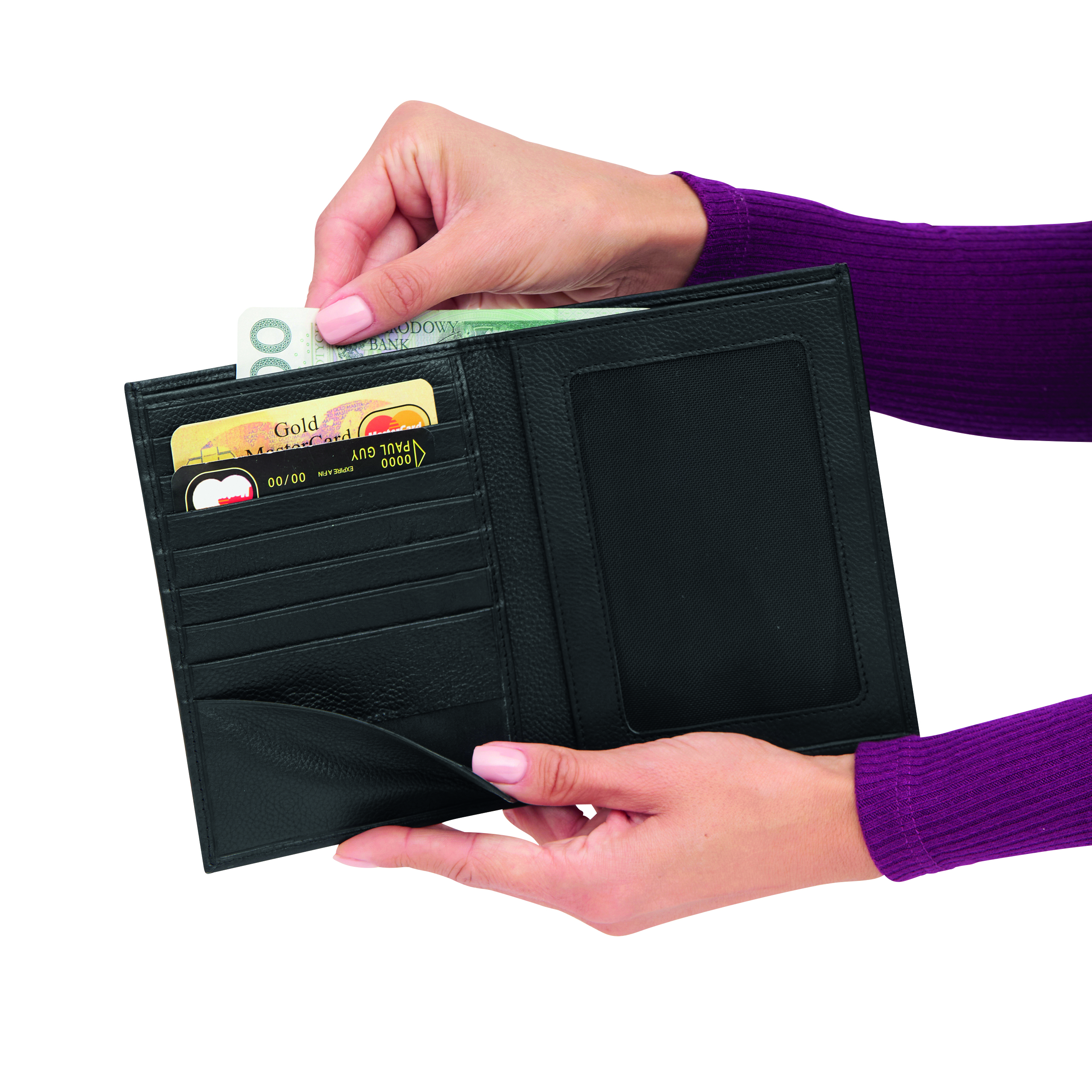 Etui na paszport VACATION. 9 przegródek wielkości karty kredytowej oraz duża kieszonka na paszport.