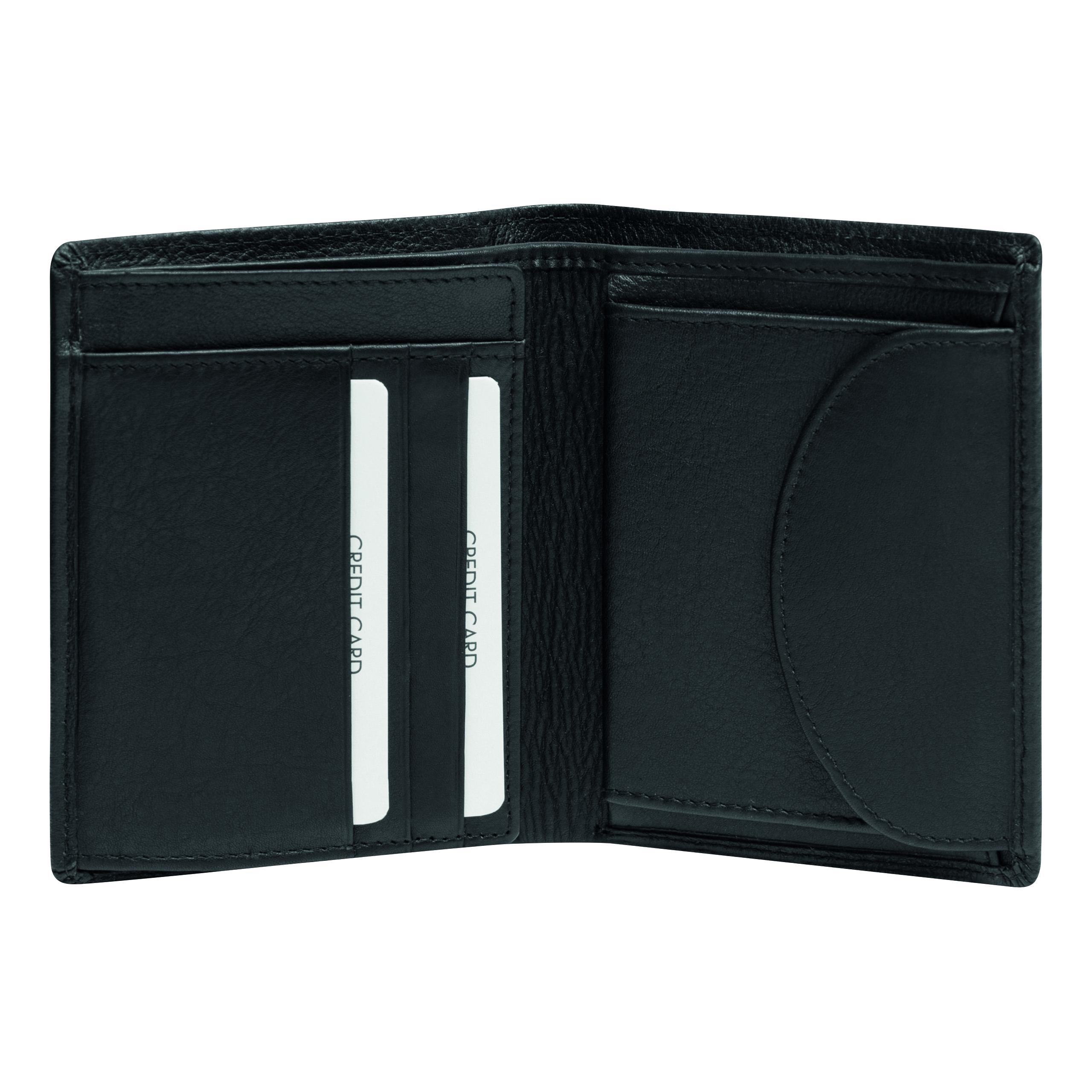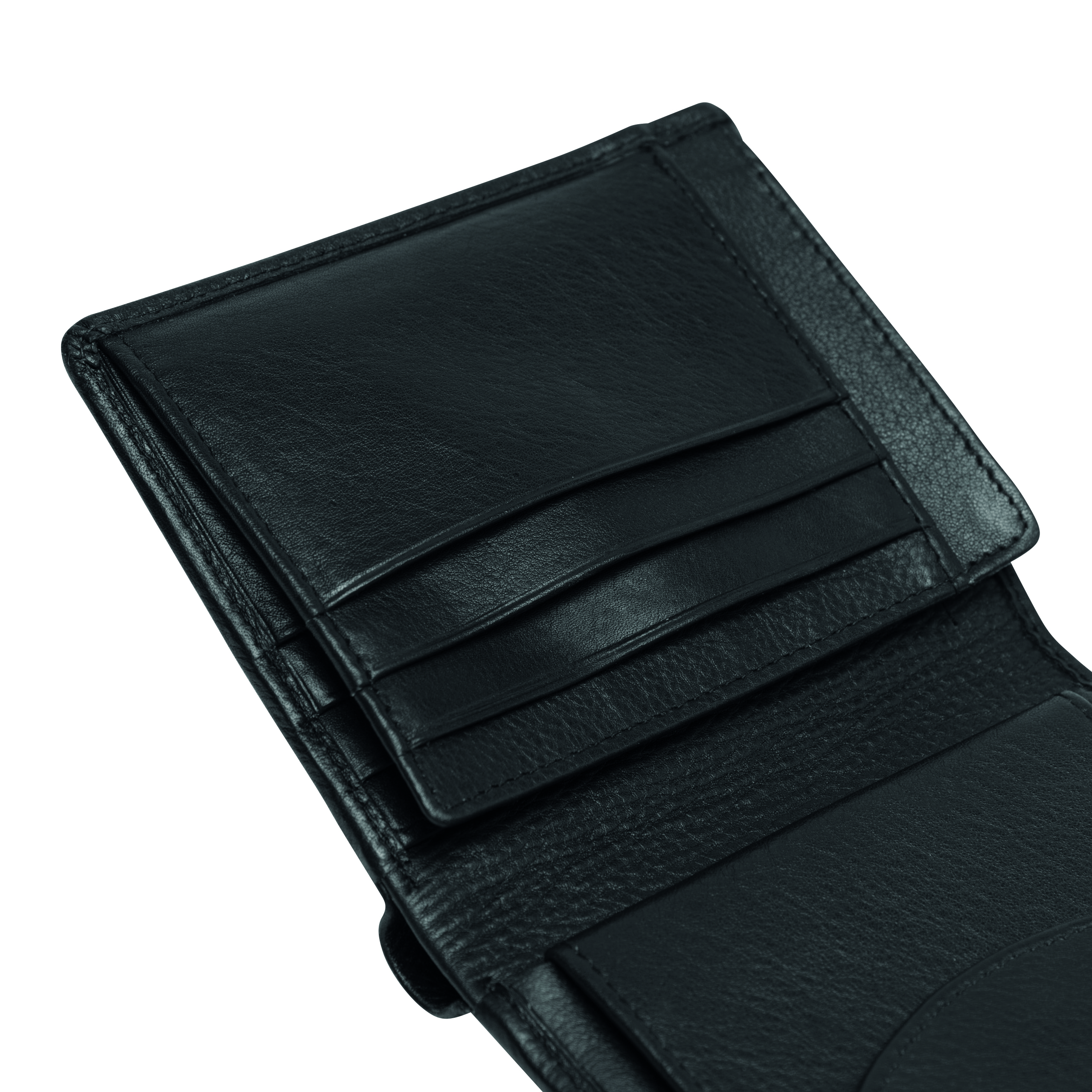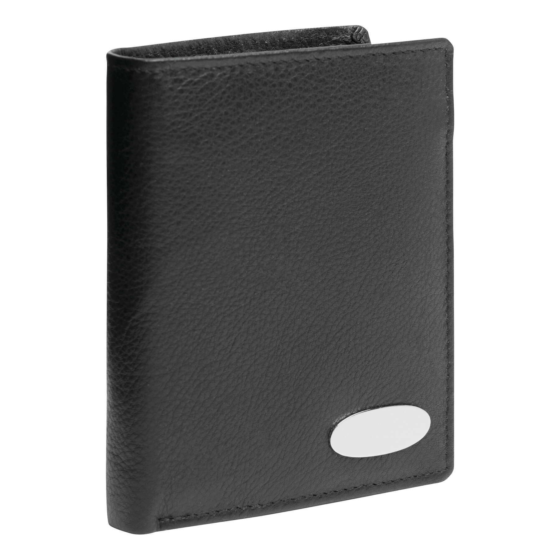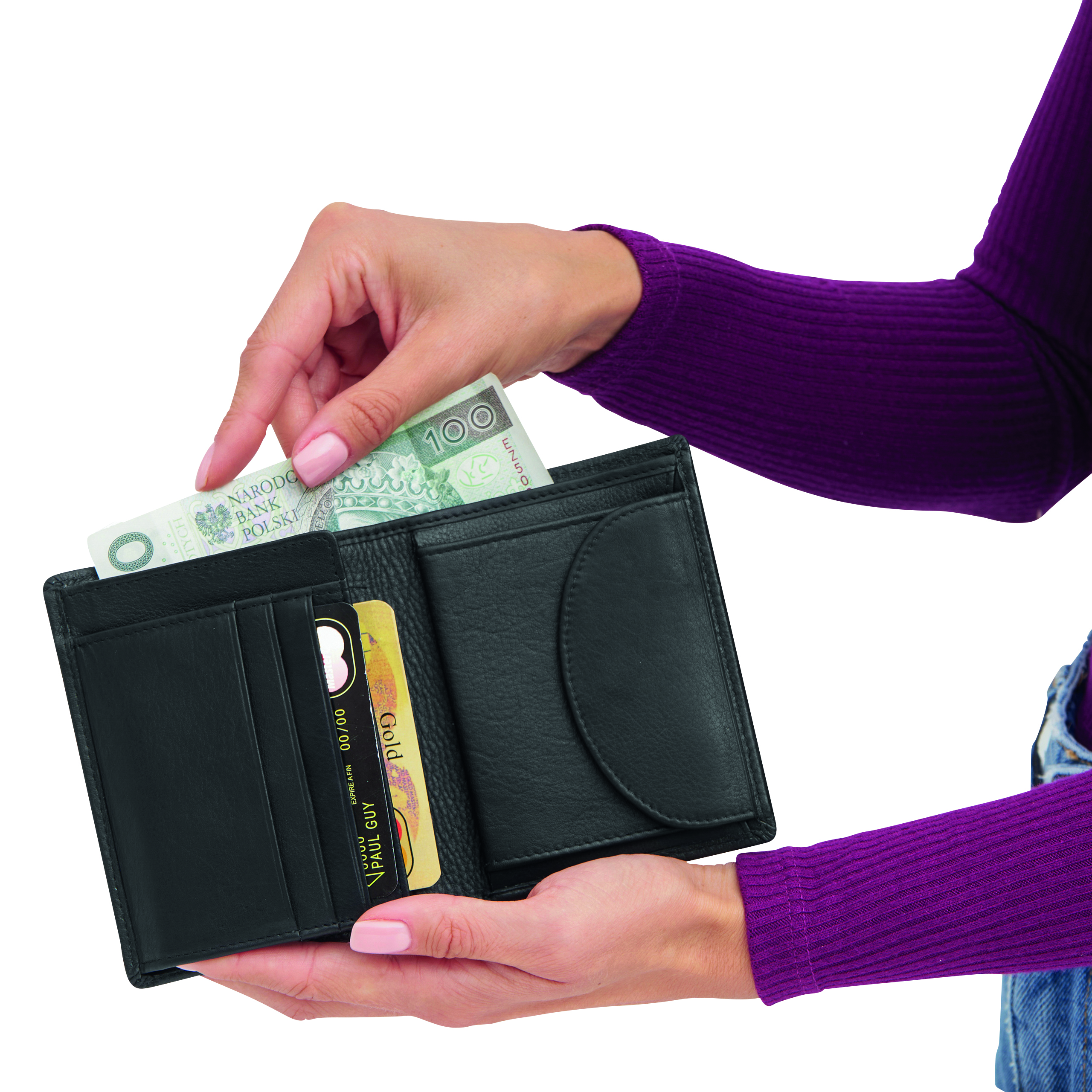 Oryginalny skórzany portfel DOW JONES z wsuwanymi kieszeniami na karty, jedną siatkową kieszenią na dowód osobisty, dwiema dużymi kieszeniami na banknoty, jedną kieszenią z zatrzaskiem na monety i z owalną metalową płytką na logo.