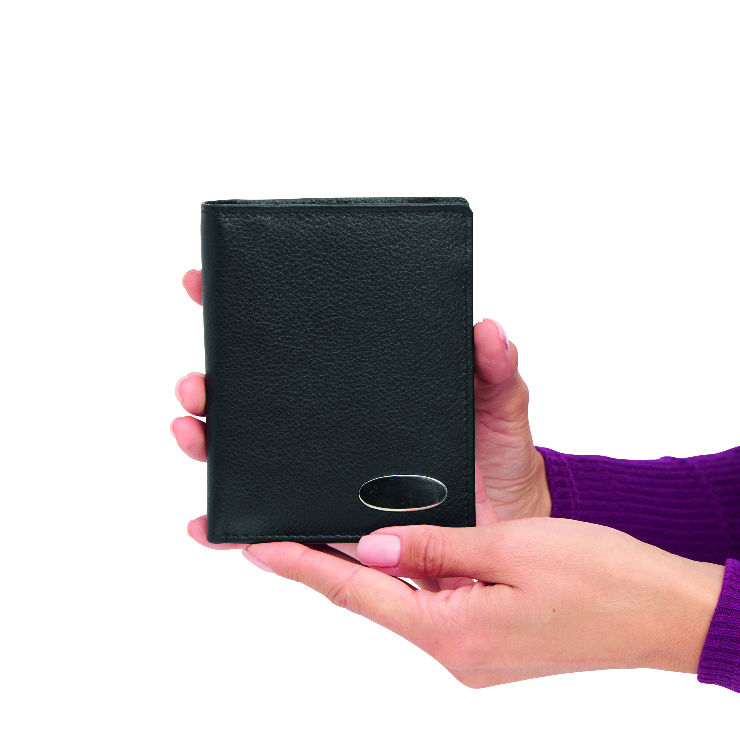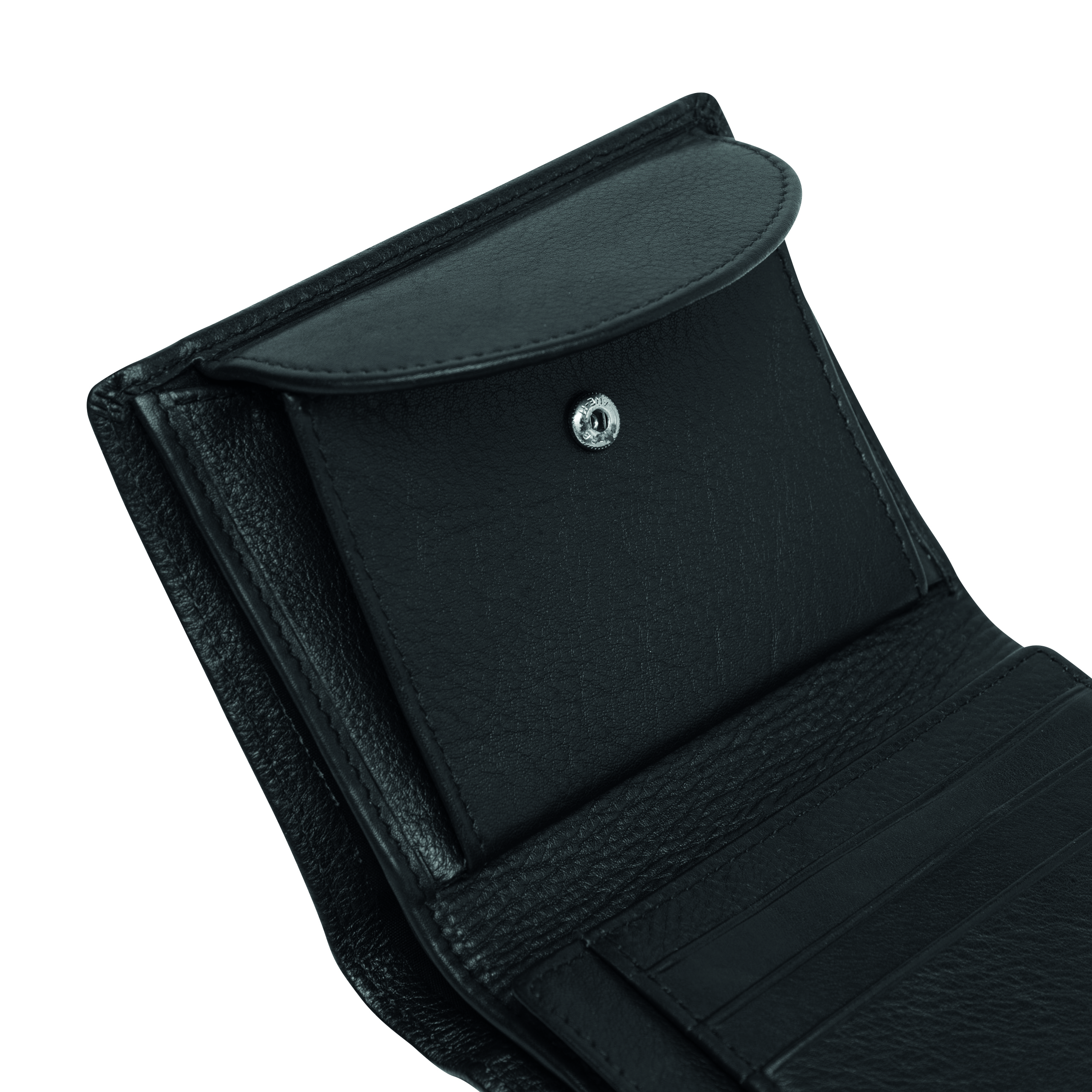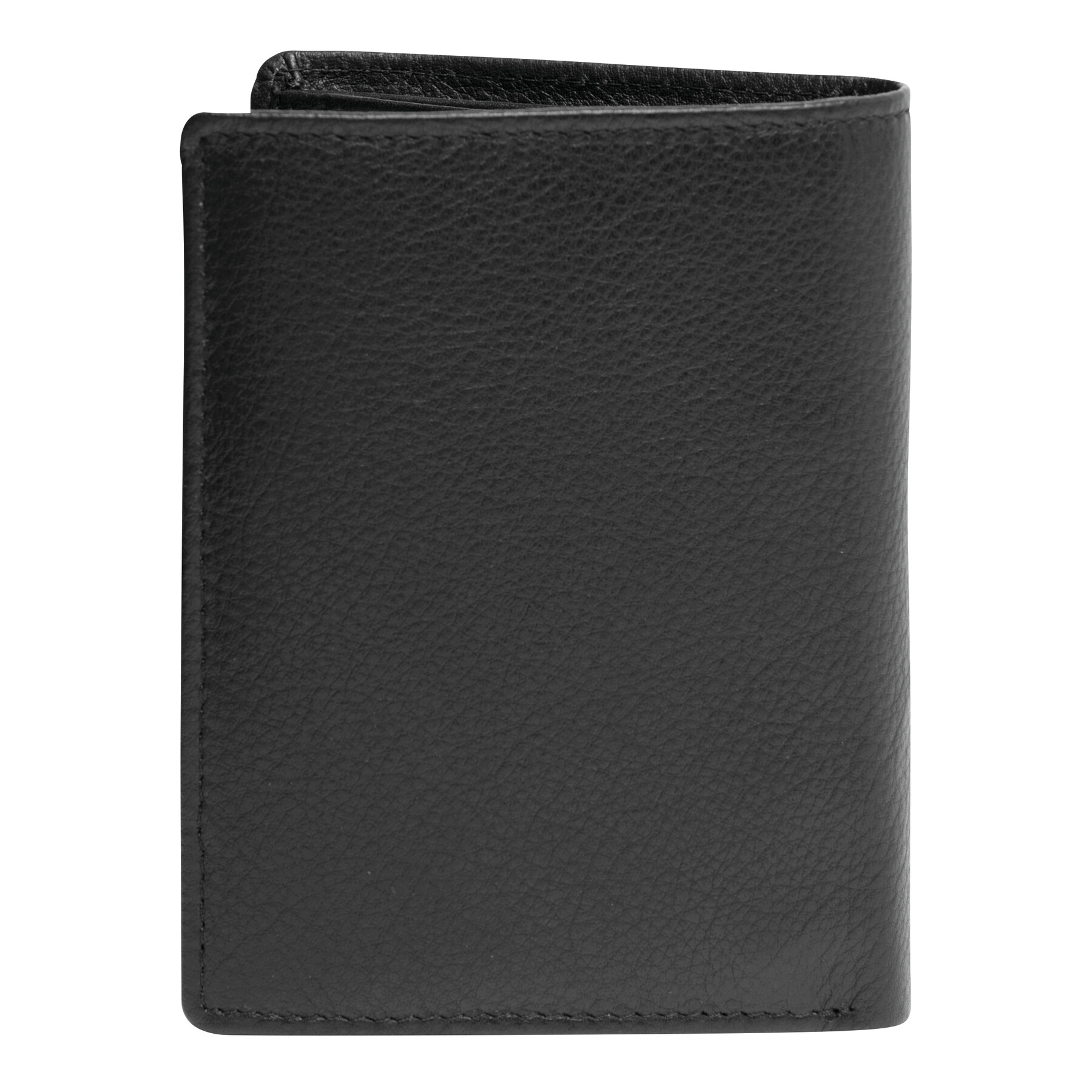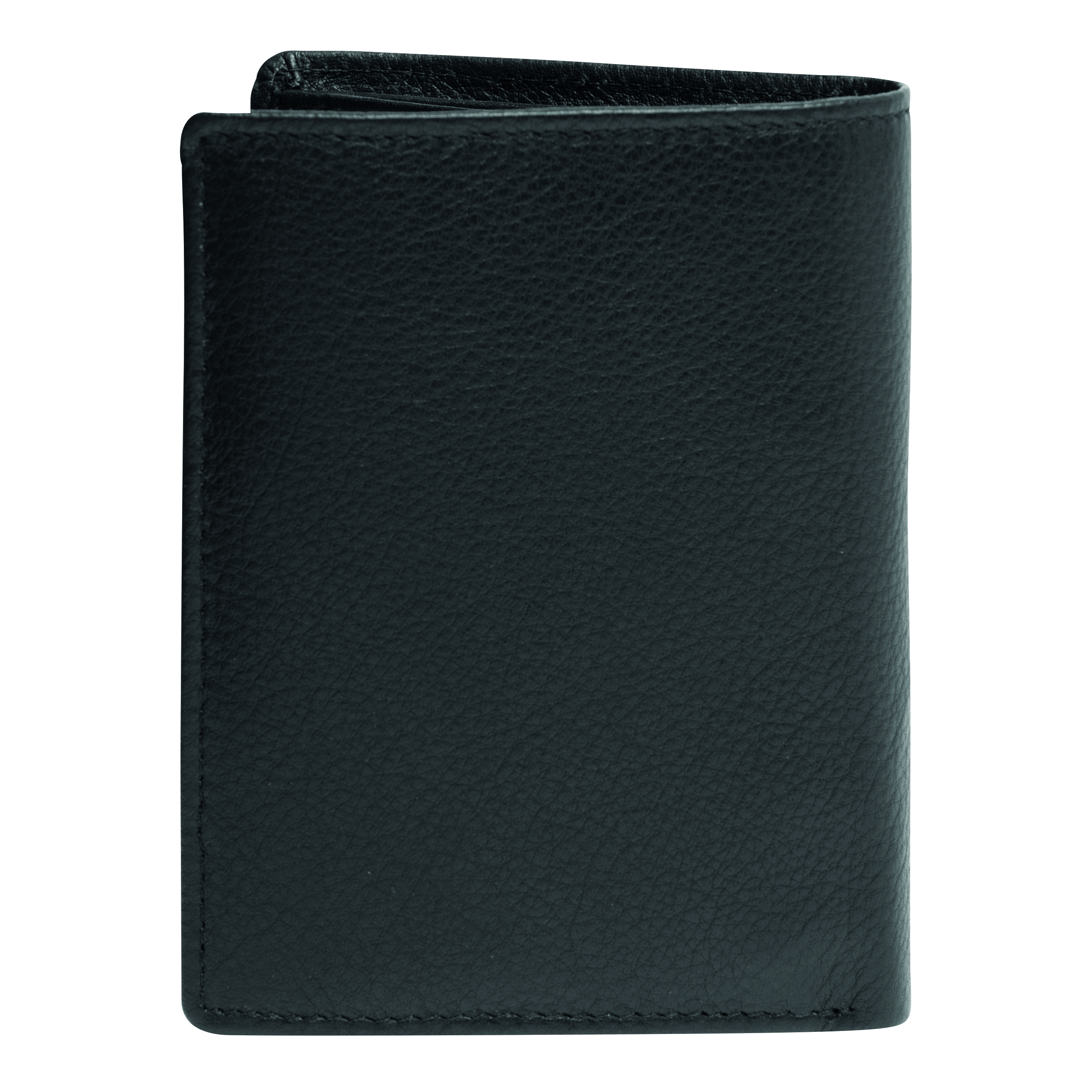 Oryginalny skórzany portfel DOW JONES z wsuwanymi kieszeniami na karty, jedną siatkową kieszenią na dowód osobisty, dwiema dużymi kieszeniami na banknoty, jedną kieszenią z zatrzaskiem na monety i z owalną metalową płytką na logo.