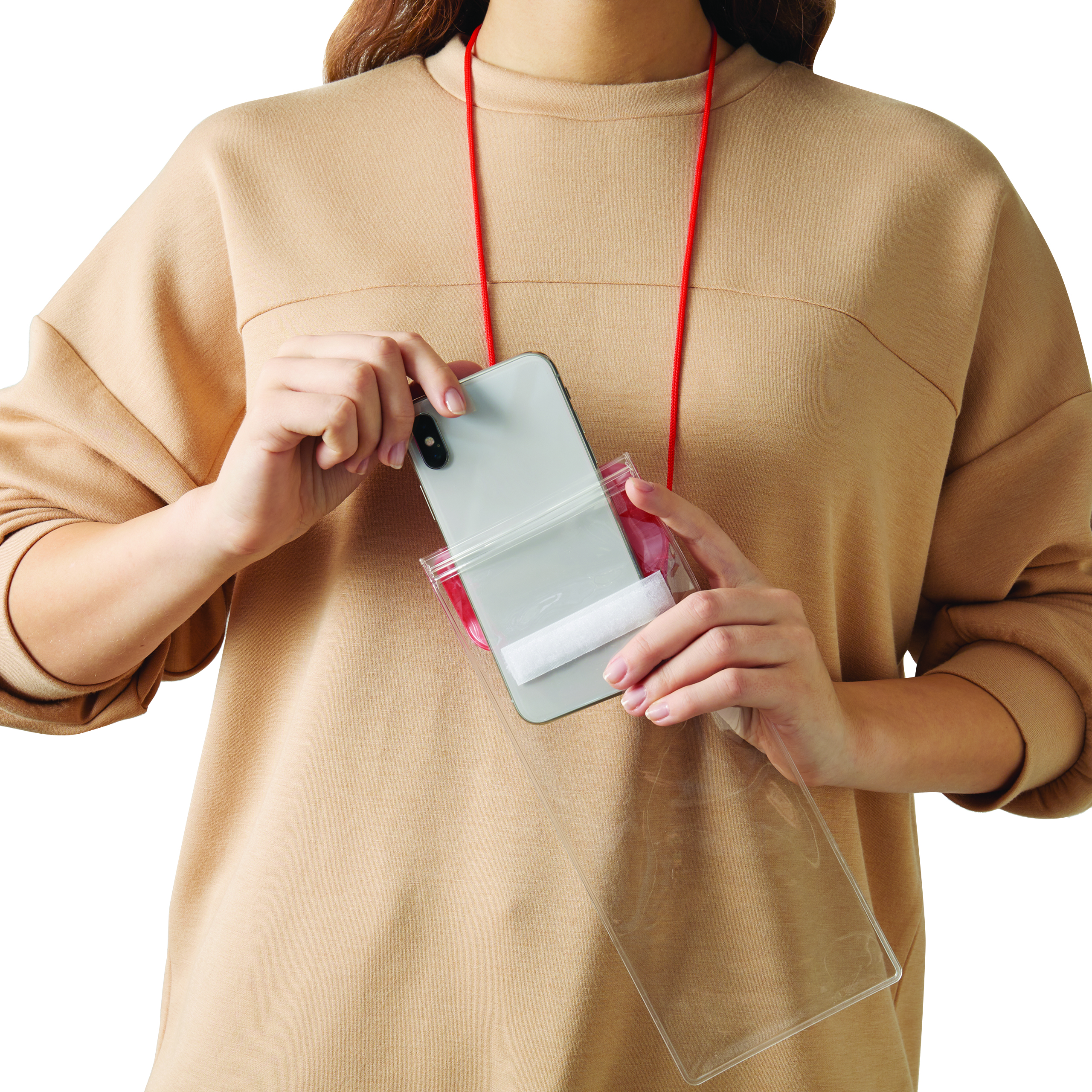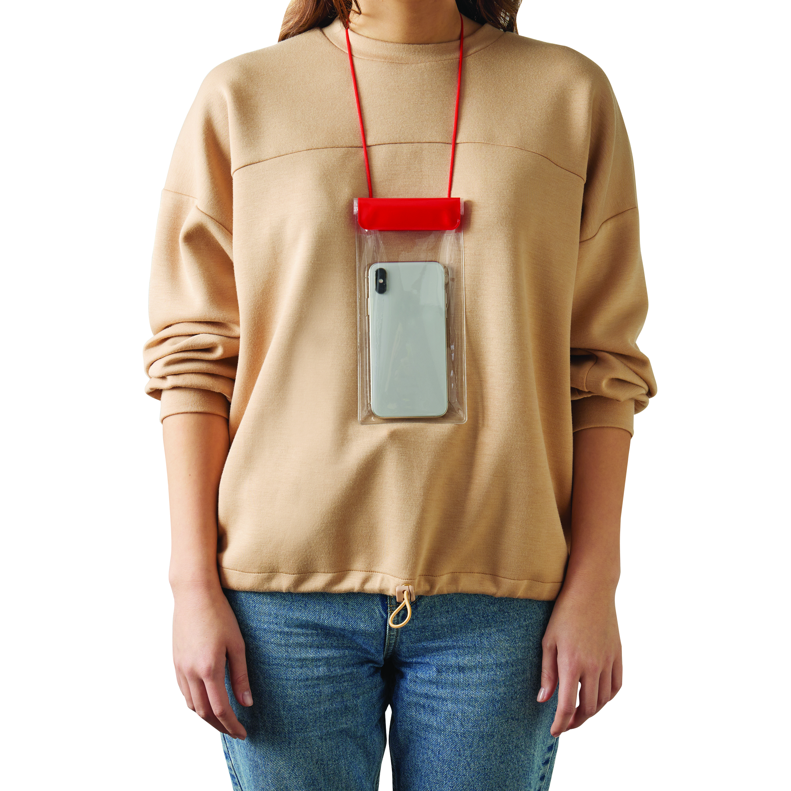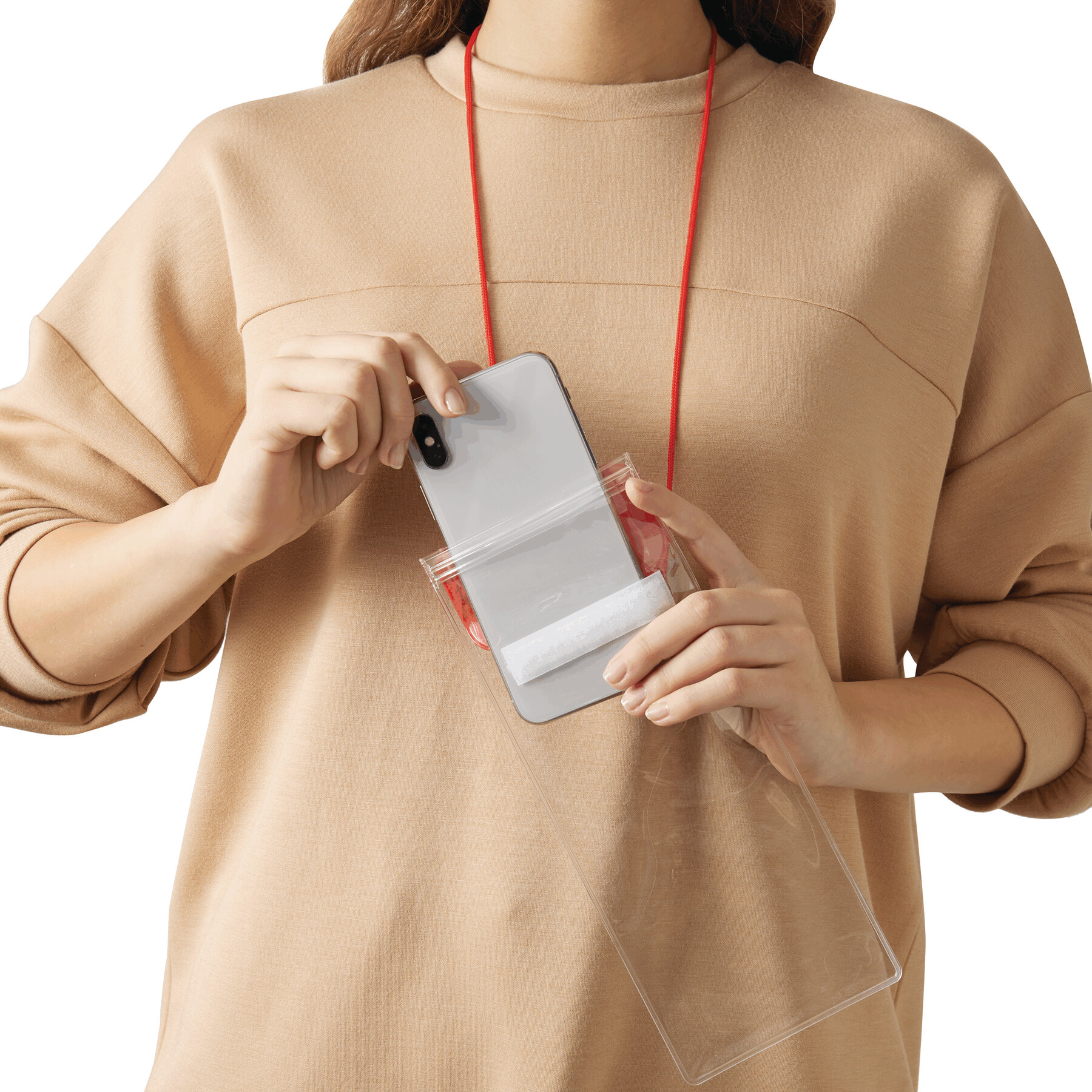 Torba na telefon SMART SPLASH XL odporna na zachlapanie: transparentna, z zamknięciem strunowym, zapięciem na rzep oraz sznurkiem z możliwością regulacji długości (ok. 45 cm) i regulowanym plastikowym stoperem. Idealna na plażę i nad jezioro, do przechowywania smartfona, portfela i innych kosztowności.