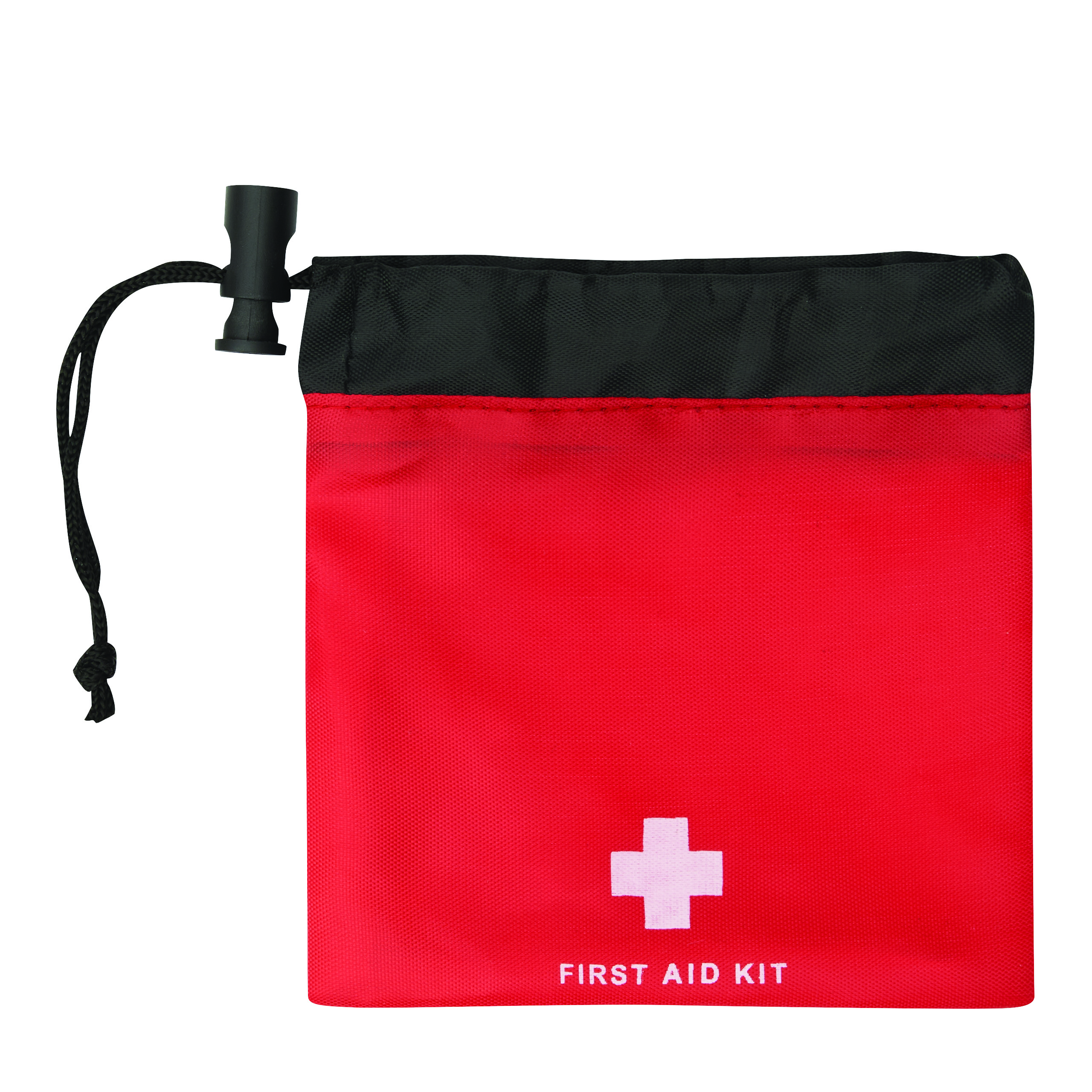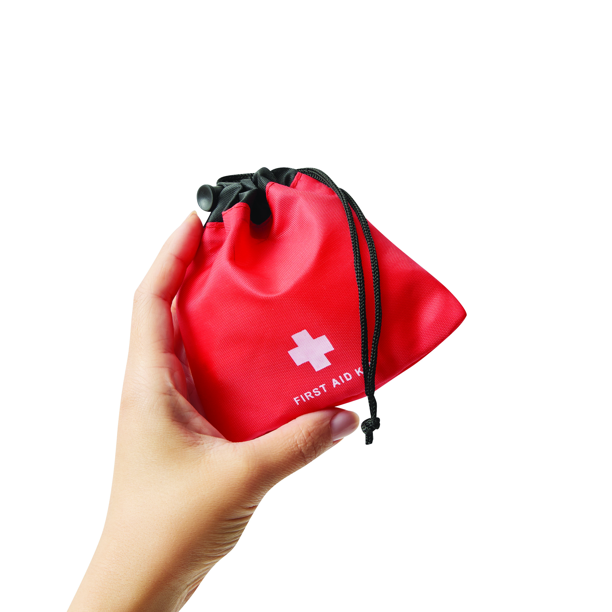Apteczka pierwszej pomocy CARRYGUARD, 13 elementów: zawiera 7 plastrów samoprzylepnych, 4 waciki nasączone alkoholem, 1 chusteczkę oczyszczającą, zapakowana w poliestrowy woreczek ze sznurkiem ściągającym i plastikowym stoperem.