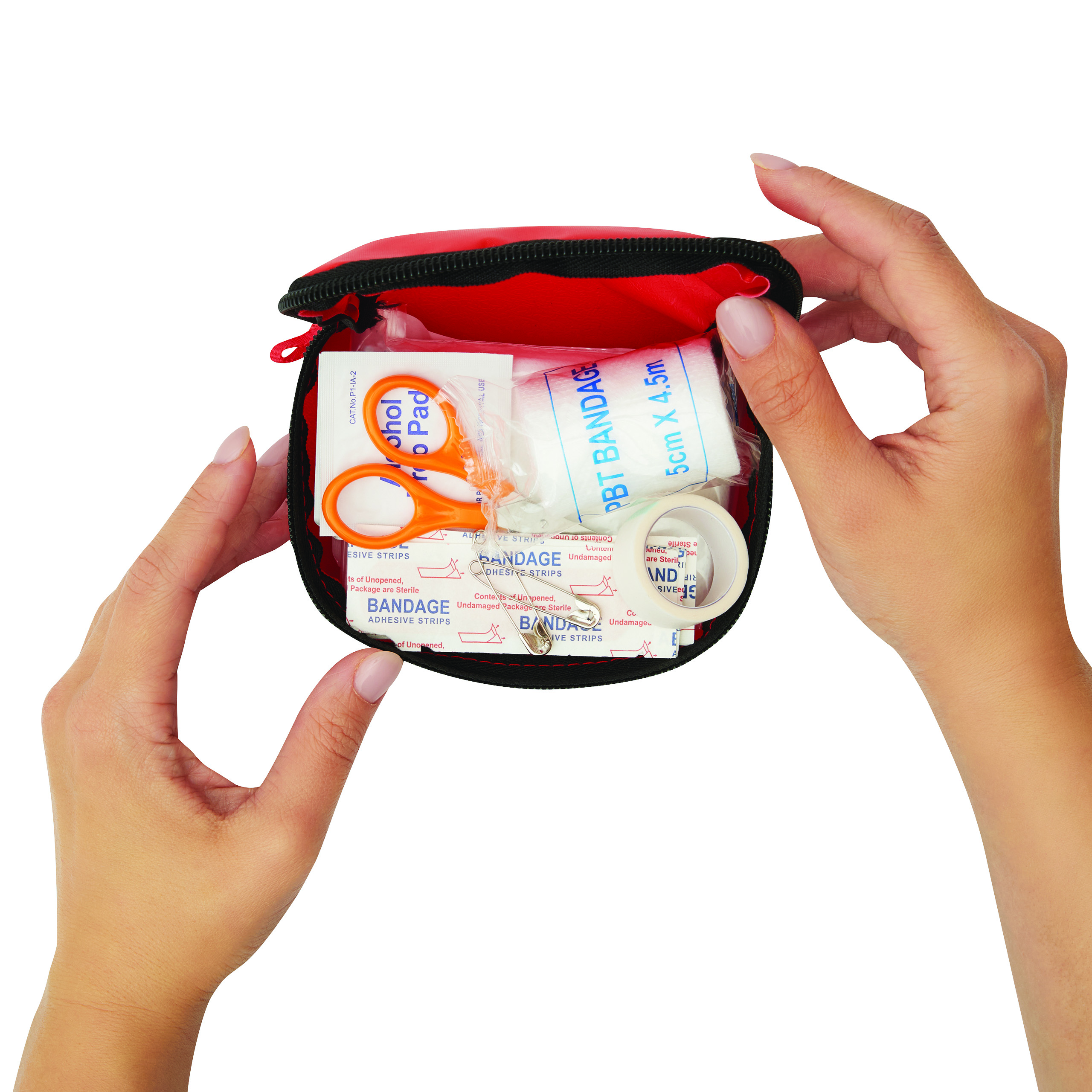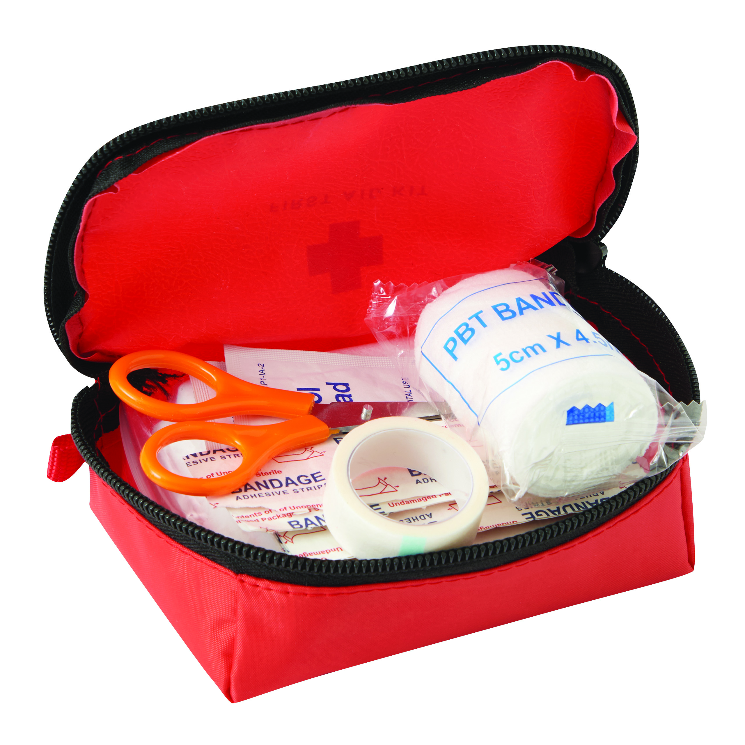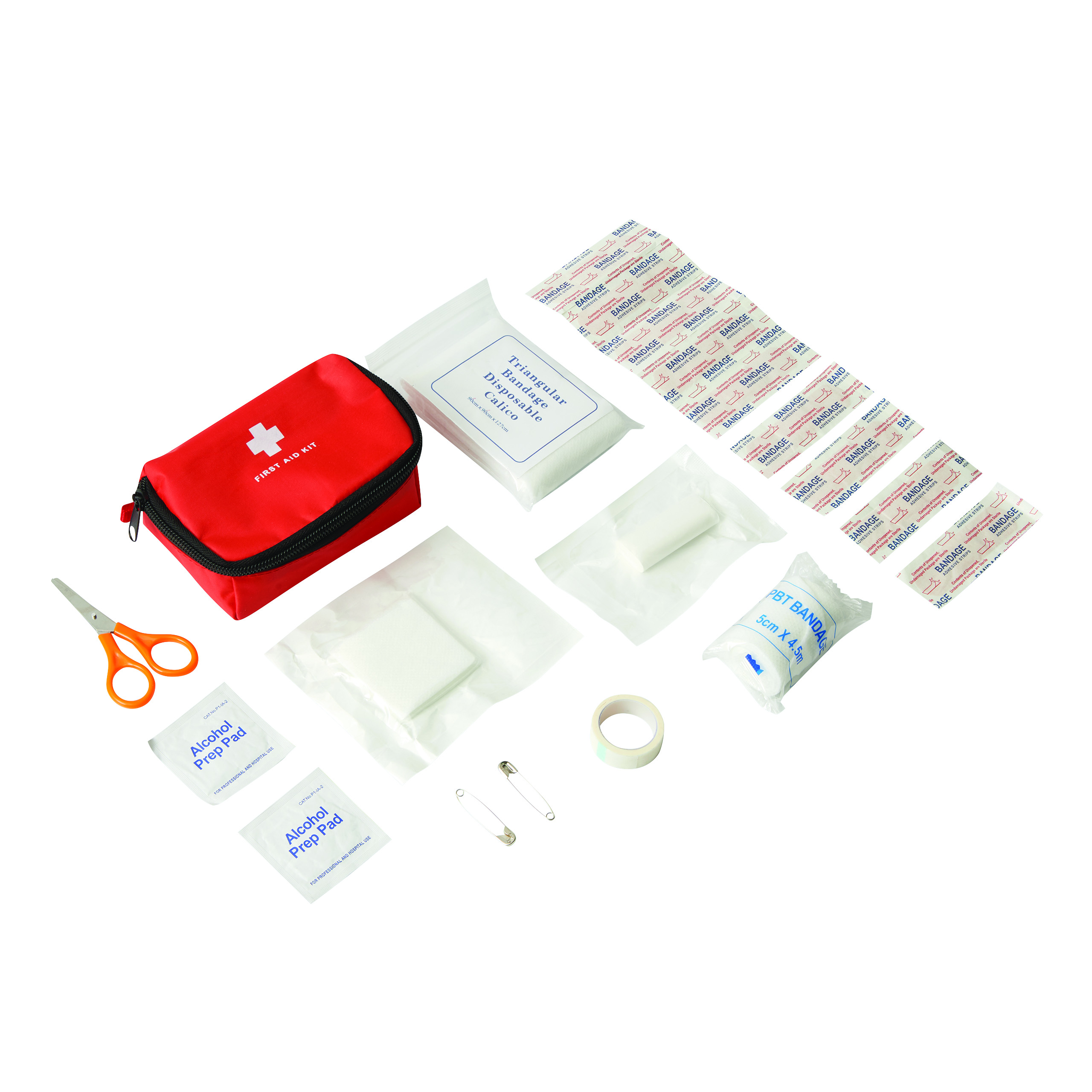 Apteczka pierwszej pomocy BIGGUARD, 20 elementów: zawiera 1 parę małych nożyczek, 9 plastrów samoprzylepnych, 1 bandaż PBT, 1 rolkę taśmy samoprzylepnej, 1 bandaż gazowy, 2 waciki nasączone alkoholem, 1 opakowanie gazików, 1 chustę trójkątną, 2 agrafki, zapakowana w nylonową torbę z zamkiem błyskawicznym.