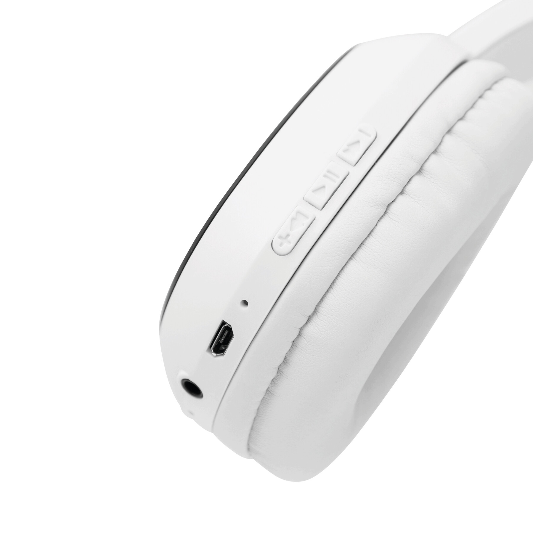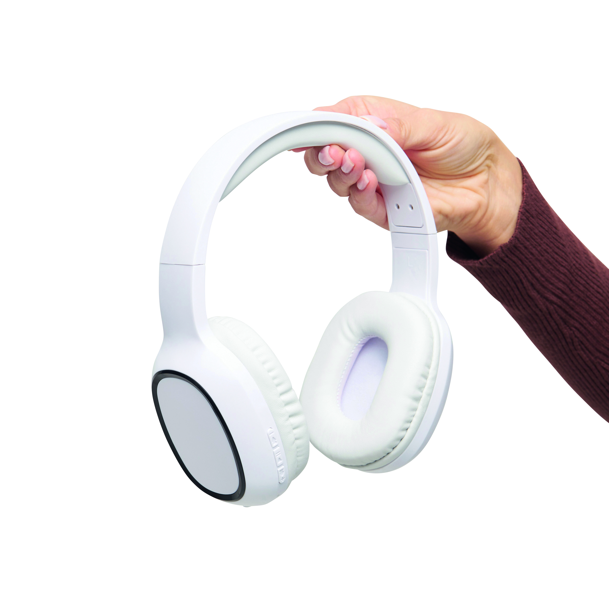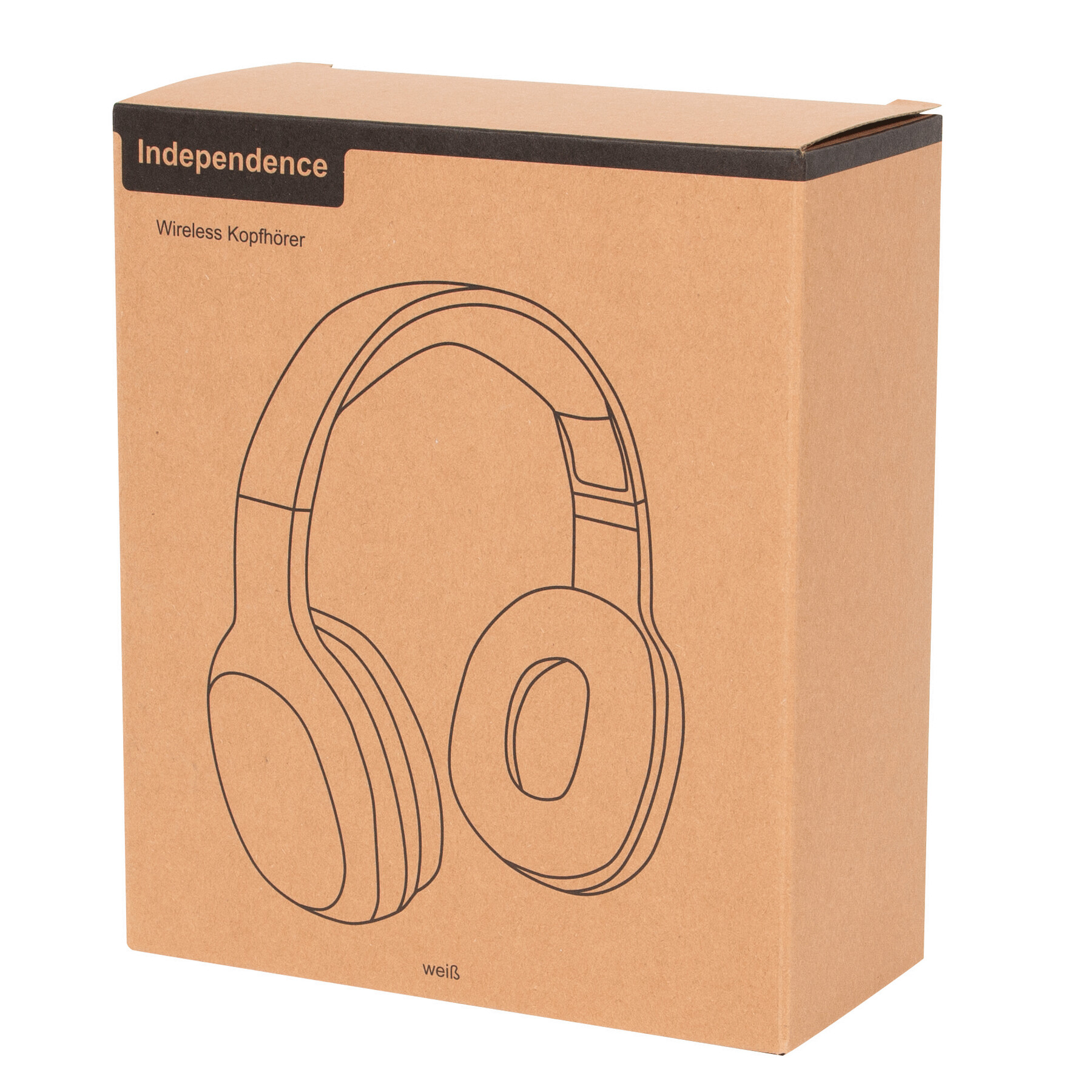 Słuchawki bezprzewodowe INDEPENDENCE z wyściełanym pałąkiem i nausznikami. Regulowany rozmiar, prawy nausznik ze zintegrowaną funkcją obsługi i funkcją zestawu głośnomówiącego, zasięg ok. 10 m, akumulator o pojemności 200 mAh, czas pracy ok. 5-6 godzin, kabel USB do ładowania (długość ok. 50 cm) i kabel z wtyczką audio jack 3,5 mm (długość ok. 50 cm).