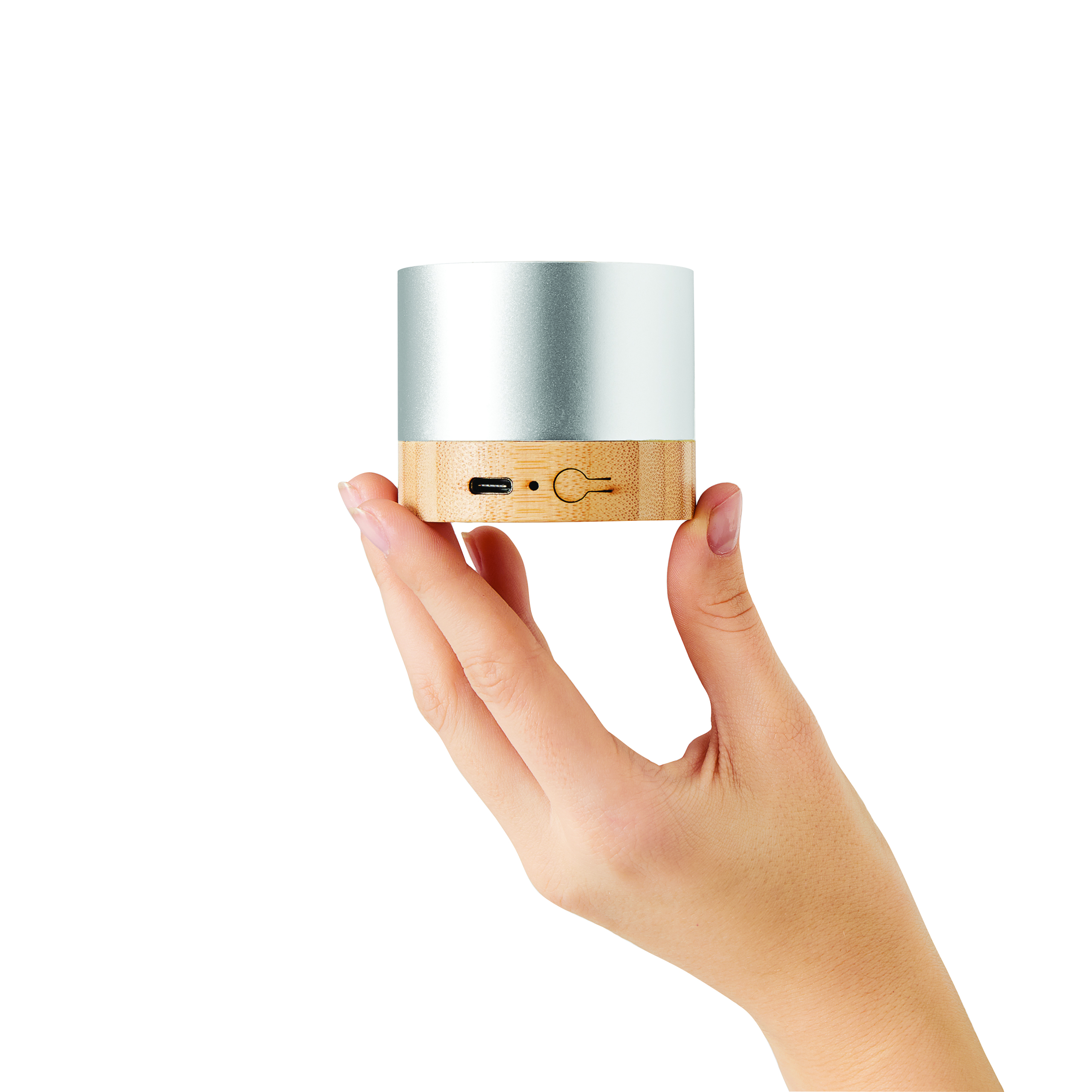Głośnik bezprzewodowy PURE SOUND: wytworzony z aluminium pochodzącego z recyklingu na bambusowej podstawie, moc muzyczna 3W, zasięg ok.10 m, do parowania z telefonem komórkowym, bezprzewodowym odtwarzaczem MP3, tabletem itp., kompatybilny z Bluetooth®; w zestawie kabel ładujący USB C o długości ok. 120 cm, funkcja głośnomówiąca, moc wejściowa: 5V/1A, zintegrowany akumulator 300 mAh.