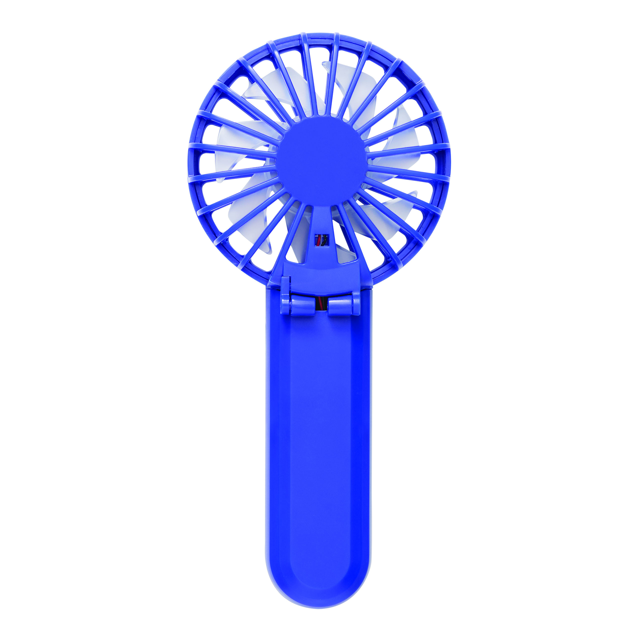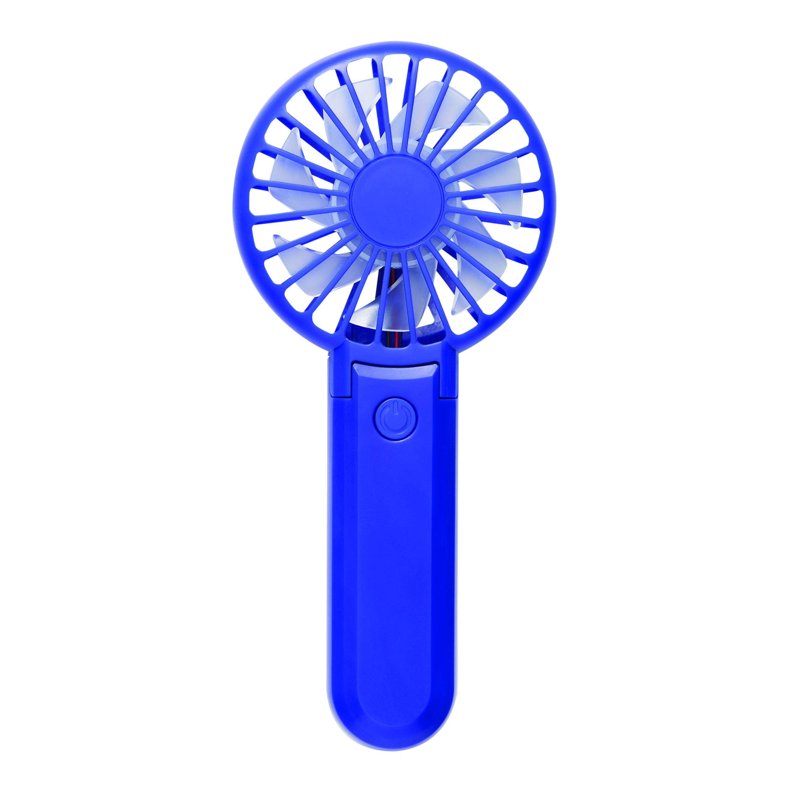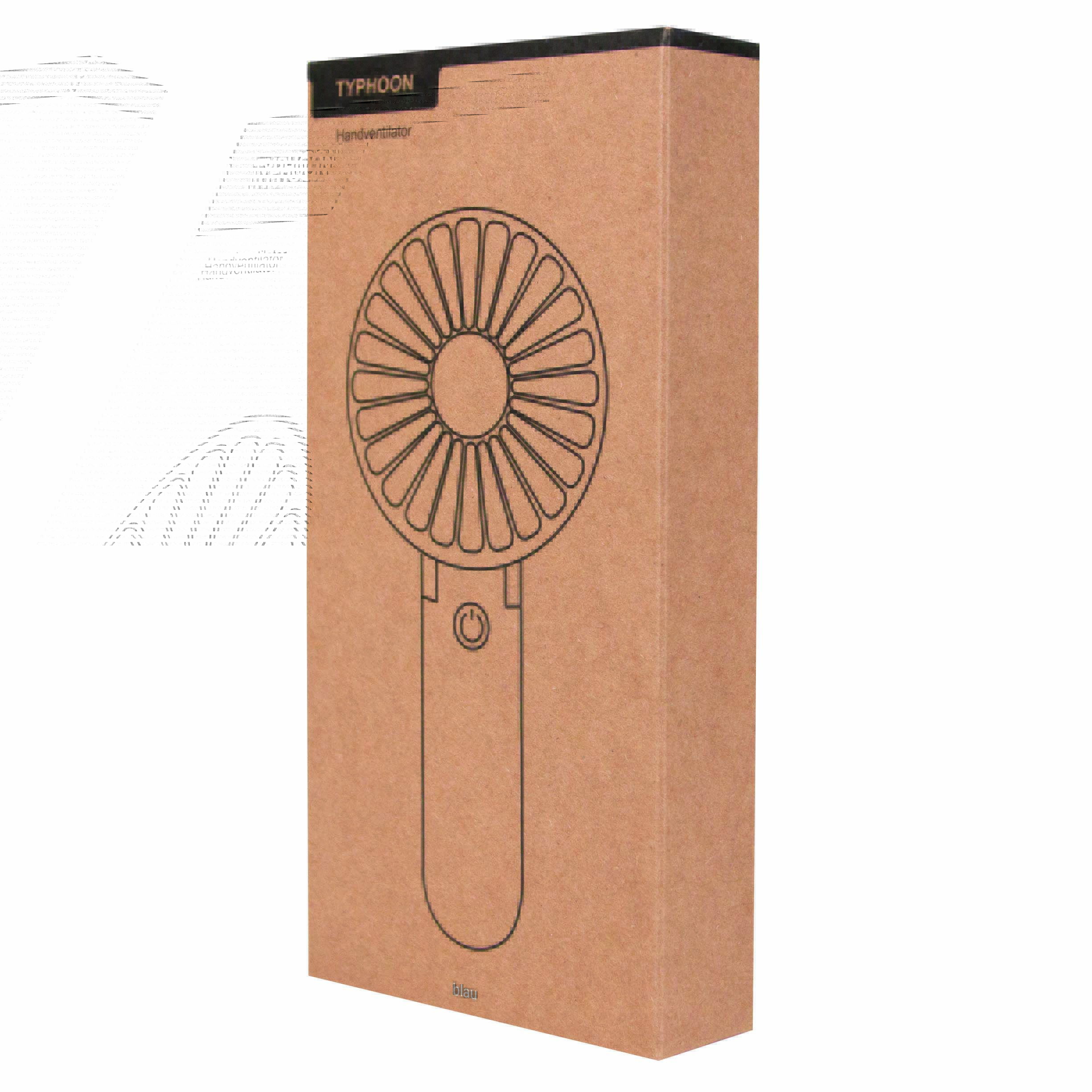 Przenośny wentylator TYPHOON. Składany miniwentylator z 3 ustawieniami prędkości. Posiada akumulator litowy o pojemności 300 mAh oraz kabel do ładowania USB-C (ok. 30 cm). Zapakowany jest w pudełko.