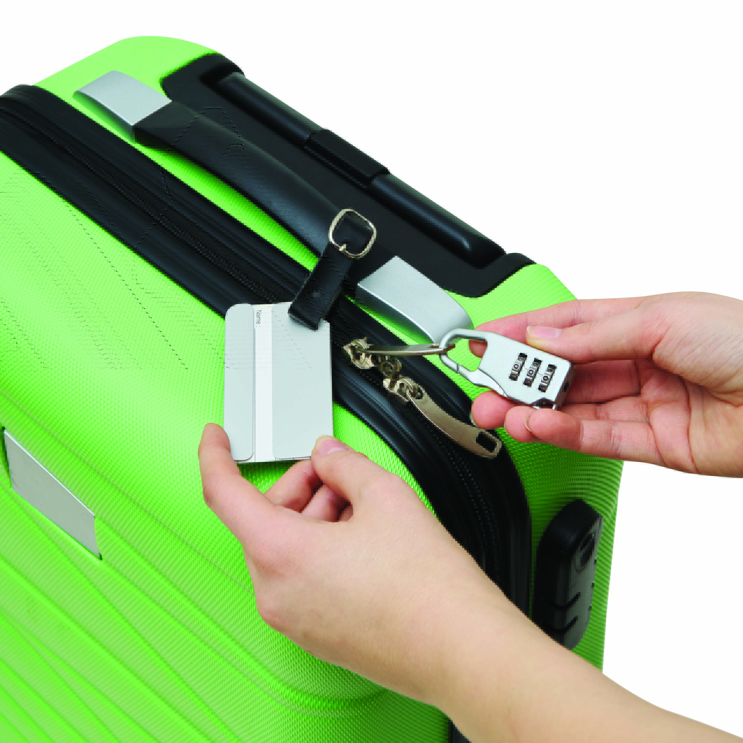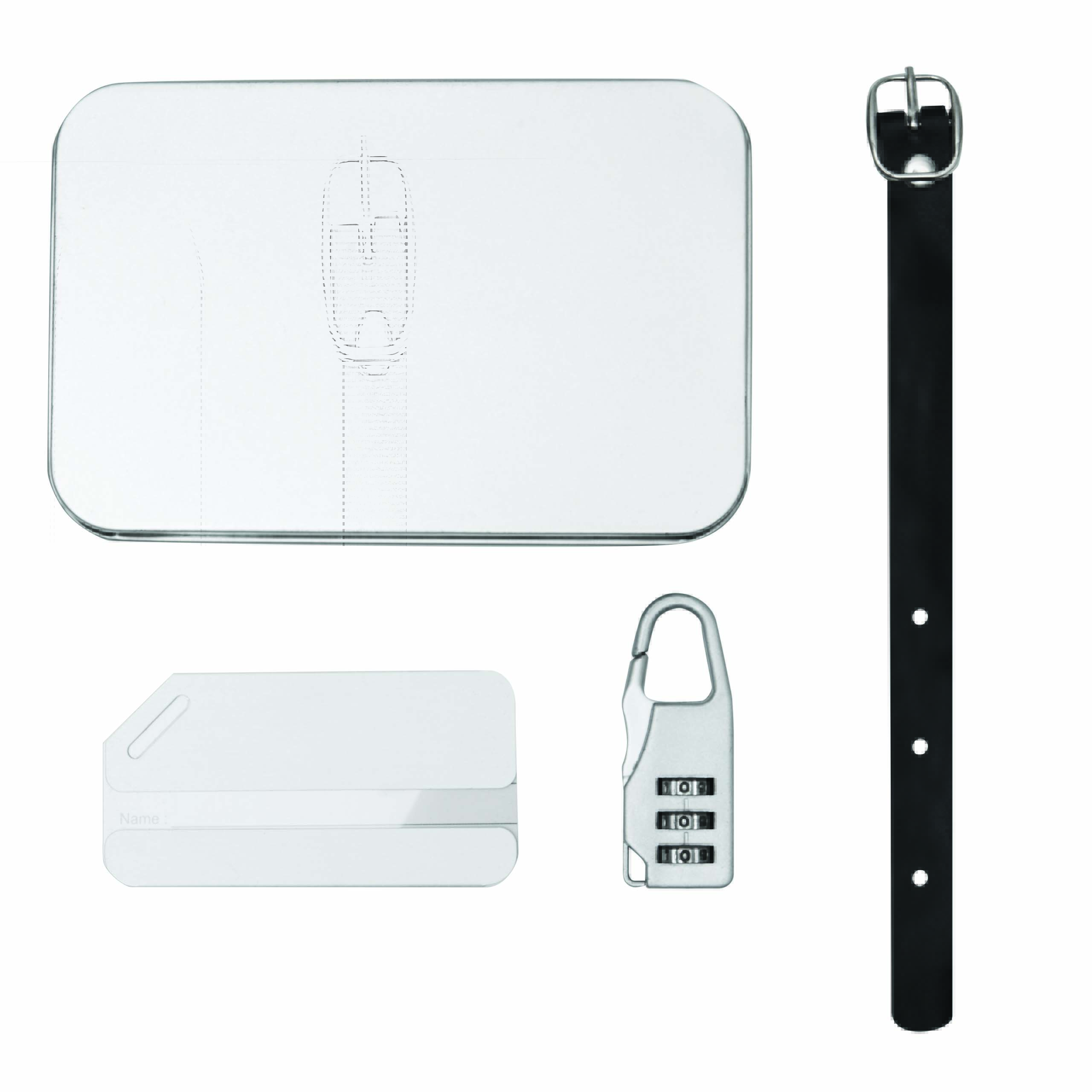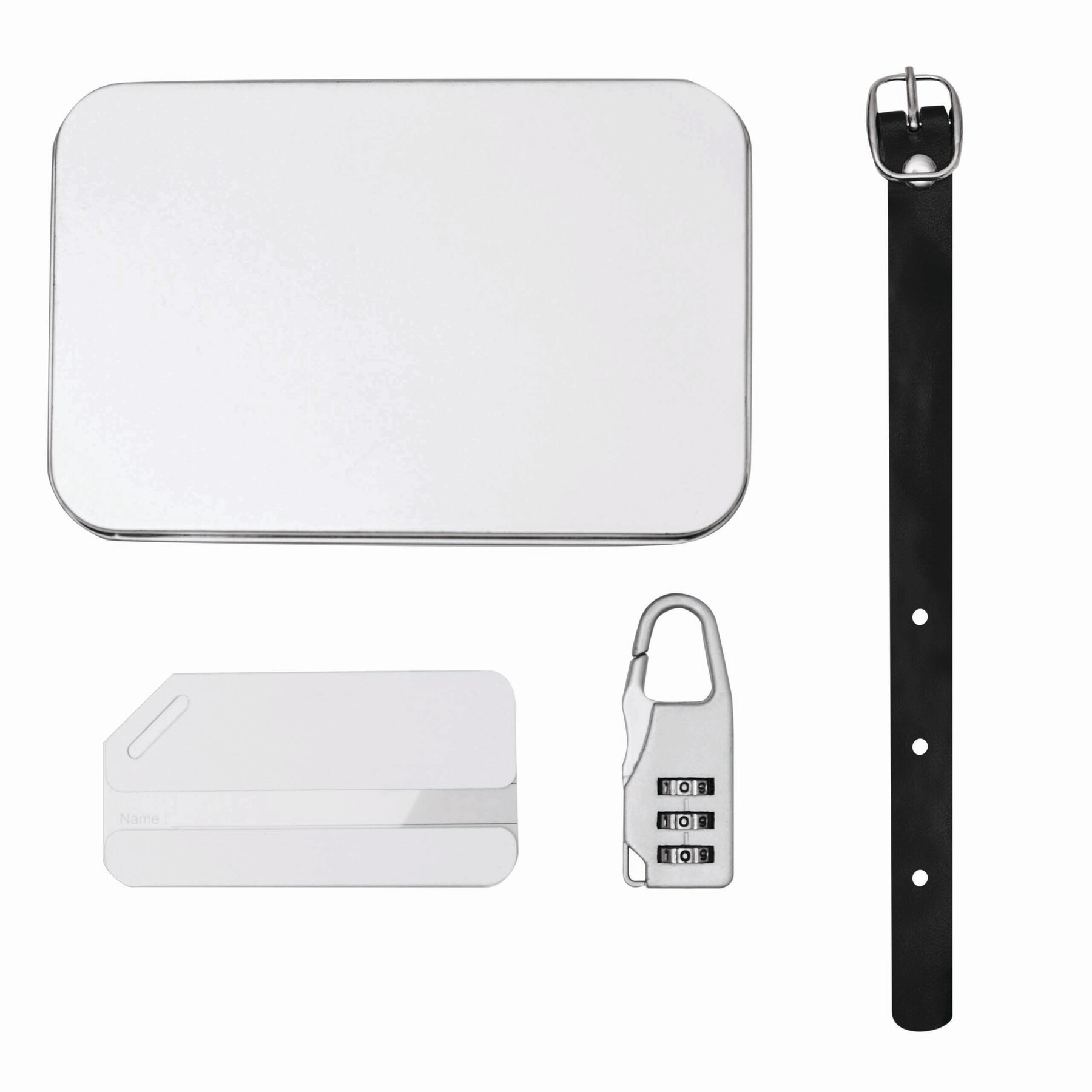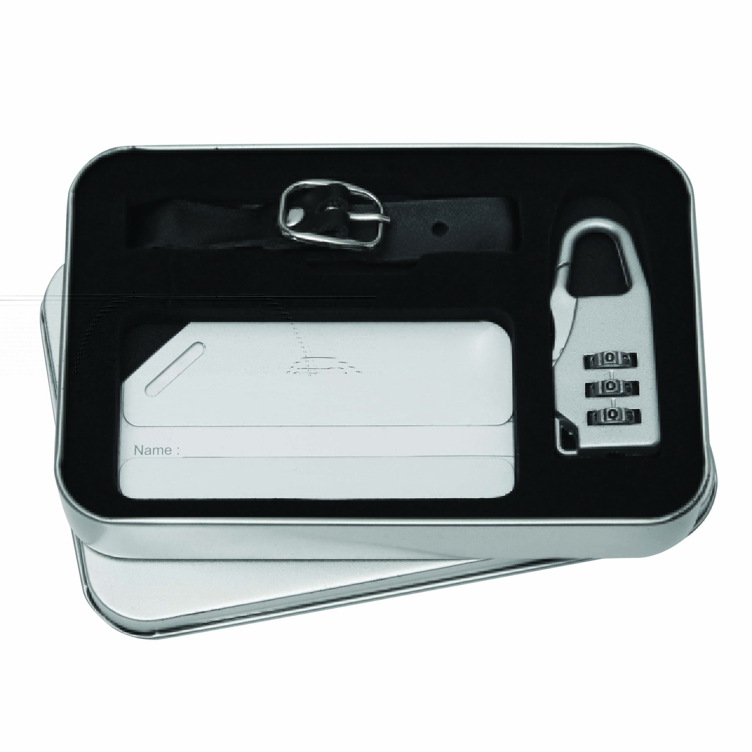 Zestaw do bagażu FAR AWAY składa się z aluminiowej zawieszki do bagażu z wyjmowanym polem na adres, paska z klamrą do mocowania do bagażu, zamka szyfrowego z karabińczykiem. Całość w metalowym pudełku.