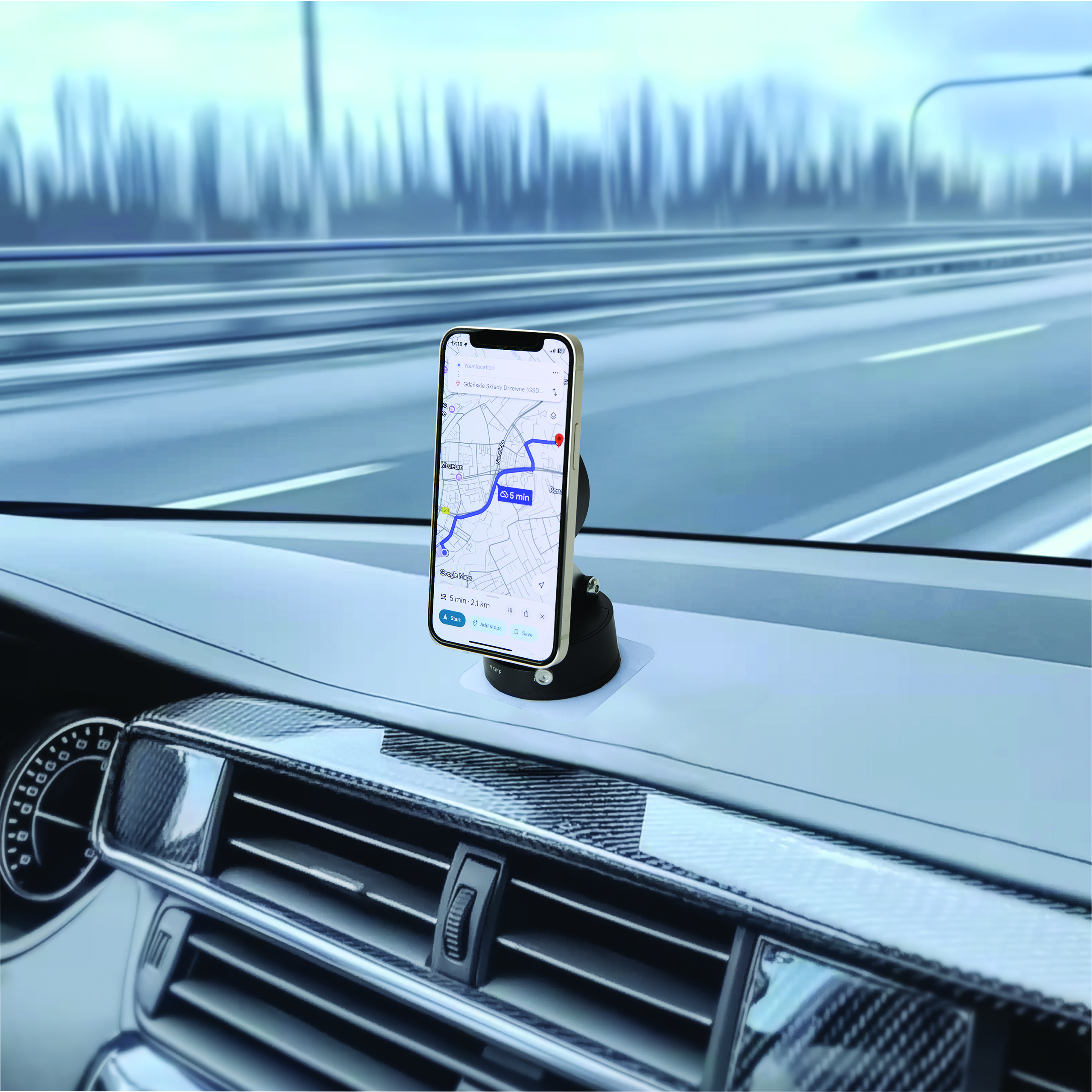 Uchwyt na telefon STRONG HOLD. Mocny i pewny uchwyt na deskę rozdzielczą samochodu lub przednią szybę z przyssawką próżniową aktywowaną przez przesuwaną blokadę z regulowaną głowicą obrotową i magnetyczną powierzchnią antypoślizgową. Posiada dodatkową podkładkę samoprzylepna do szorstkich powierzchni, jednorazową ściereczkę nawilżaną i ściereczkę do czyszczenia, klucz sześciokątny i 2 pierścienie magnetyczne do przymocowania do telefonu w zestawie. Zapakowany jest w pudełko.
