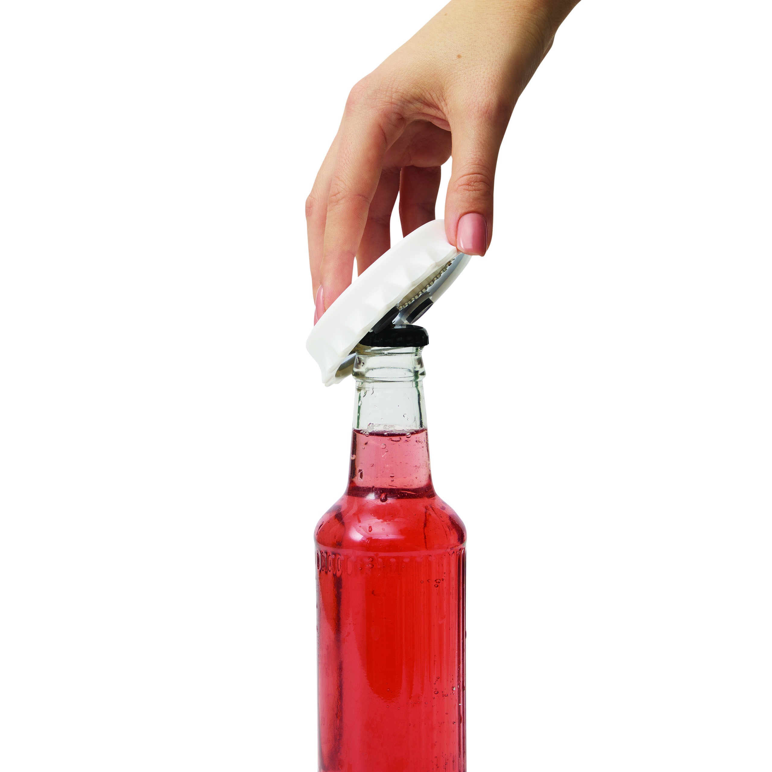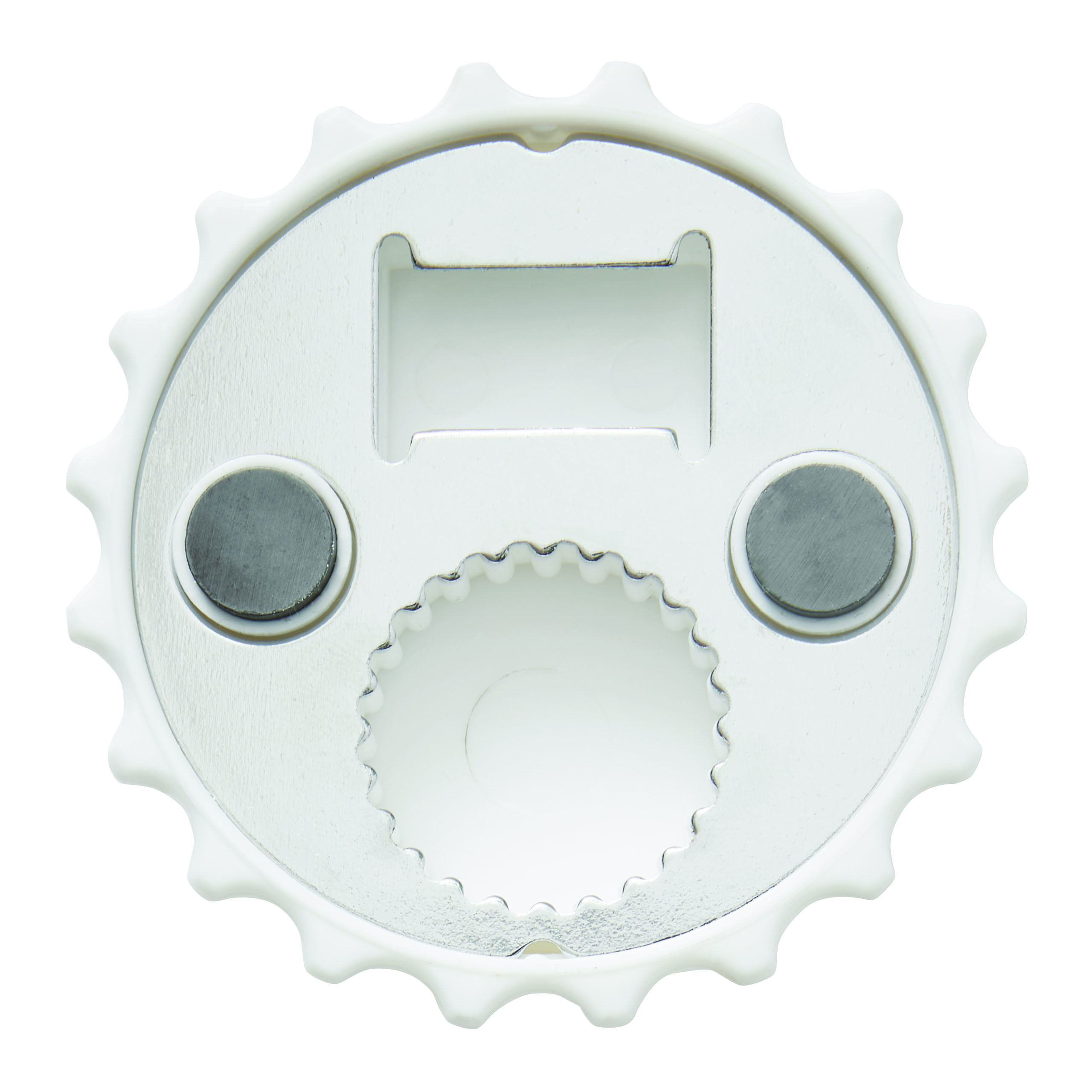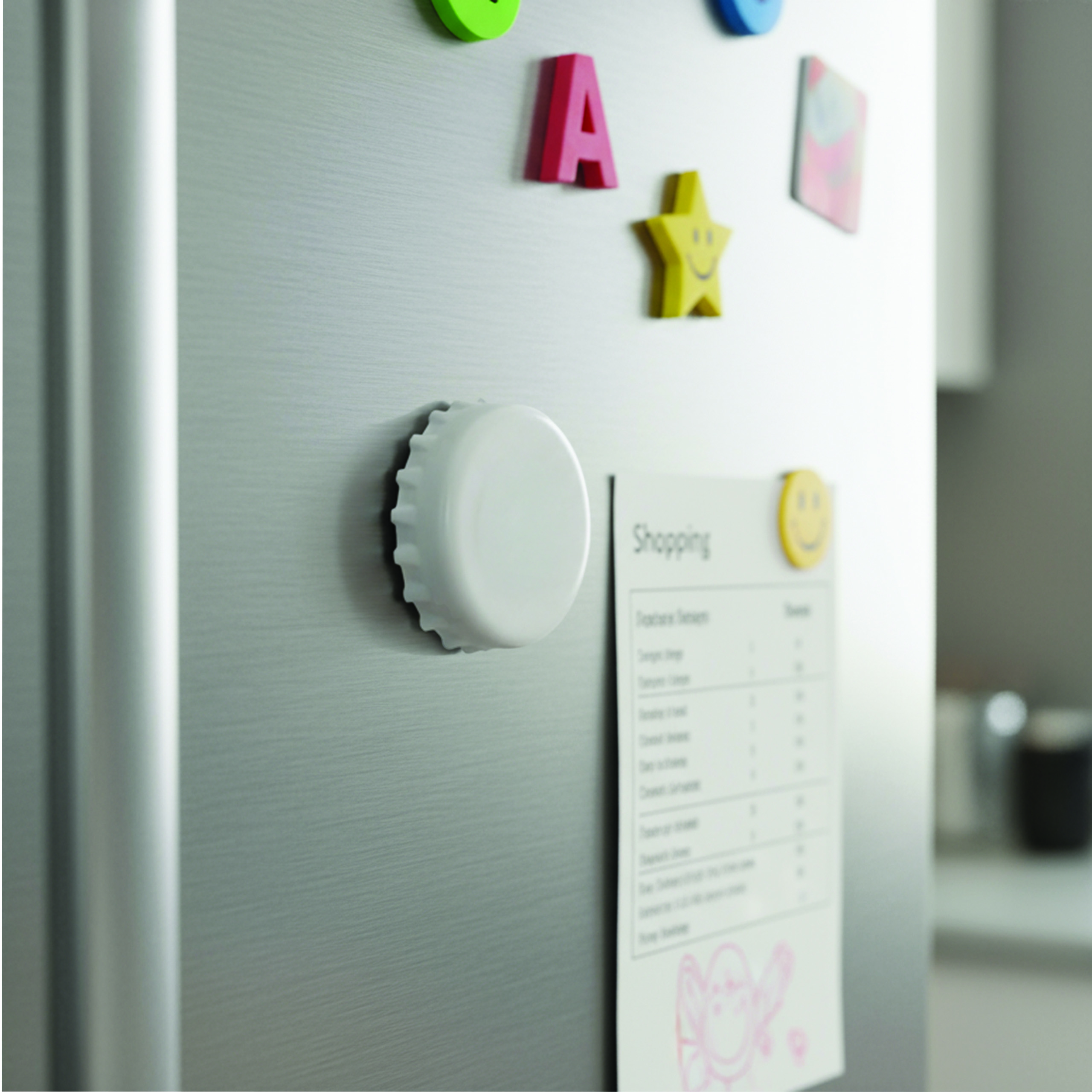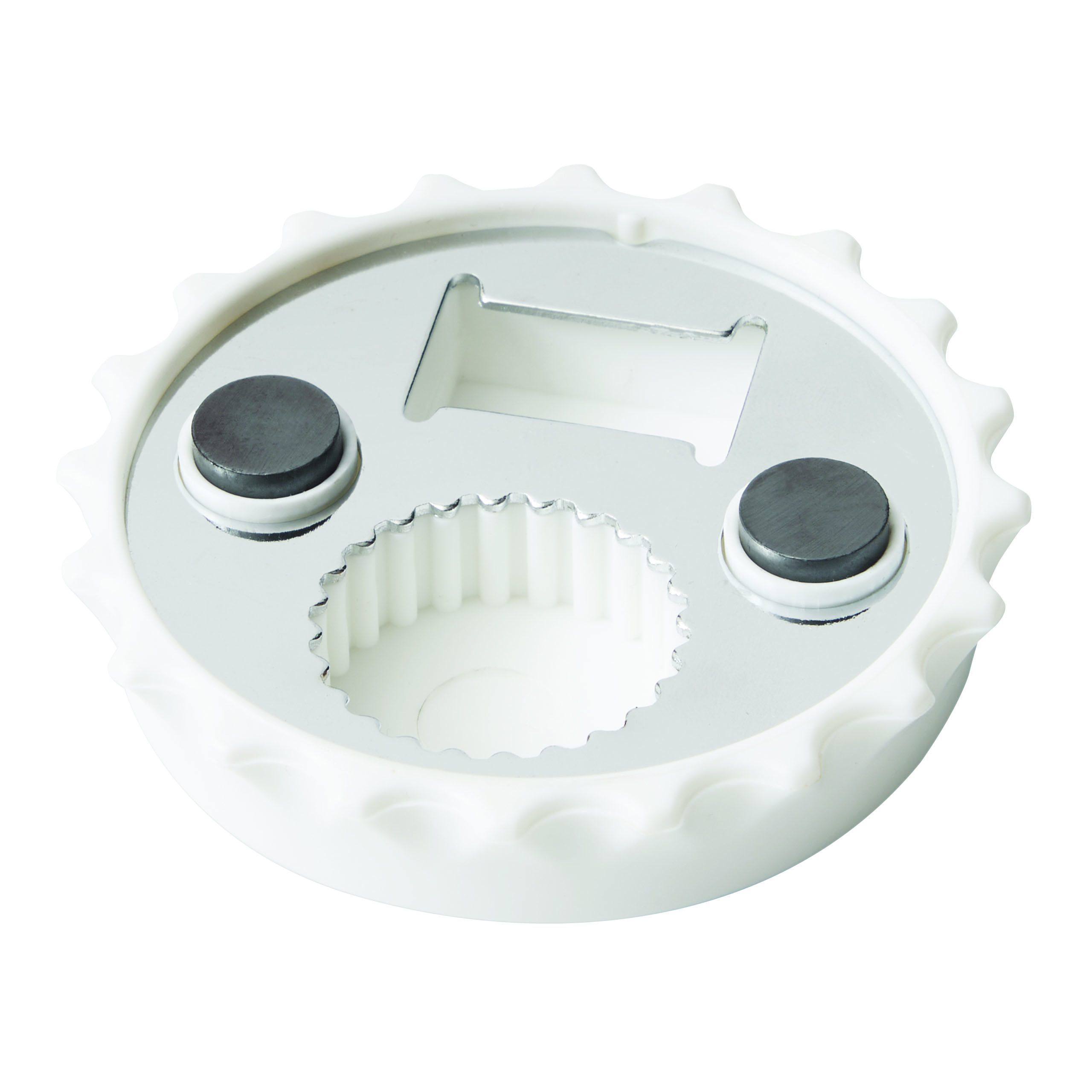 Otwieracz do butelek CROWNCAP. Nadaje się on zarówno do kapsli, jak i metalowych nakrętek. Wyposażony jest w dwa magnesy umożliwiające przymocowanie np. do lodówki.