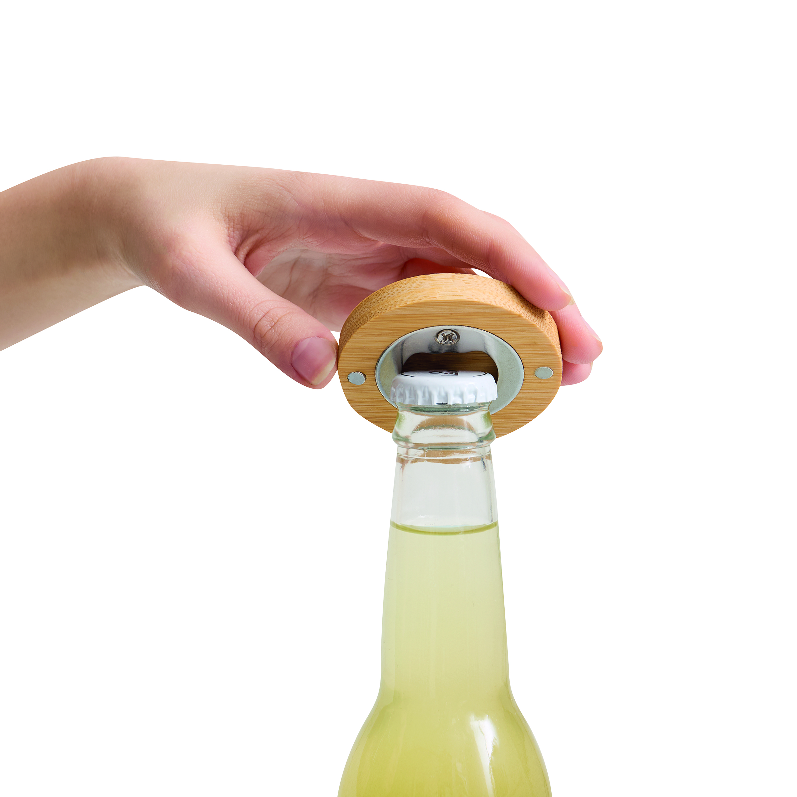 Otwieracz do butelek BAMBOO COIN: z dwoma małymi magnesami do przyczepienia na lodówce lub innych miejscach.