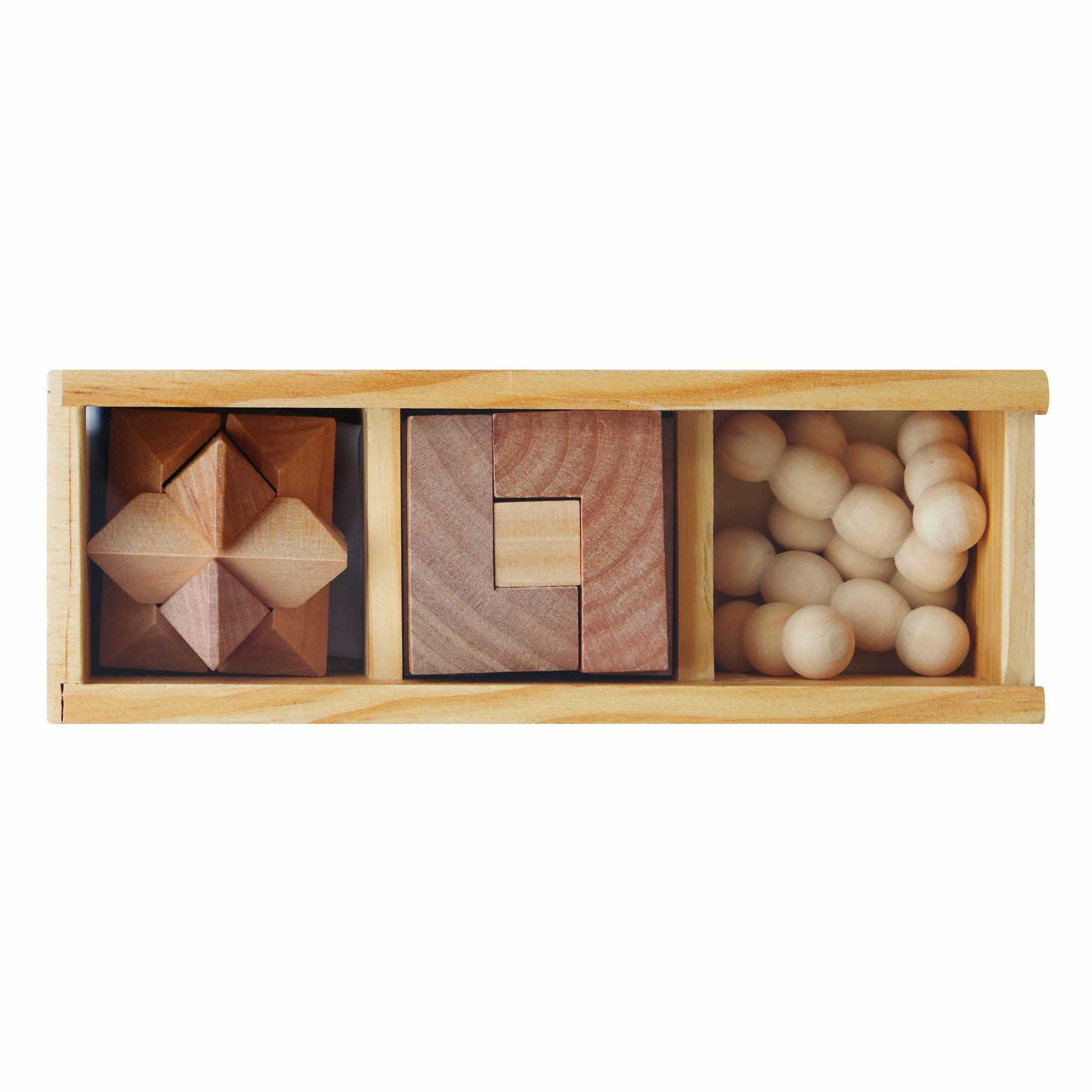Zestaw puzzli BRAIN POWER składa się z 3 różnych gier zręcznościowych. Zawiera instrukcje i drewniane pudełko.