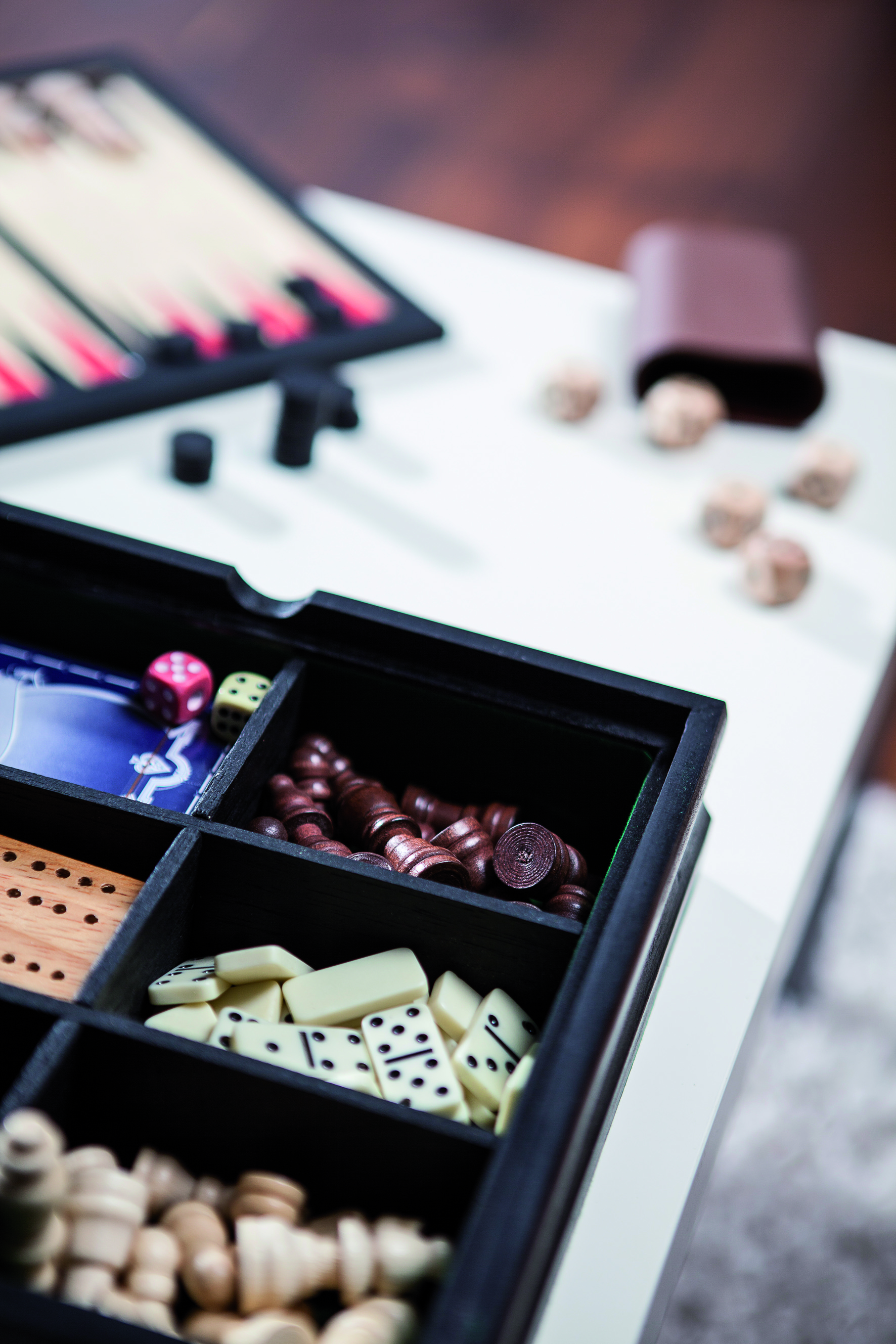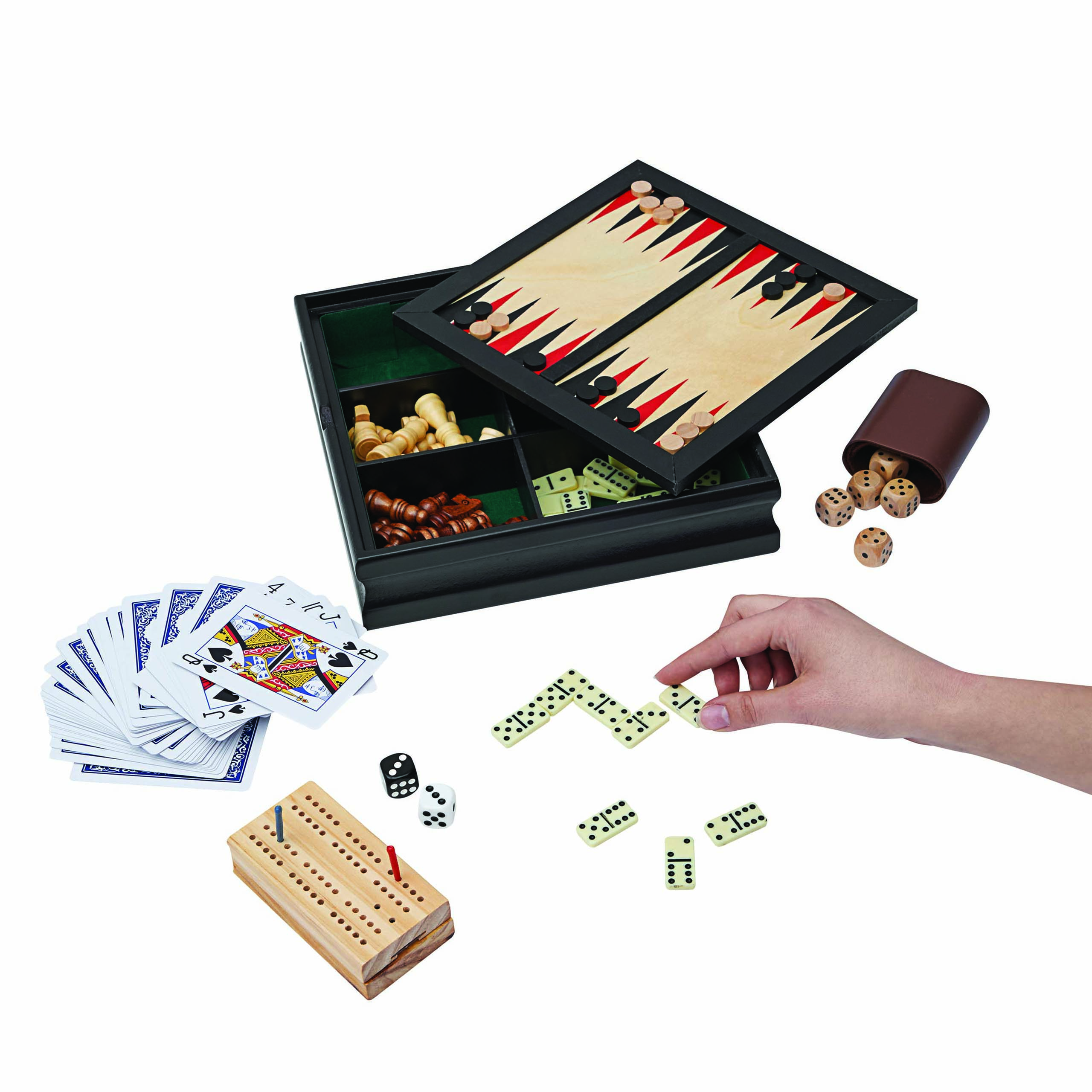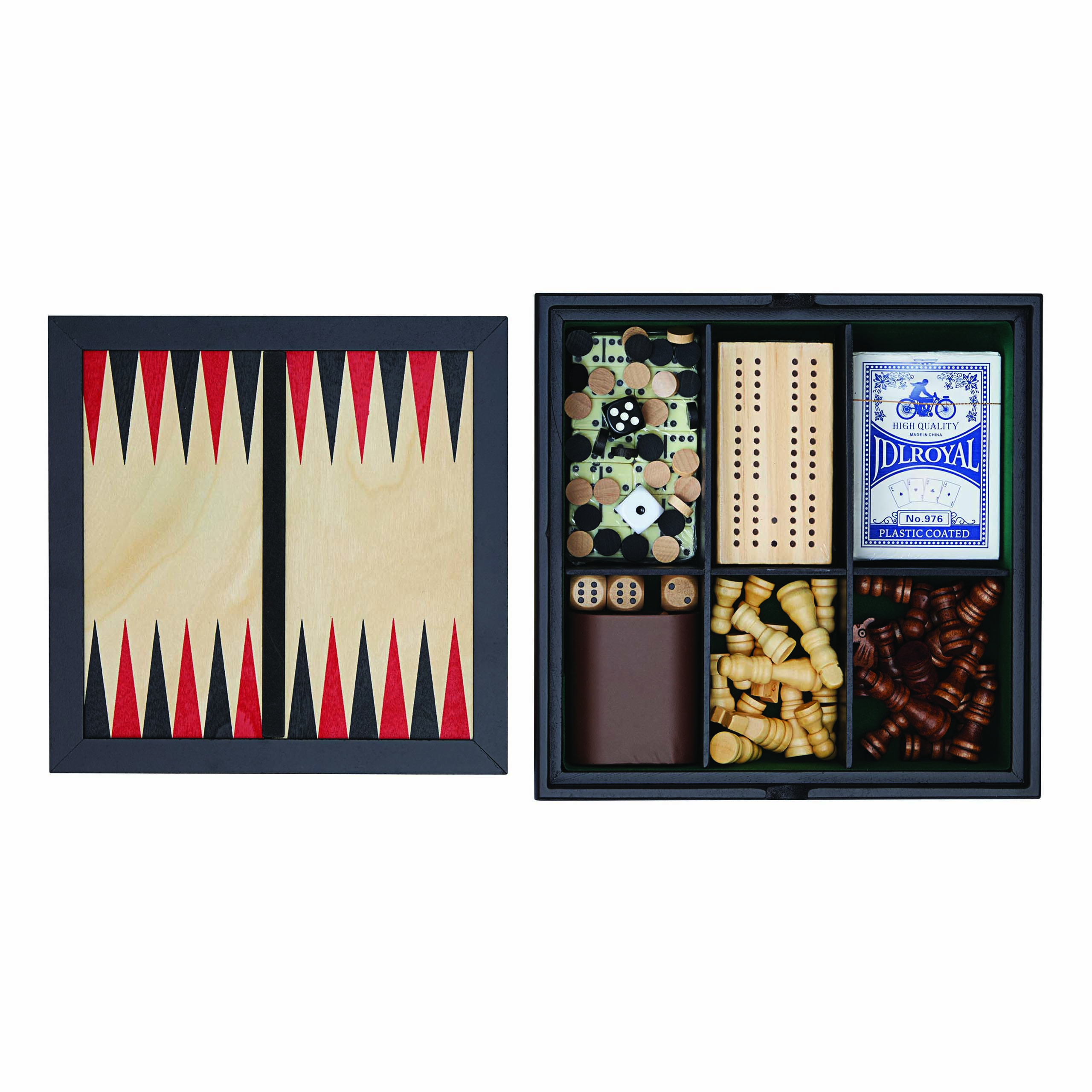 Zestaw gier FAMILY-FUN. Szachy, tryk-trak, warcaby, domino, karty i kości zapakowane w drewniane pudełko.