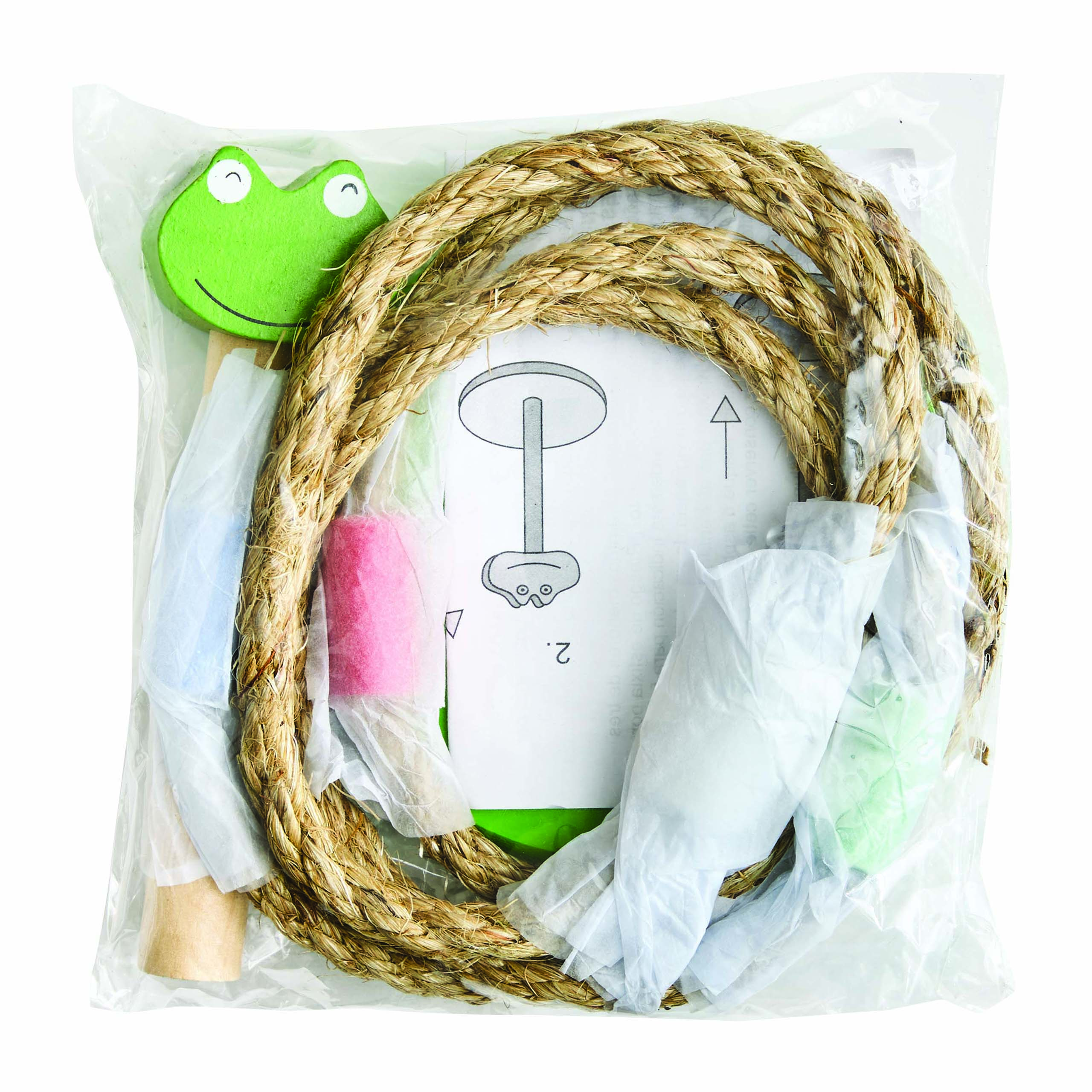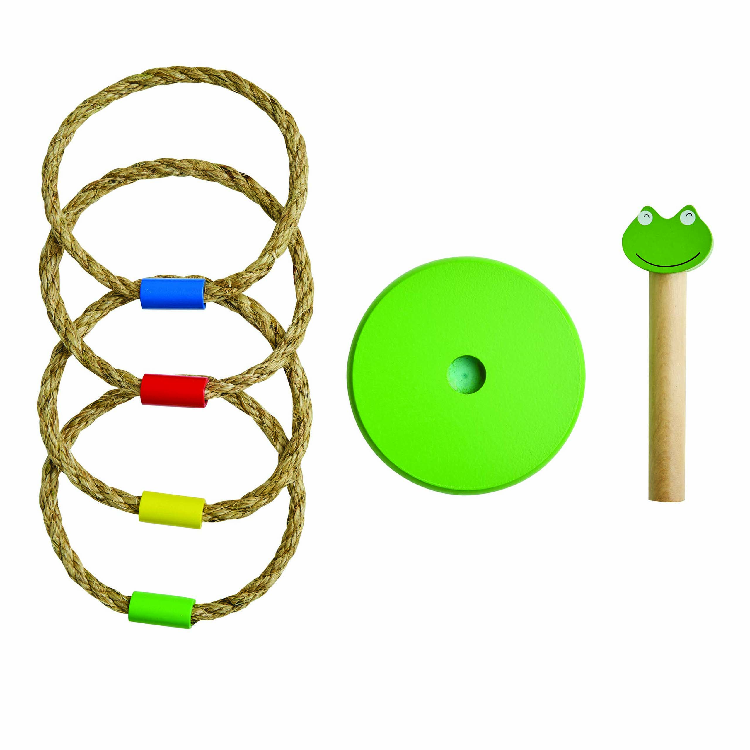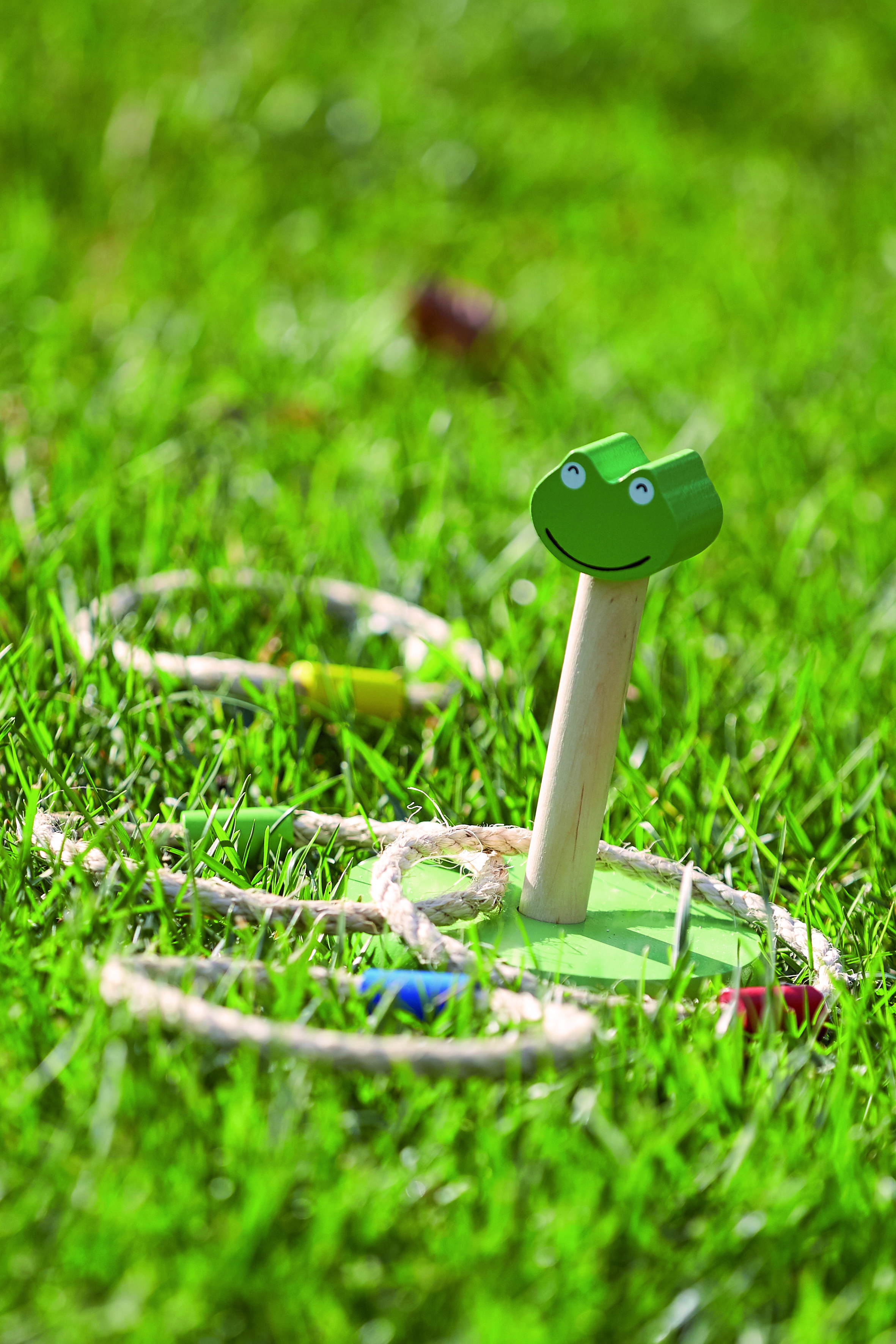 Gra CRAZY LOOP wykonana z drewna, w kształcie żaby. W zestawie 4 pętle do zarzucania ze sznurka, z drewnianymi znacznikami w różnych kolorach.