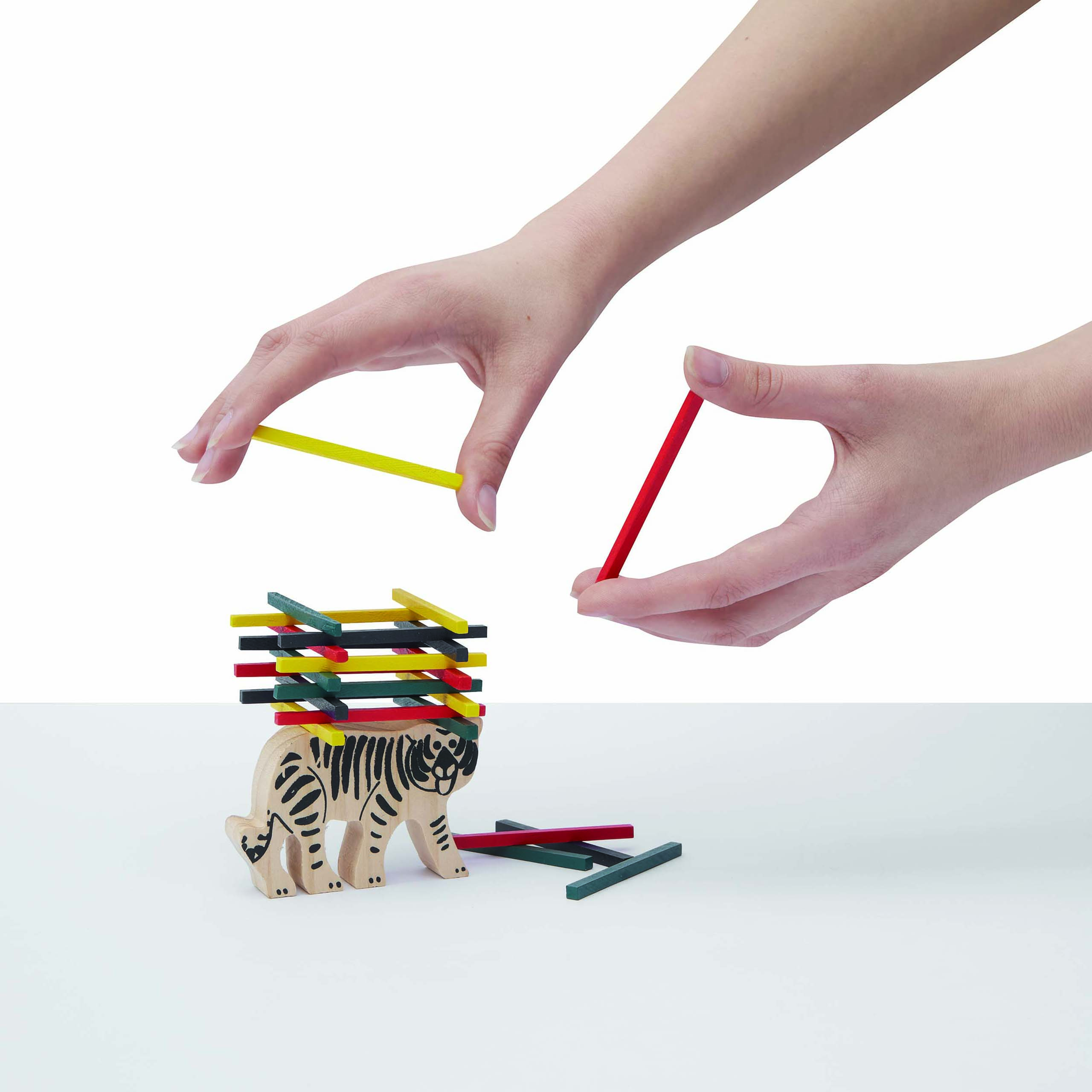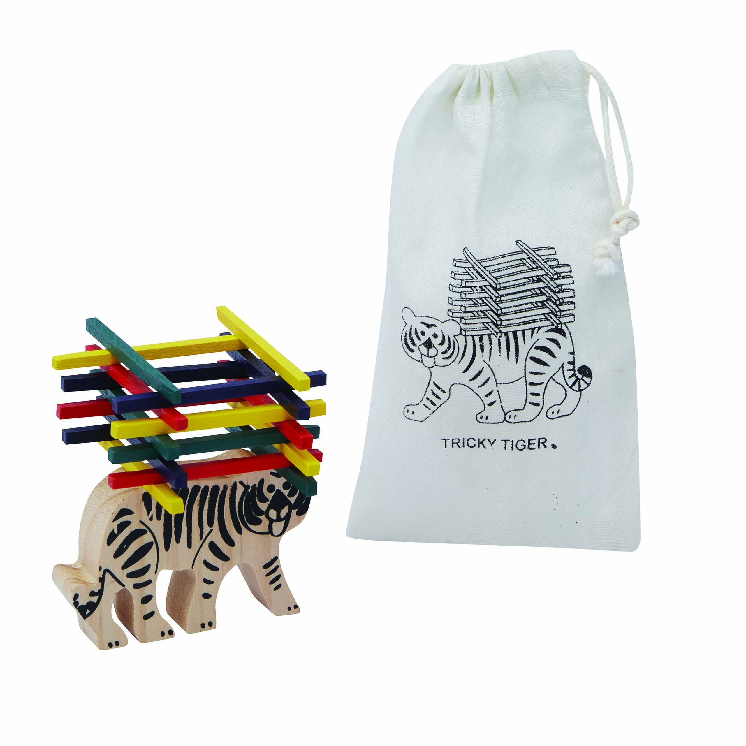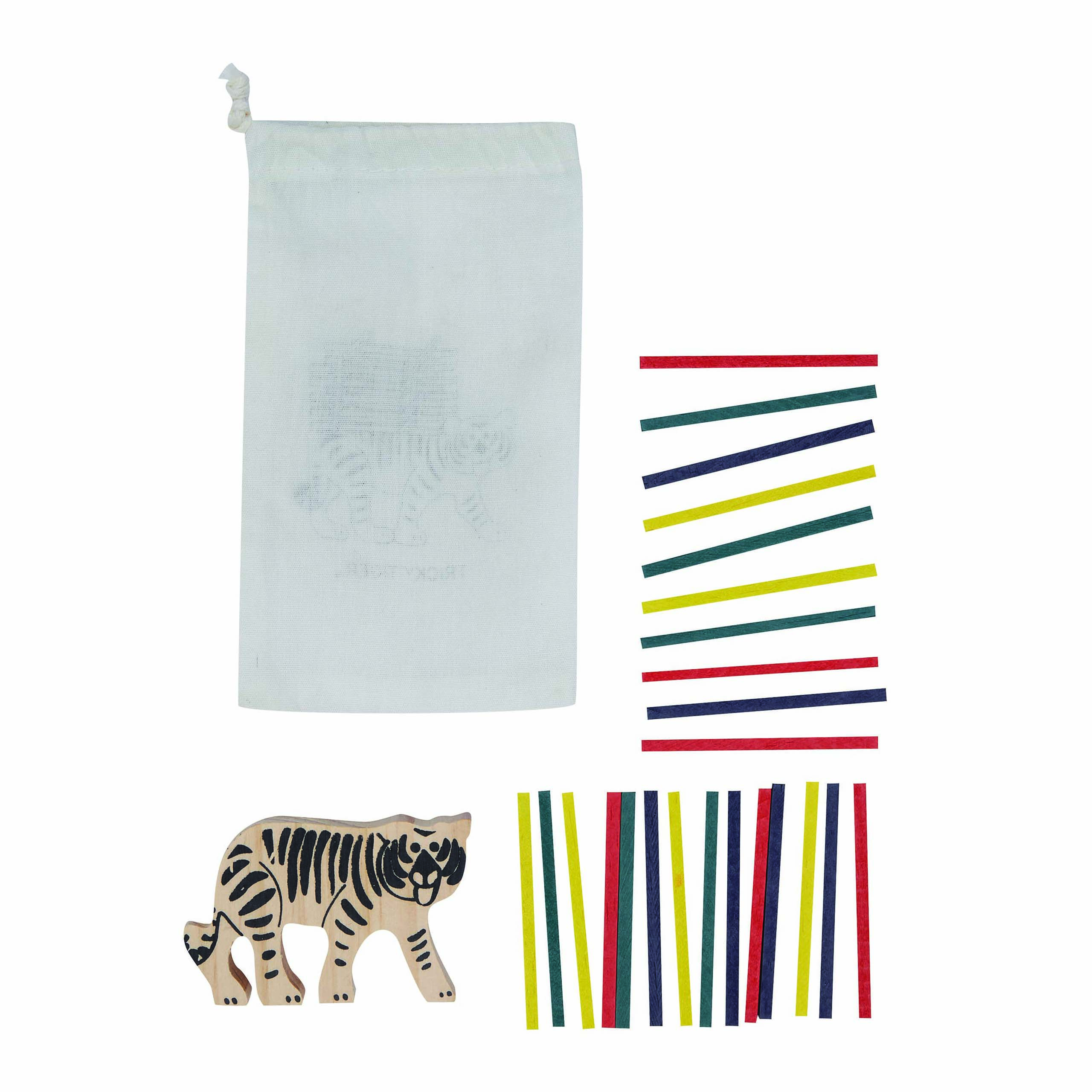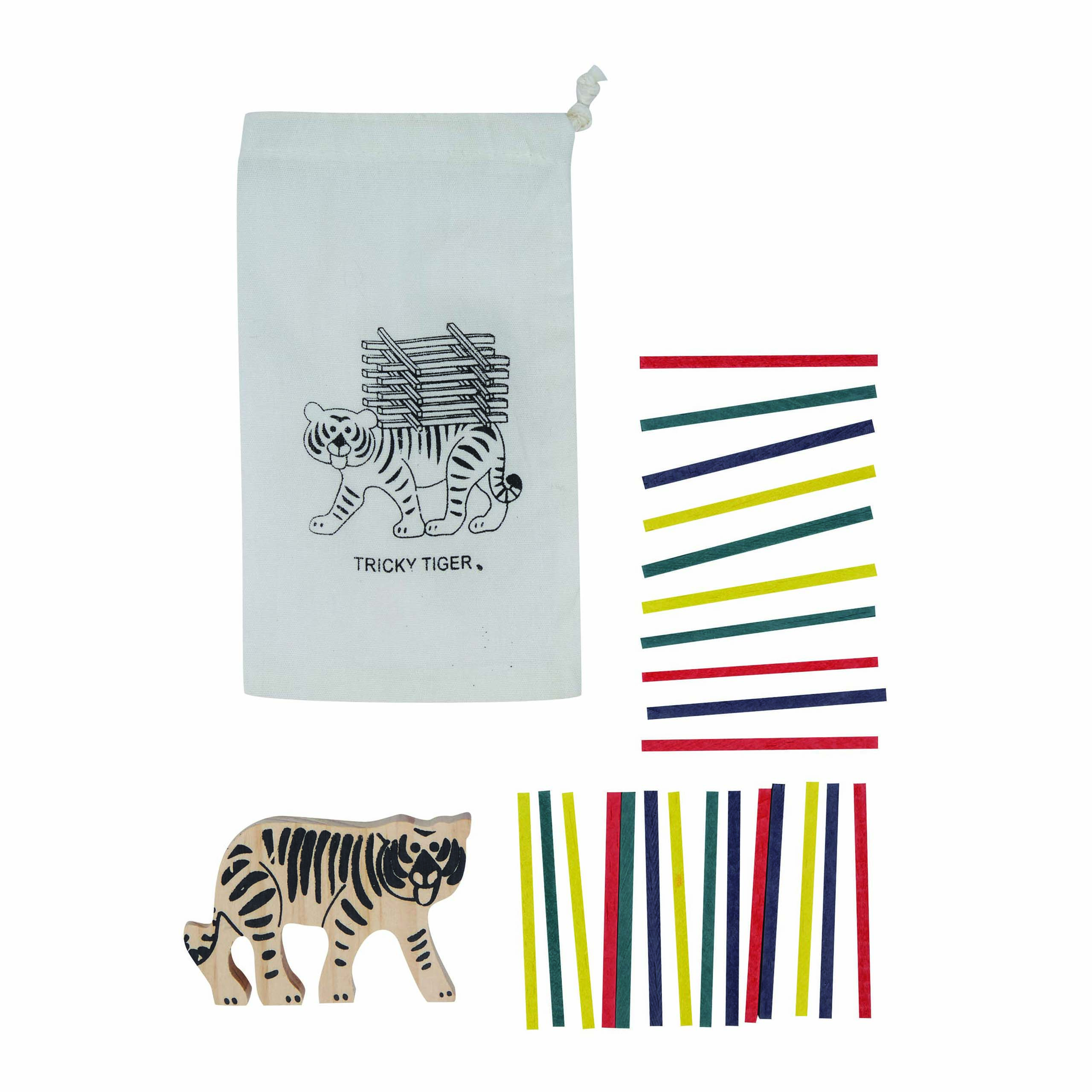 Gra zręcznościowa TRICKY TIGER zawiera drewnianego tygrysa z czarnym nadrukiem, 24 drewniane patyczki w 4 różnych kolorach, instrukcję. Zapakowana w przyjazną środowisku bawełnianą torebkę.
