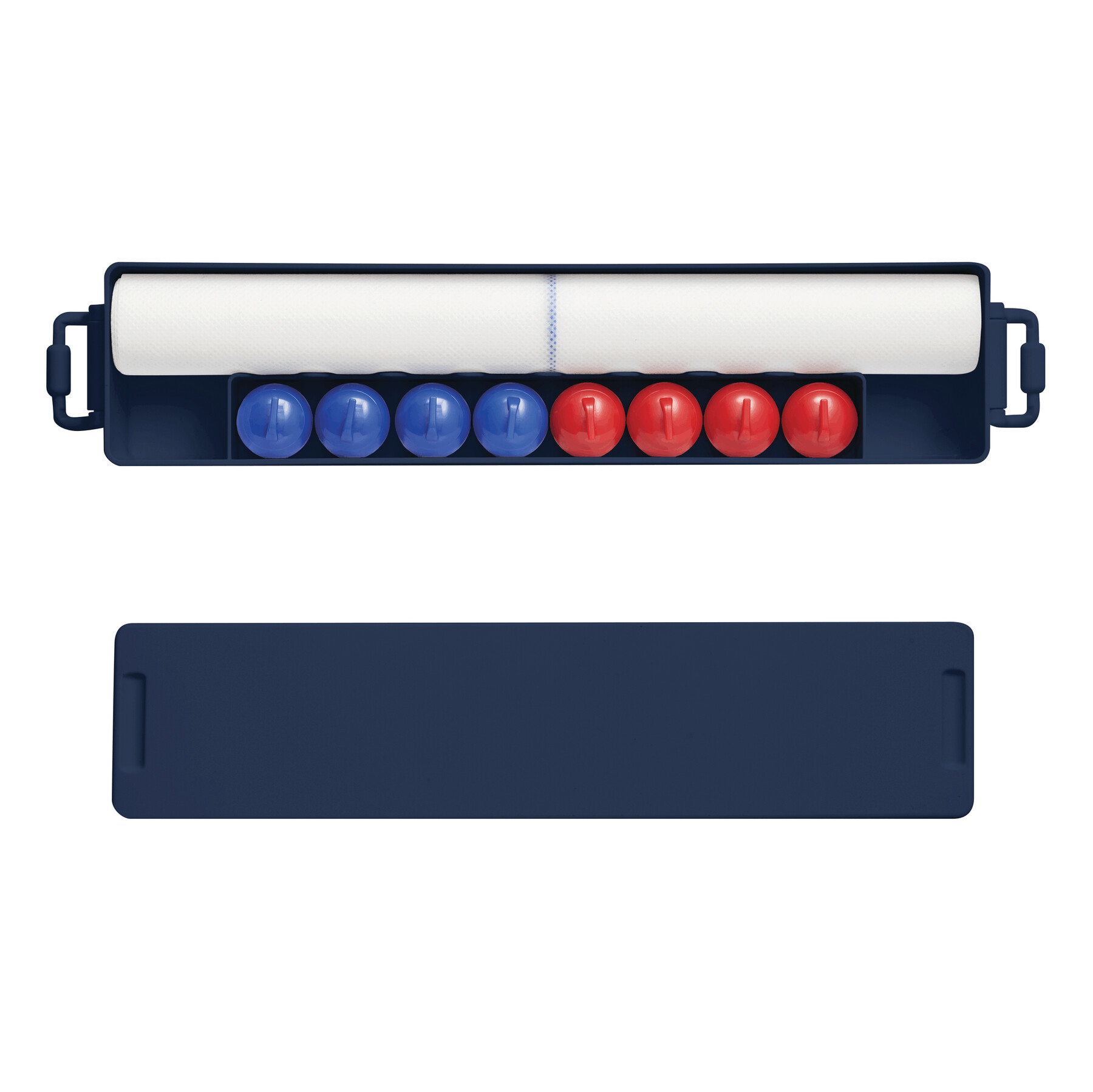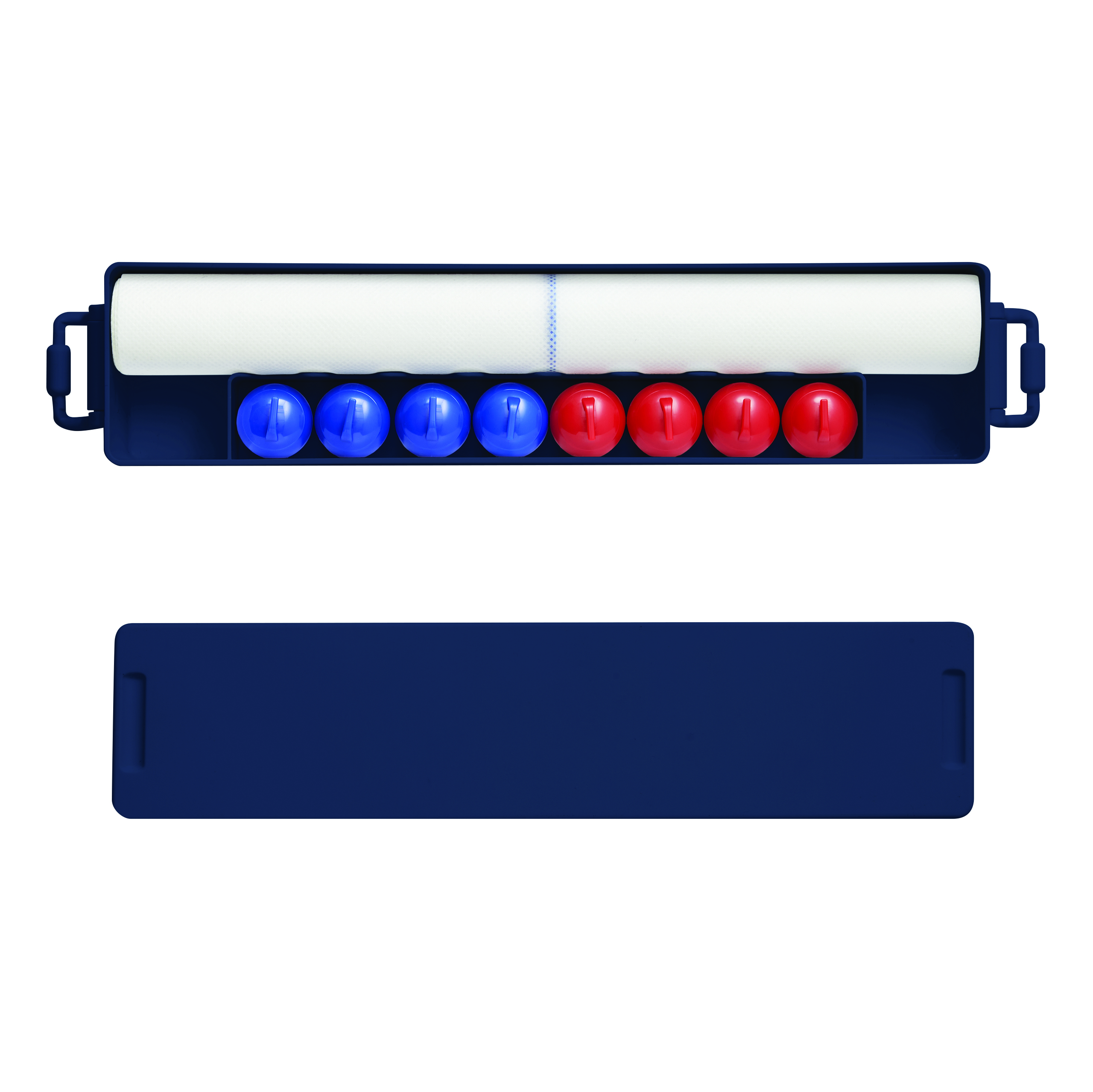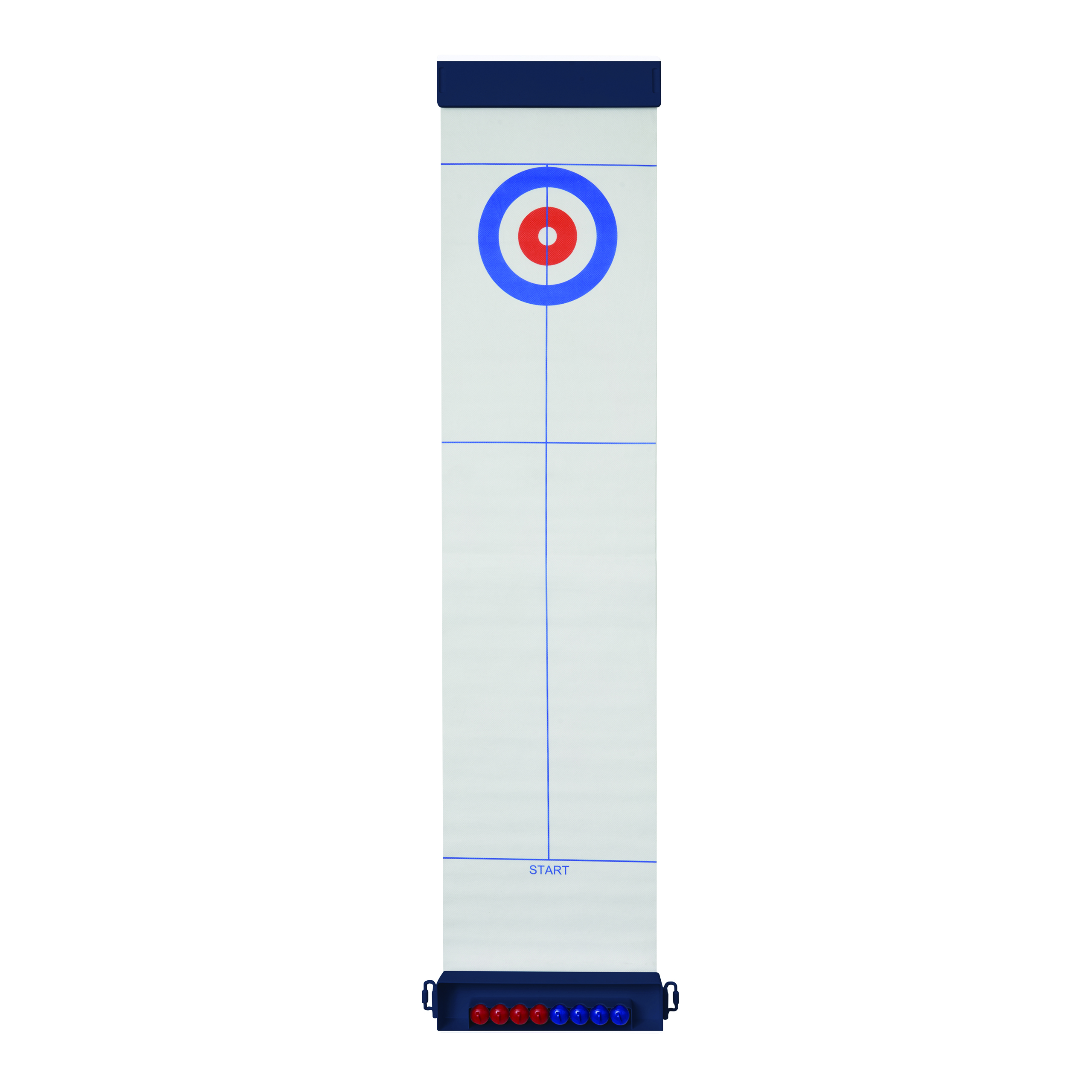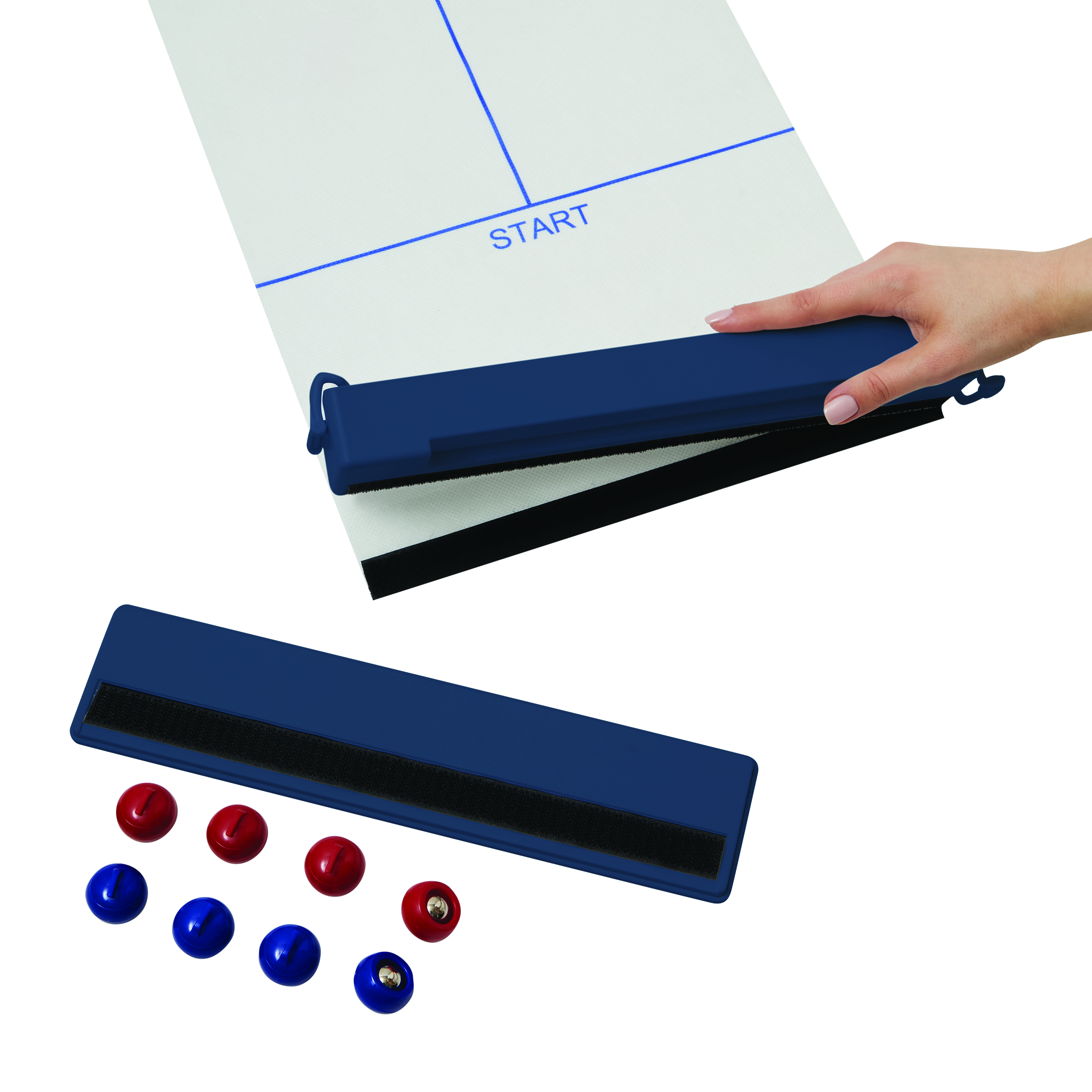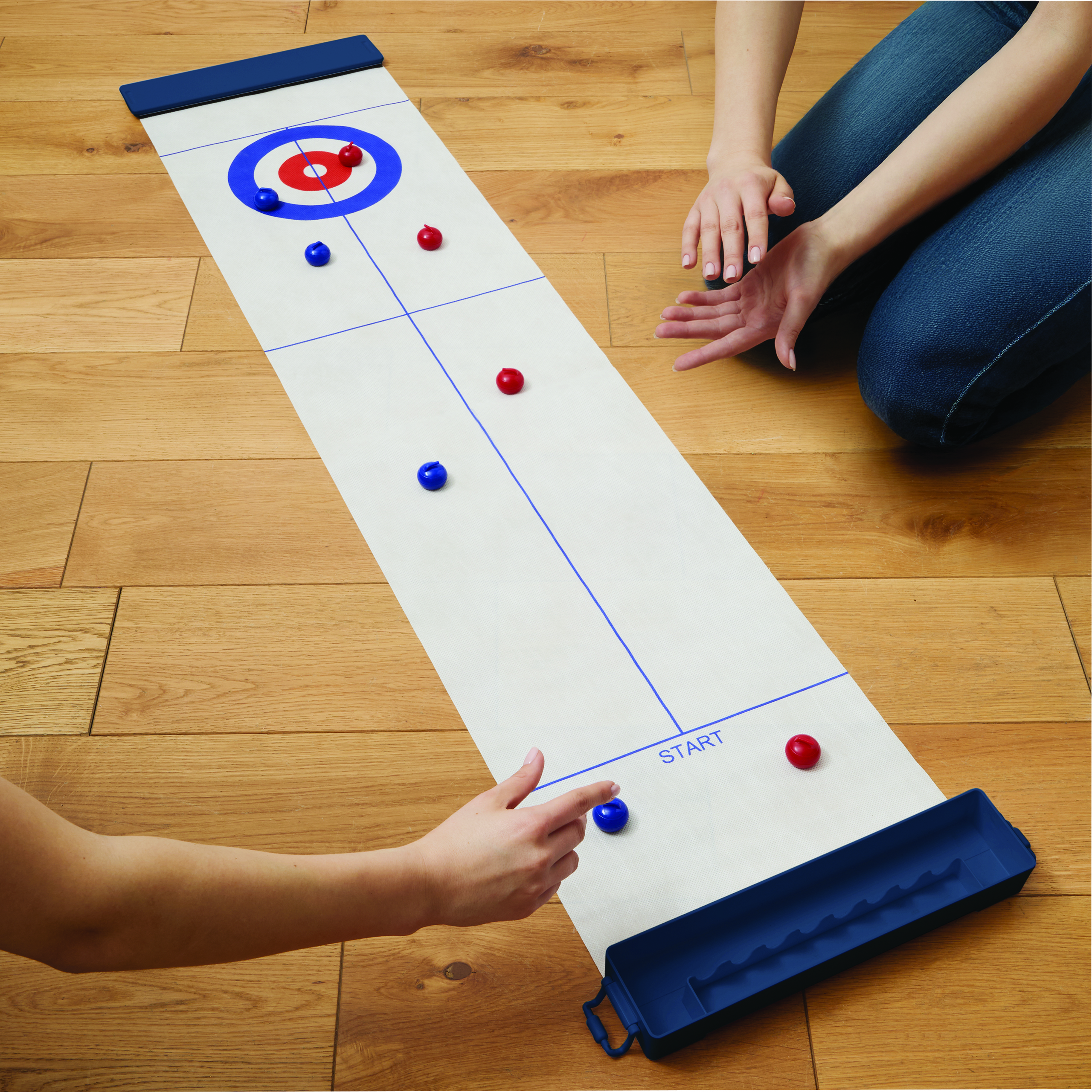 Gra stołowa CURLING TIME. Posiada 4 czerwone i 4 niebieskie kamienie do curlingu (z wbudowaną stalową kulką, która pozwala im ślizgać się jak na prawdziwym lodzie) oraz pole gry o długości ok. 121 cm z okręgiem docelowym. Pole gry można zabezpieczyć, mocując skrzynkę transportową na początku, a pokrywę skrzynki na końcu za pomocą zapięcia na rzep. Zapakowana jest w pudełko.