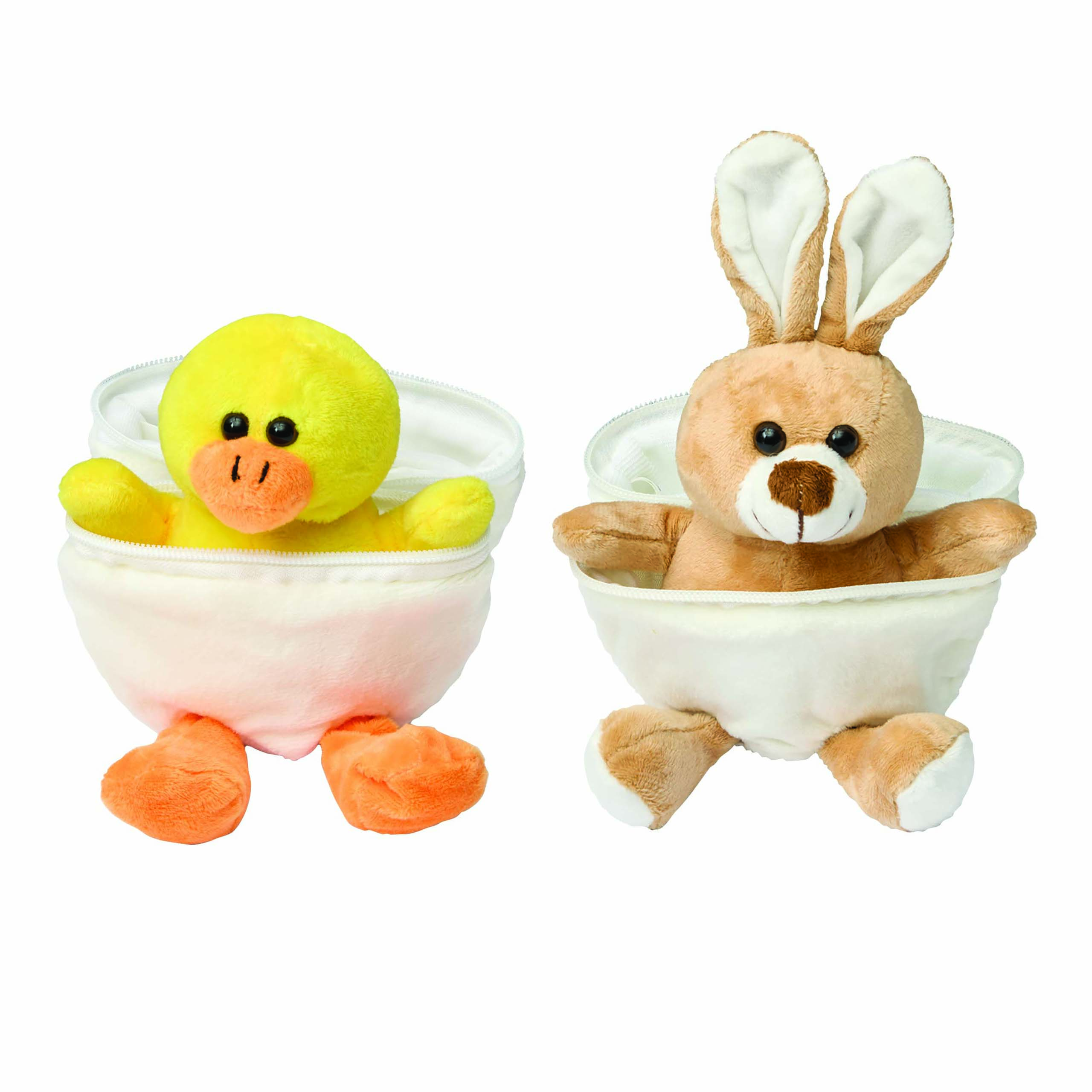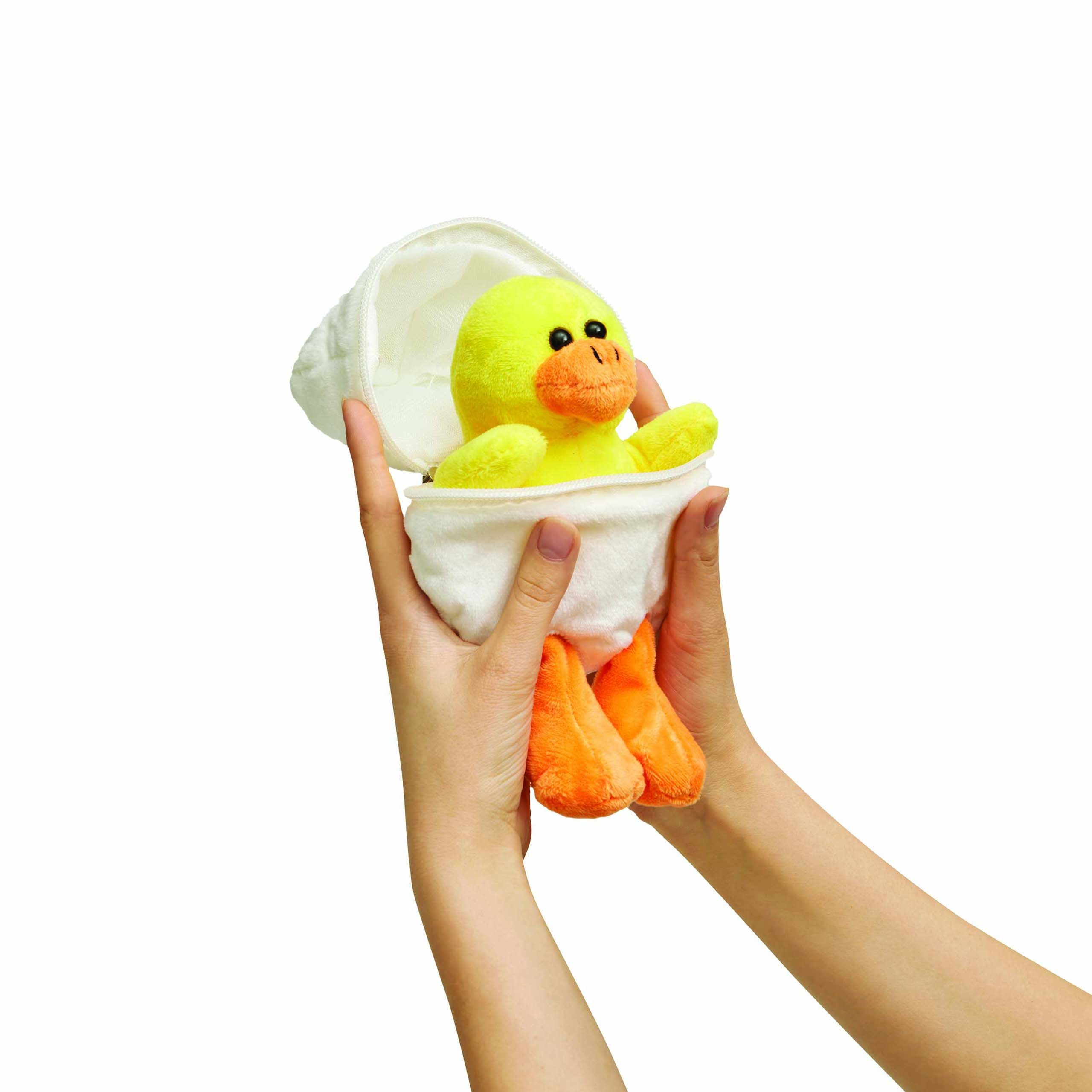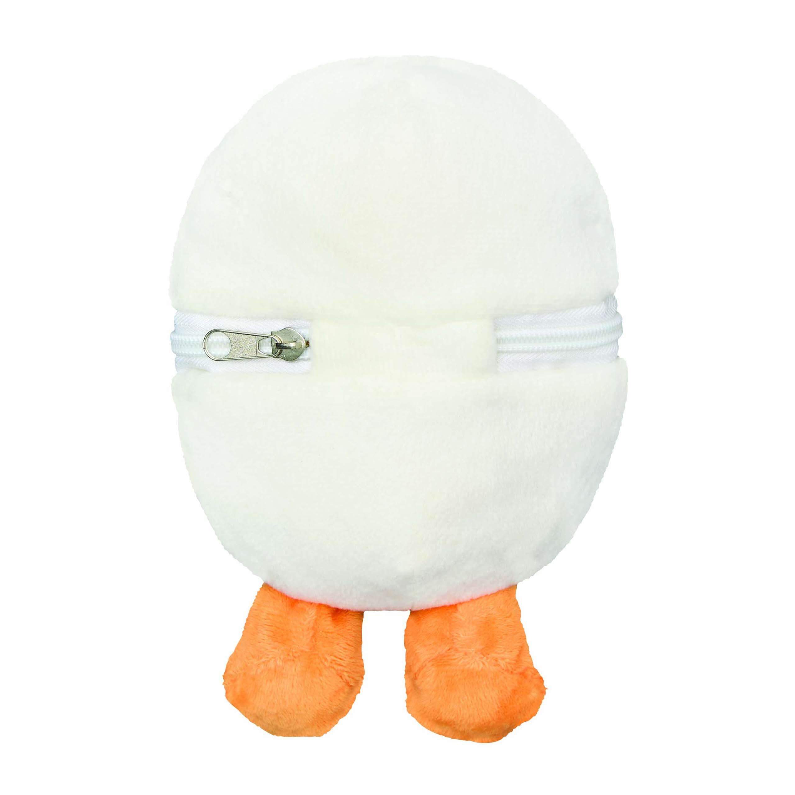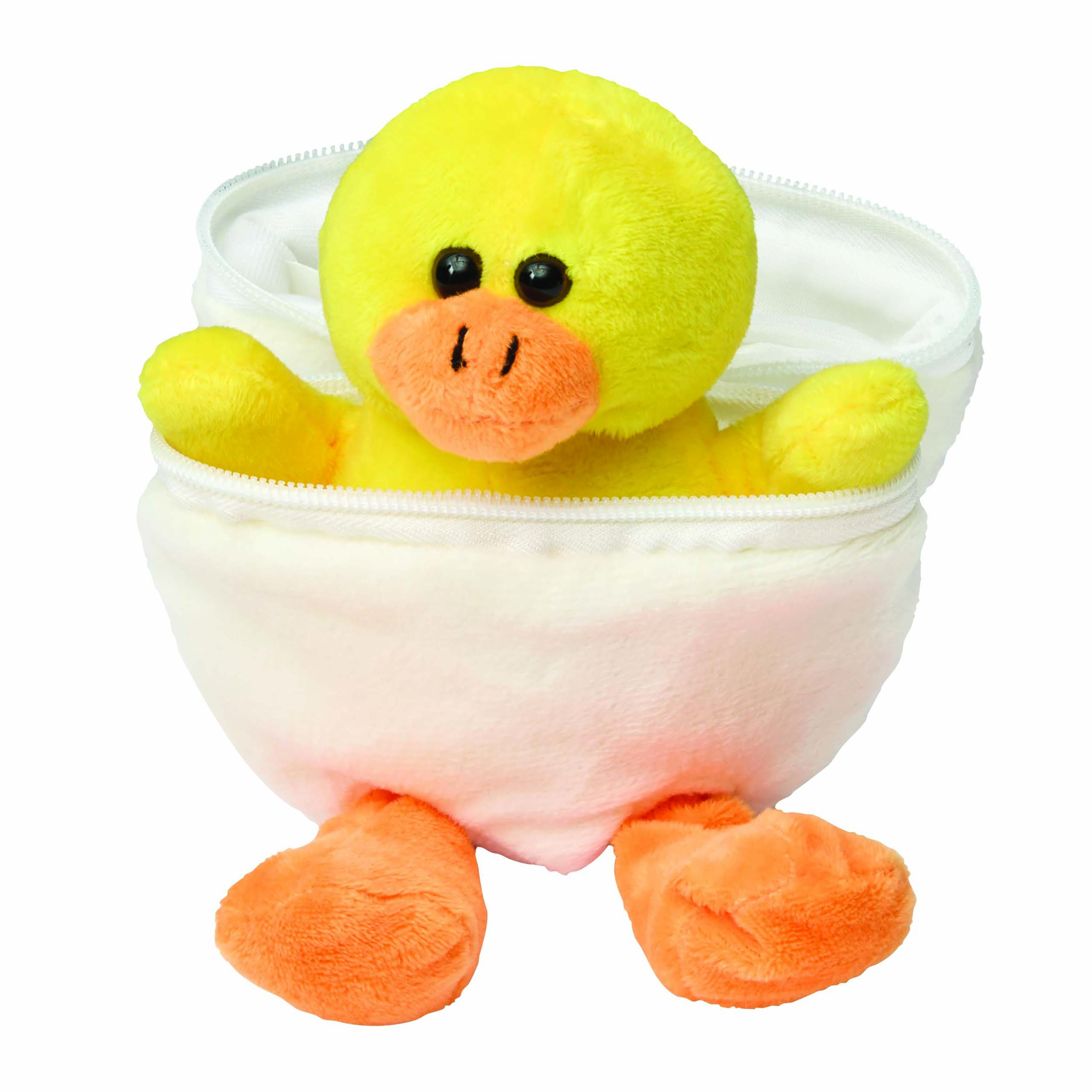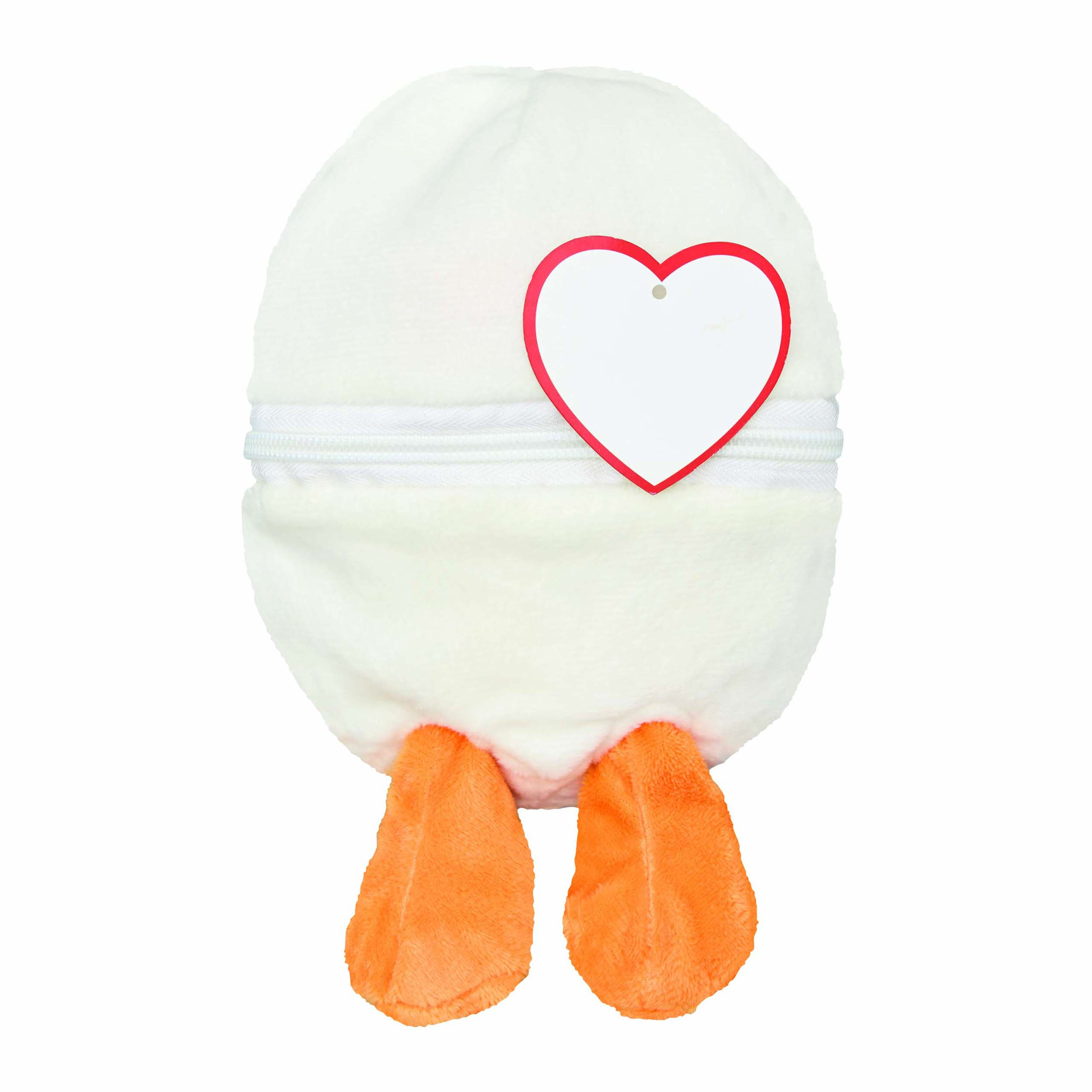 Pluszowa kaczka LENI z miękkim futerkiem. Umieszczona wewnątrz pluszowego jajka z zamkiem błyskawicznym. Z sercem do nadruku.
